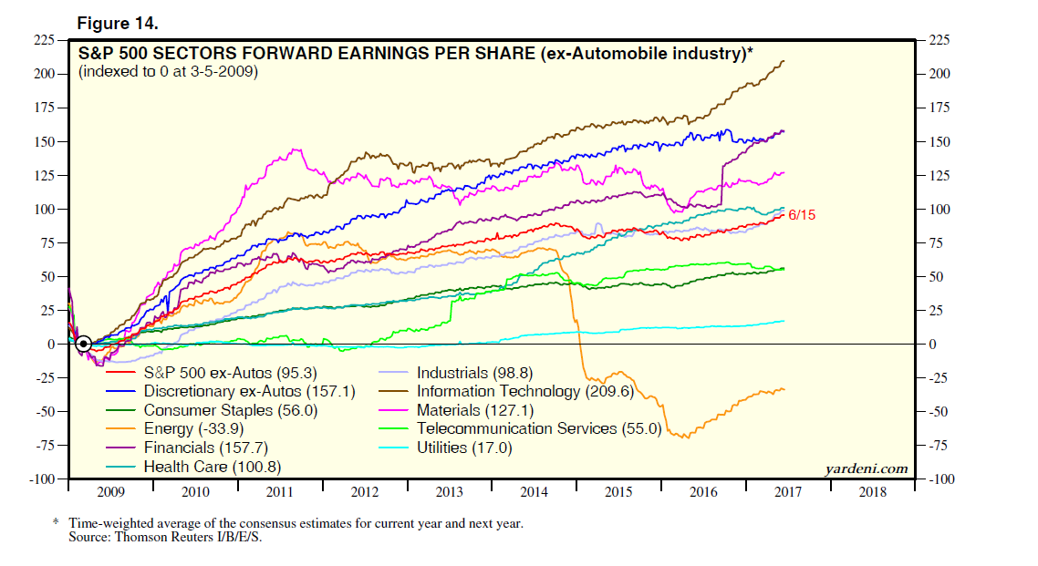 (2) Industry analysts upbeat on S&P 500 revenues. We also keep track of Revenues Squiggles. For the S&P 500, they show that revenues expectations for 2016 and 2017 stopped falling and have been stable since the start of the year (Fig. 2). That corresponds with the rebound in the price of oil at the start of the year, which stopped the Energy sector from weighing on overall S&P 500 revenues. Industry analysts currently project that S&P 500 revenues will grow 5.8% in 2017 and 4.7% in 2018. Joe and I think that these optimistic growth rates are possible.