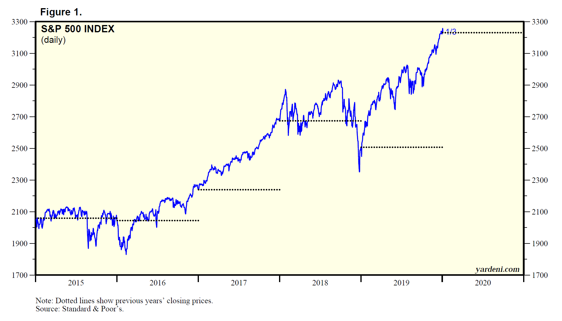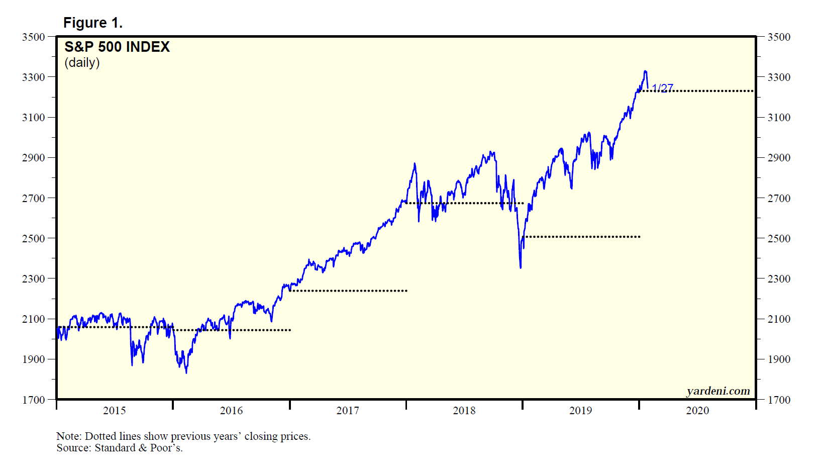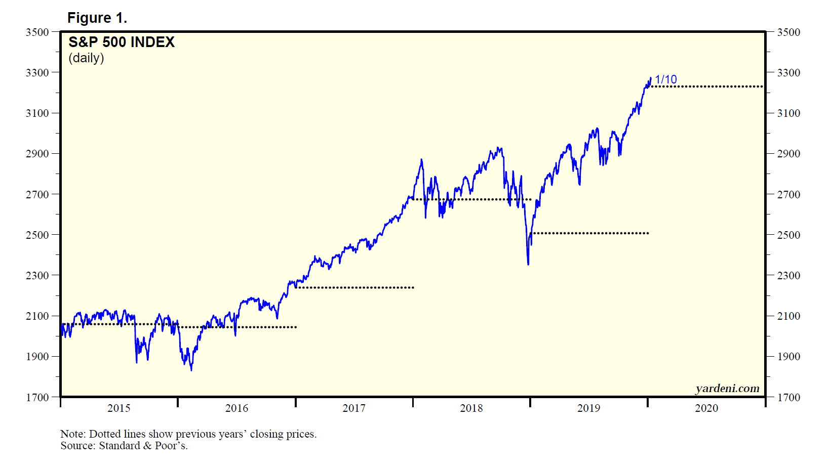 Strategy I: The Roaring ’20s or the Miserable ’70s? Well, that was certainly an interesting way to start a new year and a new decade. The S&P 500 stock price index jumped 0.8% on Thursday (1/2) to a new record high of 3257.85 (Fig. 1). But then, the index fell 0.7% on Friday (1/3). Thursday’s action might have been an early sign that the 2020s will be this century’s fearless Roaring ’20s. On the other hand, Friday’s selloff was a reminder that the current bull market is still prone to panic attacks—the latest one being a potential escalation of the military confrontation between US and Iran, at the same time as the trade war between the US and China seems to be deescalating.
