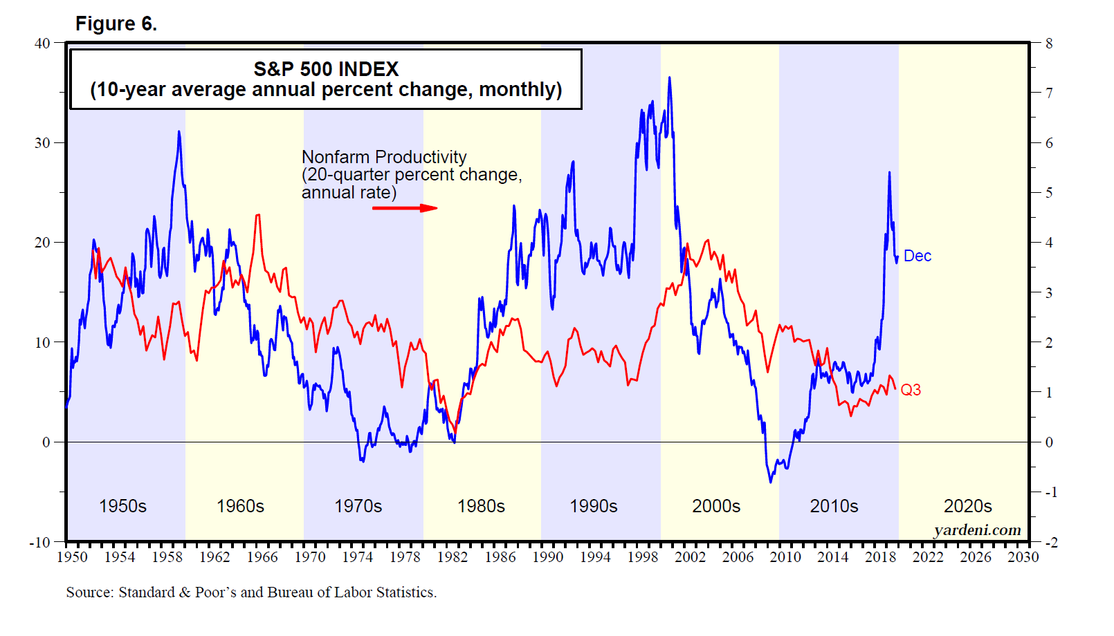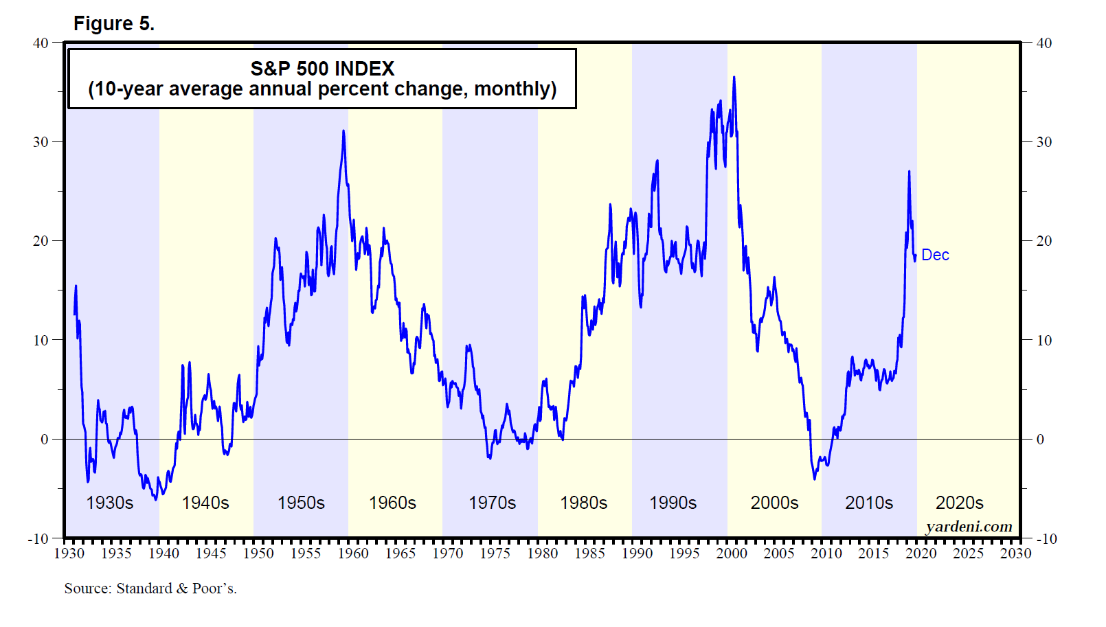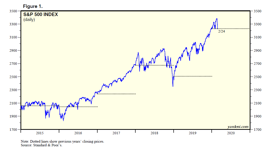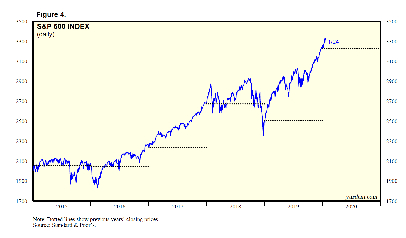 Strategy I: The Roaring ’20s or the Miserable ’70s? Well, that was certainly an interesting way to start a new year and a new decade. The S&P 500 stock price index jumped 0.8% on Thursday (1/2) to a new record high of 3257.85 (Fig. 1). But then, the index fell 0.7% on Friday (1/3). Thursday’s action might have been an early sign that the 2020s will be this century’s fearless Roaring ’20s. On the other hand, Friday’s selloff was a reminder that the current bull market is still prone to panic attacks—the latest one being a potential escalation of the military confrontation between US and Iran, at the same time as the trade war between the US and China seems to be deescalating.