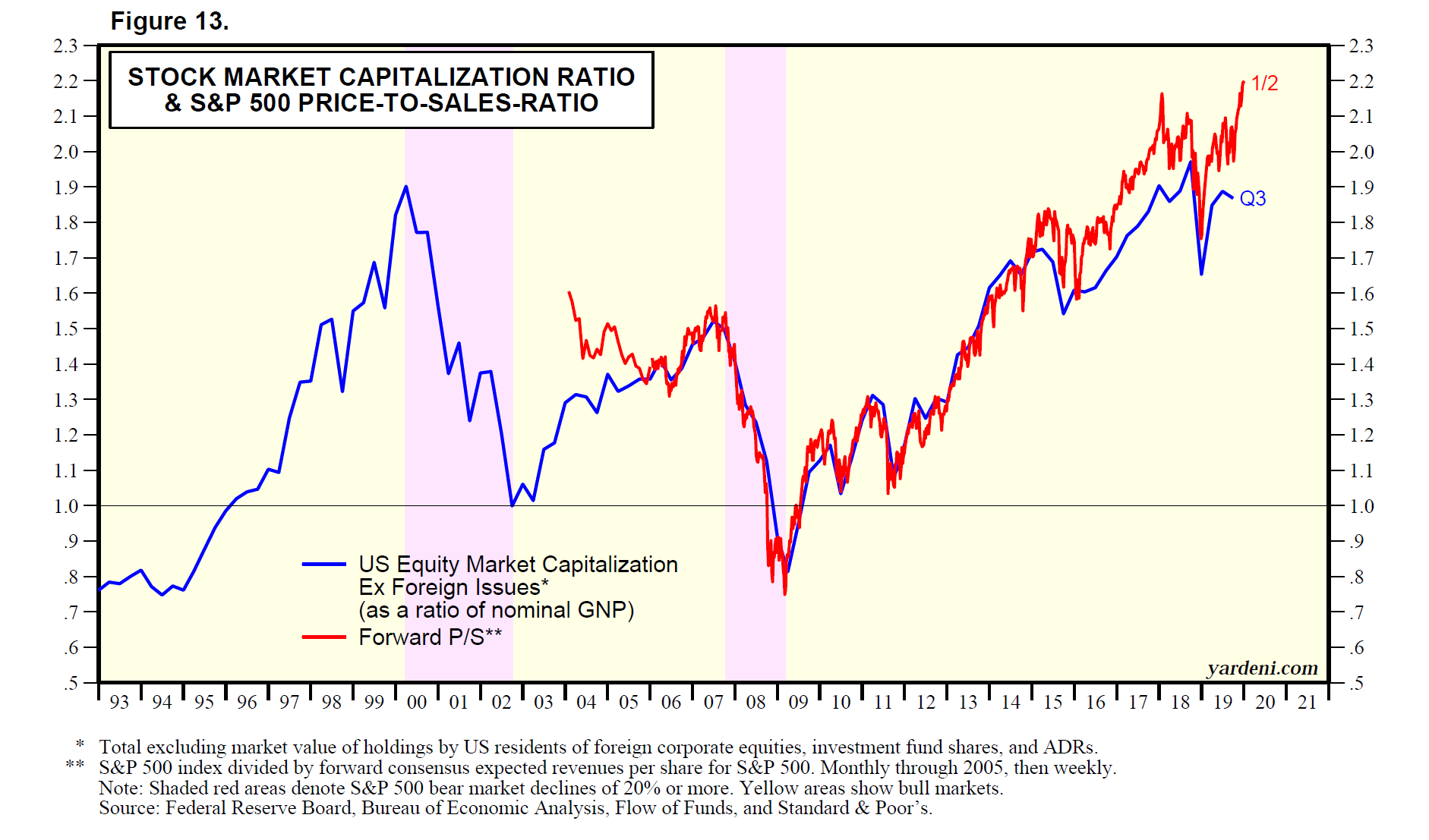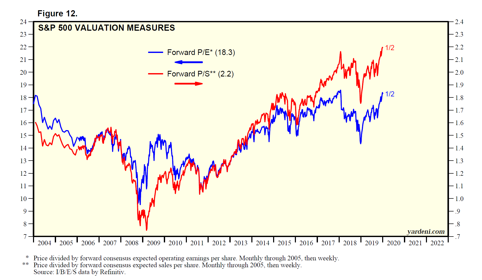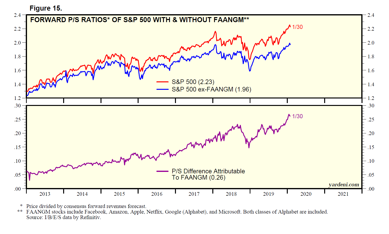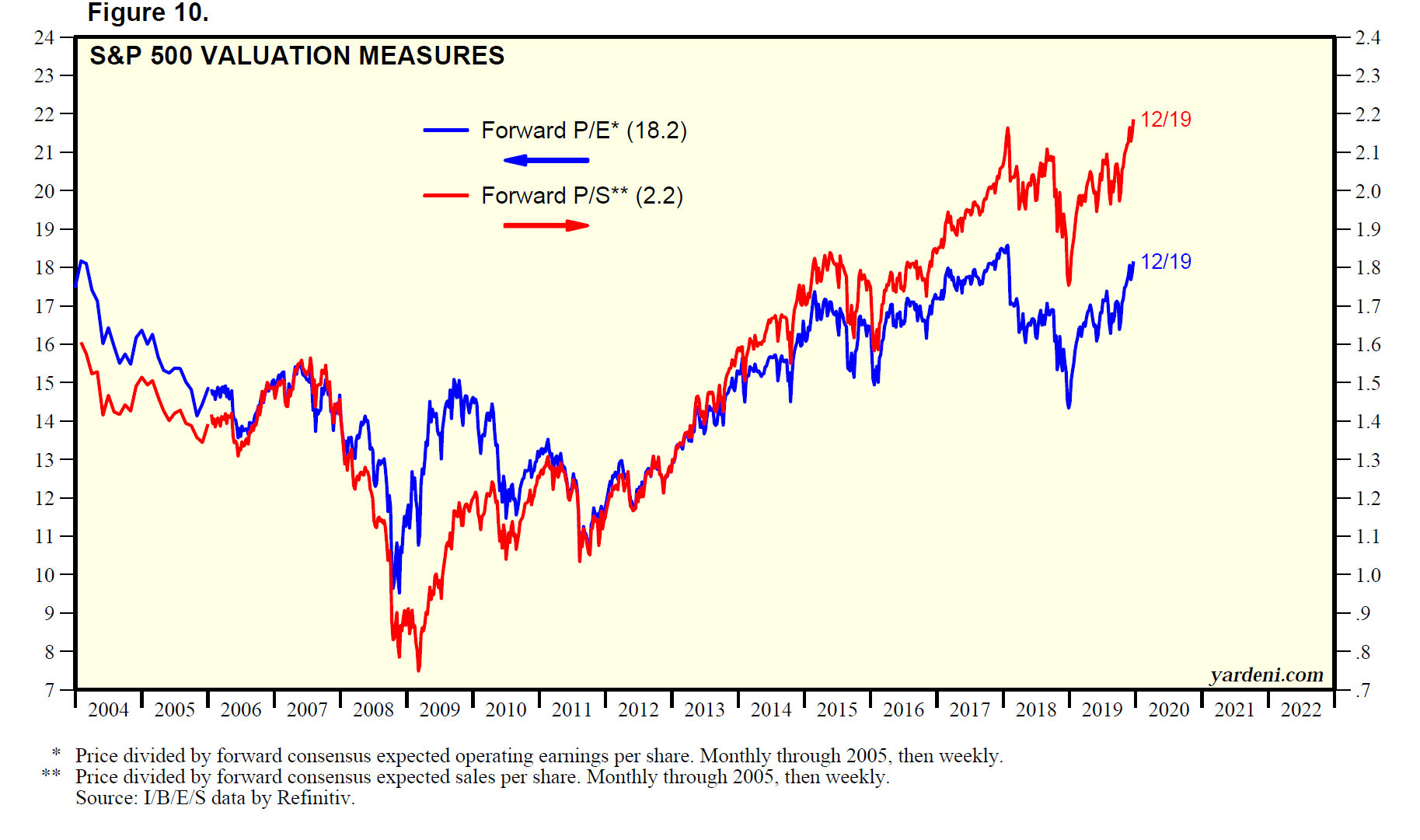However, we wouldn’t like to see a continuation of the P/E meltup. Our weekly proxy for the so-called Buffett Ratio (i.e., the ratio of US equity market capitalization excluding foreign issues divided by nominal GDP) is the S&P 500 price-to-sales ratio (P/S), using forward revenues for sales. This weekly measure of valuation rose to a record high of 2.19 during the 12/19 week (Fig. 9). We are concerned by the widening divergence between the forward P/S ratio and the forward P/E (Fig. 10). The former is flashing red, while the latter is flashing yellow.