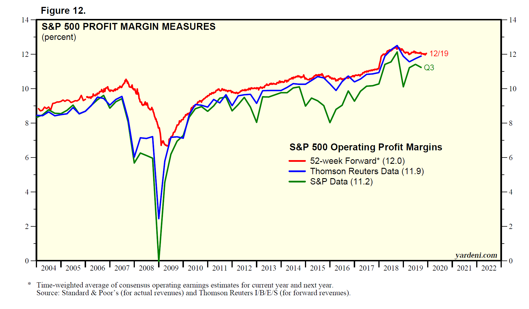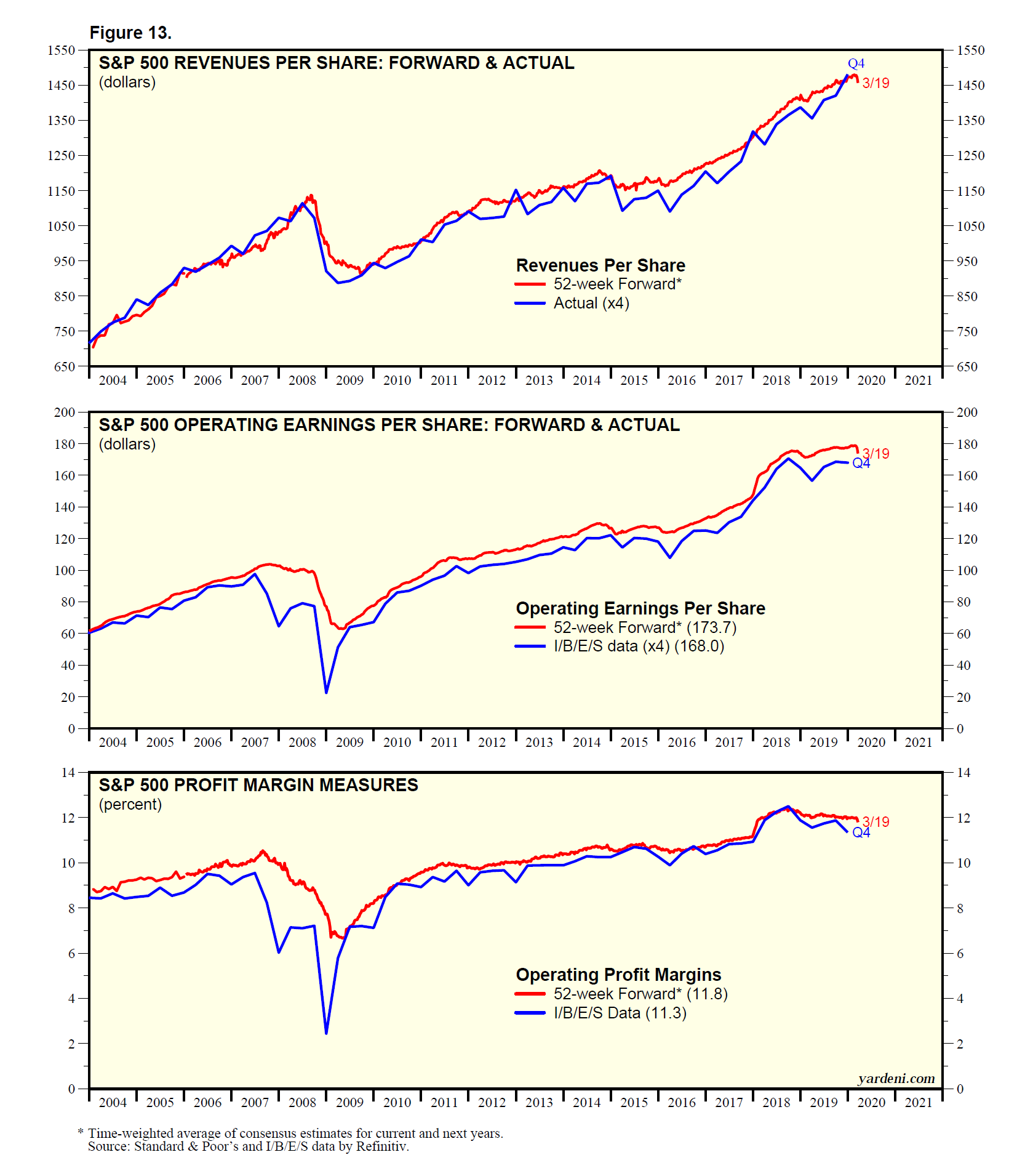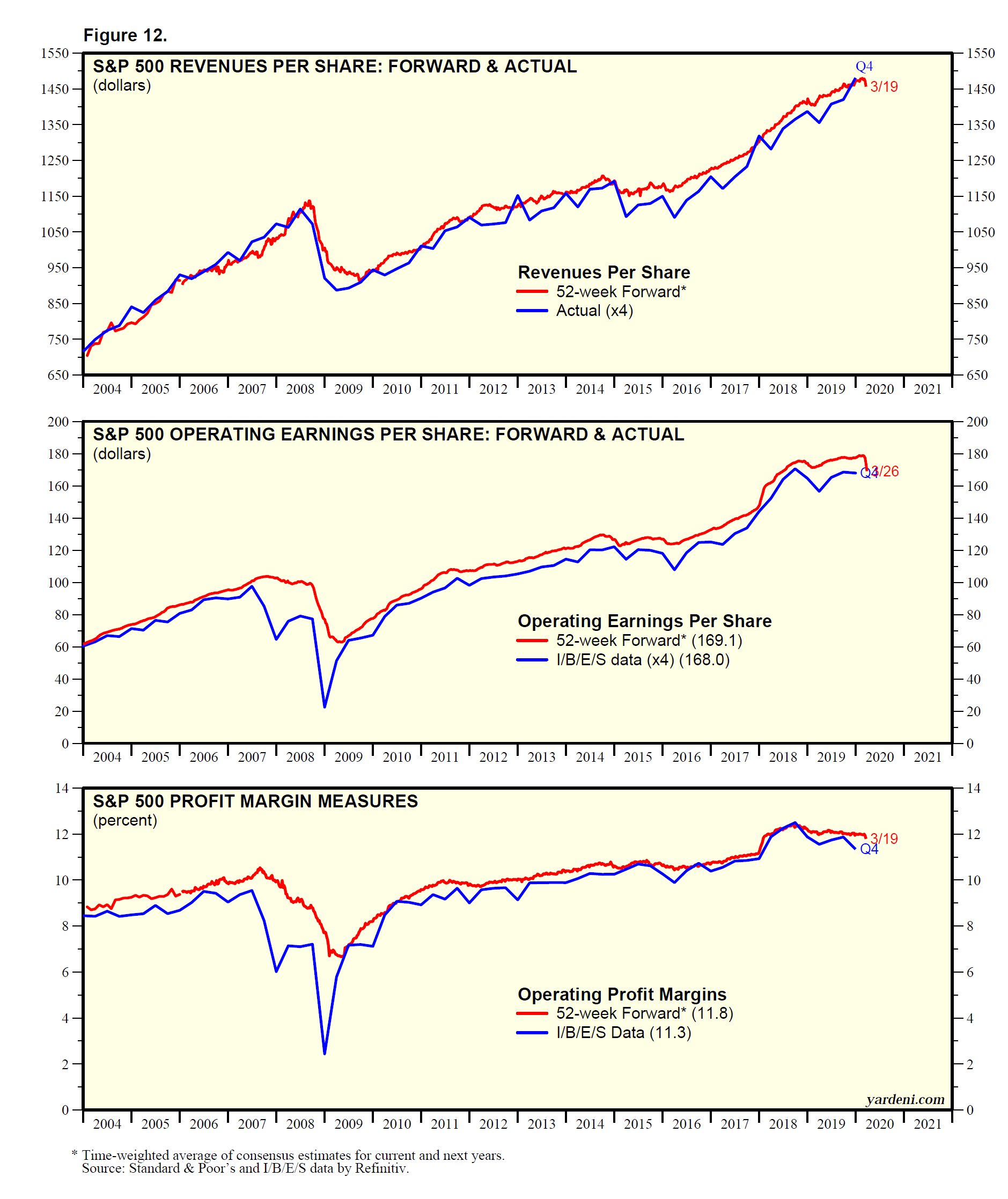 That series has been one of the most reliable barometers of the performance of the global economy that we use. We wouldn’t like to see it stall this year, and we don’t expect that it will do so. Instead, we think it will resume its uptrend consistent with S&P 500 revenues growth of 4%-5%. That’s the growth rate range that we also expect for S&P 500 earnings per share this year, assuming, as we do, that the S&P 500 profit margin will remain around its record high of 12.0% (Fig. 12).