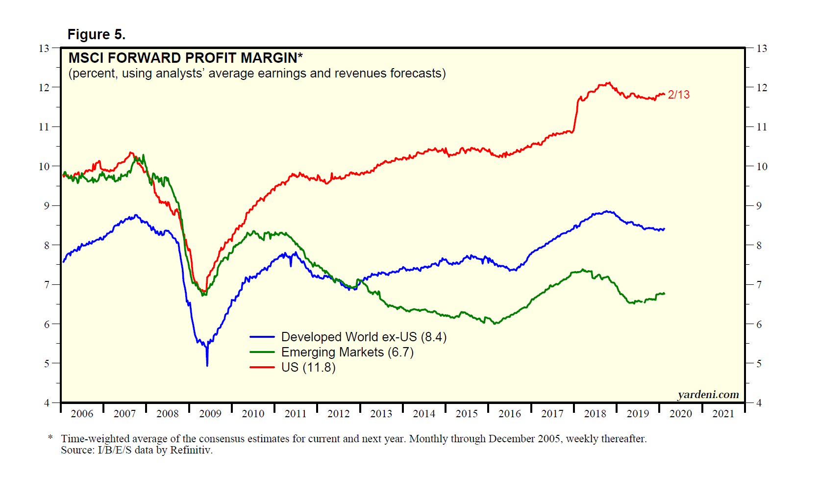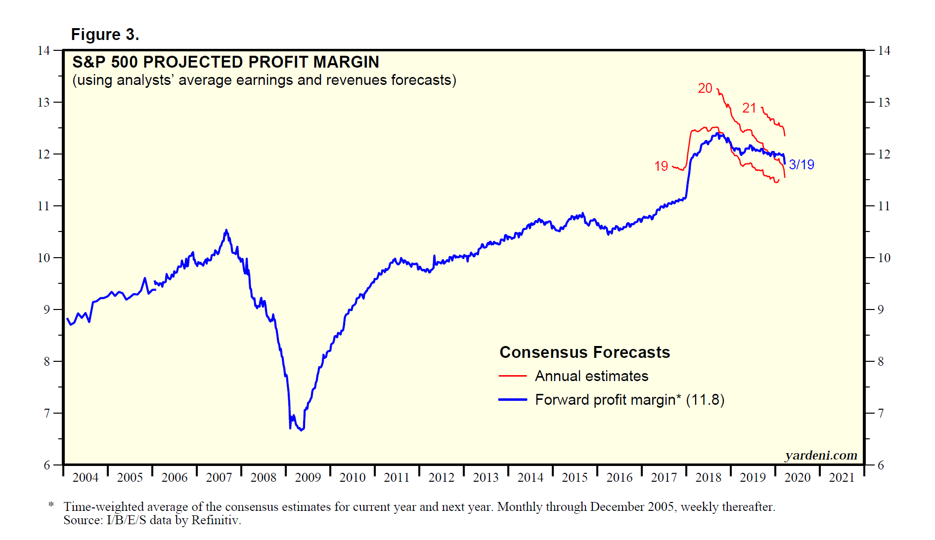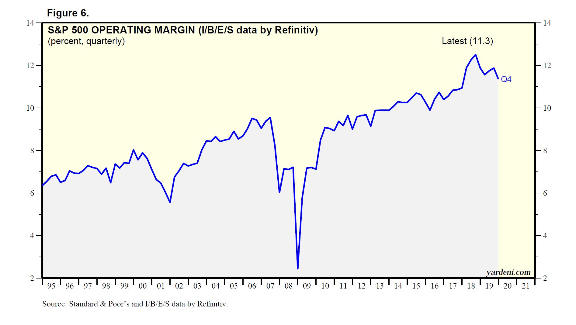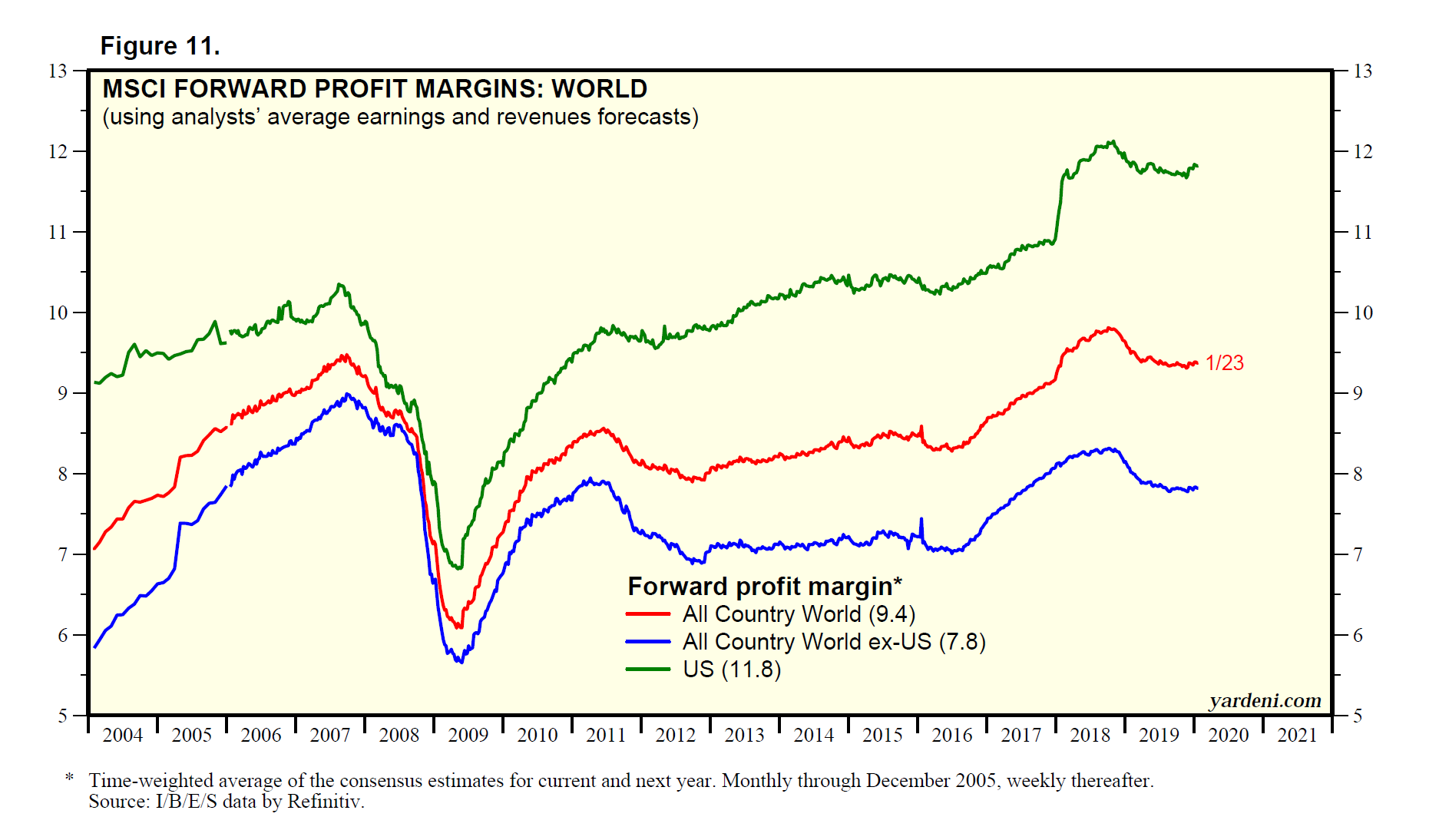 That series has been one of the most reliable barometers of the performance of the global economy that we use. We wouldn’t like to see it stall this year, and we don’t expect that it will do so. Instead, we think it will resume its uptrend consistent with S&P 500 revenues growth of 4%-5%. That’s the growth rate range that we also expect for S&P 500 earnings per share this year, assuming, as we do, that the S&P 500 profit margin will remain around its record high of 12.0% (Fig. 12).