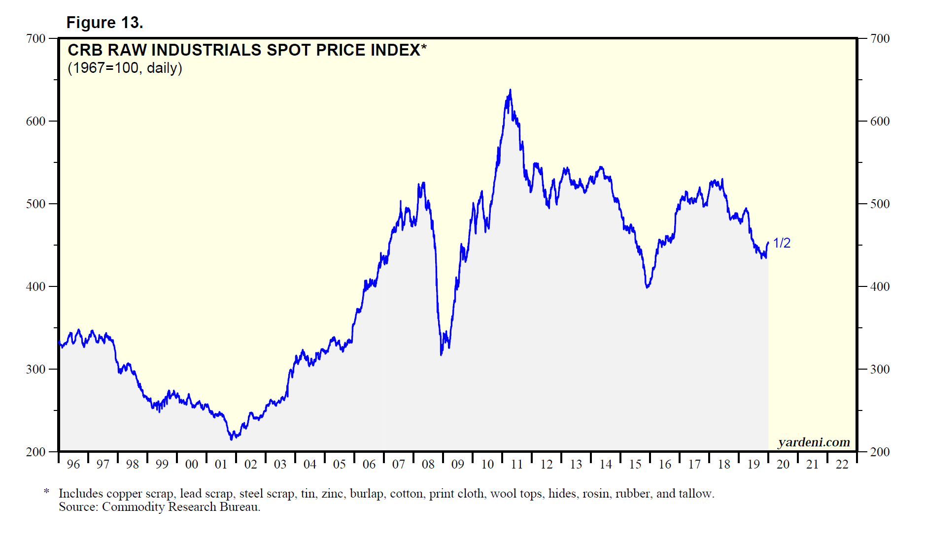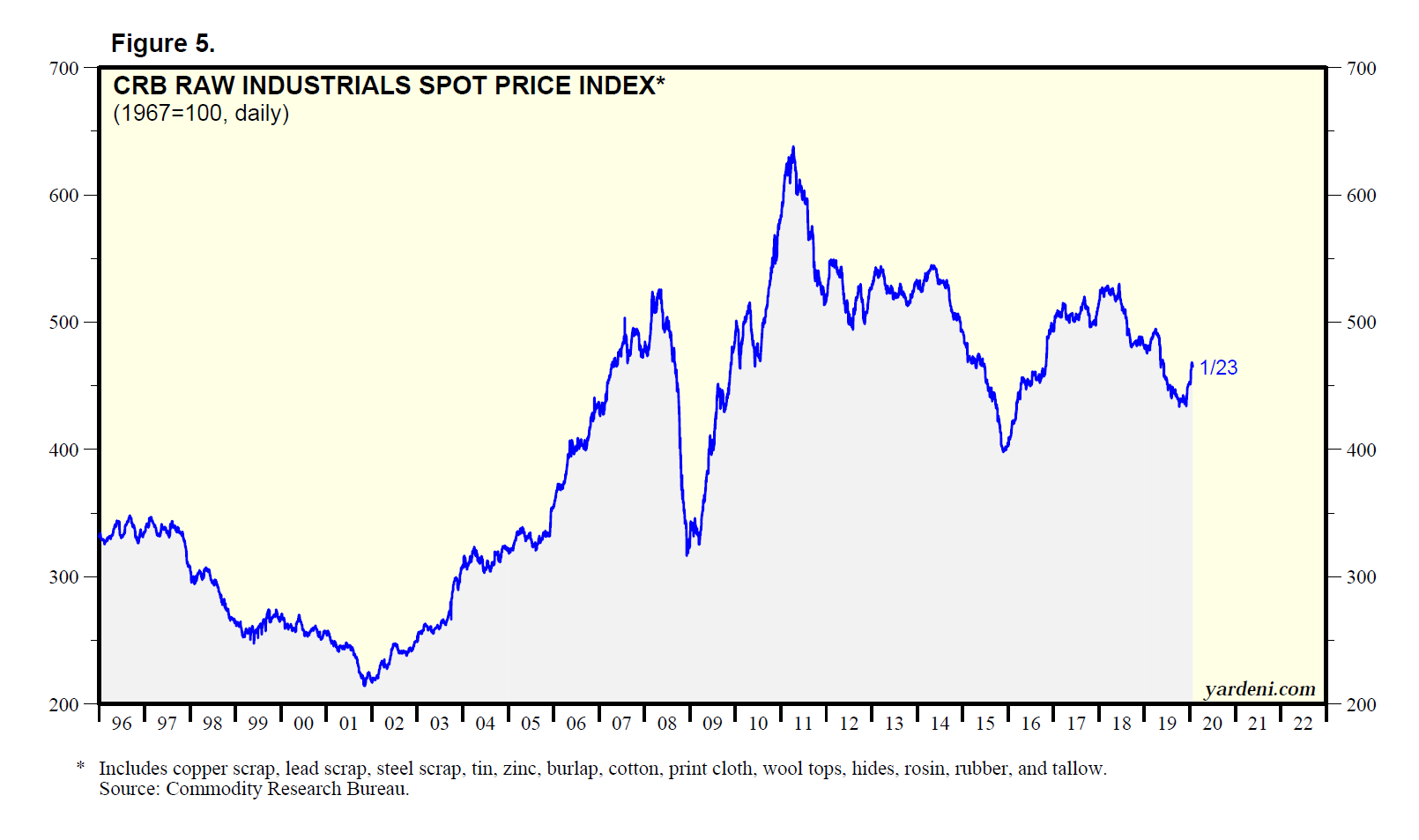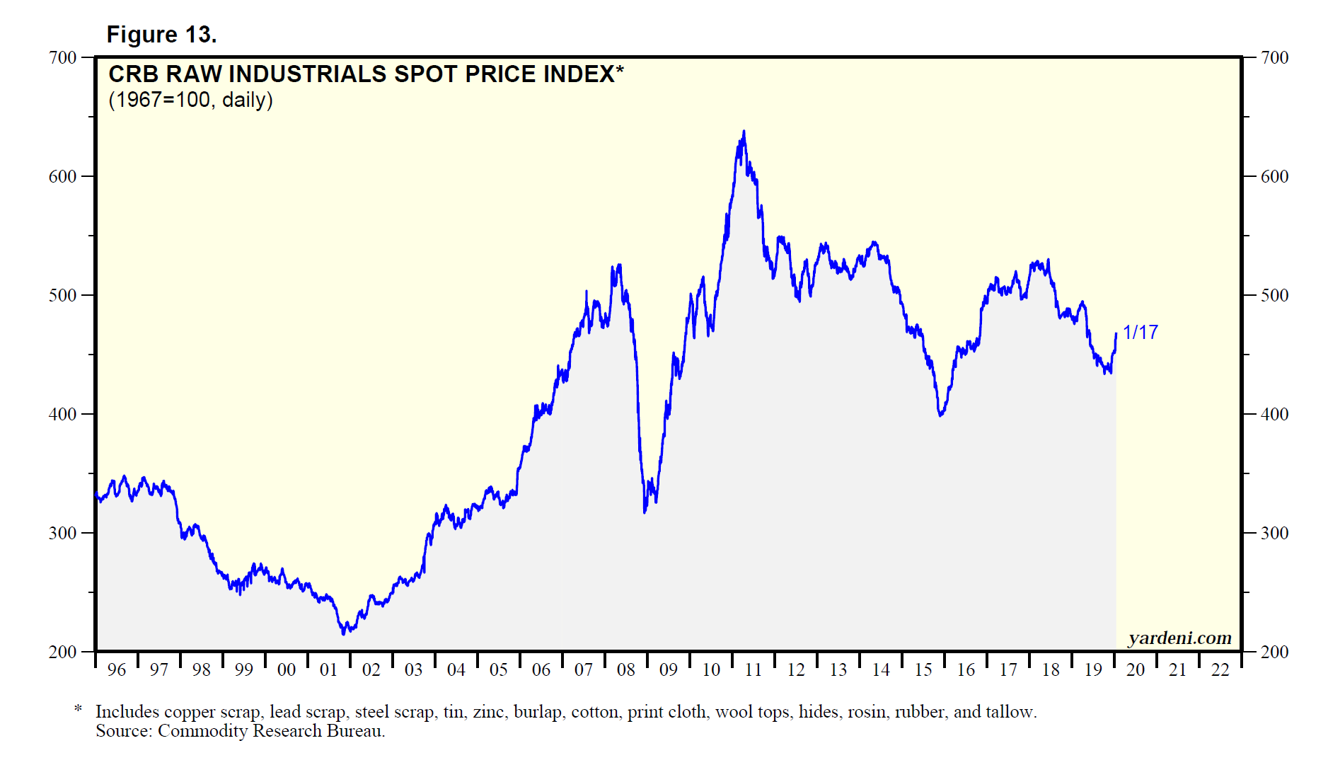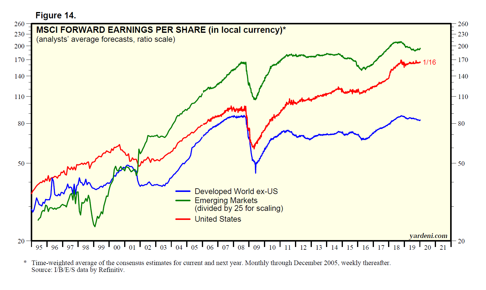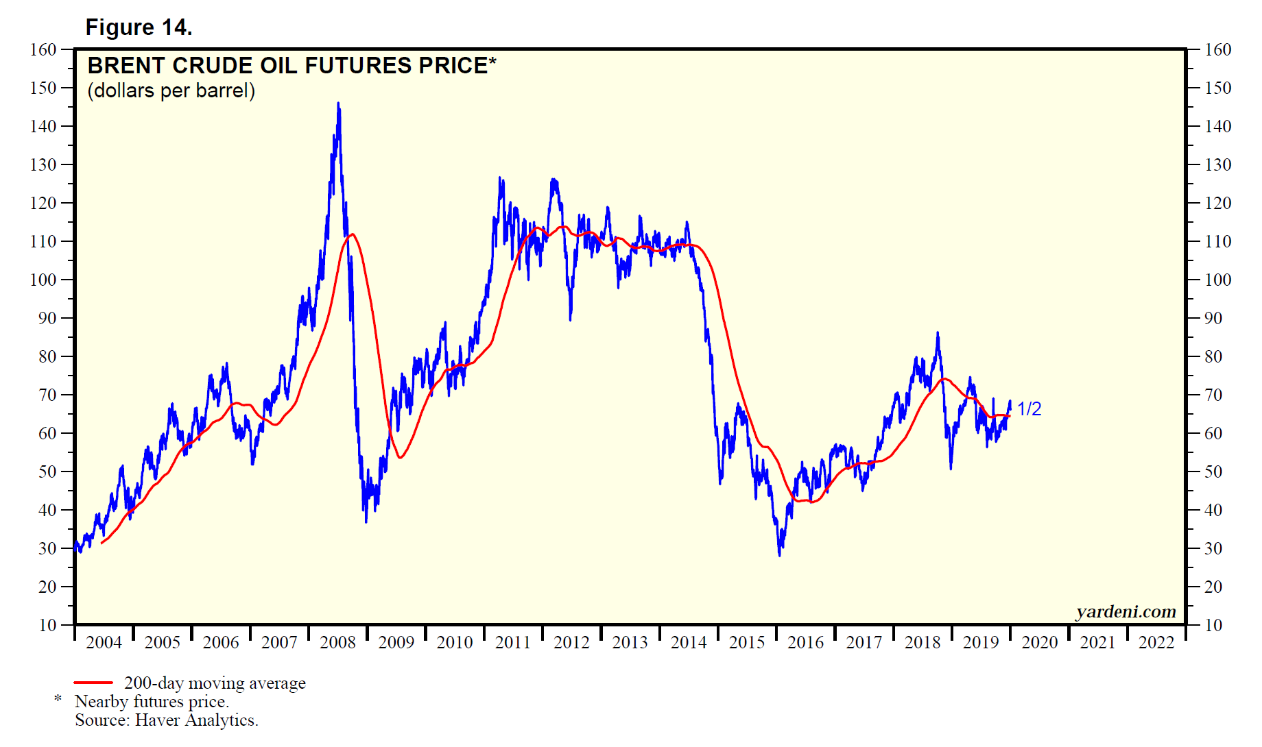 Strategy IV: Will the Global Economy Deliver Earnings Growth? The old year ended and the new year started with a rebound in the CRB raw industrials spot price index (Fig. 13). This index does not include crude oil or any petroleum products. So it is an encouraging sign for global growth. That’s good for corporate earnings. So is the increase in the price of a barrel of Brent crude oil since last summer, including Friday’s spike on renewed tensions in the Middle East (Fig. 14). As long as both the CRB and oil prices are rising, that’s a good signal for global growth. However, we wouldn’t like to see a continued spike in oil prices that hurts the global economy and pushes other commodity prices back down.