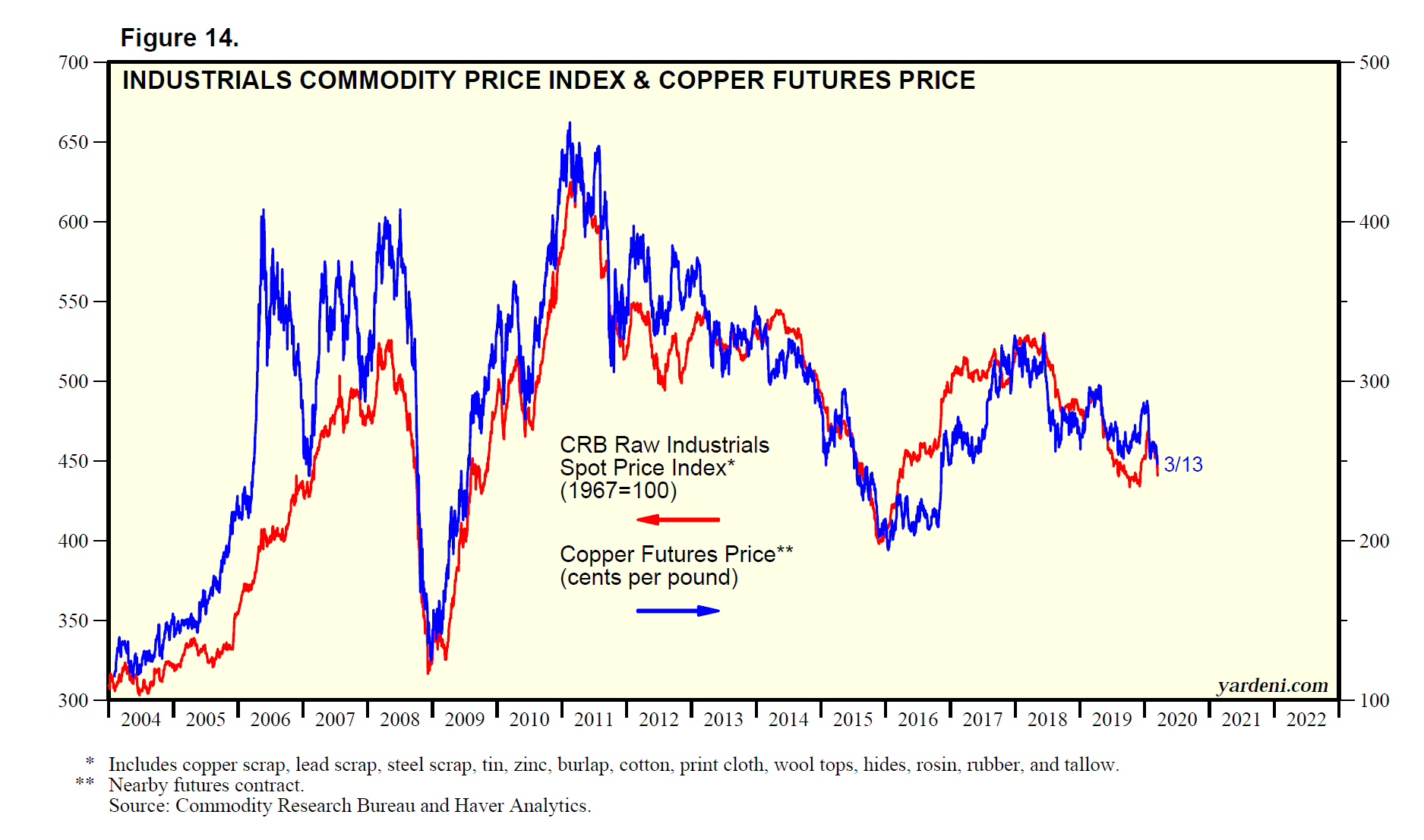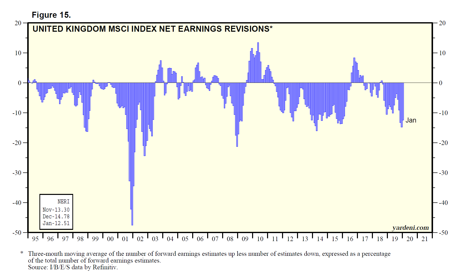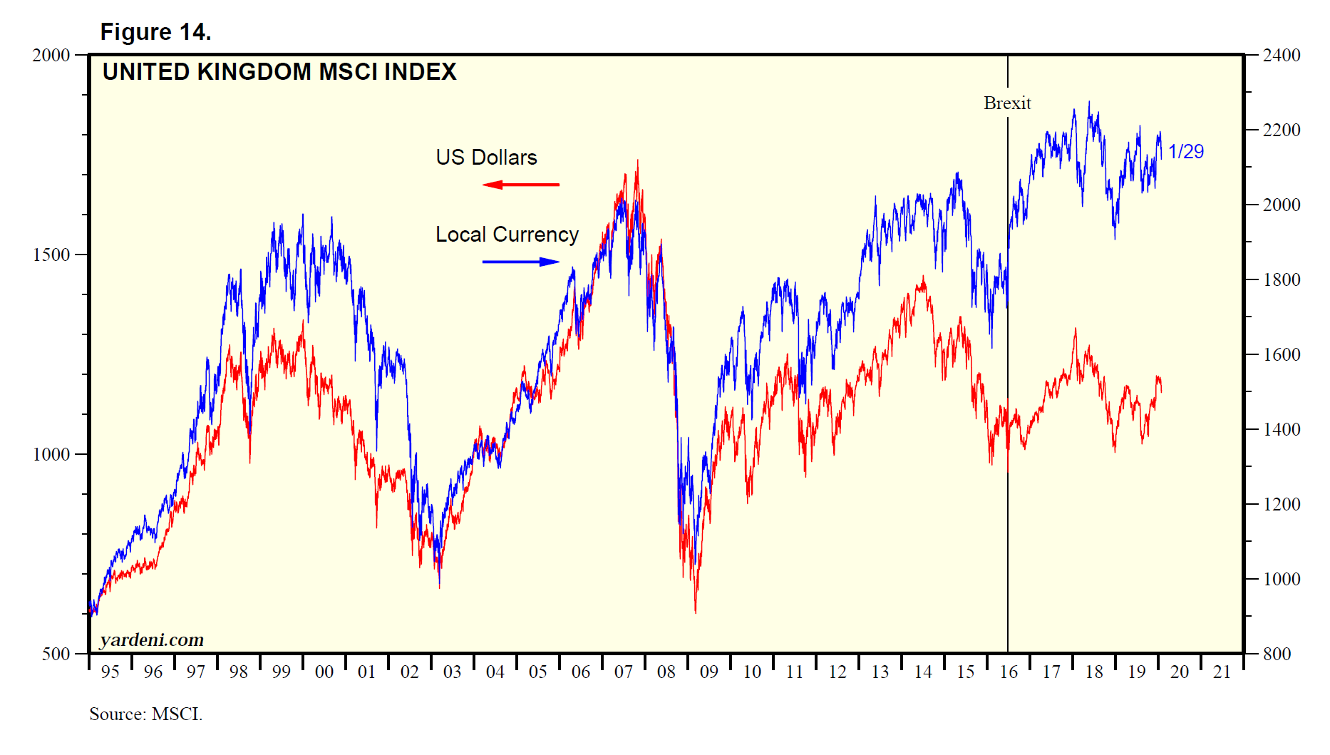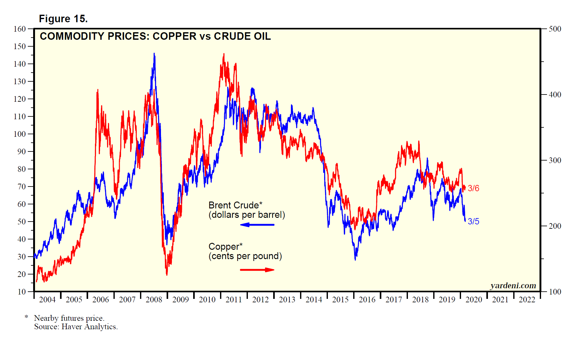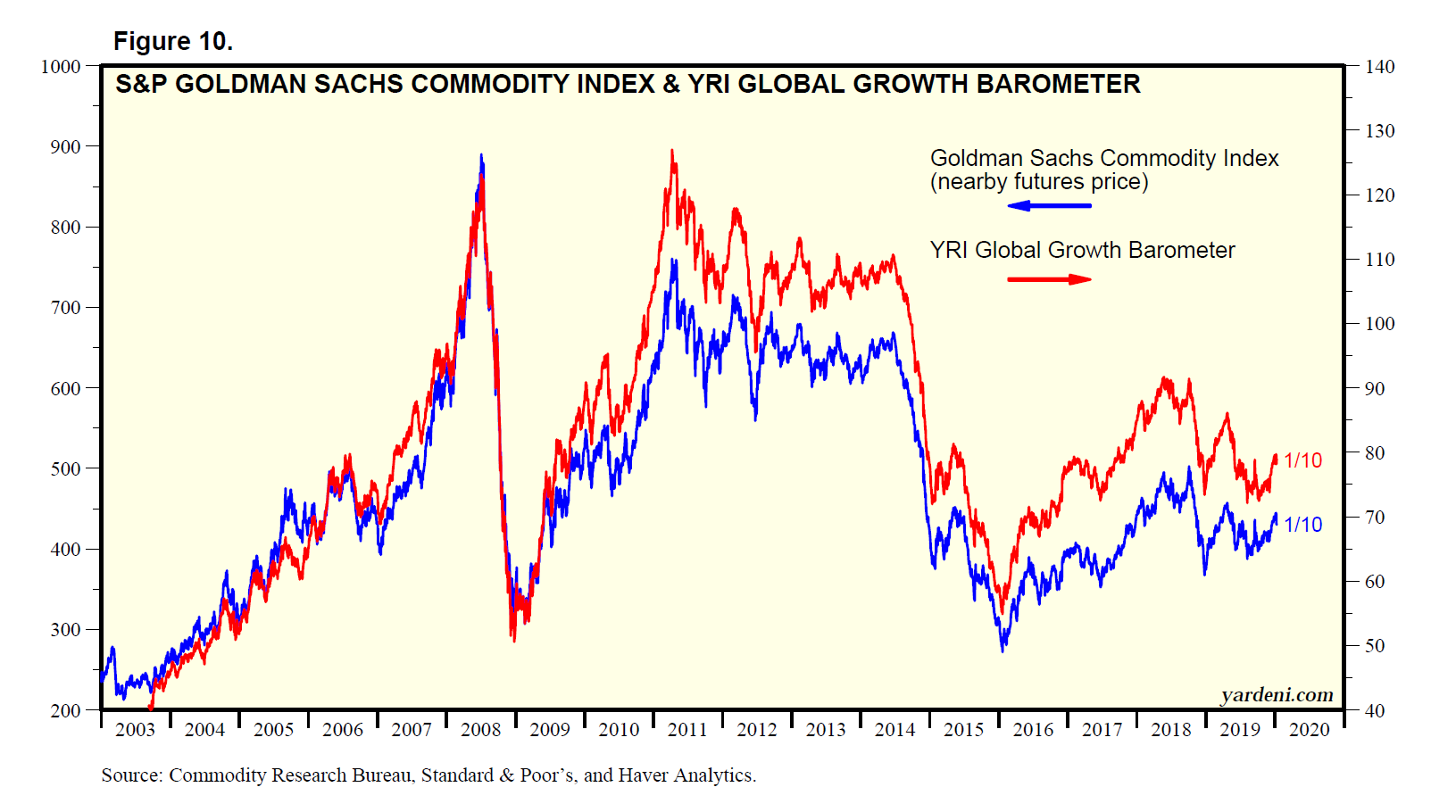 Strategy IV: Will the Global Economy Deliver Earnings Growth? The old year ended and the new year started with a rebound in the CRB raw industrials spot price index (Fig. 13). This index does not include crude oil or any petroleum products. So it is an encouraging sign for global growth. That’s good for corporate earnings. So is the increase in the price of a barrel of Brent crude oil since last summer, including Friday’s spike on renewed tensions in the Middle East (Fig. 14). As long as both the CRB and oil prices are rising, that’s a good signal for global growth. However, we wouldn’t like to see a continued spike in oil prices that hurts the global economy and pushes other commodity prices back down.