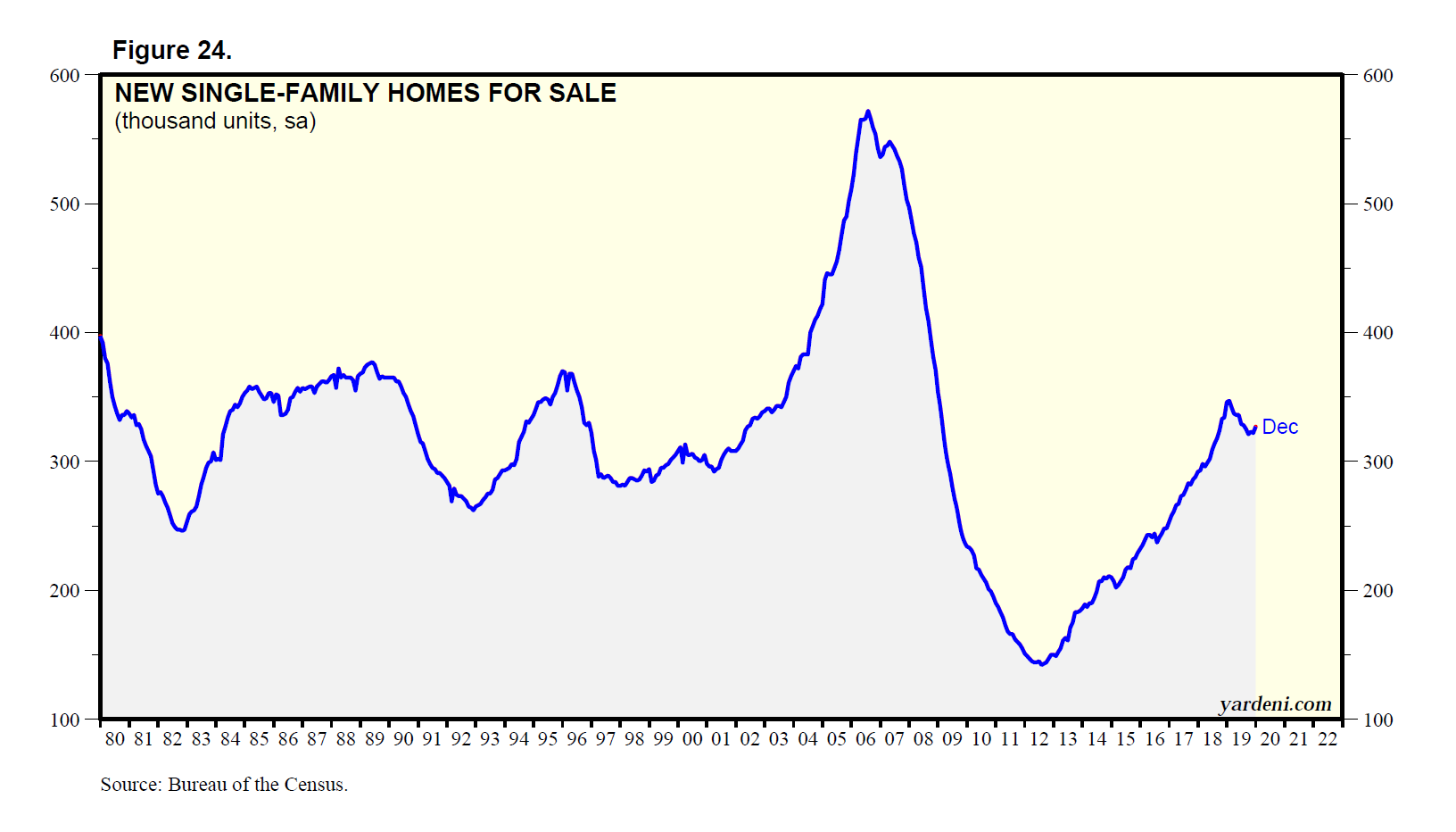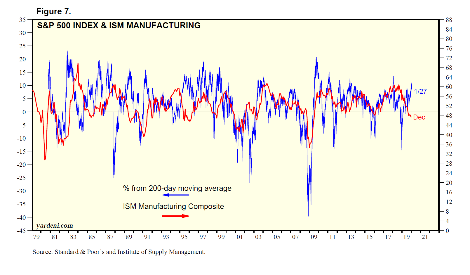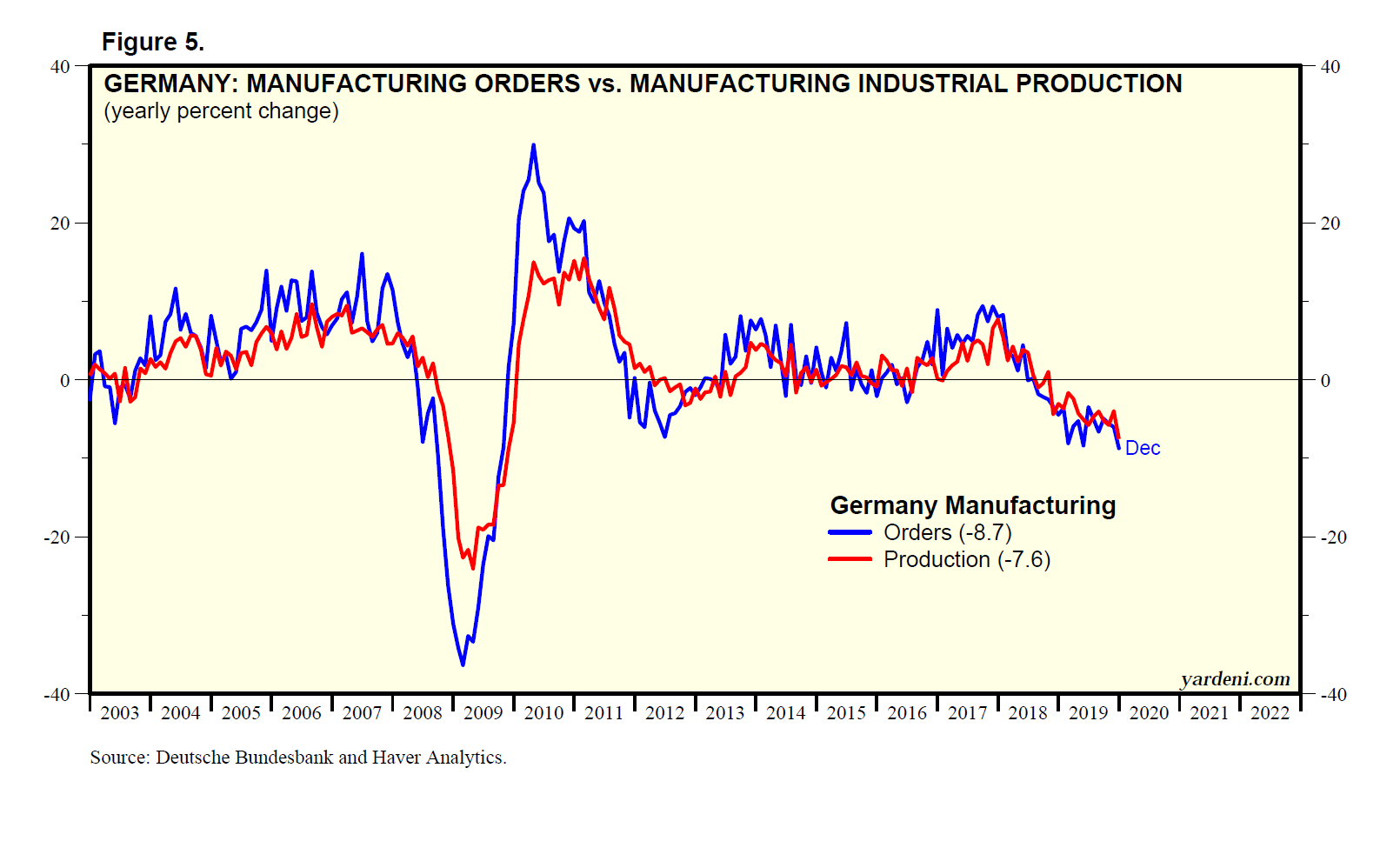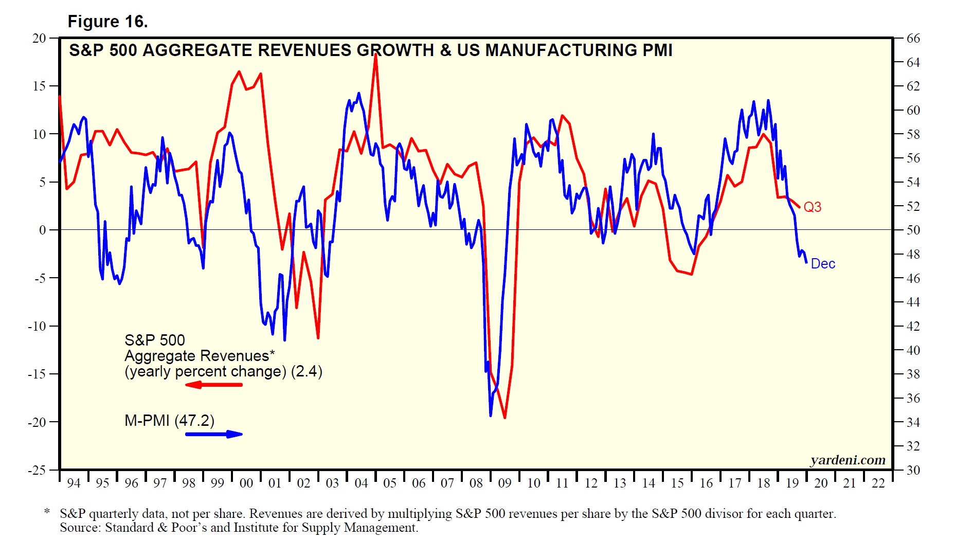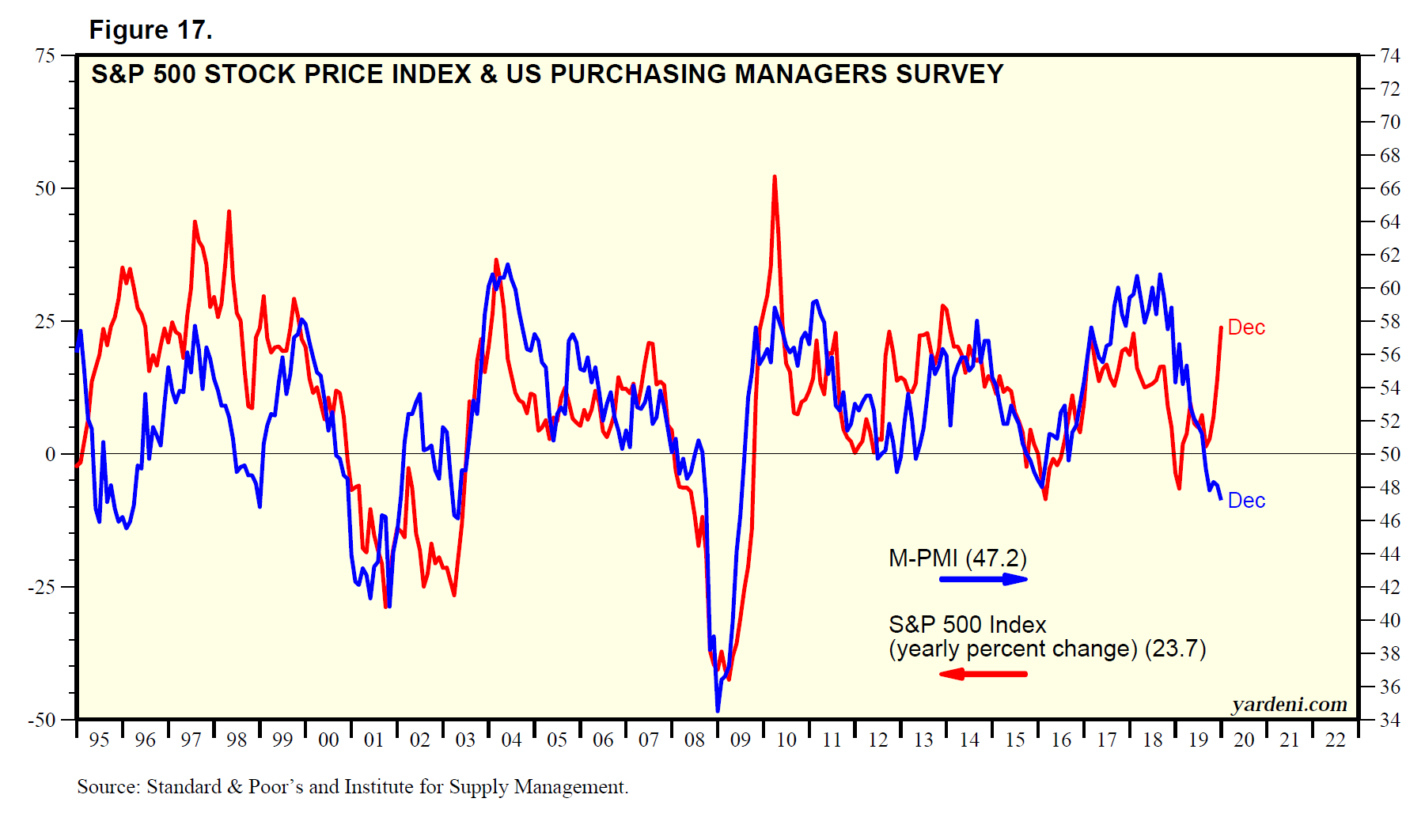 Some of the surprising weakness in the US M-PMI was attributable to the production cutback at Boeing, but that should have been offset by the rebound in auto production following the strike at GM. That’s not a good harbinger for the growth rate in S&P 500 revenues, which is highly correlated with the US M-PMI (Fig. 16). On the other hand, the S&P 500 stock price index, on a y/y percentage change basis, is up 23.7% through December, perhaps foreshadowing a rebound in the M-PMI (Fig. 17).