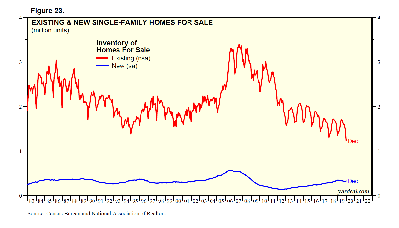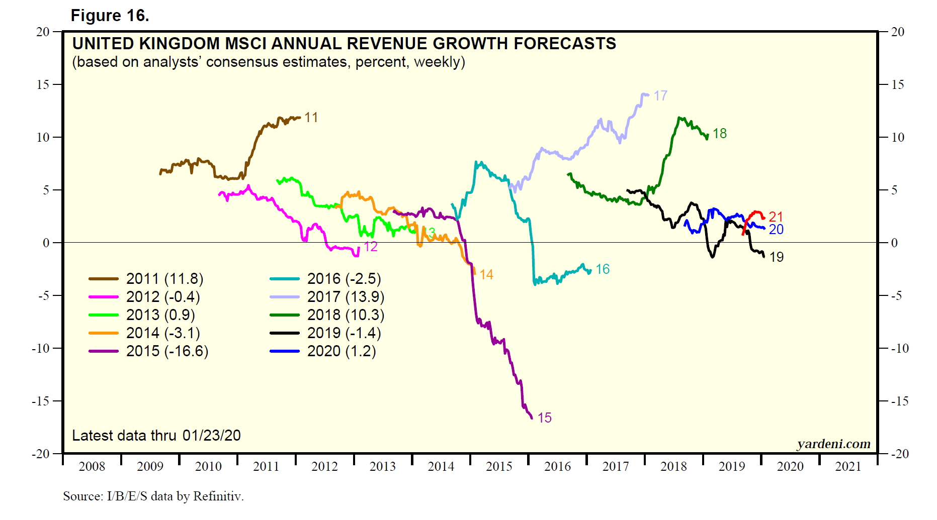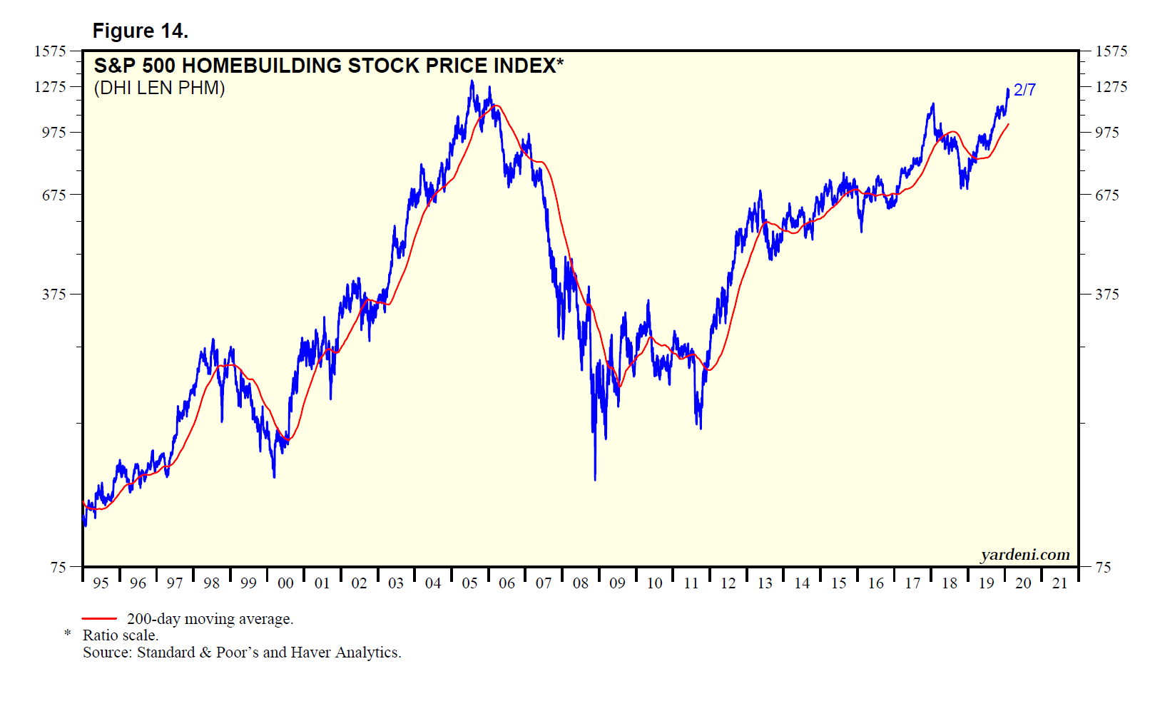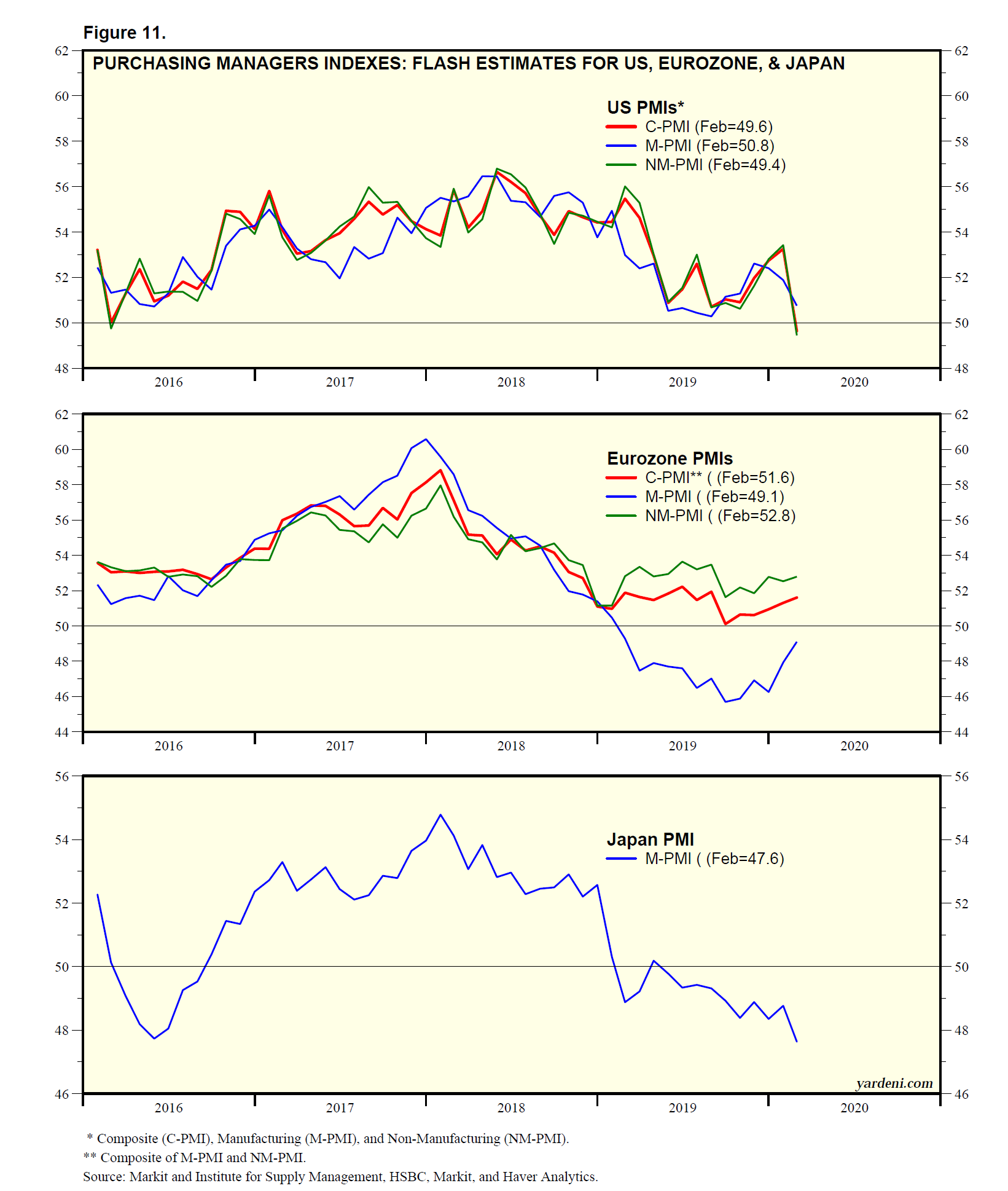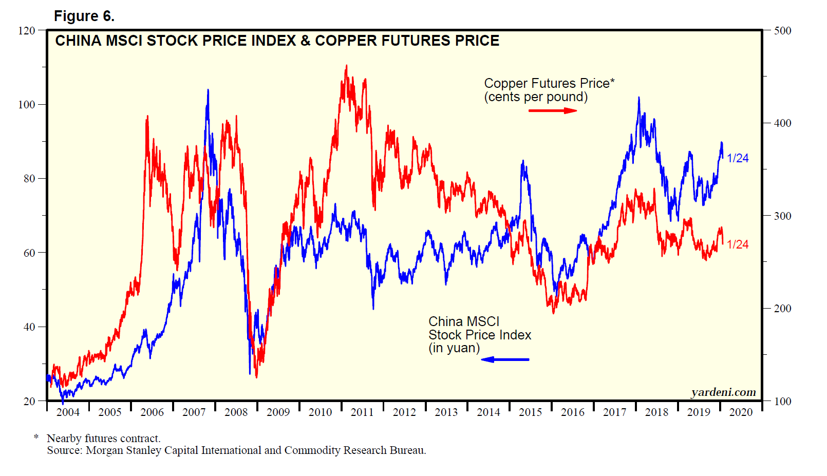 Some of the surprising weakness in the US M-PMI was attributable to the production cutback at Boeing, but that should have been offset by the rebound in auto production following the strike at GM. That’s not a good harbinger for the growth rate in S&P 500 revenues, which is highly correlated with the US M-PMI (Fig. 16). On the other hand, the S&P 500 stock price index, on a y/y percentage change basis, is up 23.7% through December, perhaps foreshadowing a rebound in the M-PMI (Fig. 17).