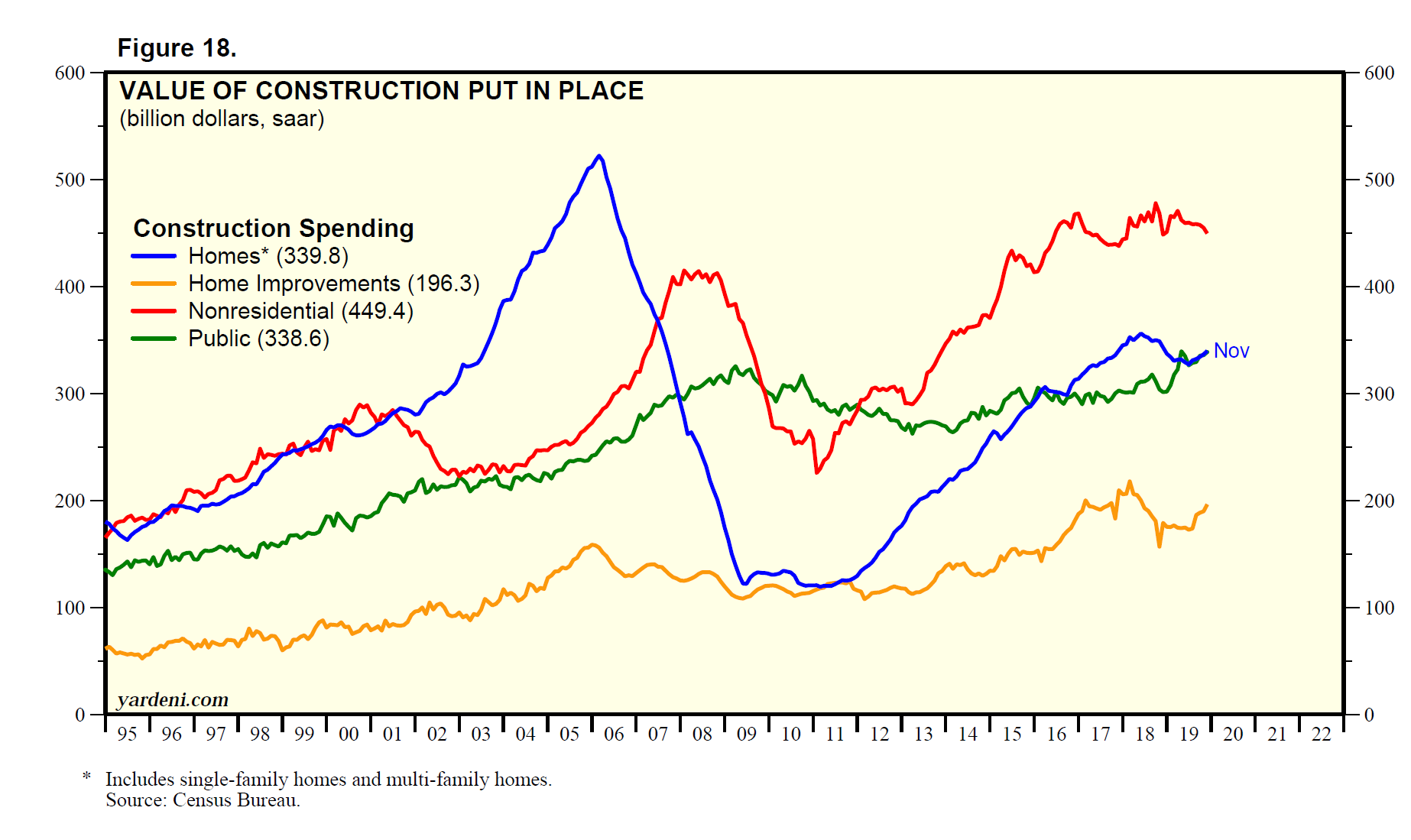 (2) US construction spending. In the US, construction spending has rebounded in recent months back to the record highs of early 2018, led by public construction outlays as well as residential construction, including home improvements. On the other hand, nonresidential construction spending weakened during most of last year (Fig. 18).