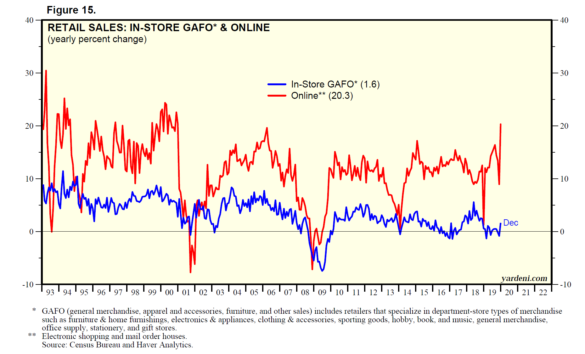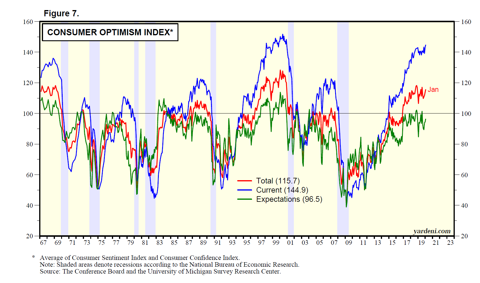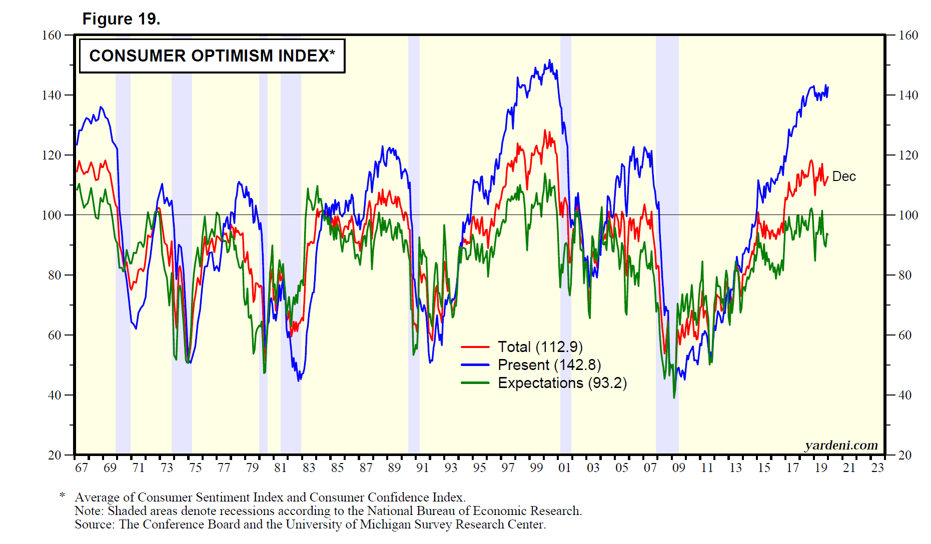 (3) US consumer optimism. In the US, the Consumer Sentiment Index rebounded late last year, while the Consumer Confidence Index stalled. The average of the two has stalled at its cyclical high over the past year (Fig. 19). At 47.0% during December, the percentage of consumers reporting that jobs are plentiful also remained at the series’ cyclical high. American consumers continue to have the will and the means to spend.