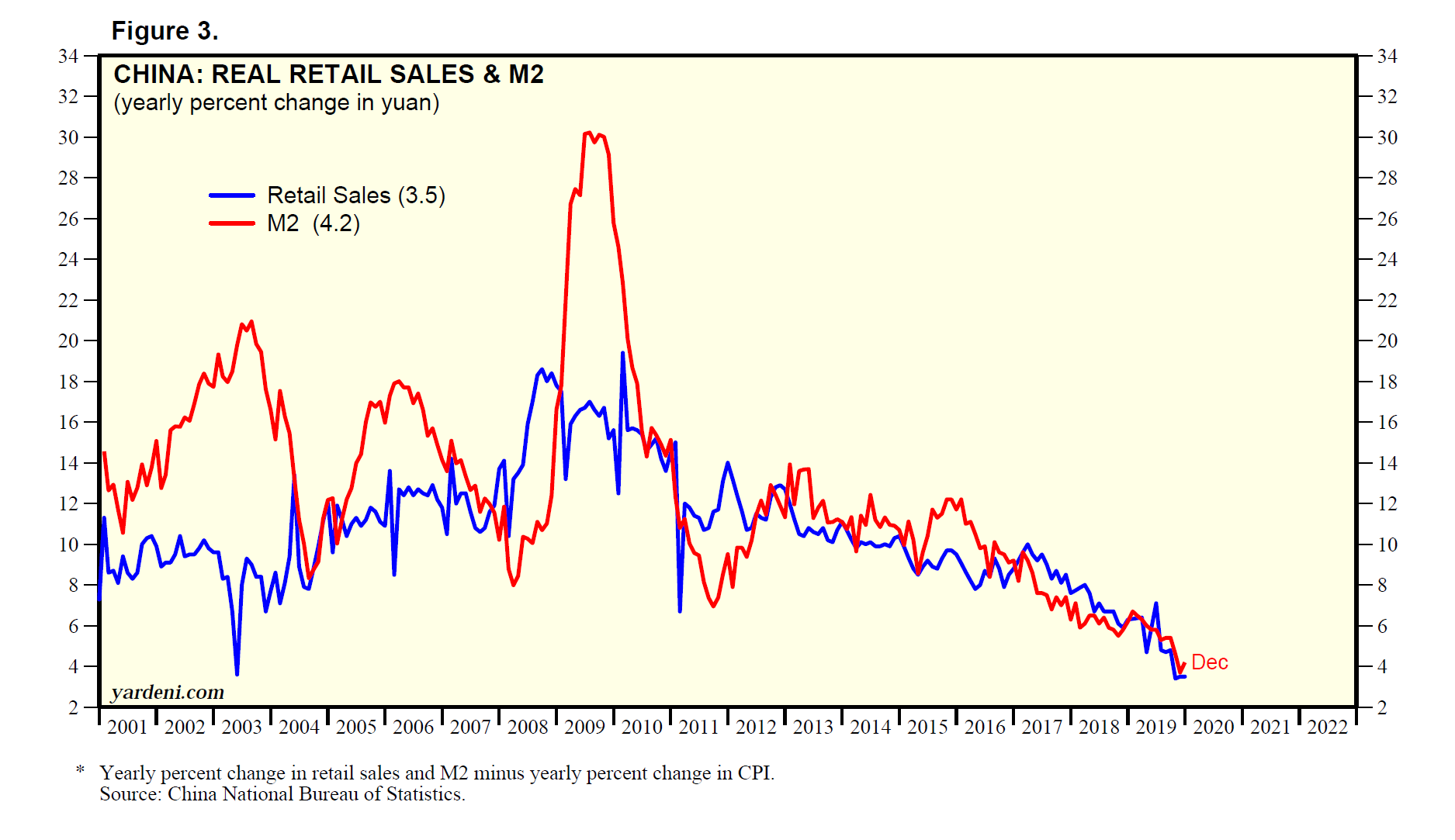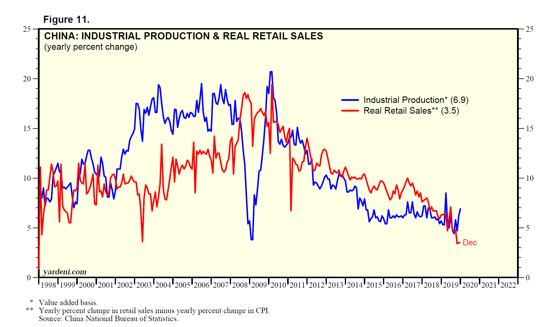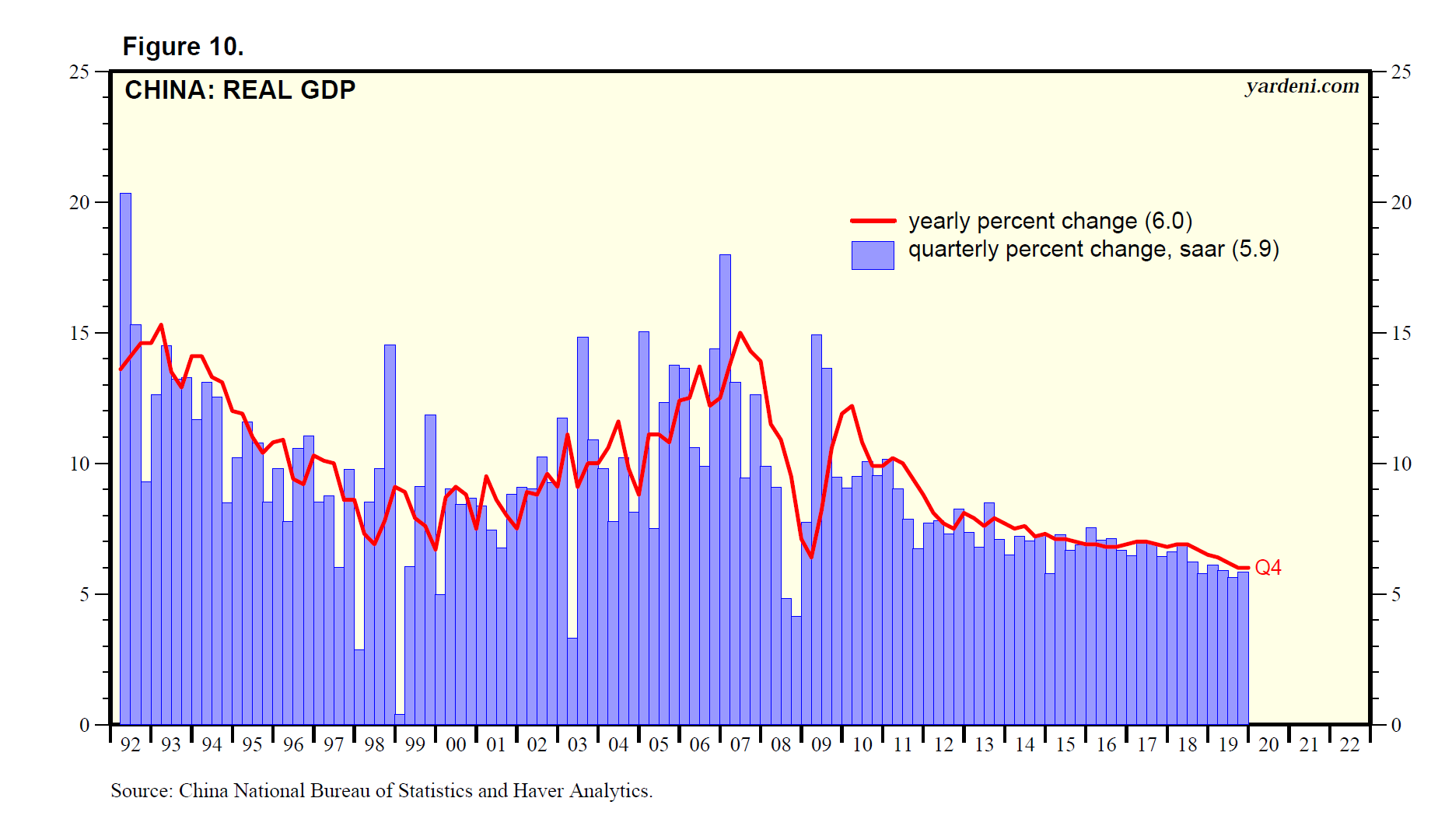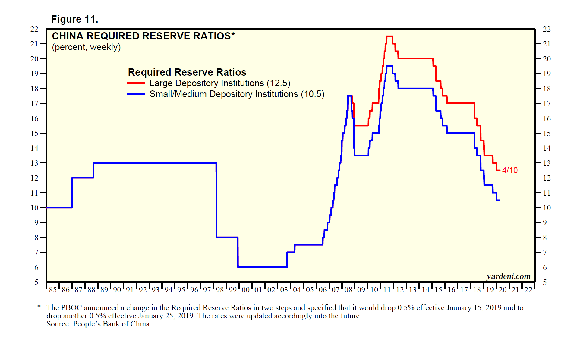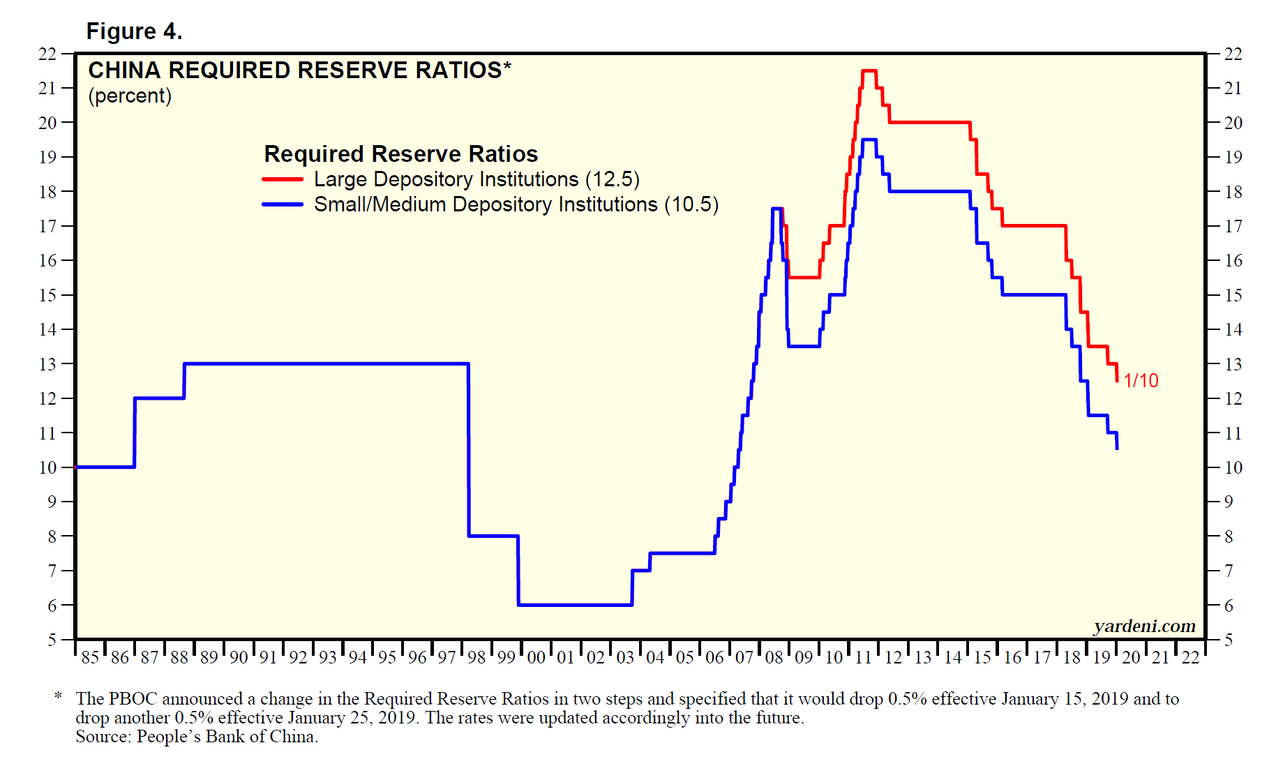 (4) PBOC. As we mentioned yesterday, the PBOC cut bank reserve requirement ratios at the beginning of this year (effective 1/6) to the lowest levels since 2007 (Fig. 7). That action will release about 800 billion yuan ($115 billion). The PBOC has now cut seven times since early 2018 to free up more funds for banks to lend as economic growth slows to the weakest pace in nearly 30 years.