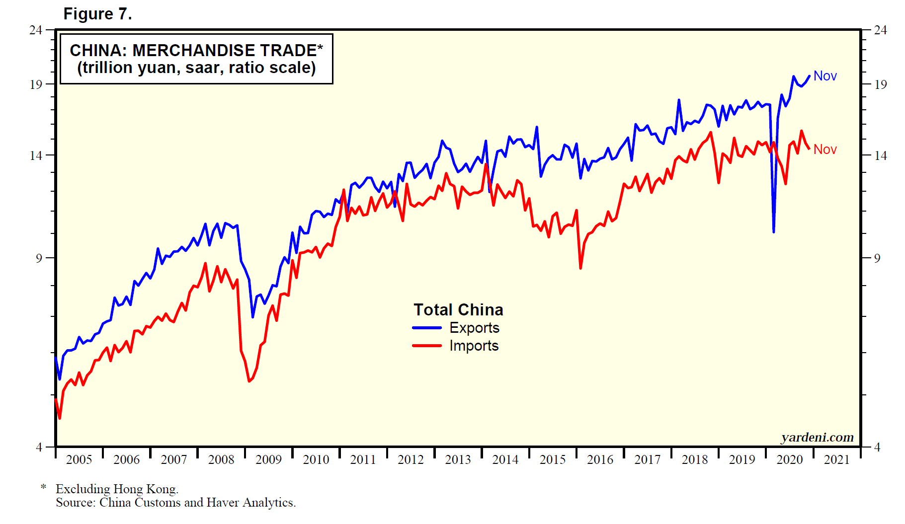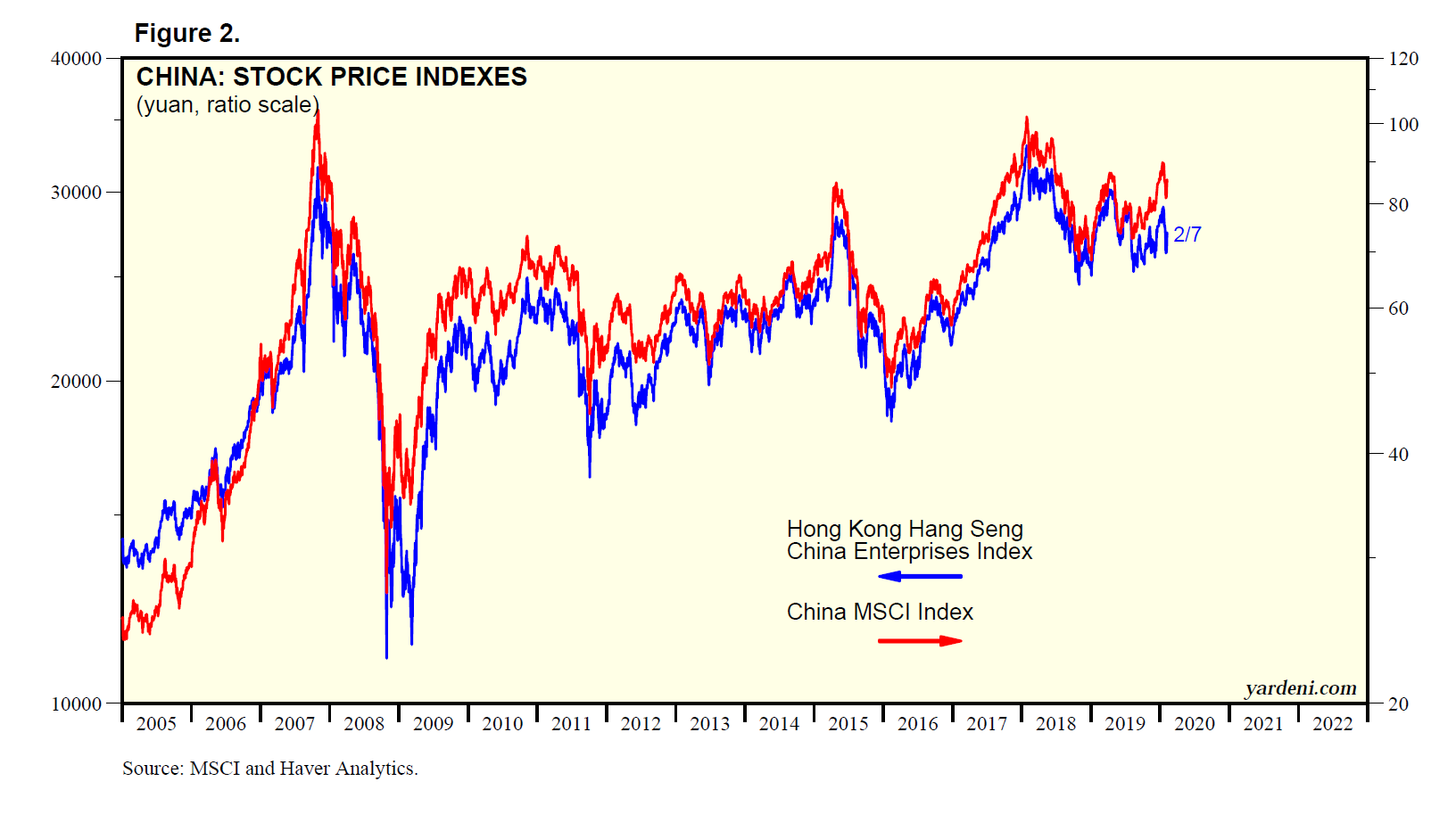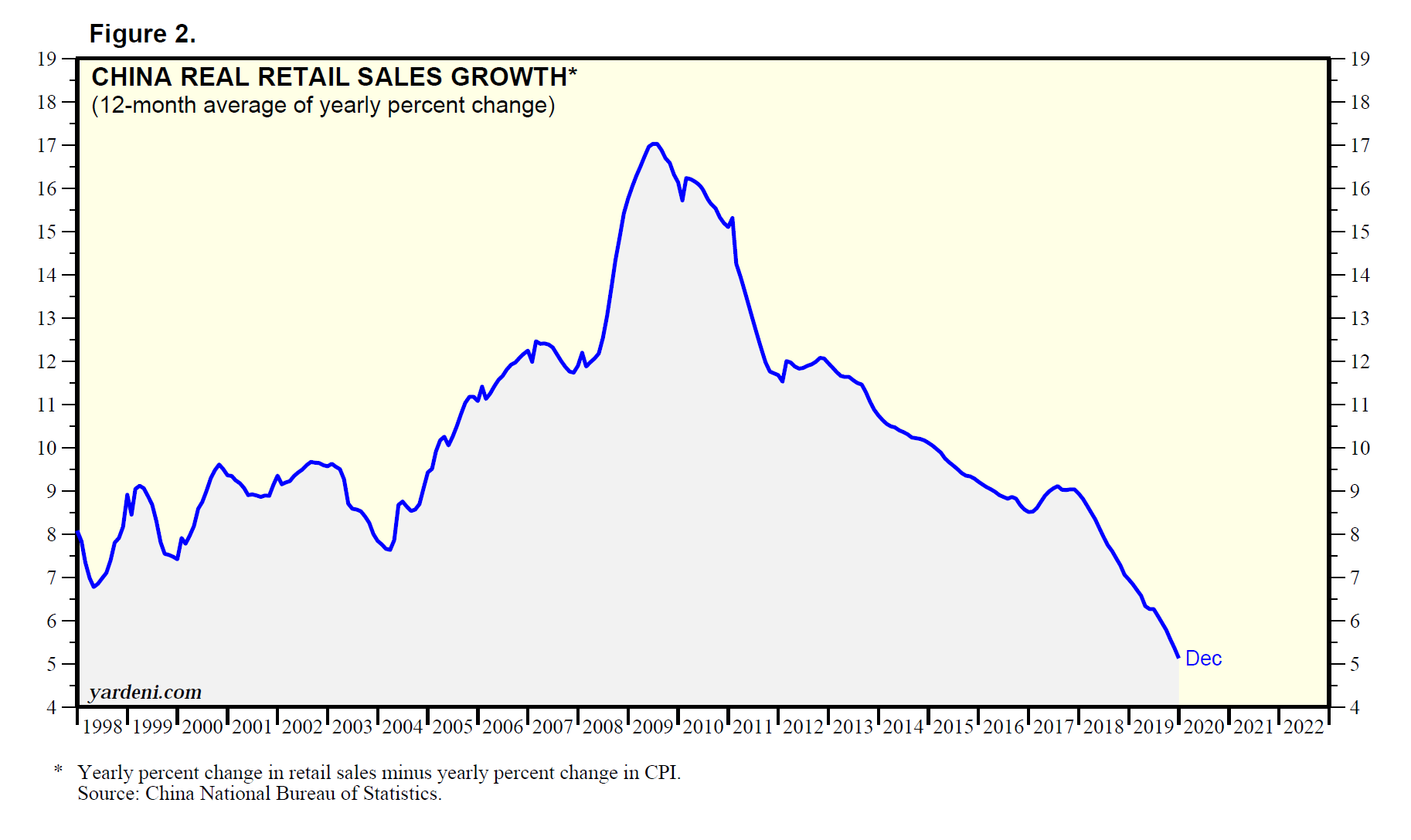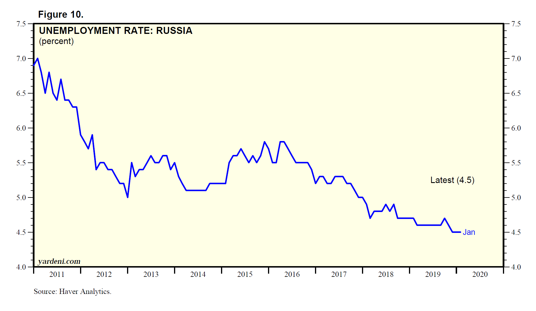 (4) PBOC. As we mentioned yesterday, the PBOC cut bank reserve requirement ratios at the beginning of this year (effective 1/6) to the lowest levels since 2007 (Fig. 7). That action will release about 800 billion yuan ($115 billion). The PBOC has now cut seven times since early 2018 to free up more funds for banks to lend as economic growth slows to the weakest pace in nearly 30 years.