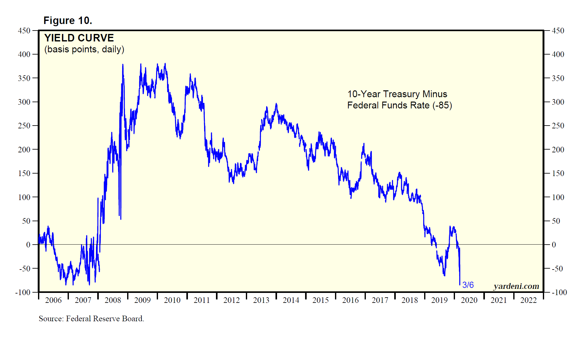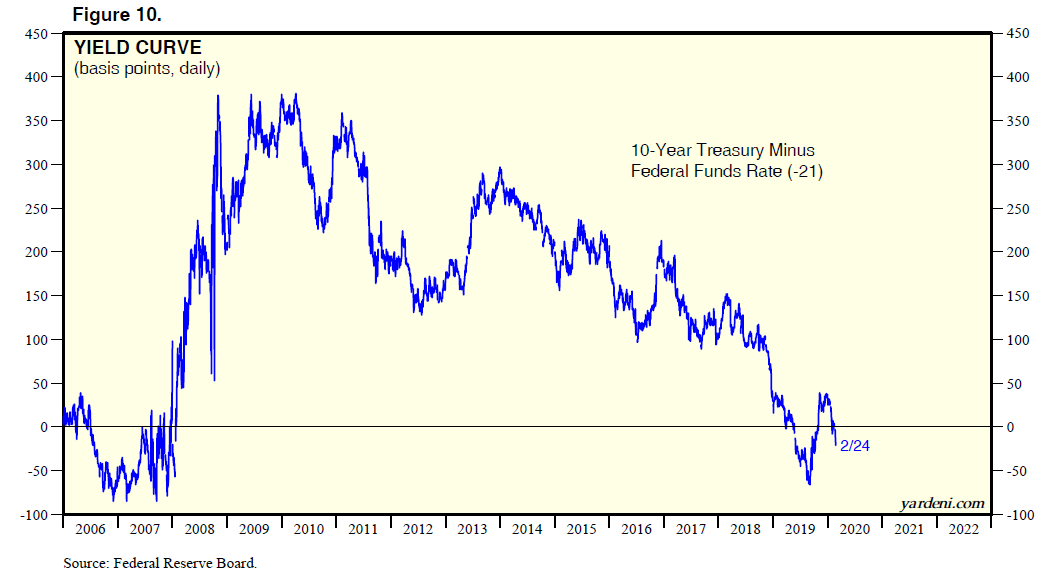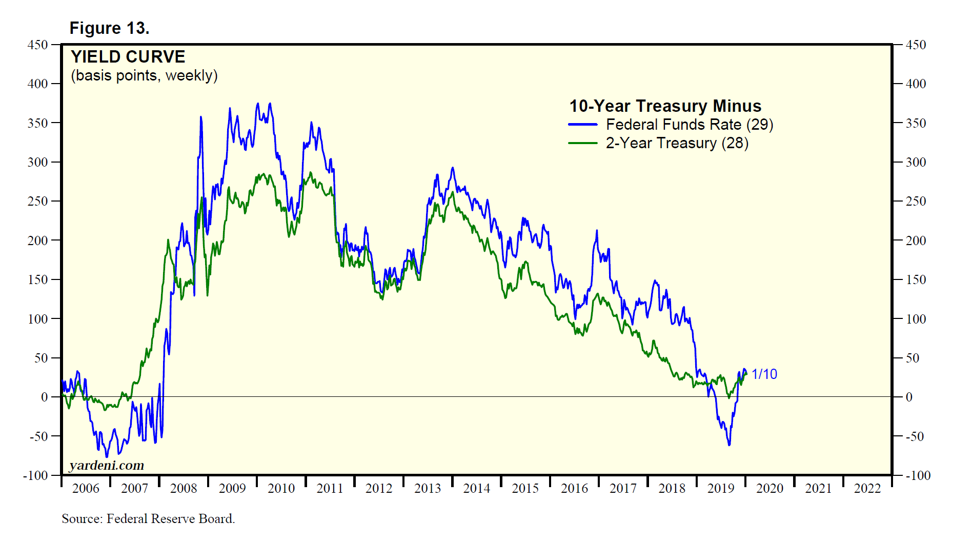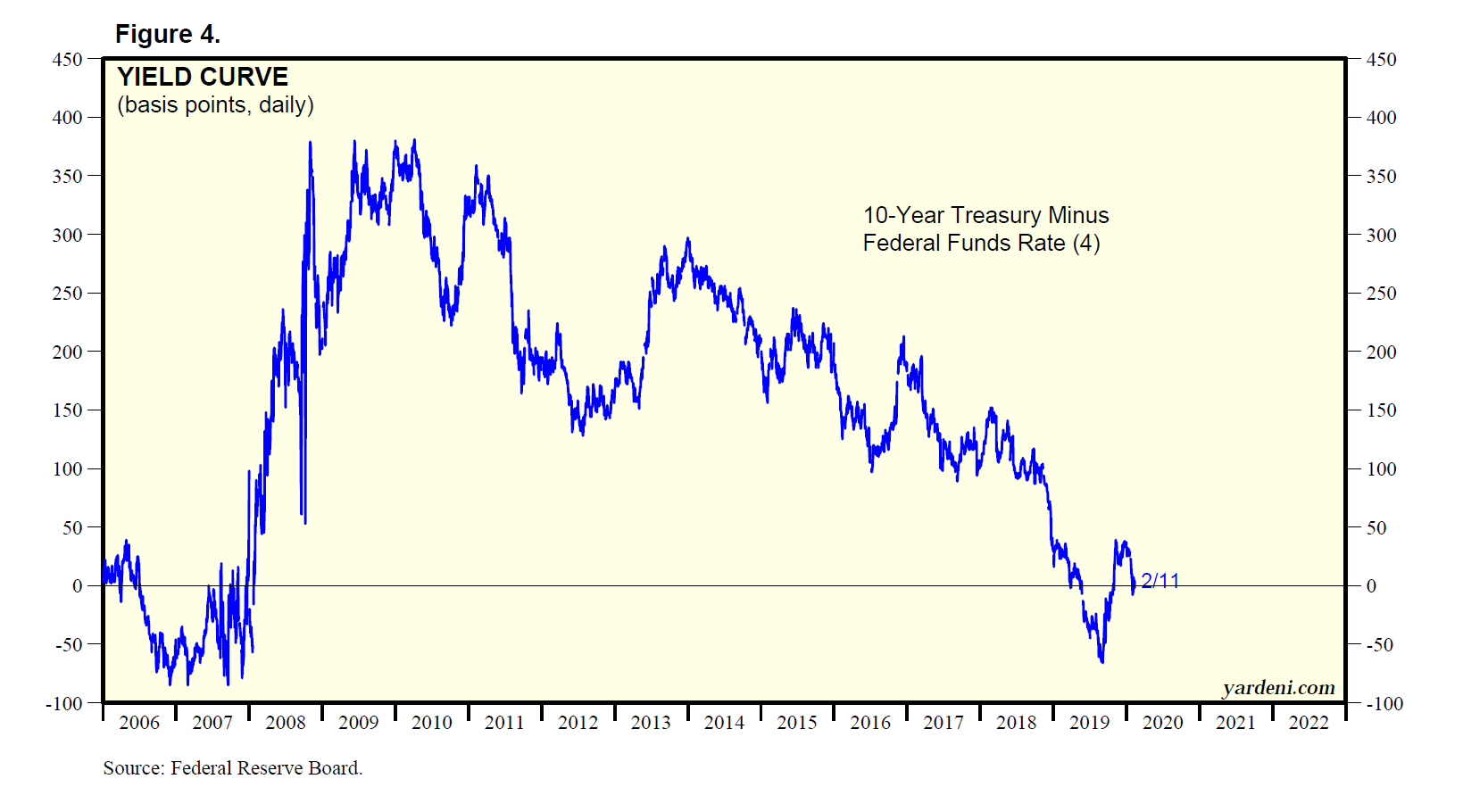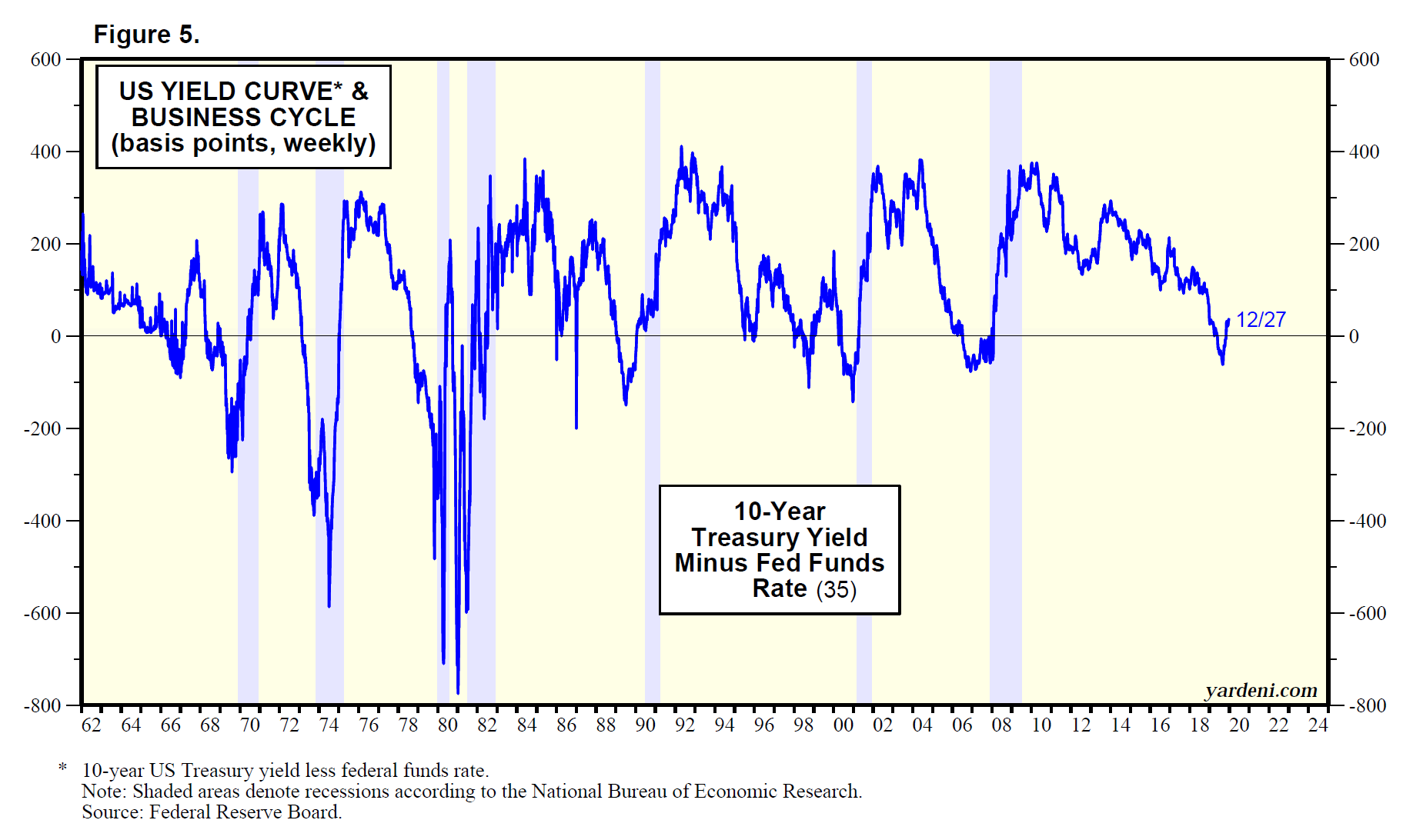 Joe and I have kept a diary of the current bull market’s panic attacks. We count 65 of them. There certainly has been plenty to worry about. Number 65 occurred last year in mid-August when investors feared that the inverted yield curve was signaling an imminent recession (Fig. 5). The second and third rate cuts by the Fed, along with rising bond yields during the fall of last year, put an upward slope on the yield curve and removed its inversion during the summer as a reason to worry. (See US Stock Market Panic Attacks, 2009-2019.)