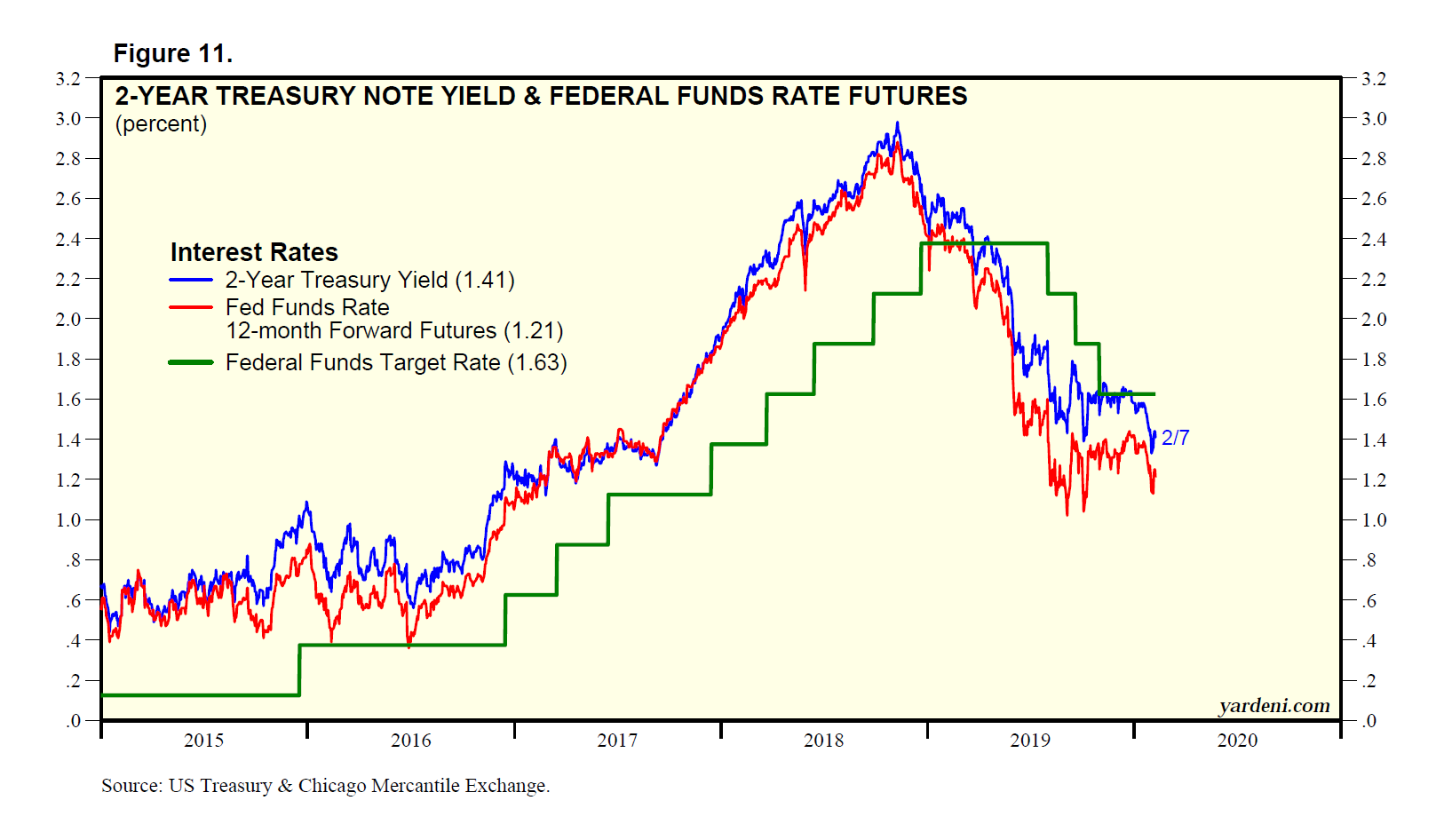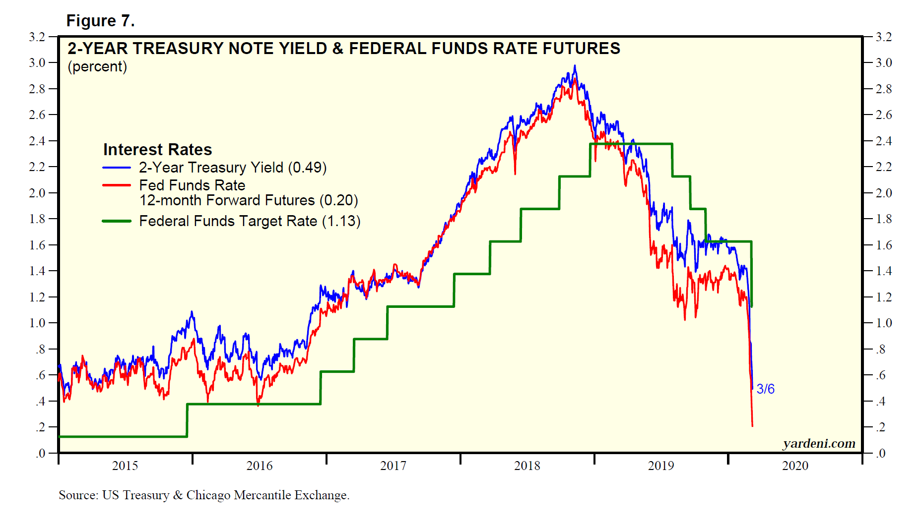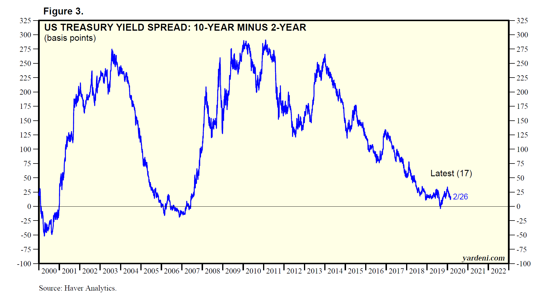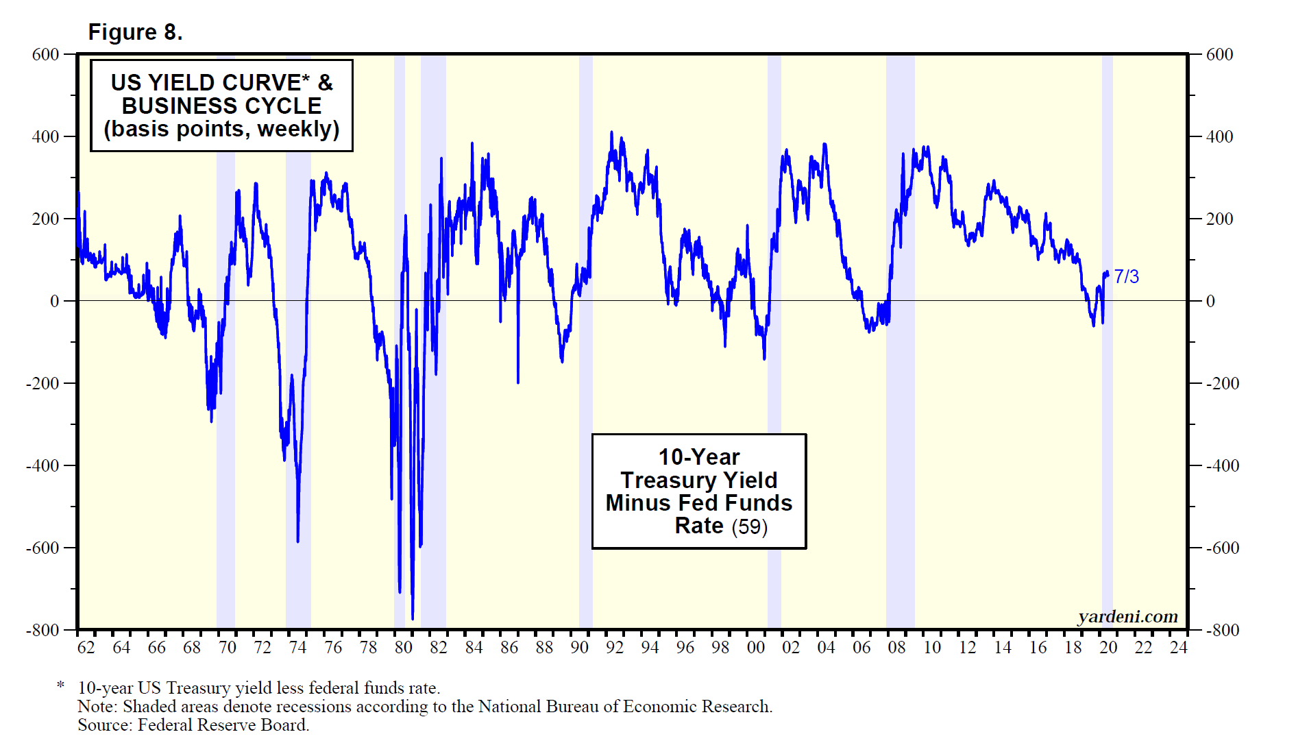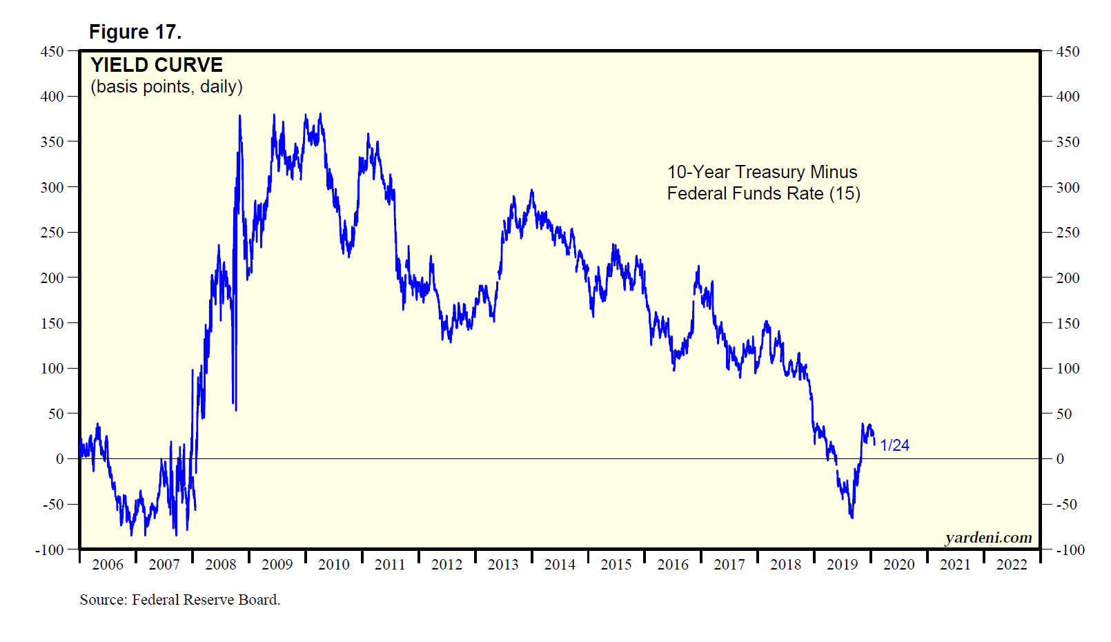 Joe and I have kept a diary of the current bull market’s panic attacks. We count 65 of them. There certainly has been plenty to worry about. Number 65 occurred last year in mid-August when investors feared that the inverted yield curve was signaling an imminent recession (Fig. 5). The second and third rate cuts by the Fed, along with rising bond yields during the fall of last year, put an upward slope on the yield curve and removed its inversion during the summer as a reason to worry. (See US Stock Market Panic Attacks, 2009-2019.)
