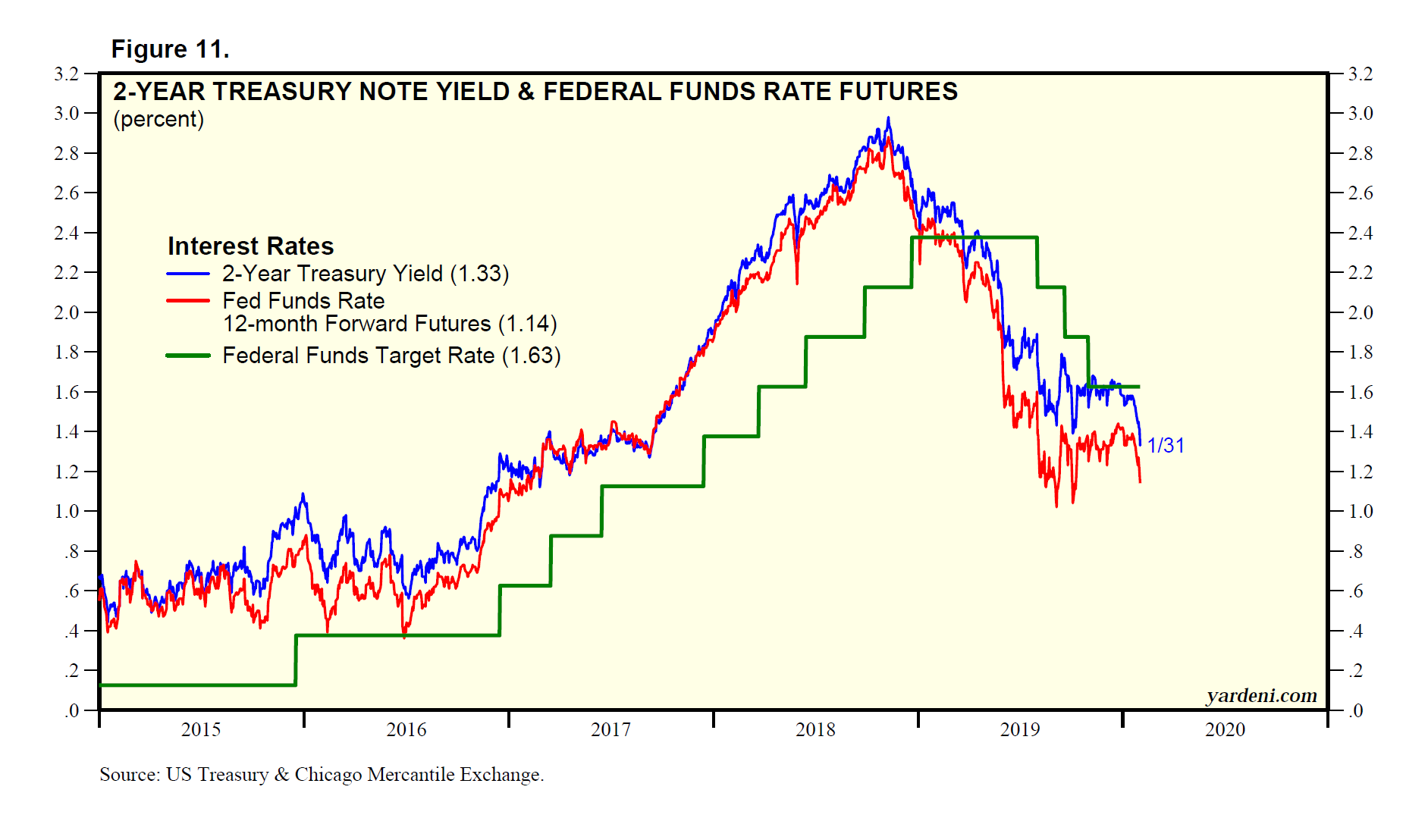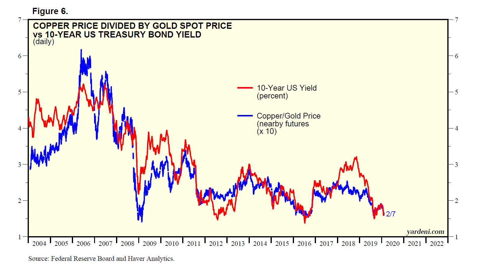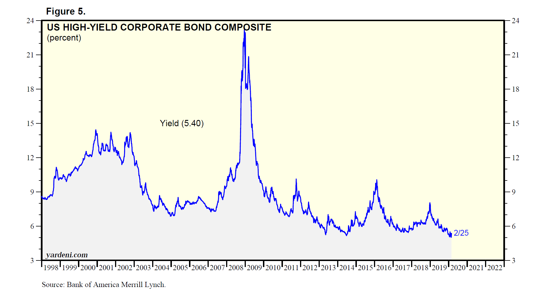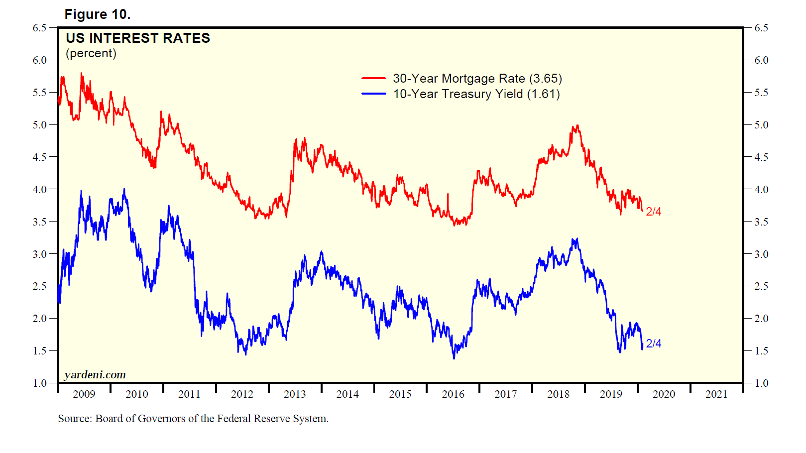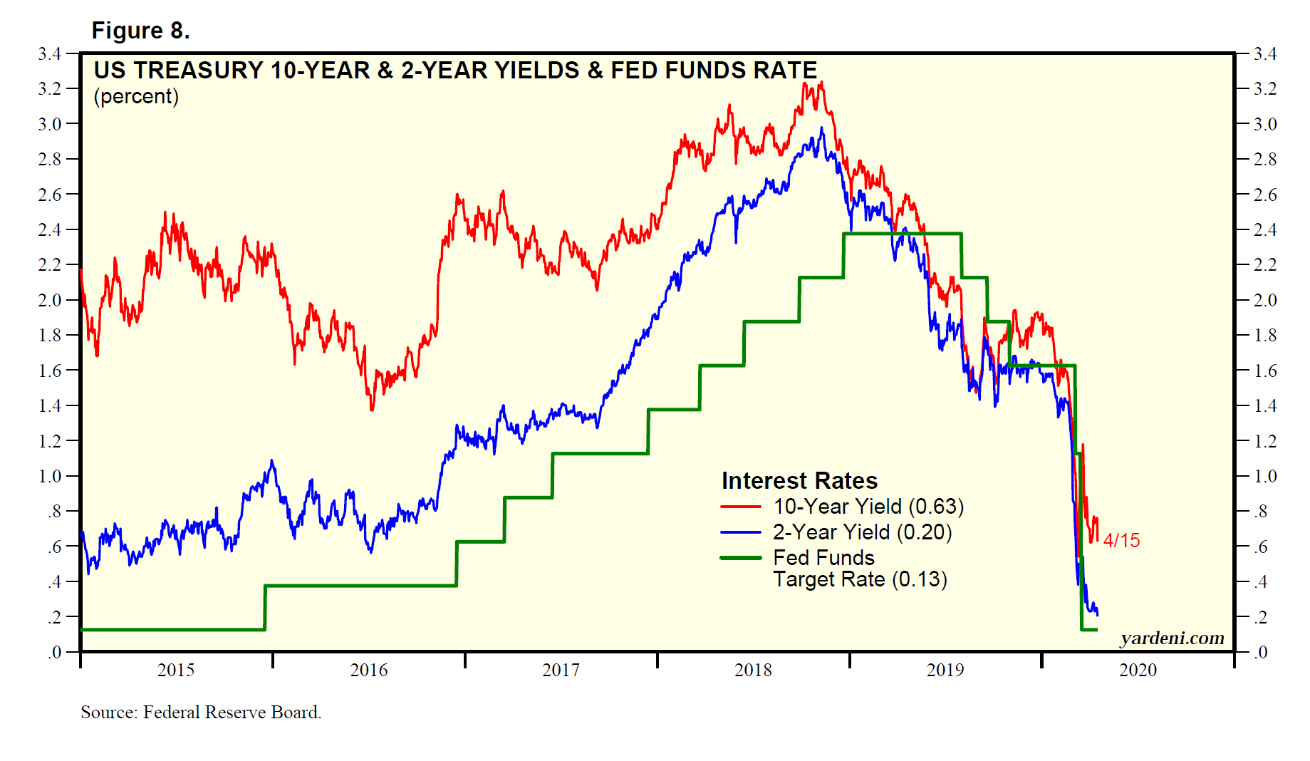 Joe and I have kept a diary of the current bull market’s panic attacks. We count 65 of them. There certainly has been plenty to worry about. Number 65 occurred last year in mid-August when investors feared that the inverted yield curve was signaling an imminent recession (Fig. 5). The second and third rate cuts by the Fed, along with rising bond yields during the fall of last year, put an upward slope on the yield curve and removed its inversion during the summer as a reason to worry. (See US Stock Market Panic Attacks, 2009-2019.)