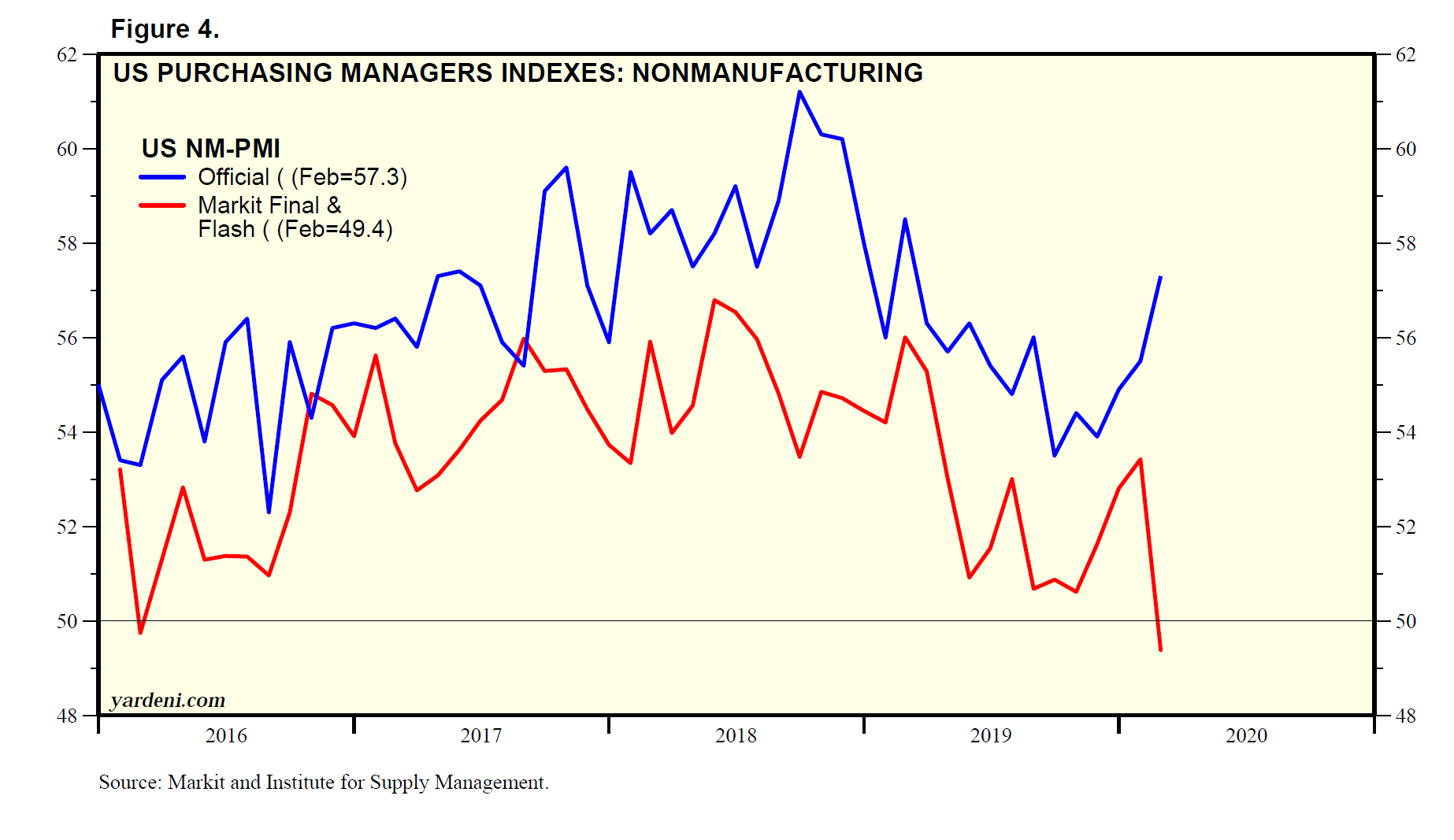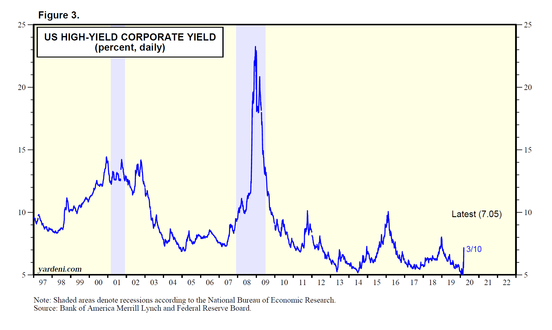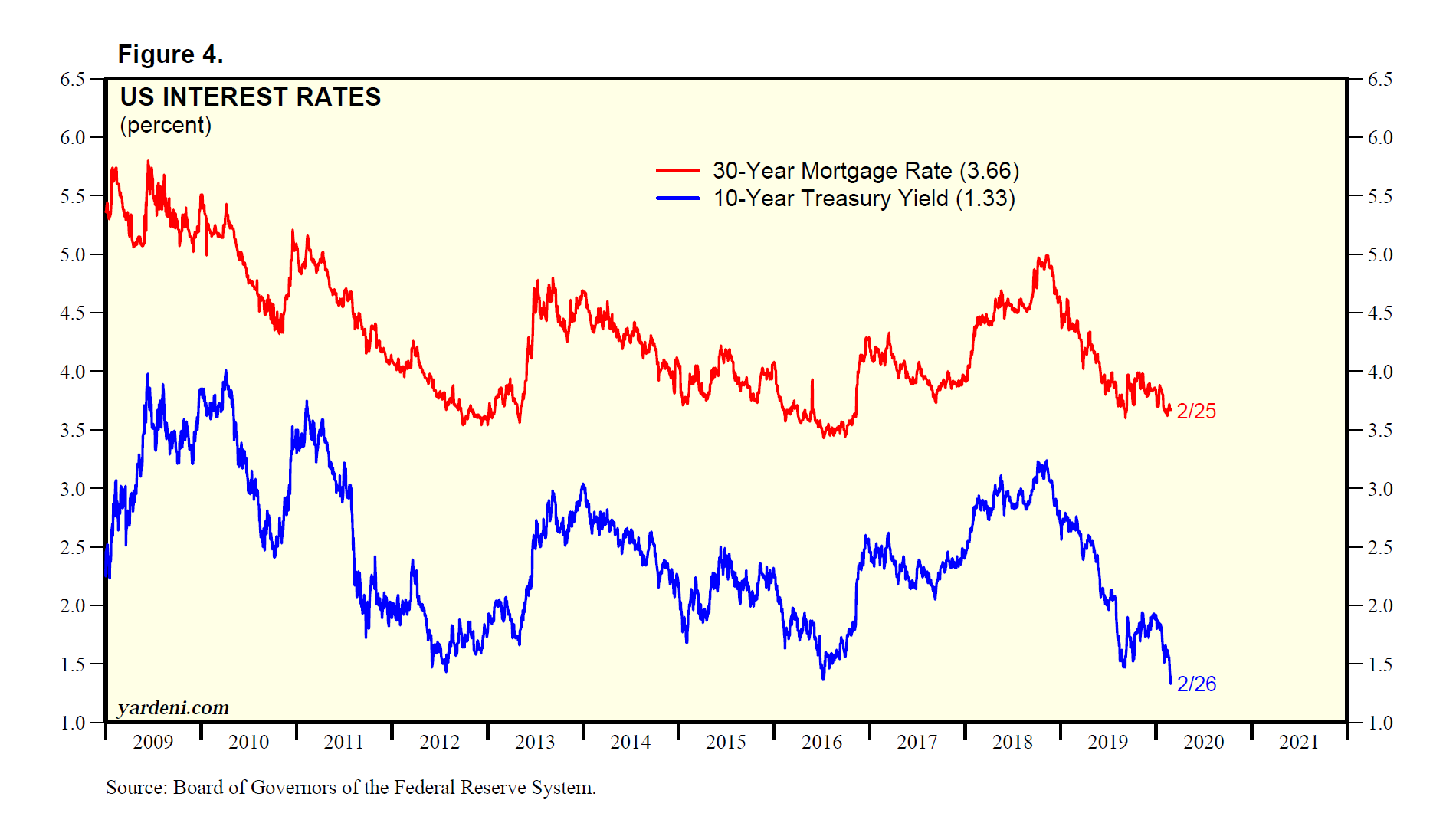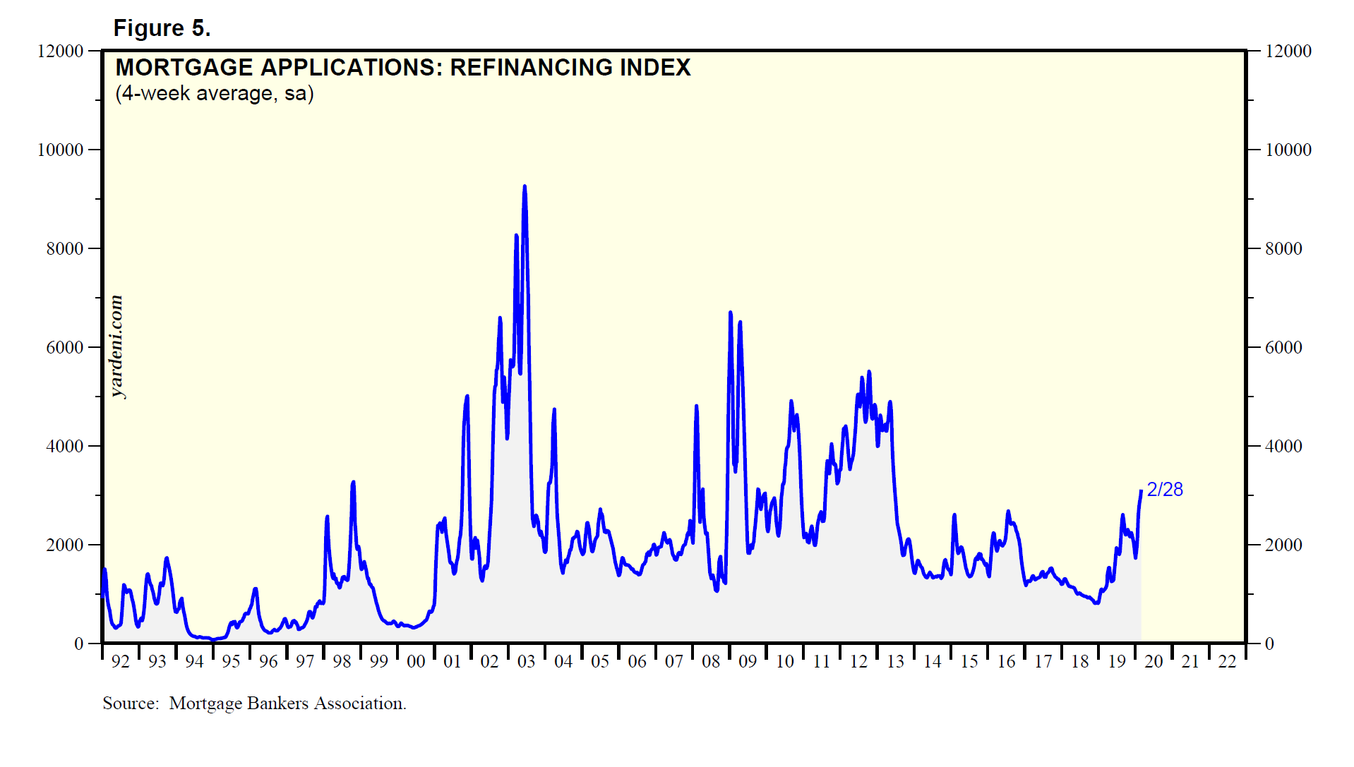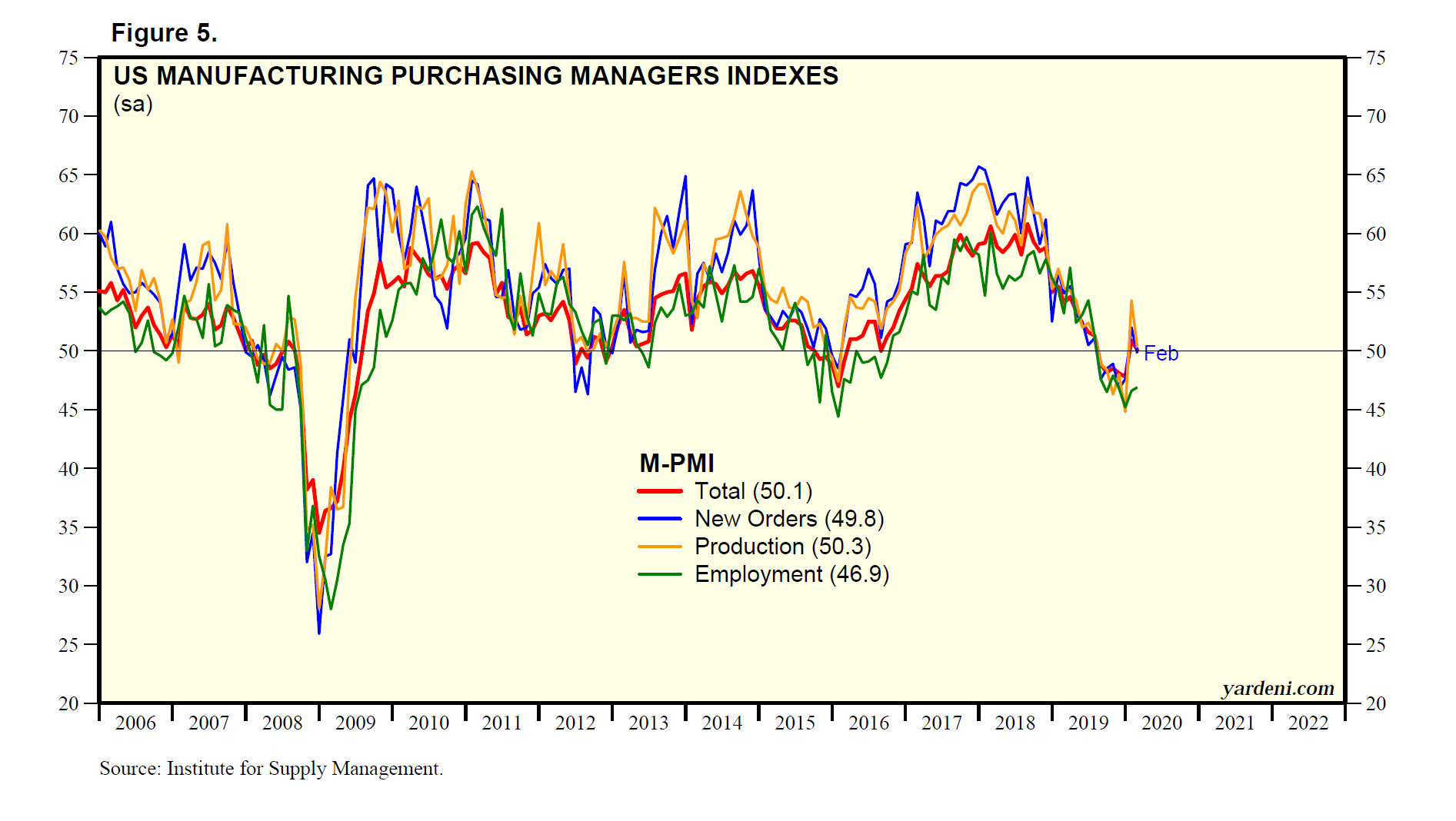 Joe and I have kept a diary of the current bull market’s panic attacks. We count 65 of them. There certainly has been plenty to worry about. Number 65 occurred last year in mid-August when investors feared that the inverted yield curve was signaling an imminent recession (Fig. 5). The second and third rate cuts by the Fed, along with rising bond yields during the fall of last year, put an upward slope on the yield curve and removed its inversion during the summer as a reason to worry. (See US Stock Market Panic Attacks, 2009-2019.)