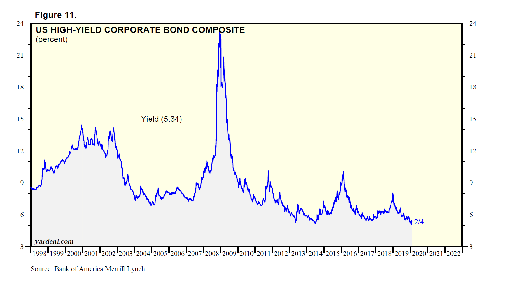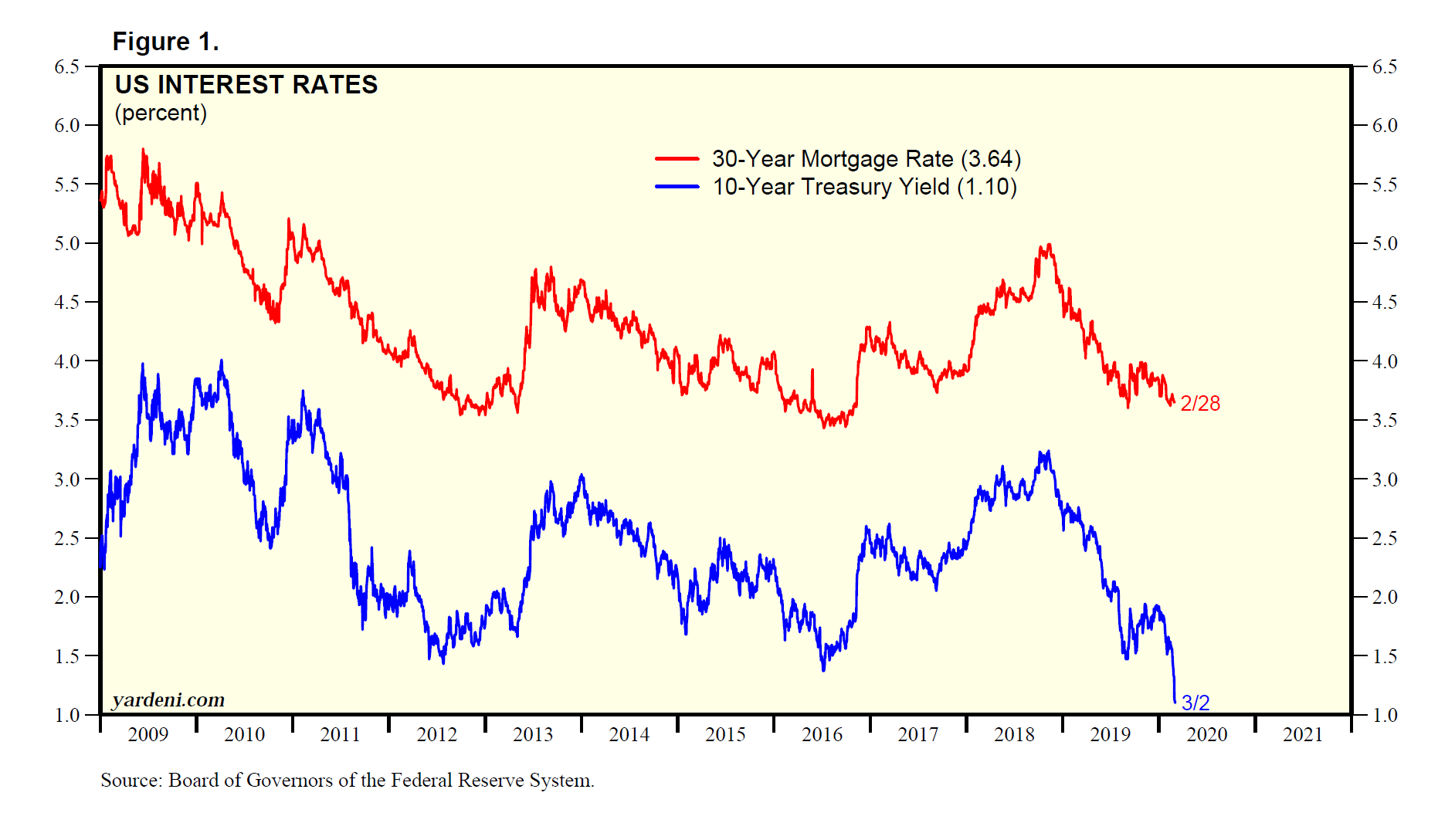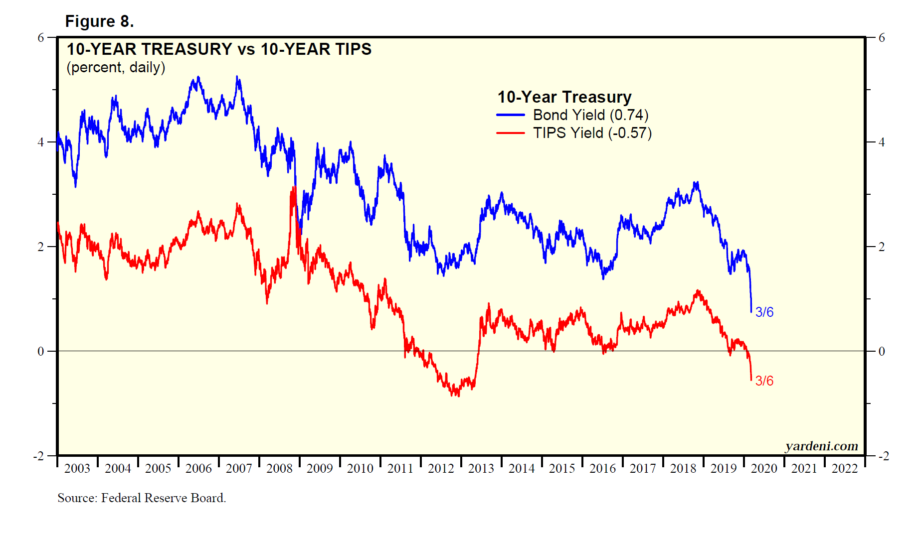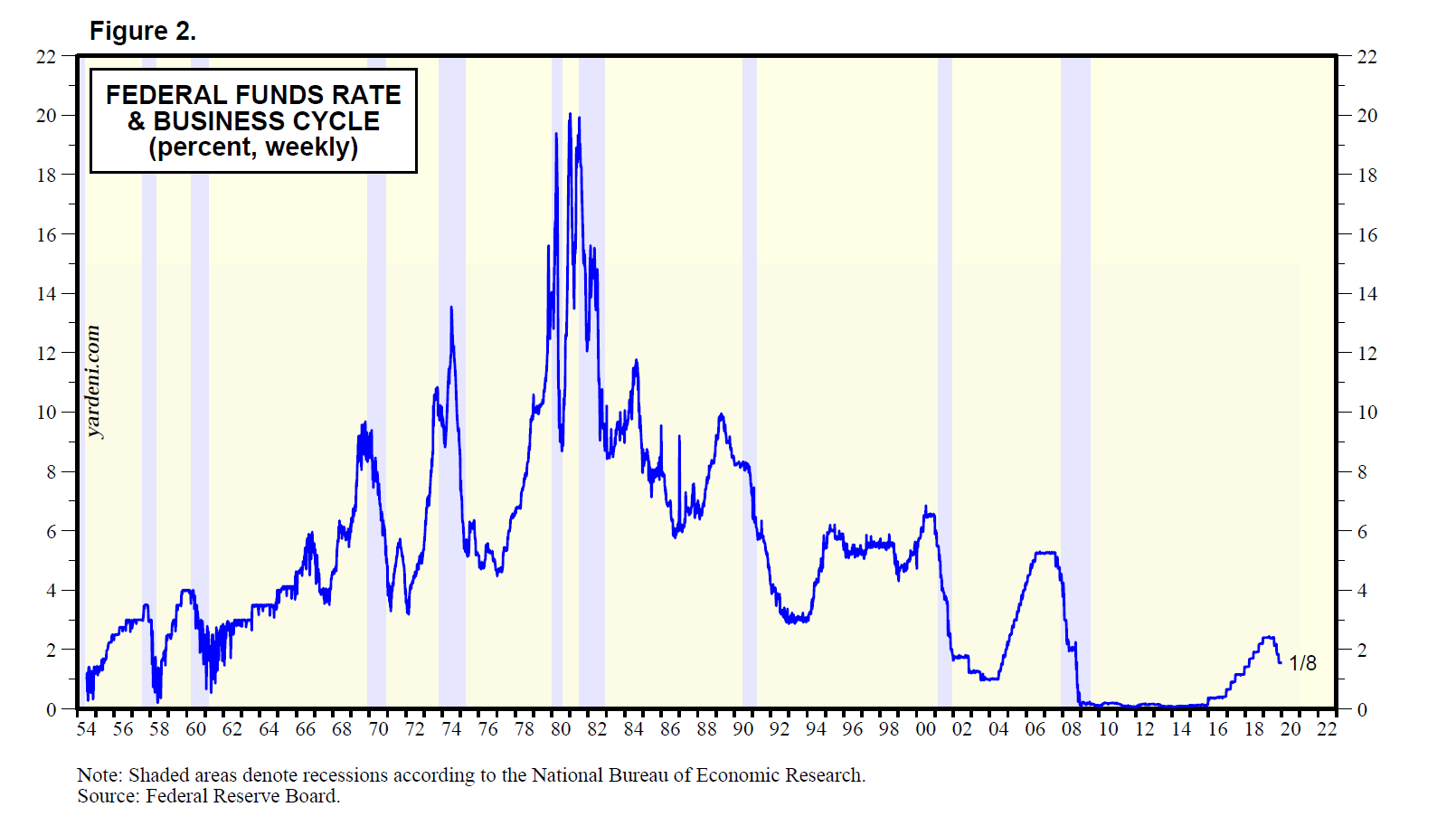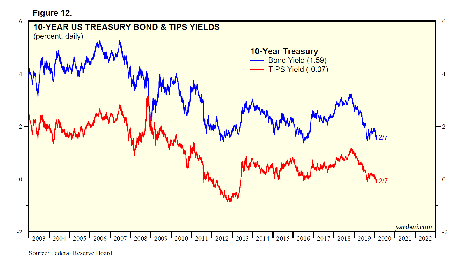 Joe and I have kept a diary of the current bull market’s panic attacks. We count 65 of them. There certainly has been plenty to worry about. Number 65 occurred last year in mid-August when investors feared that the inverted yield curve was signaling an imminent recession (Fig. 5). The second and third rate cuts by the Fed, along with rising bond yields during the fall of last year, put an upward slope on the yield curve and removed its inversion during the summer as a reason to worry. (See US Stock Market Panic Attacks, 2009-2019.)