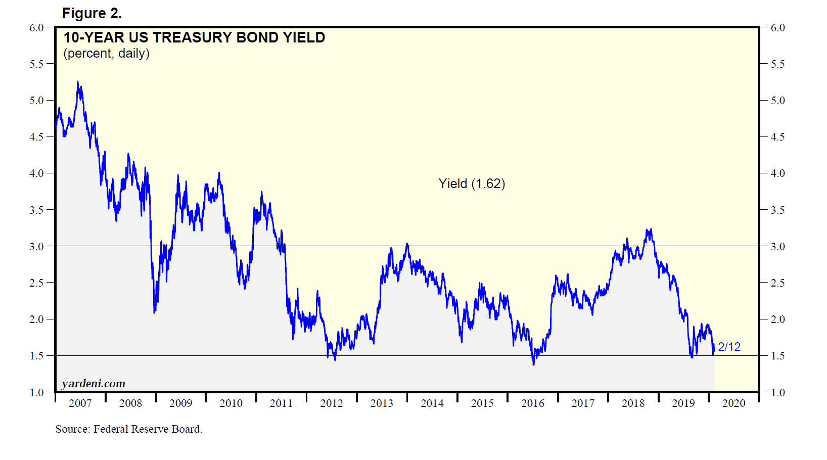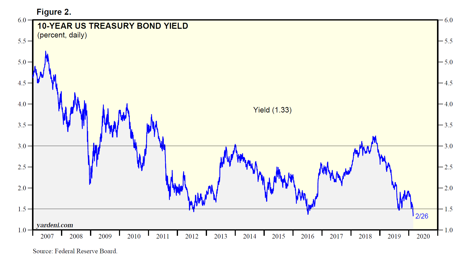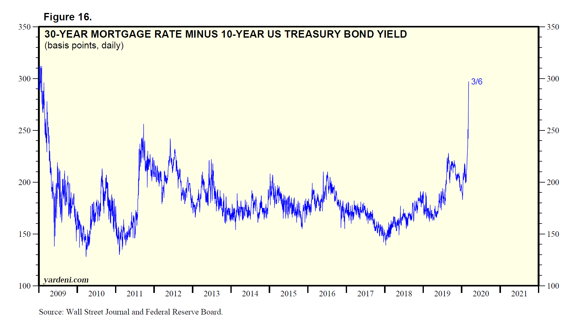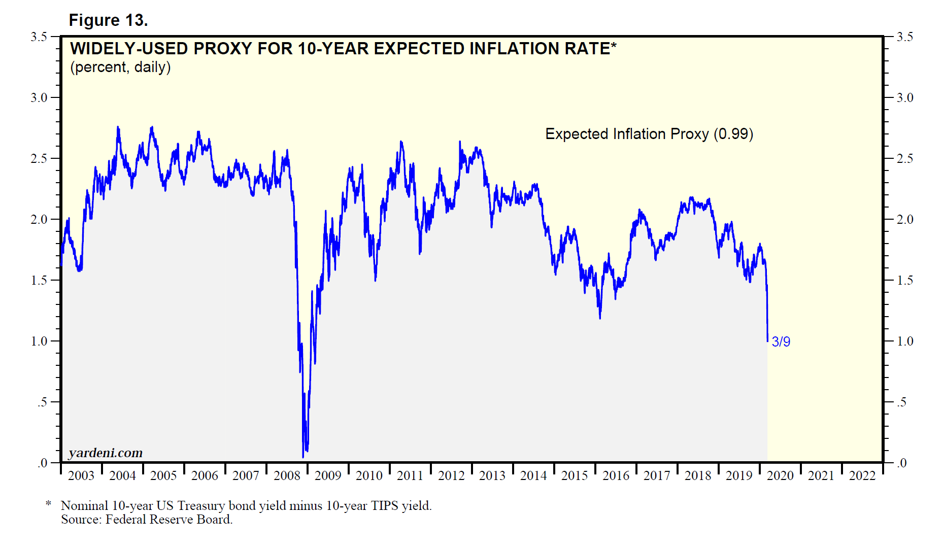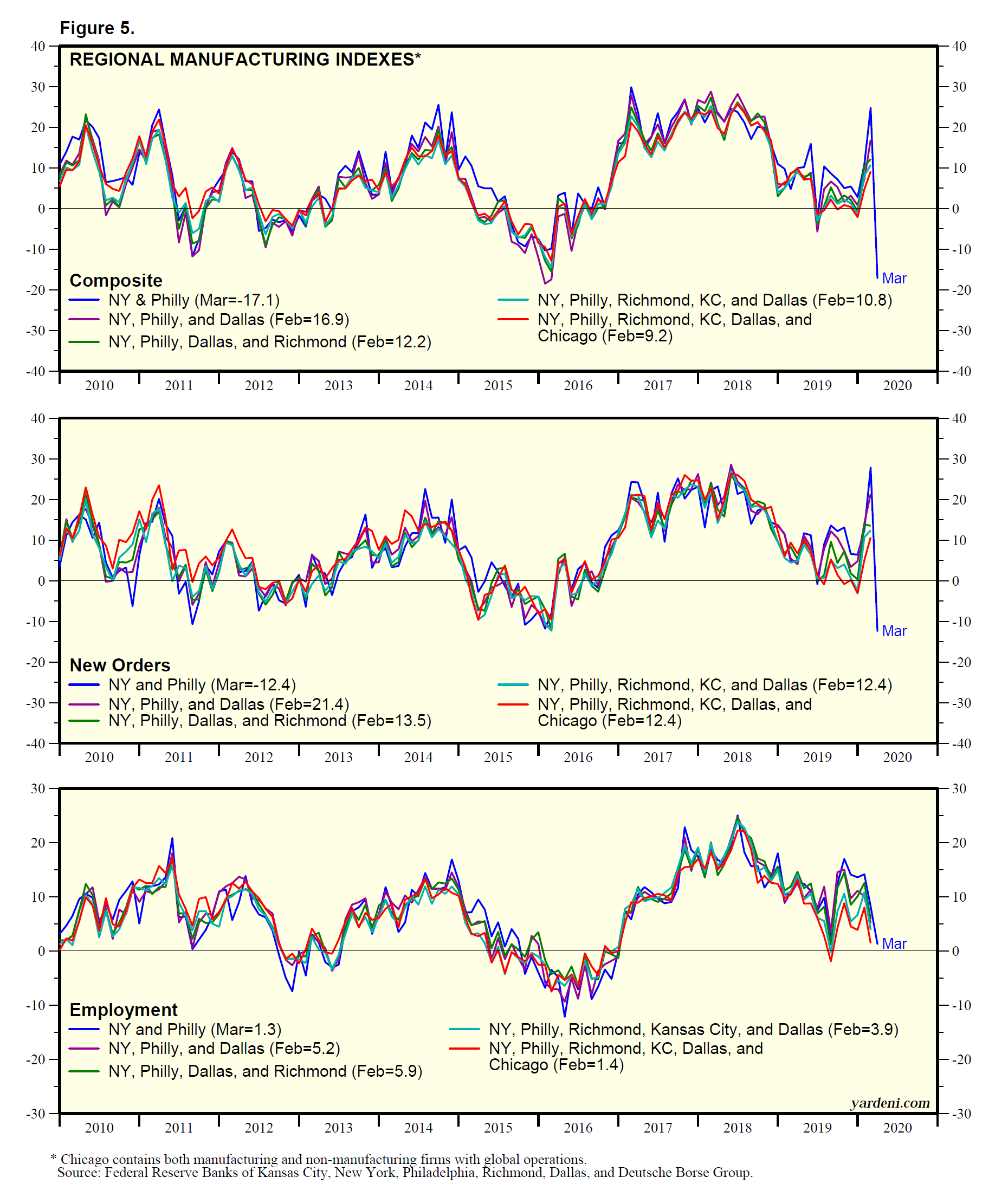 Joe and I have kept a diary of the current bull market’s panic attacks. We count 65 of them. There certainly has been plenty to worry about. Number 65 occurred last year in mid-August when investors feared that the inverted yield curve was signaling an imminent recession (Fig. 5). The second and third rate cuts by the Fed, along with rising bond yields during the fall of last year, put an upward slope on the yield curve and removed its inversion during the summer as a reason to worry. (See US Stock Market Panic Attacks, 2009-2019.)