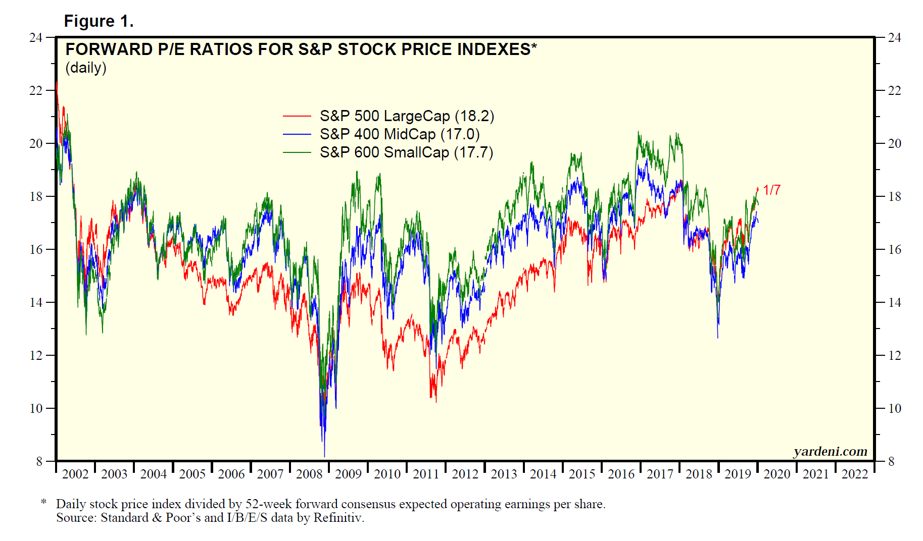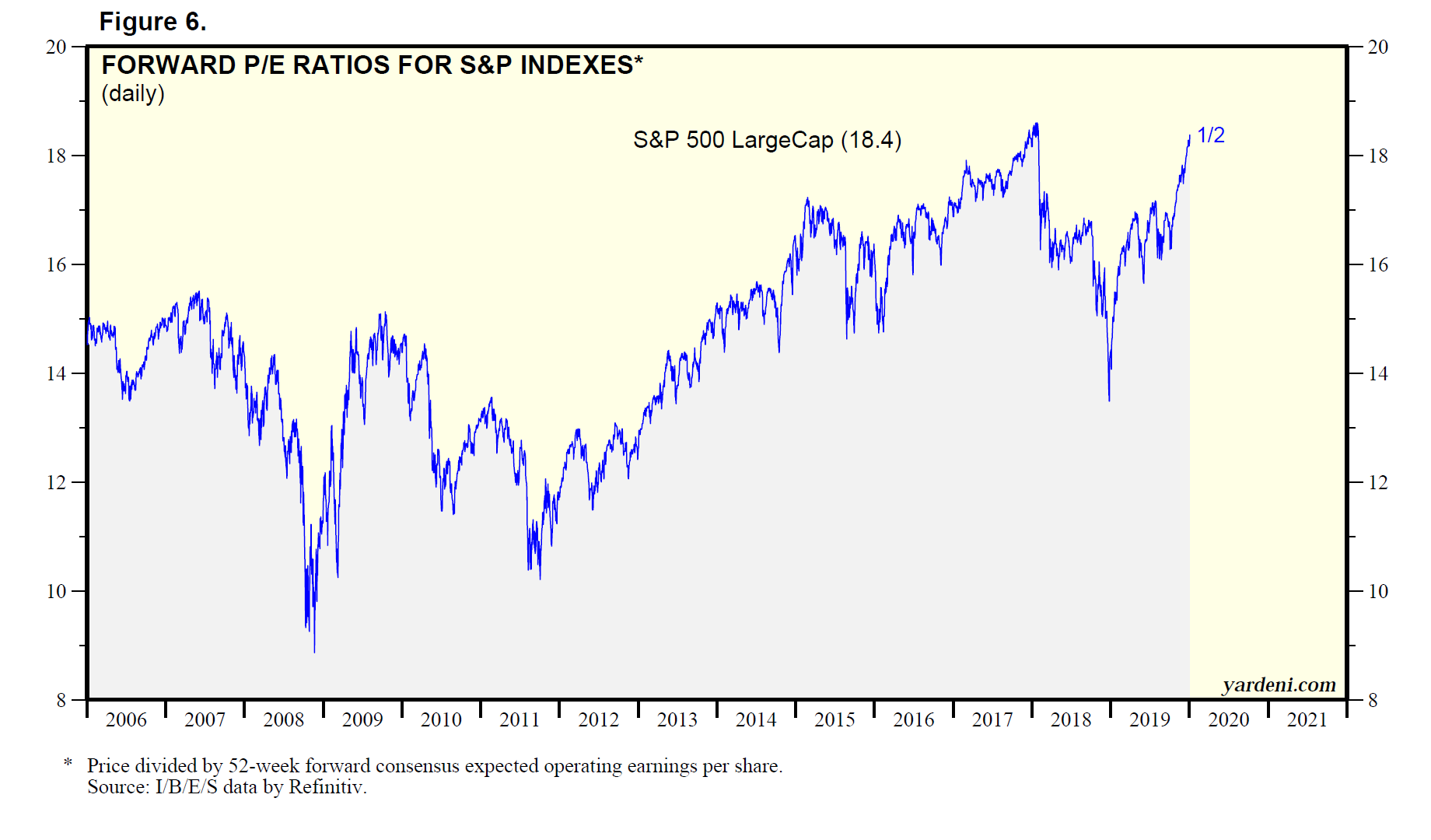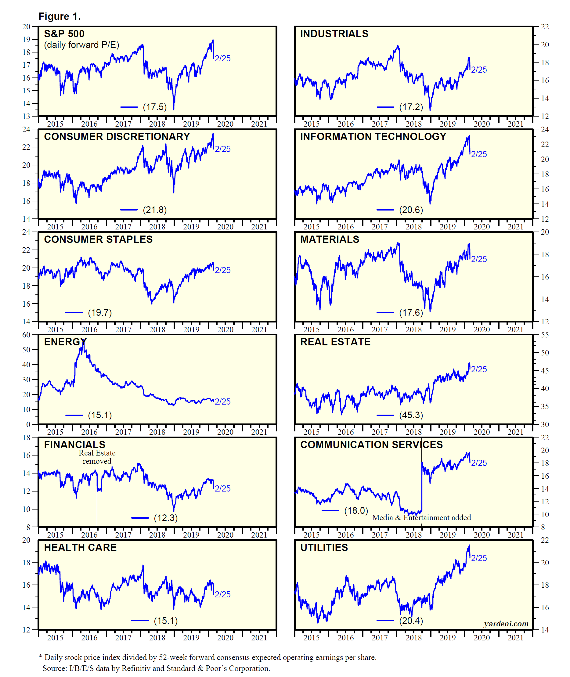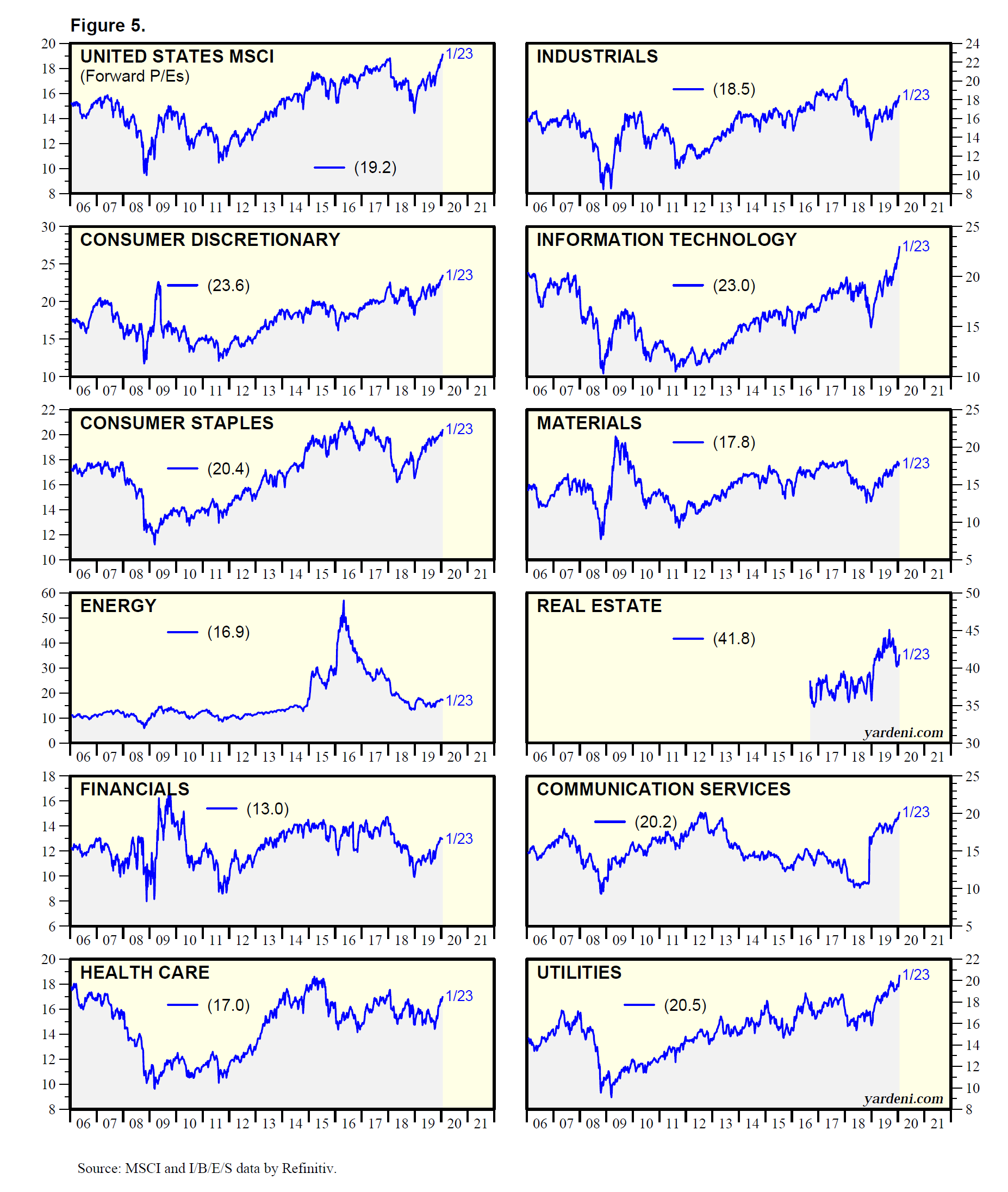 Strategy: Taking Stock of P/Es. In an act of amazing resilience, the S&P 500 remains near record highs even in the wake of skirmishes between the US and Iran. The index’s 28.9% climb last year has left its forward P/E at a lofty 18.2, almost four points higher than it was last year at this time (Fig. 1). Let’s take a look at the S&P 500 sectors’ earnings growth and P/Es to see what looks cheap and expensive as 2020 begins: