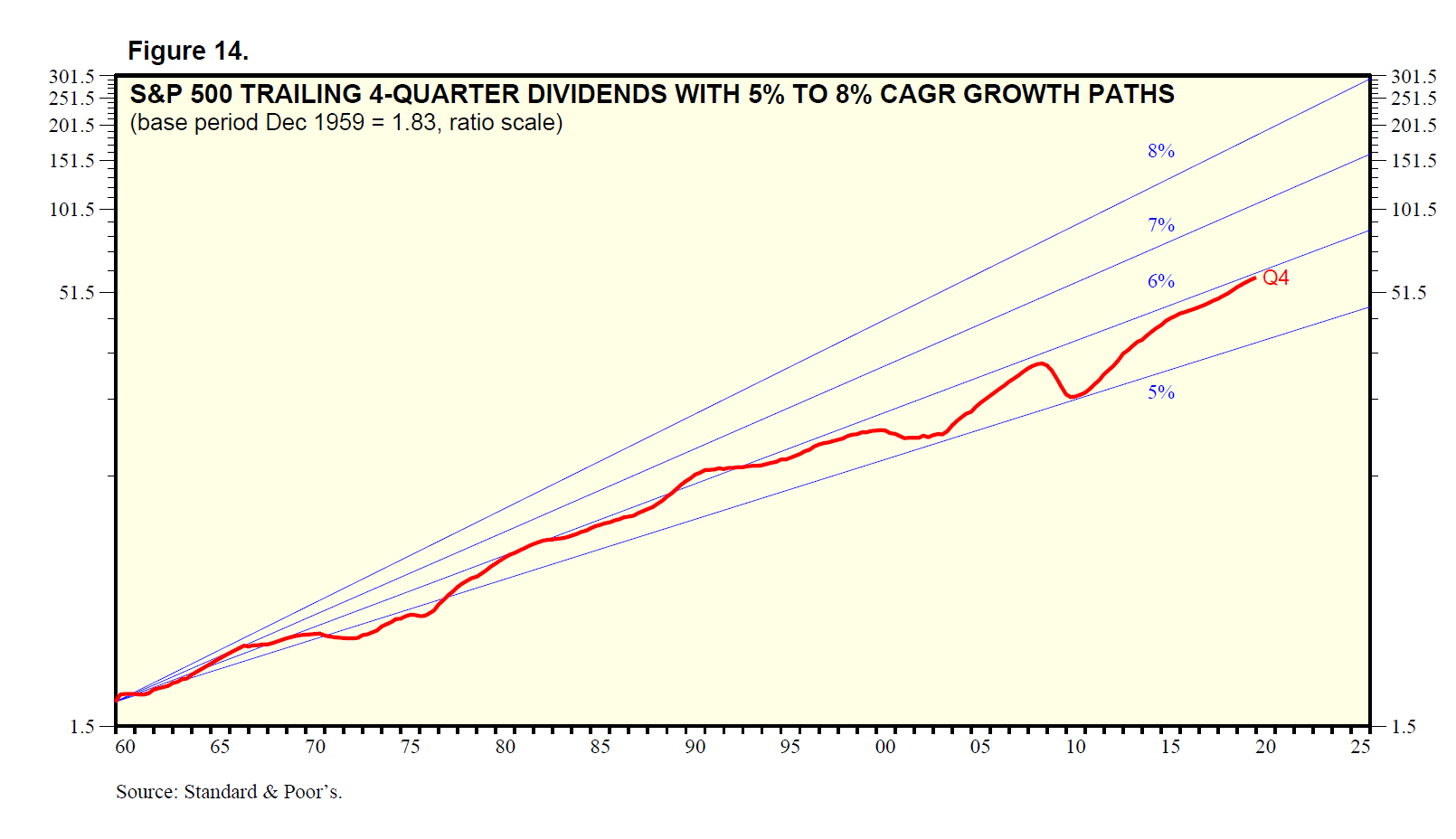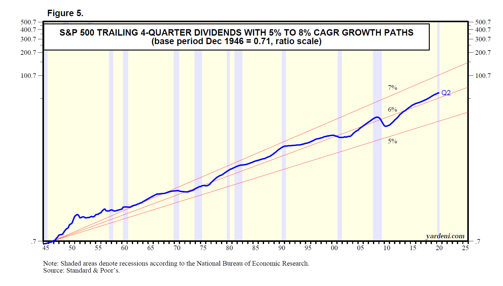 (1) The trend is your friend. I asked Joe to track the trend in S&P 500 dividends. He reports that since the end of 1946, trailing-four-quarter dividends have been mostly growing around a 6% compound annual growth rate (CAGR) (Fig. 13). Since the end of 1959, the CAGR has tended to be between 5.0% and 6.0% (Fig. 14).