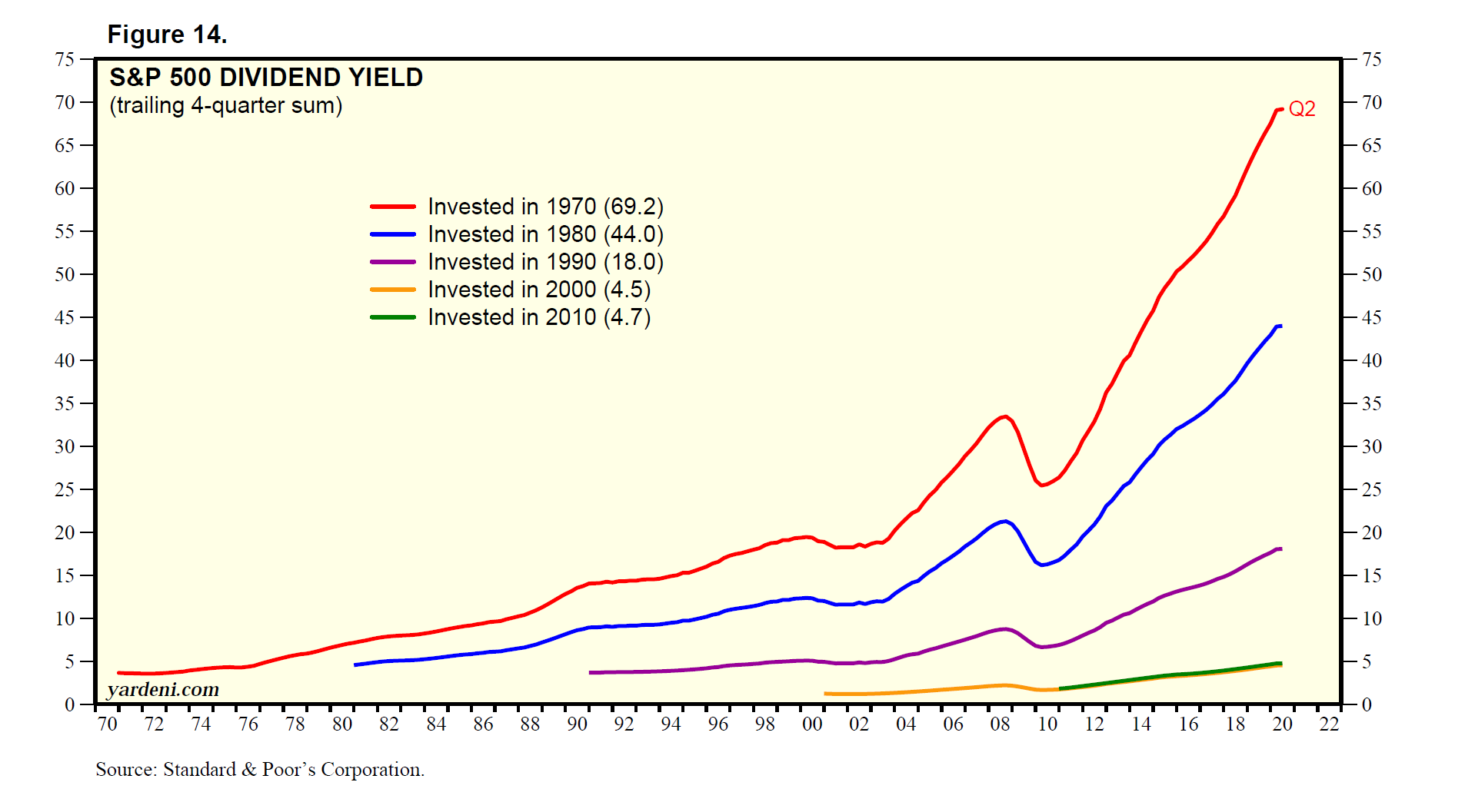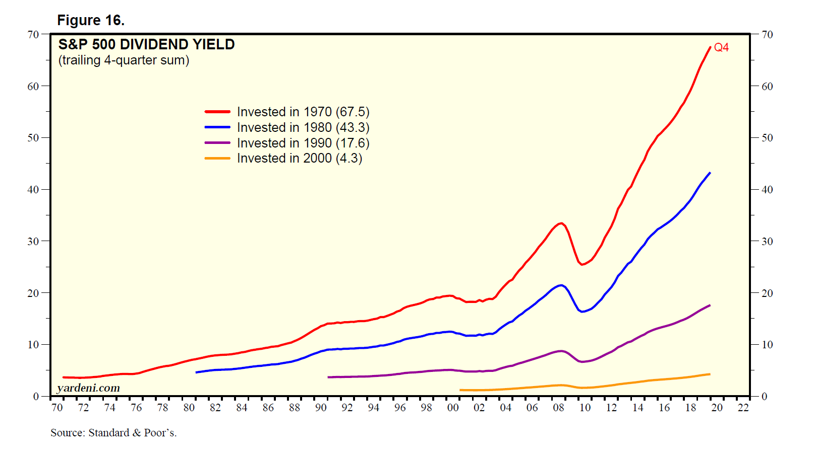 (3) Compounding dividends are among the great wonders of the world. Albert Einstein reportedly said, “Compound interest is the eighth wonder of the world.” Actually, even more wonderful are dividends because, unlike the coupon on bonds, they grow. Joe calculates that the current dividend yields of an S&P 500 portfolio purchased in 1970, 1980, 1990, and 2000 are 66%, 43%, 17%, and 4% (Fig. 16).