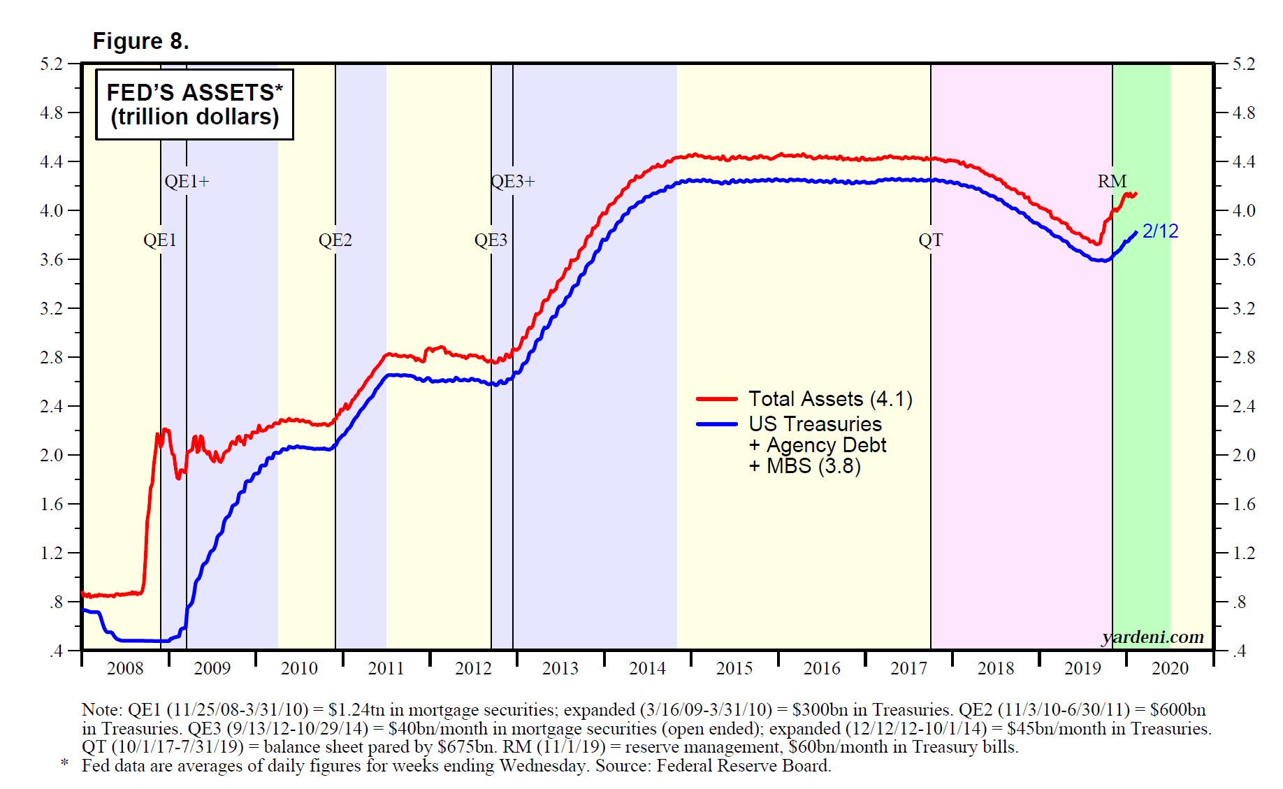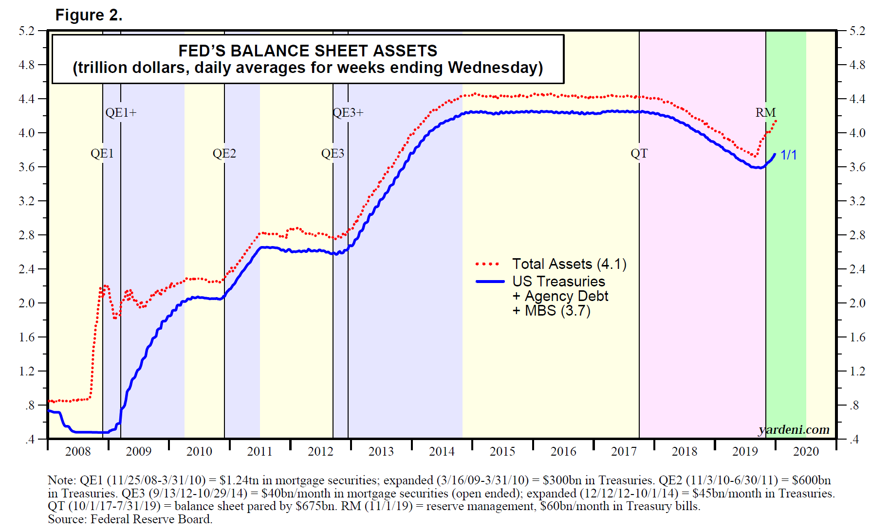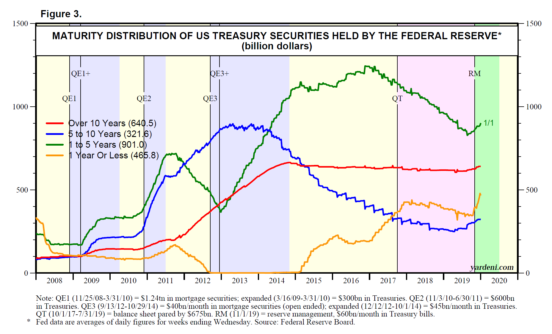 (1) Fed. In response to the crunch in the repo market last September, the Fed started to expand its balance sheet again by purchasing $60 billion per month in US Treasury bills. Since this so-called “reserve management operation” started on 11/1/19 and went through the new year’s 1/1 week, the Fed’s balance sheet has increased by $155 billion to $4.14 trillion, the highest level since mid-October 2018 (Fig. 2). That increase included a $74 billion jump in the Fed’s holdings of Treasuries with maturities of one year or less (Fig. 3). On the other hand, the Fed is continuing to pare its holdings of mortgage-backed securities (Fig. 4).