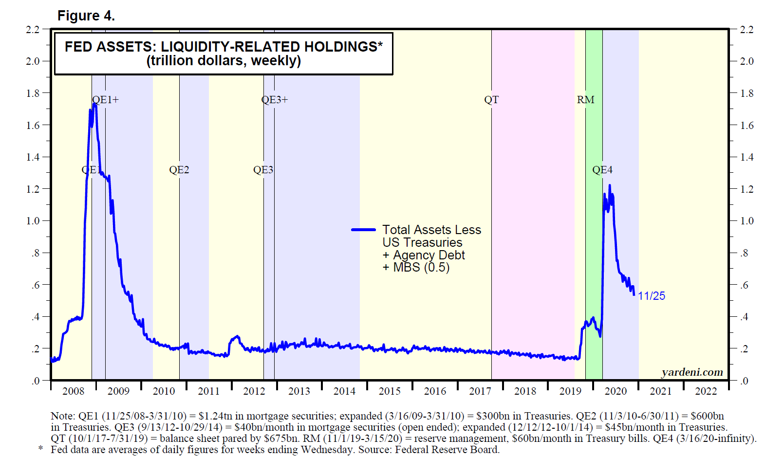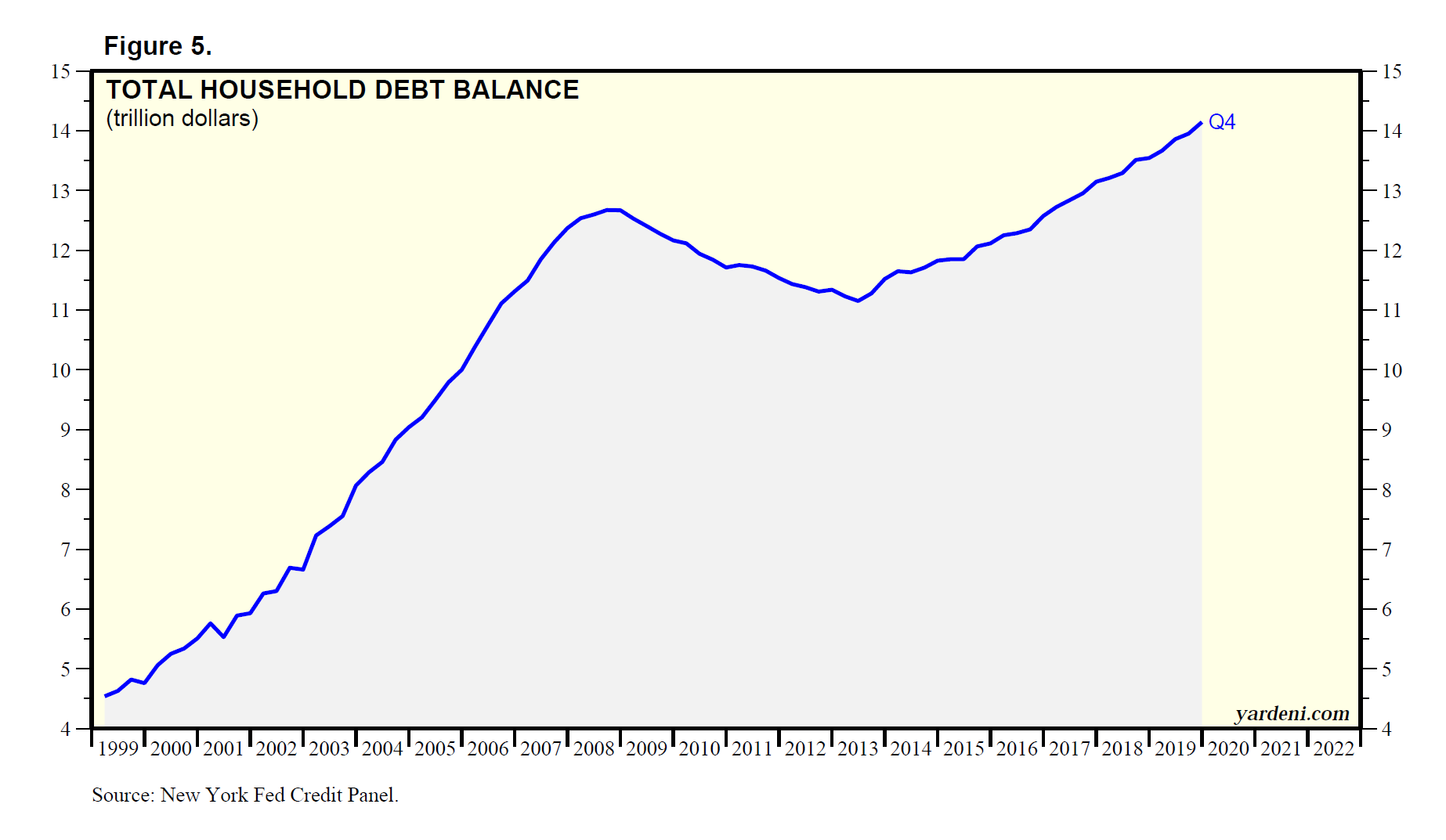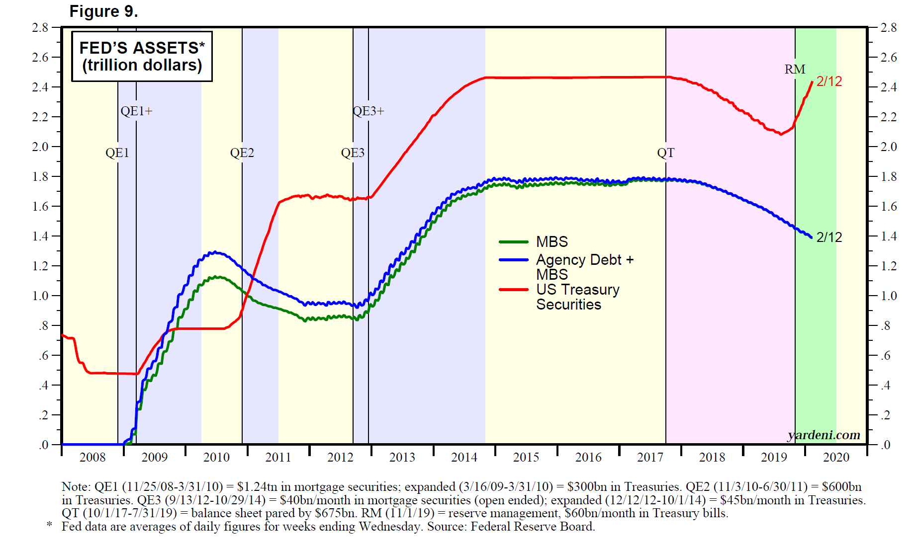 (1) Fed. In response to the crunch in the repo market last September, the Fed started to expand its balance sheet again by purchasing $60 billion per month in US Treasury bills. Since this so-called “reserve management operation” started on 11/1/19 and went through the new year’s 1/1 week, the Fed’s balance sheet has increased by $155 billion to $4.14 trillion, the highest level since mid-October 2018 (Fig. 2). That increase included a $74 billion jump in the Fed’s holdings of Treasuries with maturities of one year or less (Fig. 3). On the other hand, the Fed is continuing to pare its holdings of mortgage-backed securities (Fig. 4).