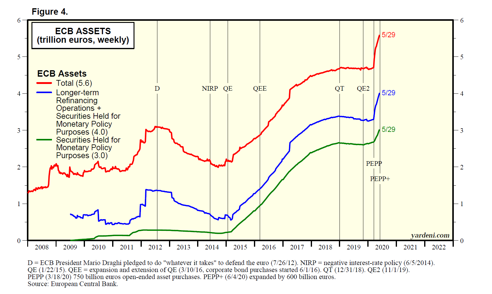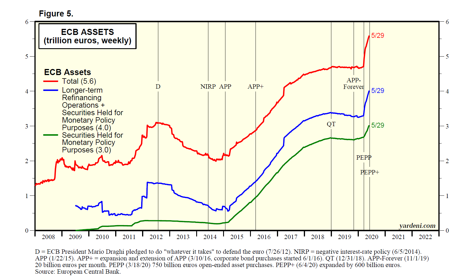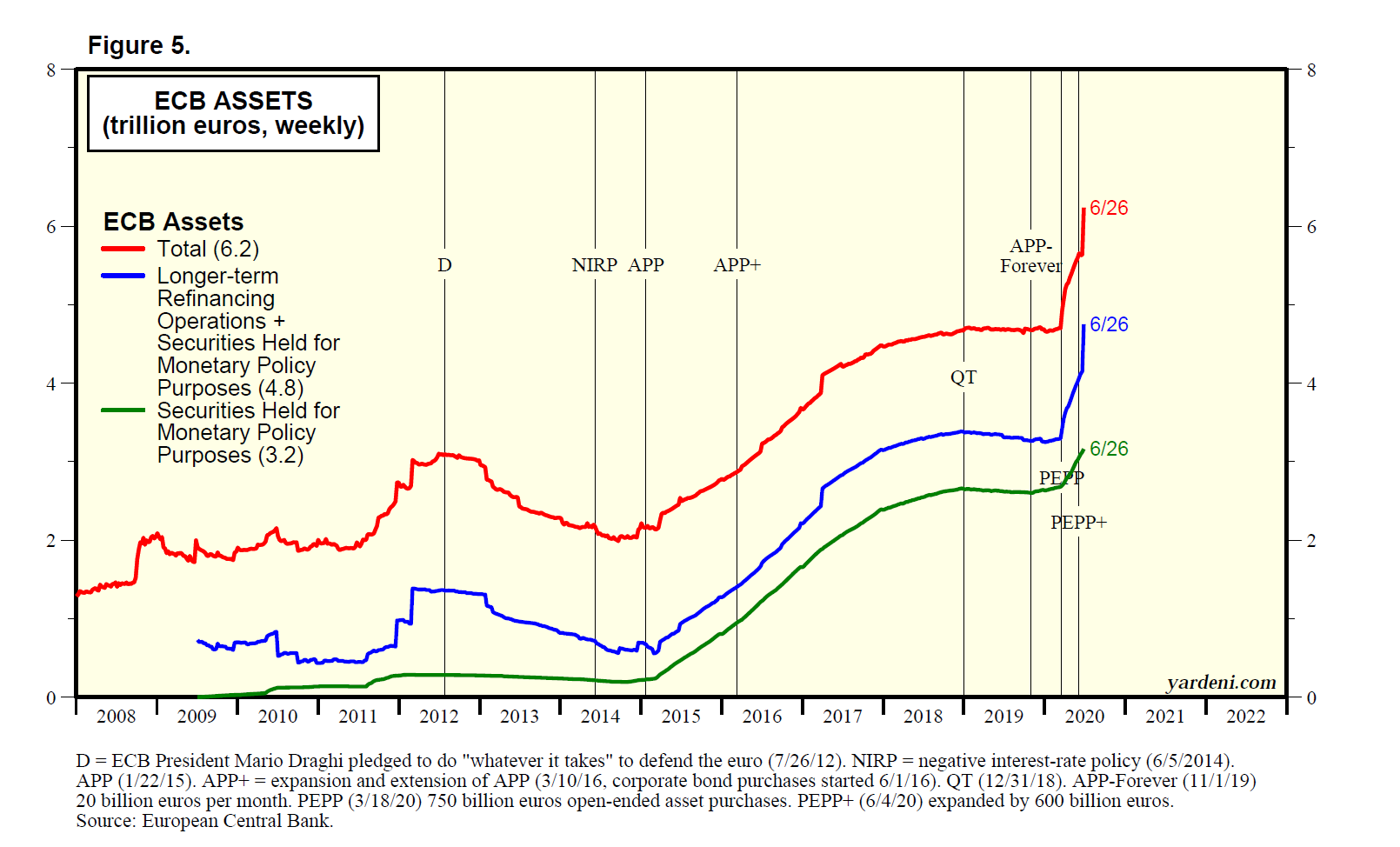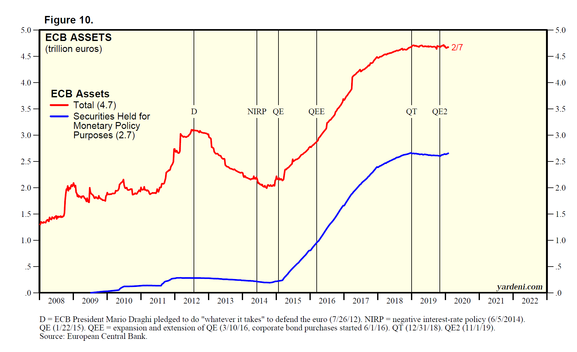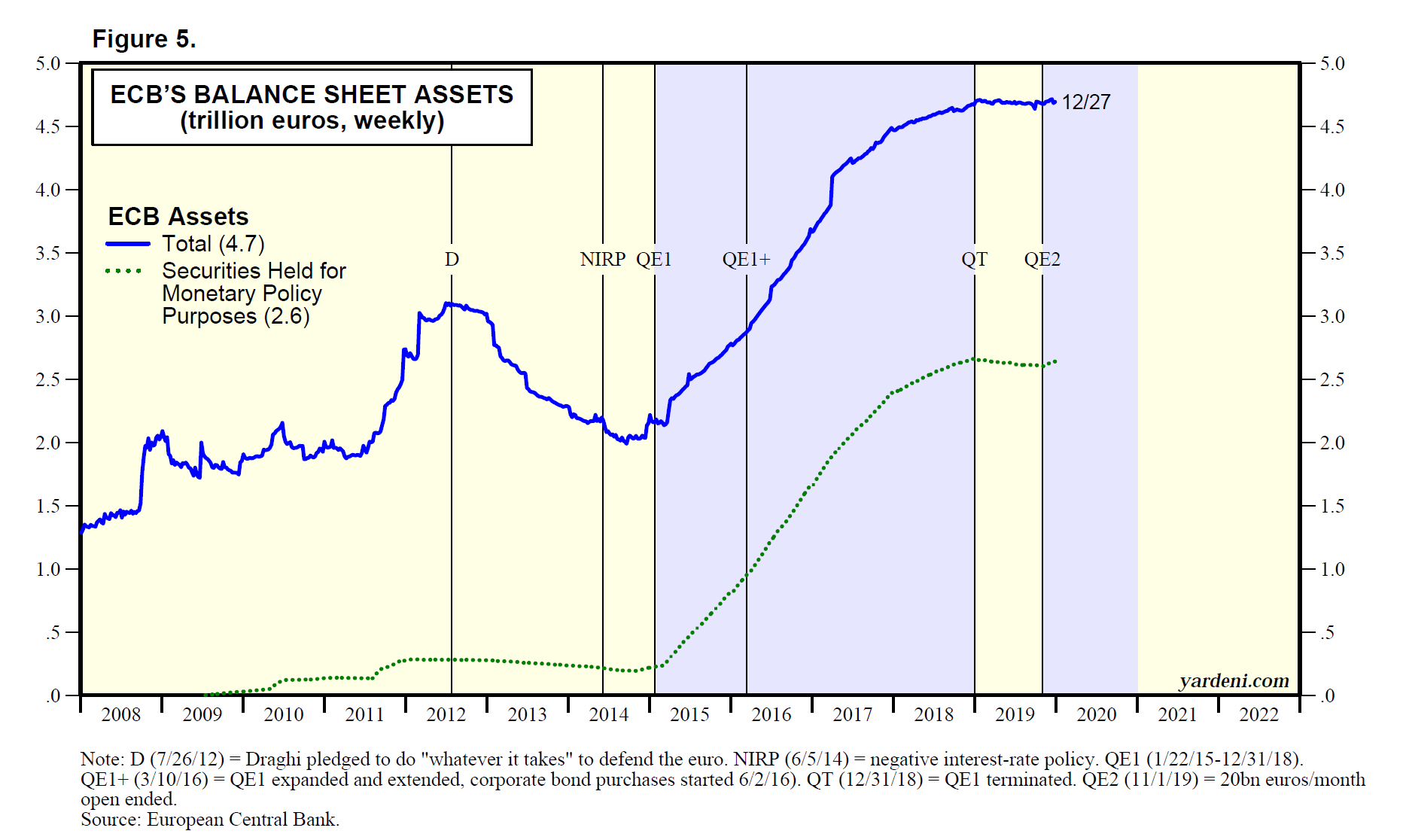 (2) ECB. The ECB started its first asset purchase program (QE1) on 1/22/15 and terminated it at the end of 2018. Securities held for monetary policy purposes increased by a whopping €2.5 trillion under the program (Fig. 5). A second round of purchases (QE2) was started at the end of last year (11/1/19) to the tune of €20 billion euros per month.