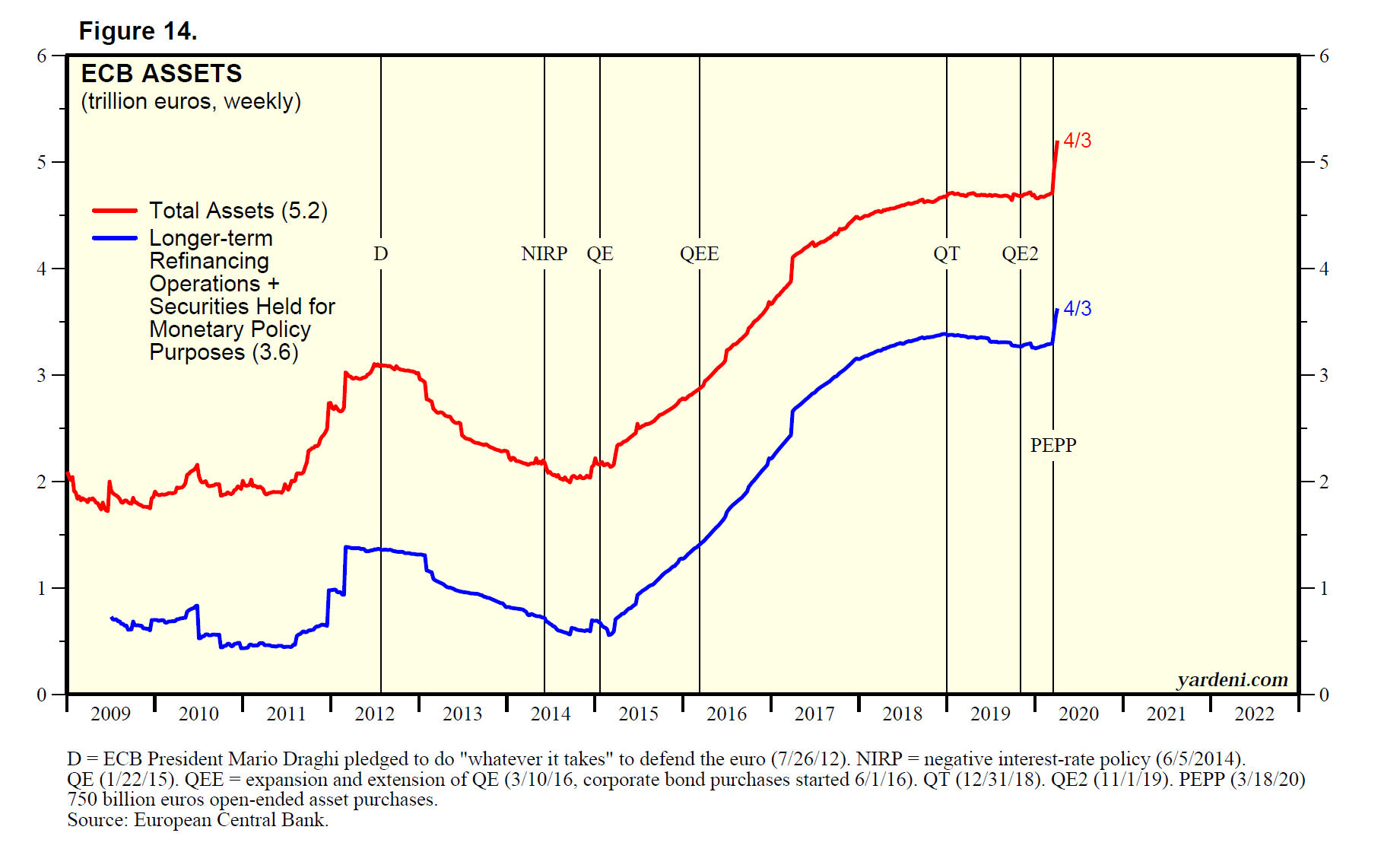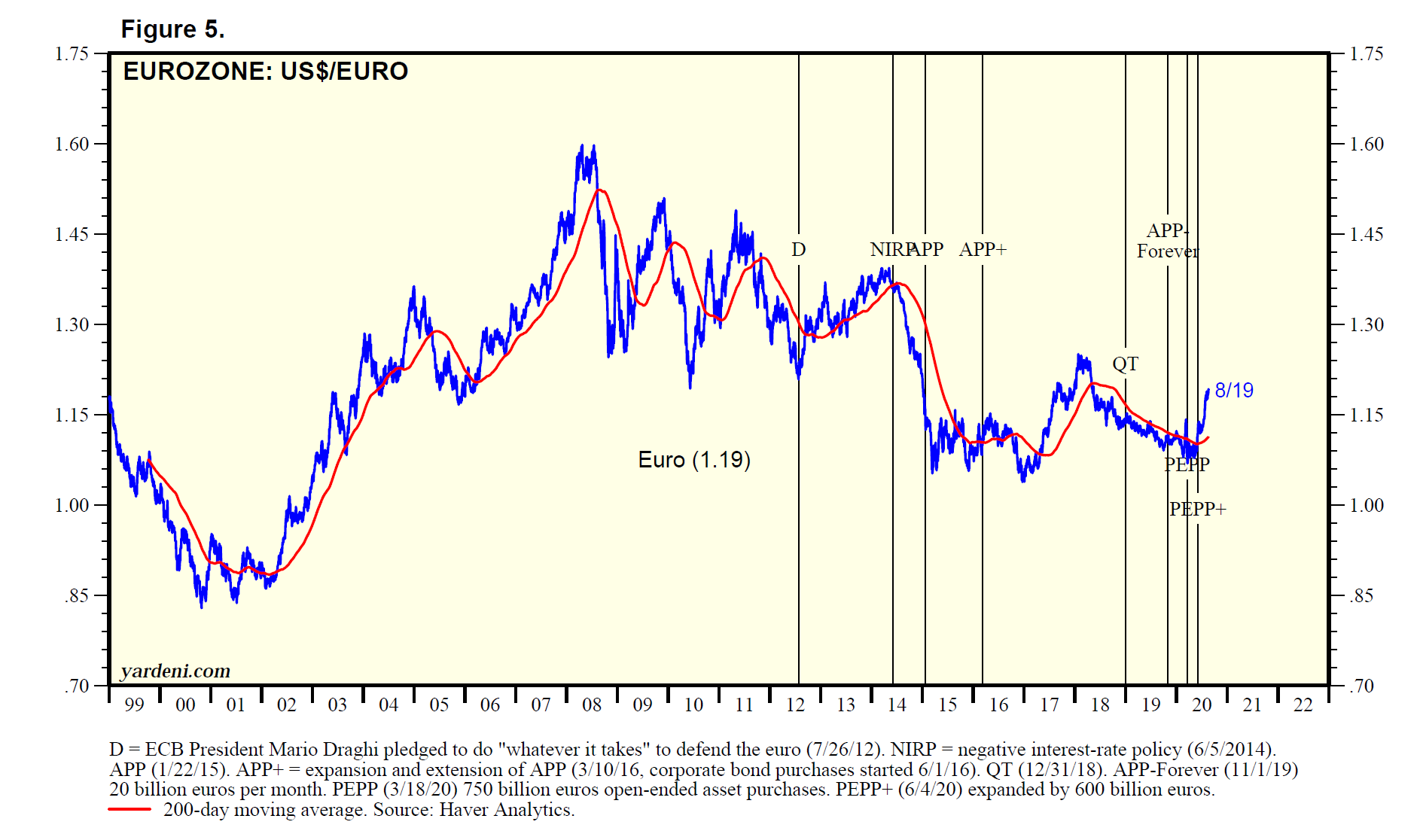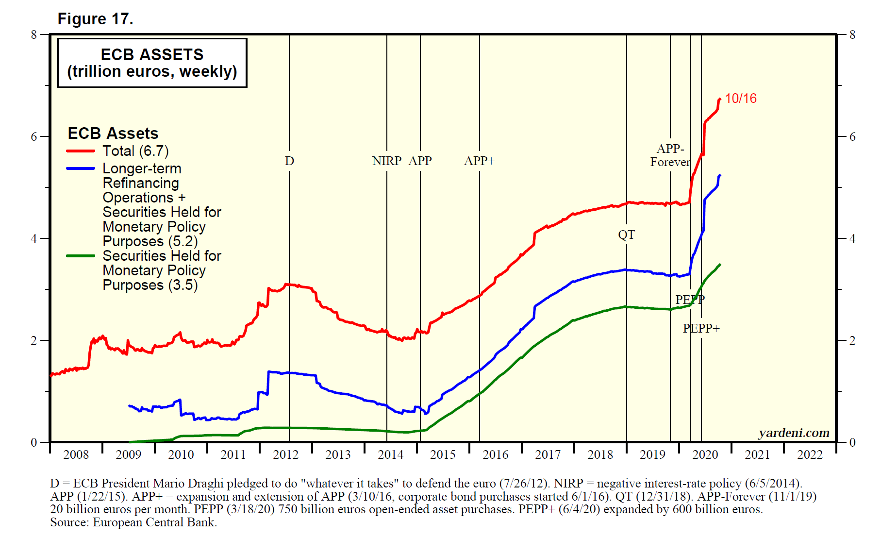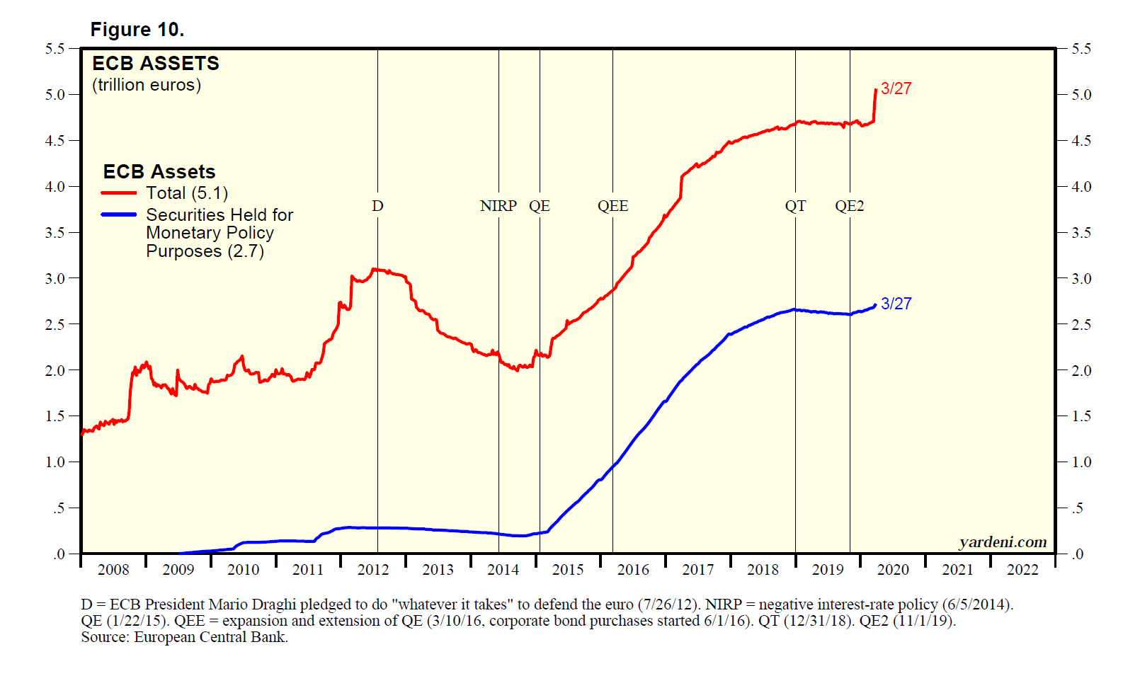 (2) ECB. The ECB started its first asset purchase program (QE1) on 1/22/15 and terminated it at the end of 2018. Securities held for monetary policy purposes increased by a whopping €2.5 trillion under the program (Fig. 5). A second round of purchases (QE2) was started at the end of last year (11/1/19) to the tune of €20 billion euros per month.