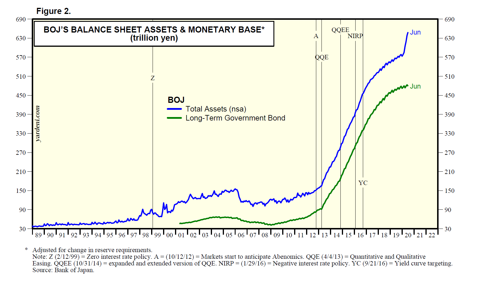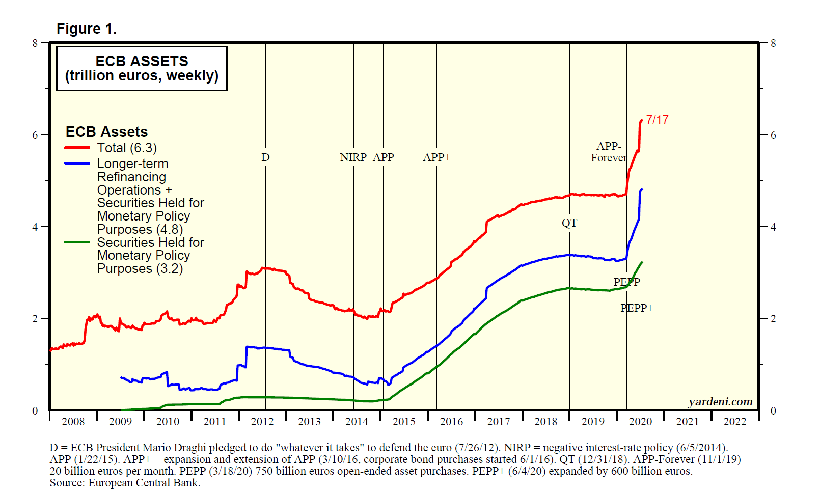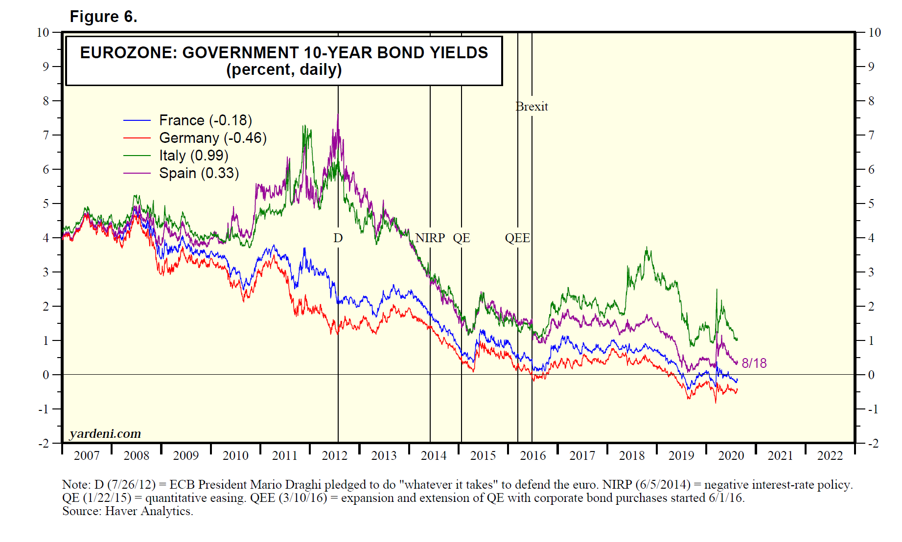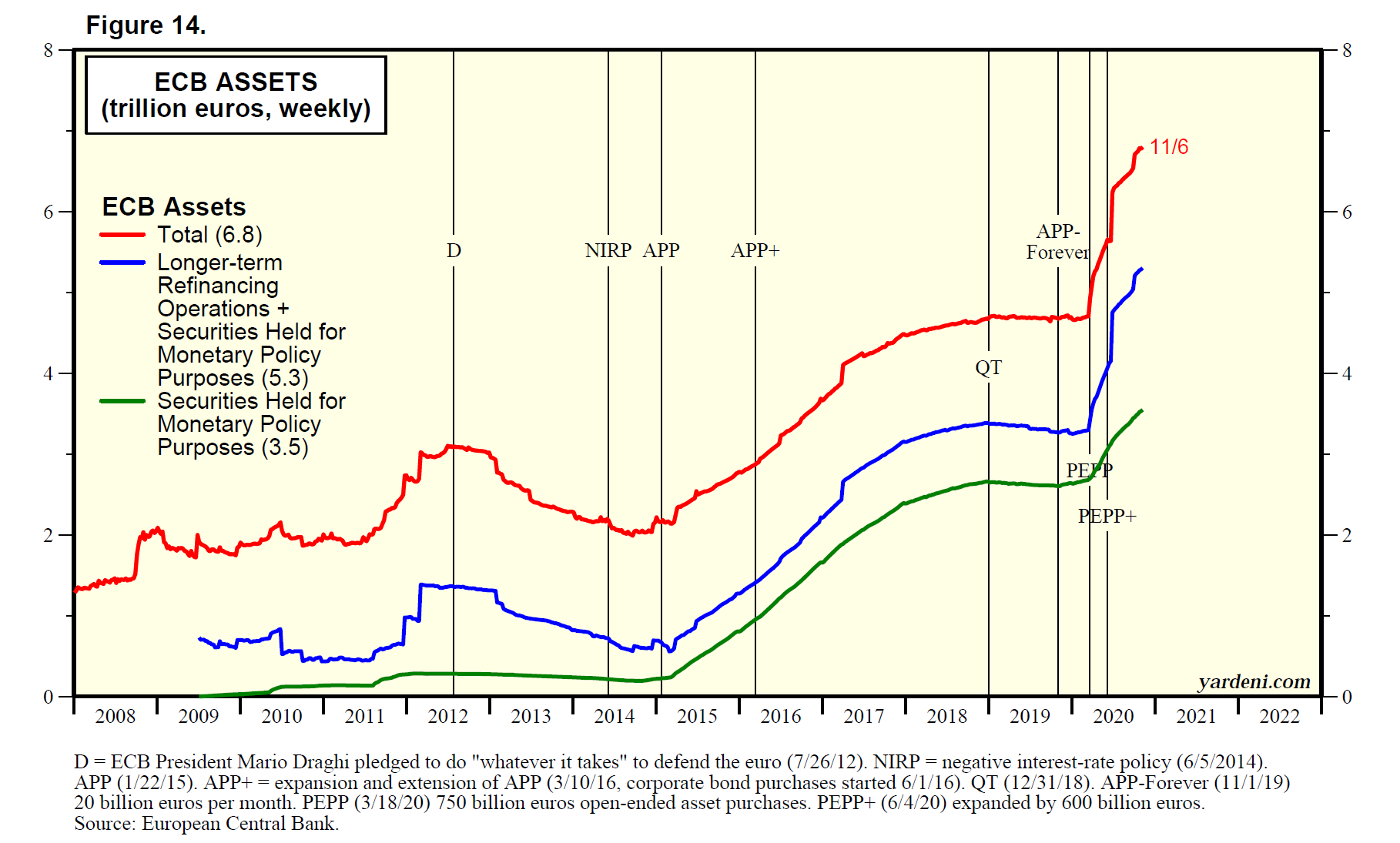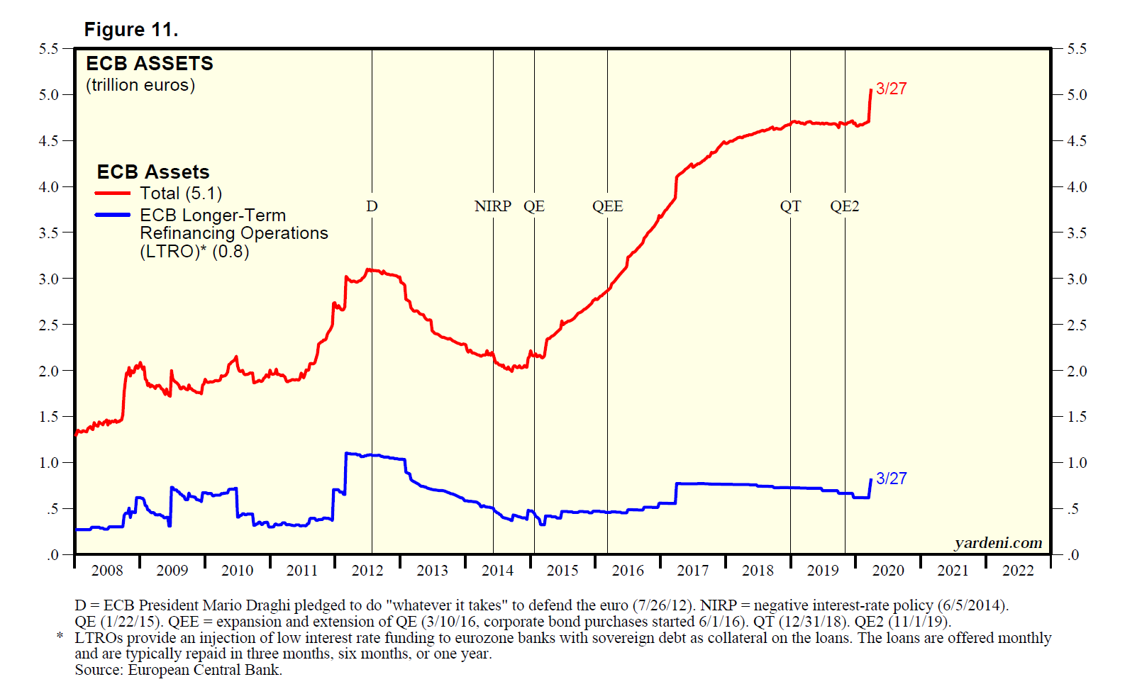 (2) ECB. The ECB started its first asset purchase program (QE1) on 1/22/15 and terminated it at the end of 2018. Securities held for monetary policy purposes increased by a whopping €2.5 trillion under the program (Fig. 5). A second round of purchases (QE2) was started at the end of last year (11/1/19) to the tune of €20 billion euros per month.
