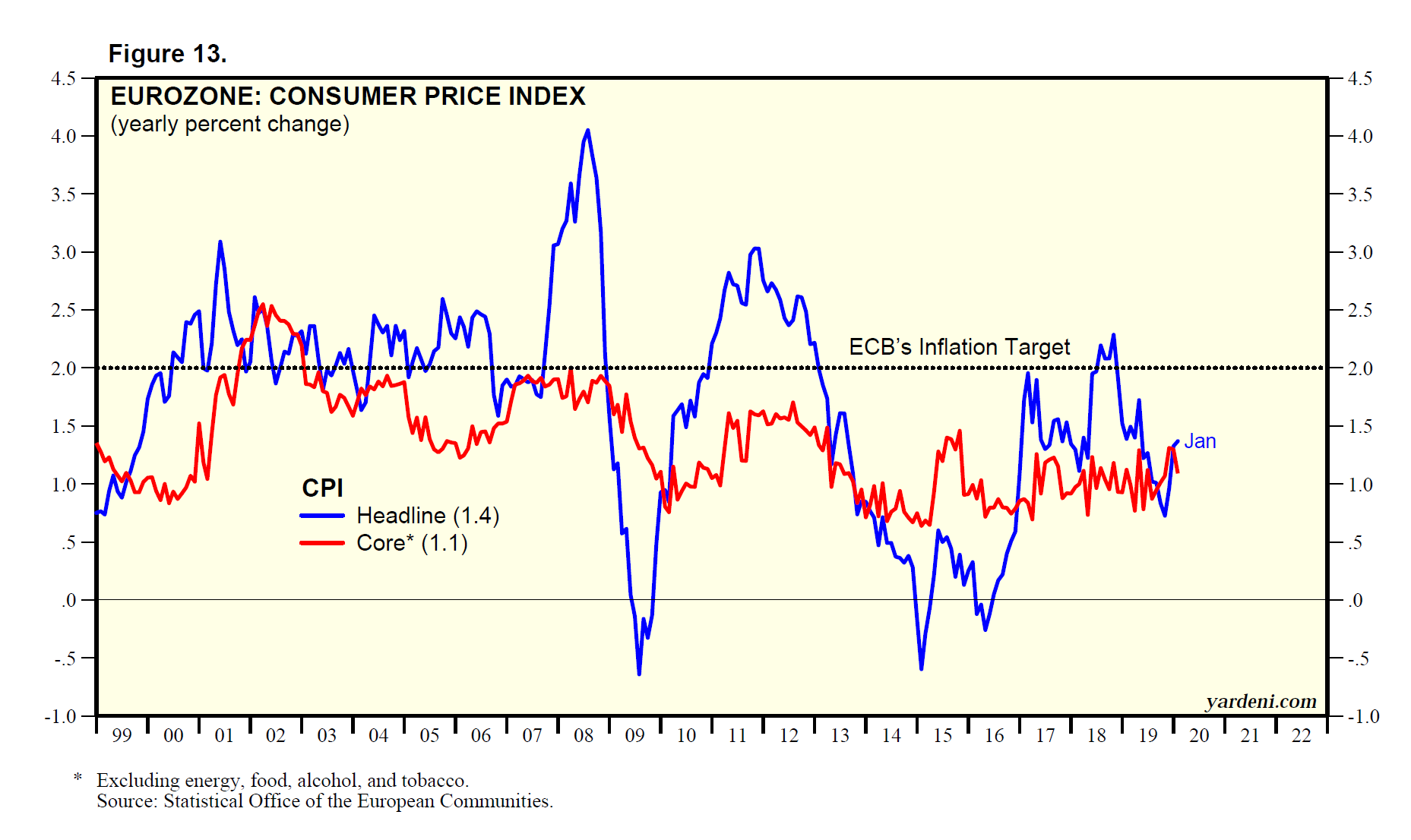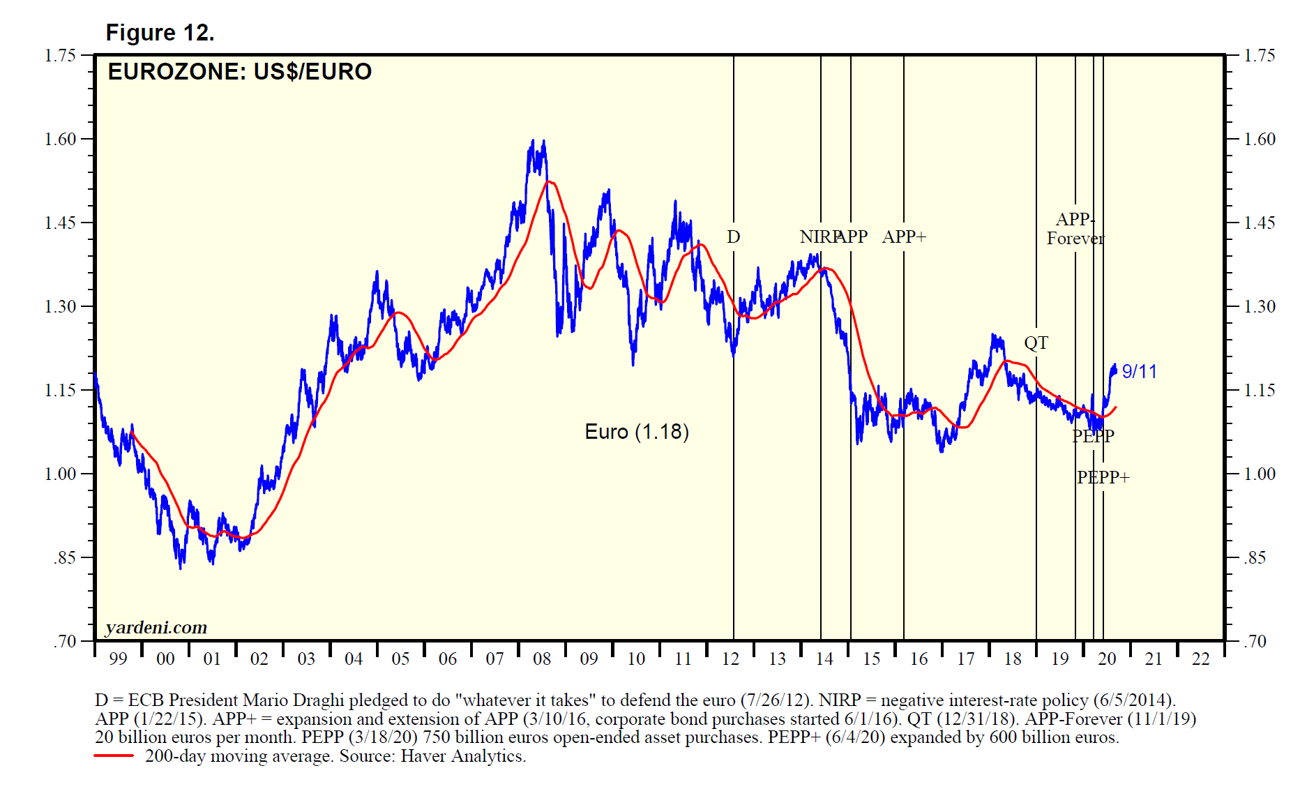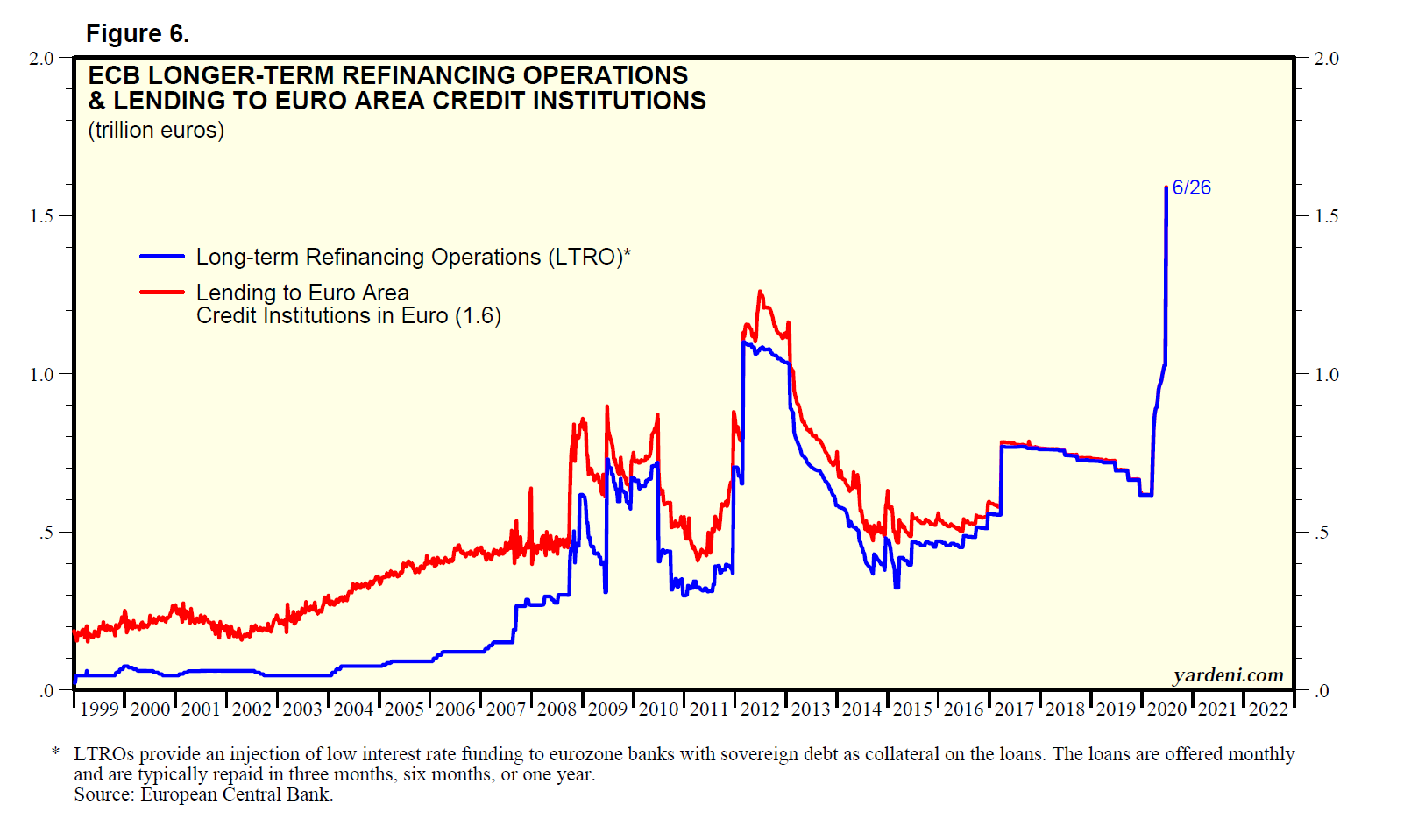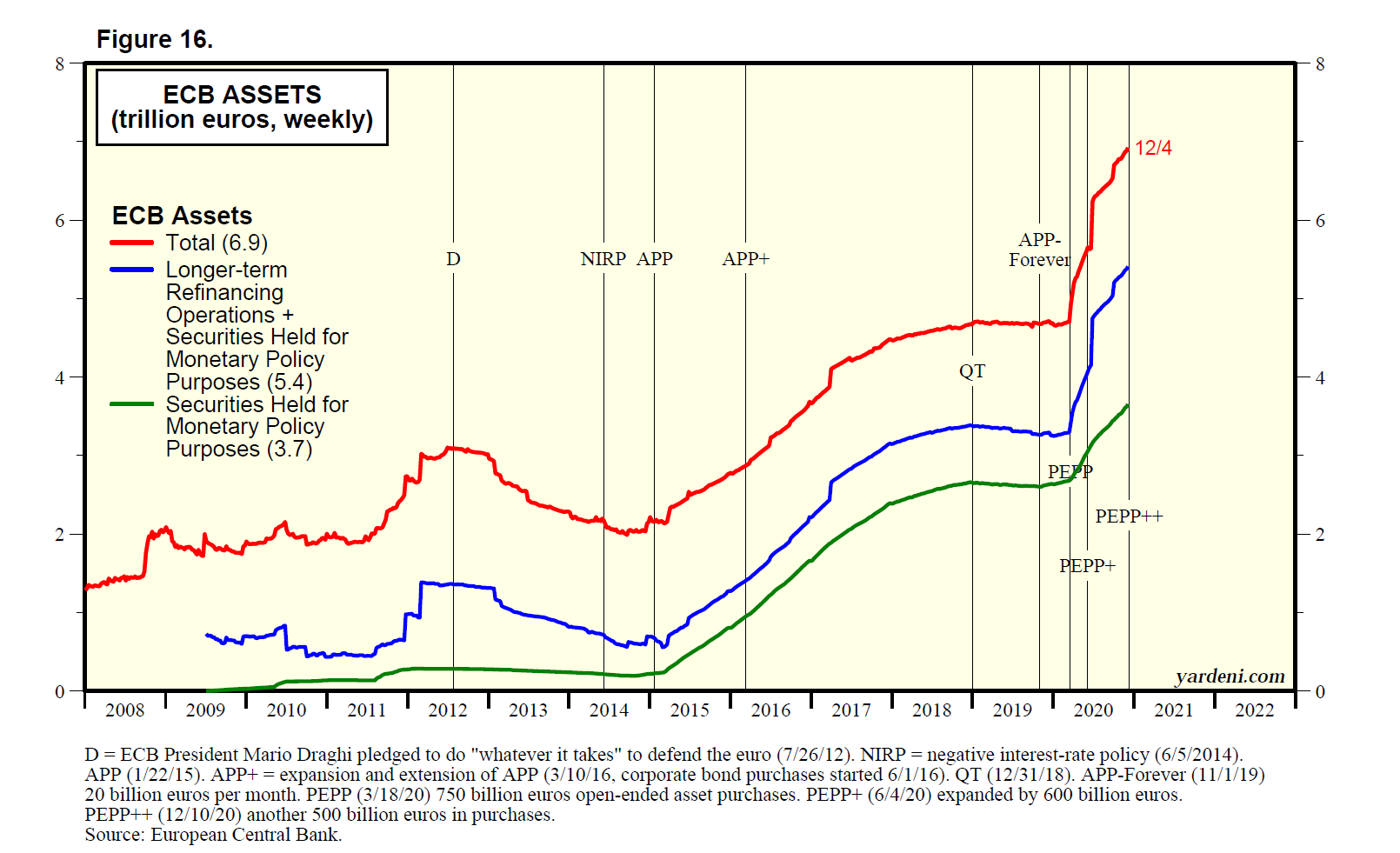 (2) ECB. The ECB started its first asset purchase program (QE1) on 1/22/15 and terminated it at the end of 2018. Securities held for monetary policy purposes increased by a whopping €2.5 trillion under the program (Fig. 5). A second round of purchases (QE2) was started at the end of last year (11/1/19) to the tune of €20 billion euros per month.