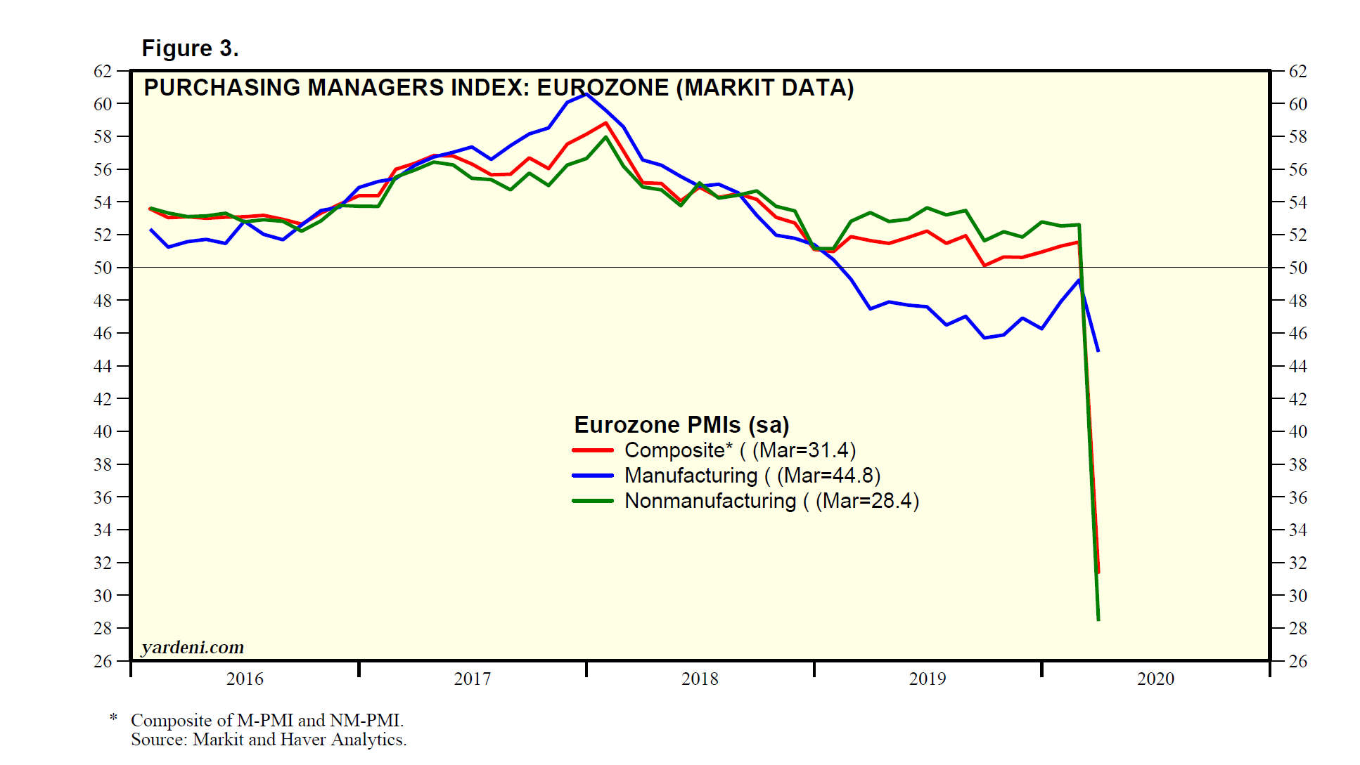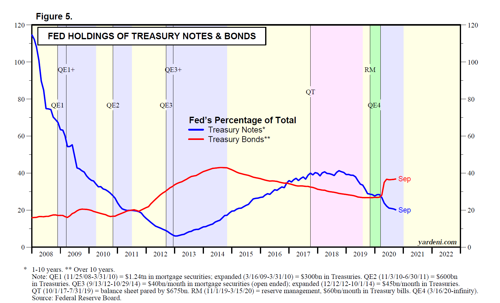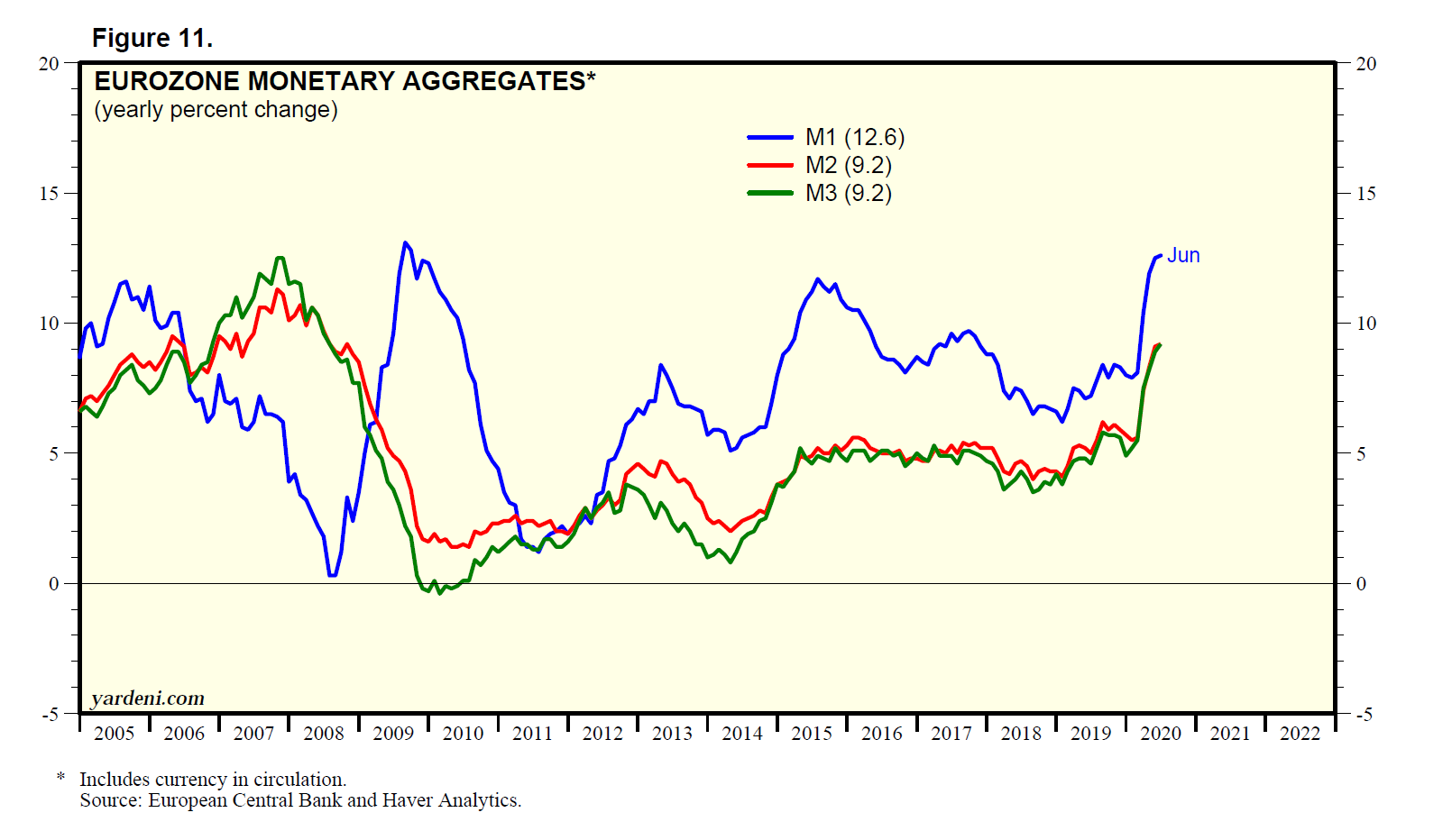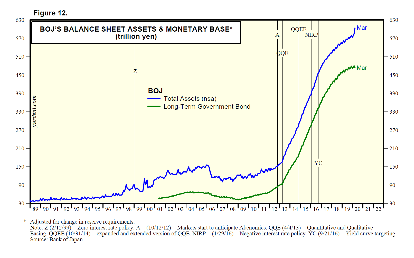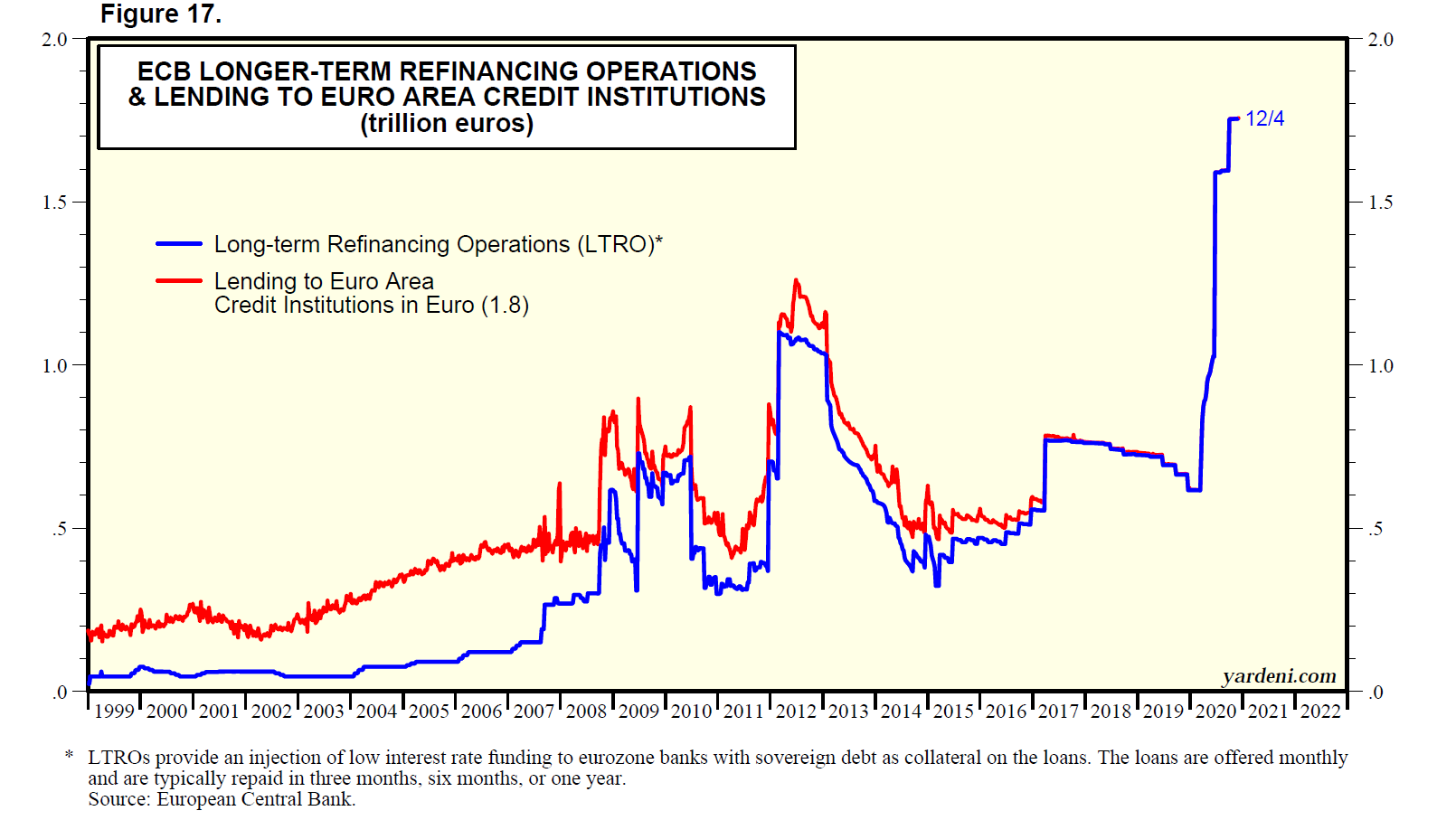 (2) ECB. The ECB started its first asset purchase program (QE1) on 1/22/15 and terminated it at the end of 2018. Securities held for monetary policy purposes increased by a whopping €2.5 trillion under the program (Fig. 5). A second round of purchases (QE2) was started at the end of last year (11/1/19) to the tune of €20 billion euros per month.