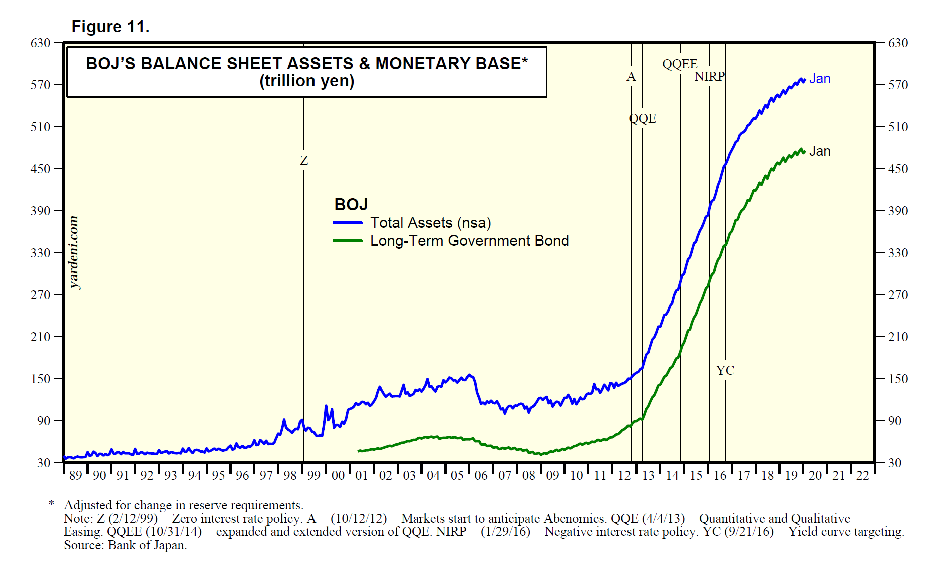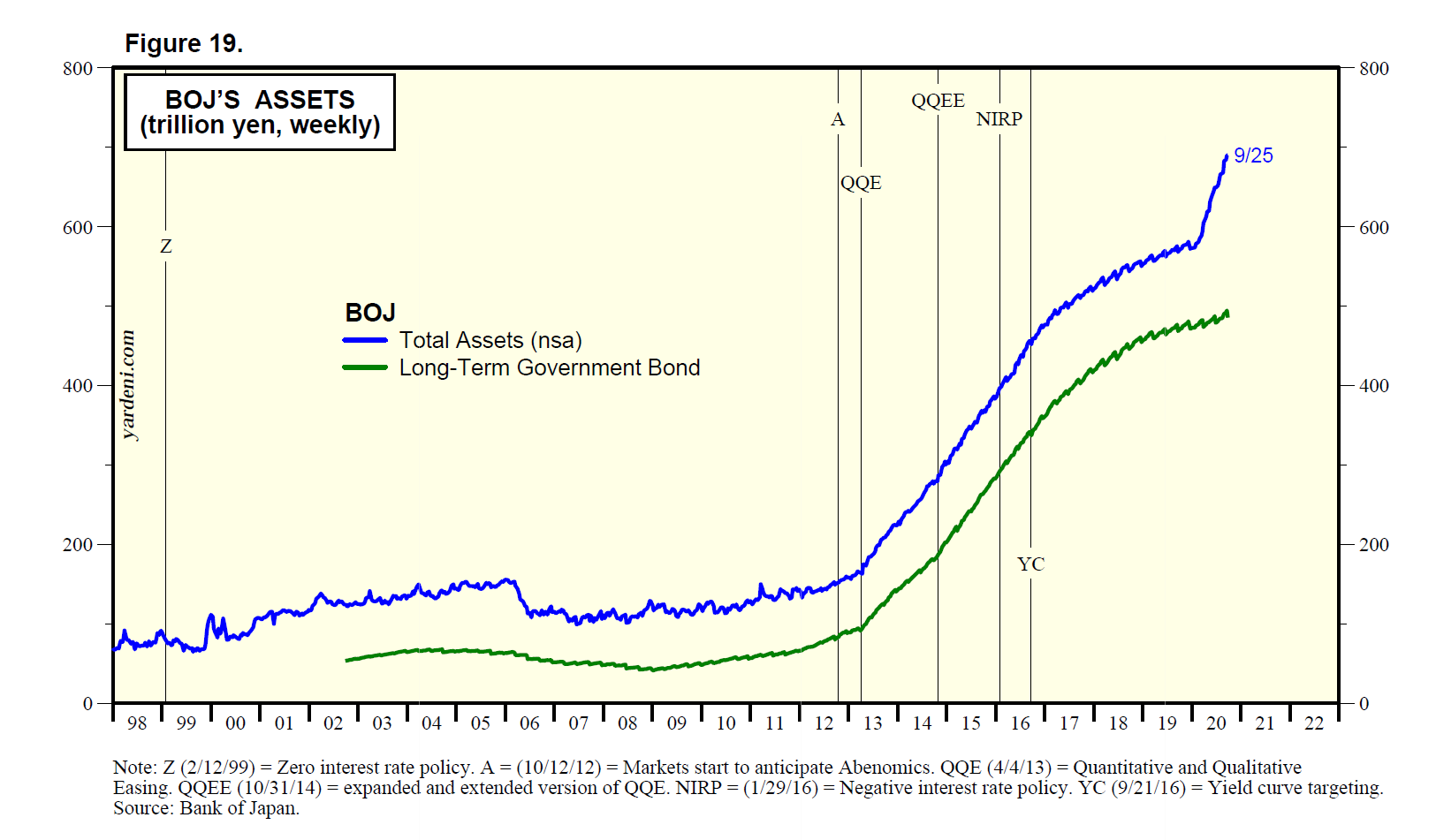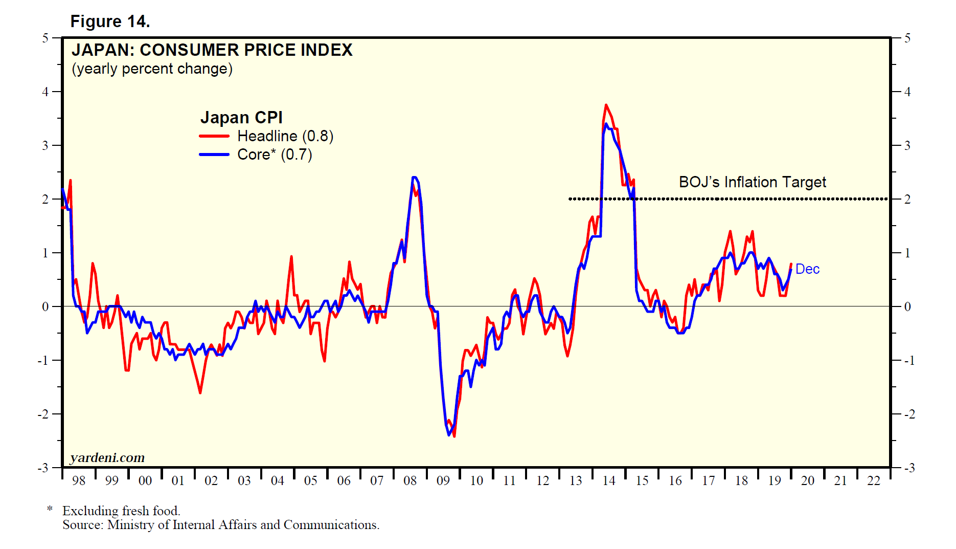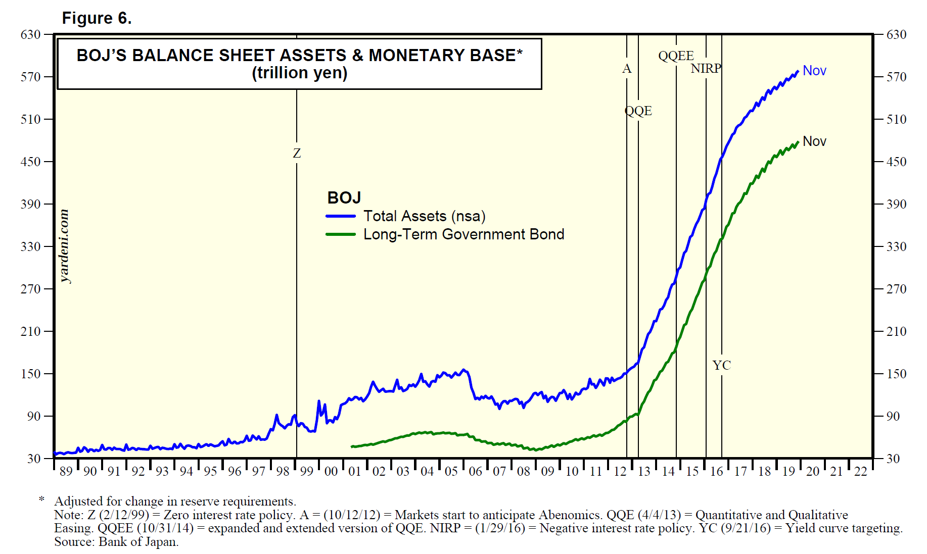 (3) BOJ. The BOJ started its quantitative and qualitative easing program (QQE) on 4/4/13 (Fig. 6). It has yet to be terminated. From April 2013 through November 2019, the BOJ’s assets are up 251%, led by a 424% increase in the BOJ’s holdings of JGBs.