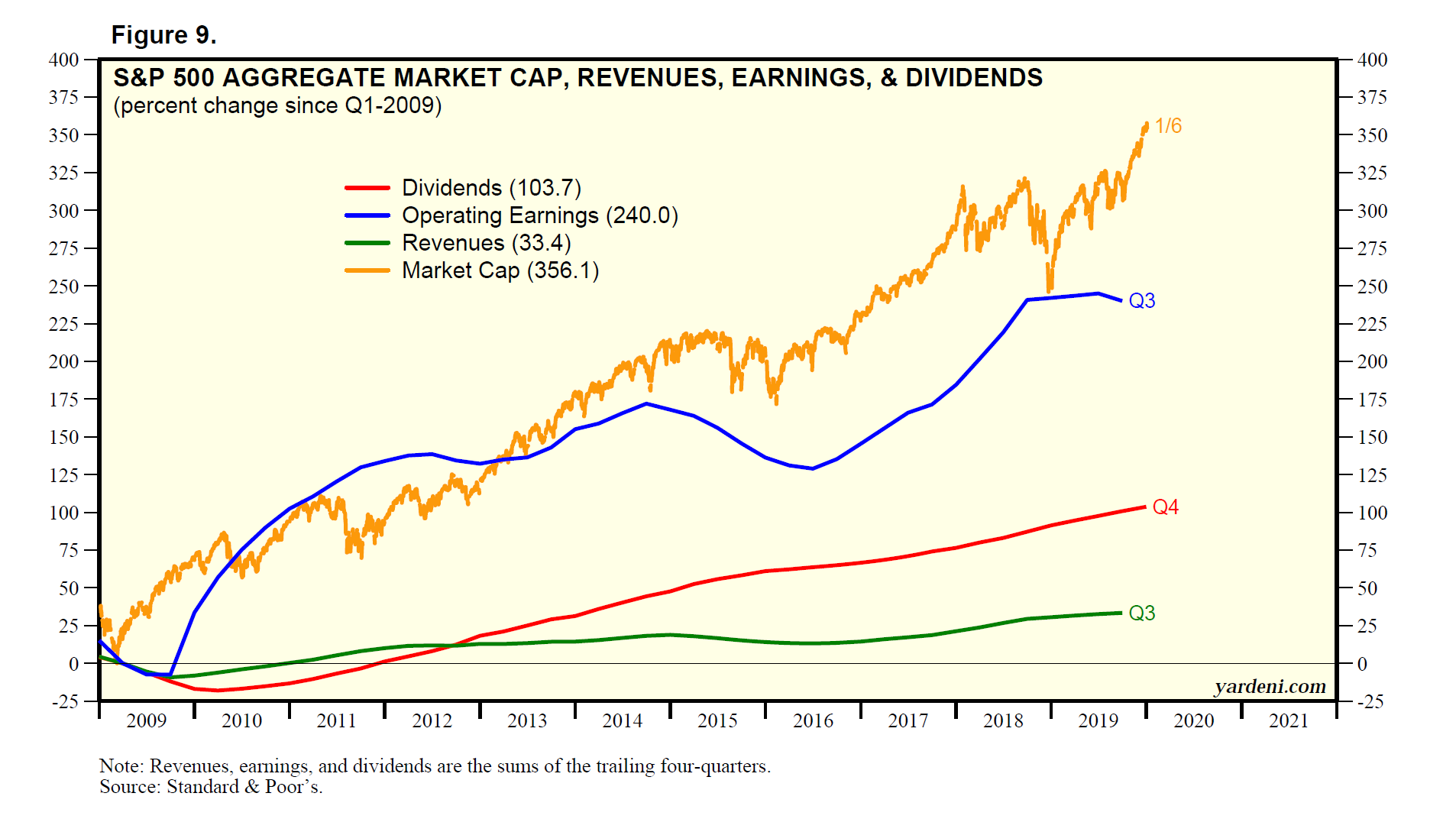 Strategy II: Paying More Dividends. The bears have been characterizing the current bull market as mostly on a sugar high ever since it started in March 2009. In fact, it has been driven by solid growth rates in S&P 500 aggregate revenues, earnings, and dividends. The S&P 500 stock market capitalization is up 355% since 3/9/09 (Fig. 9). Since then through Q3-2019, S&P 500 aggregate revenues, earnings, and dividends are up 33%, 240%, and 101%.
