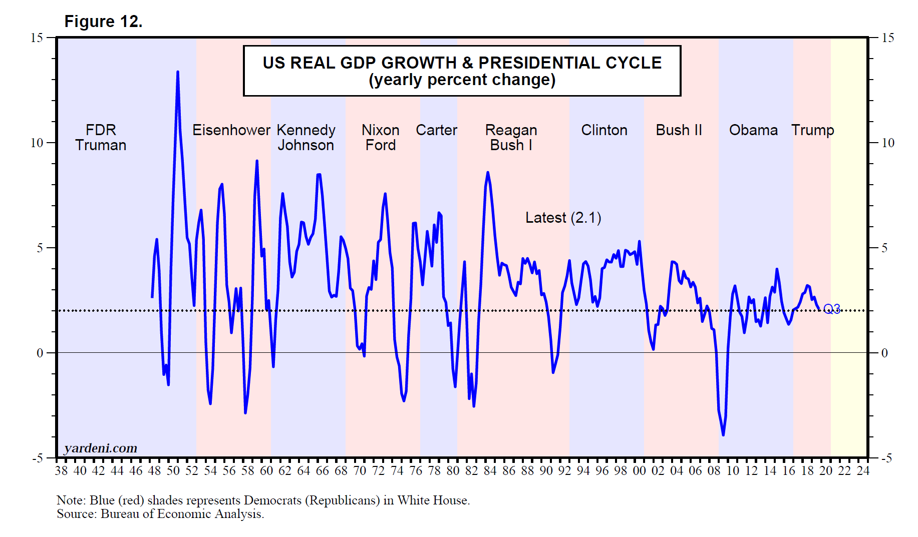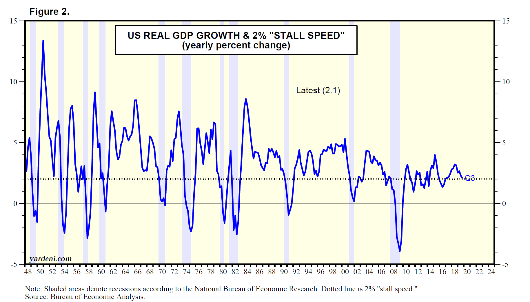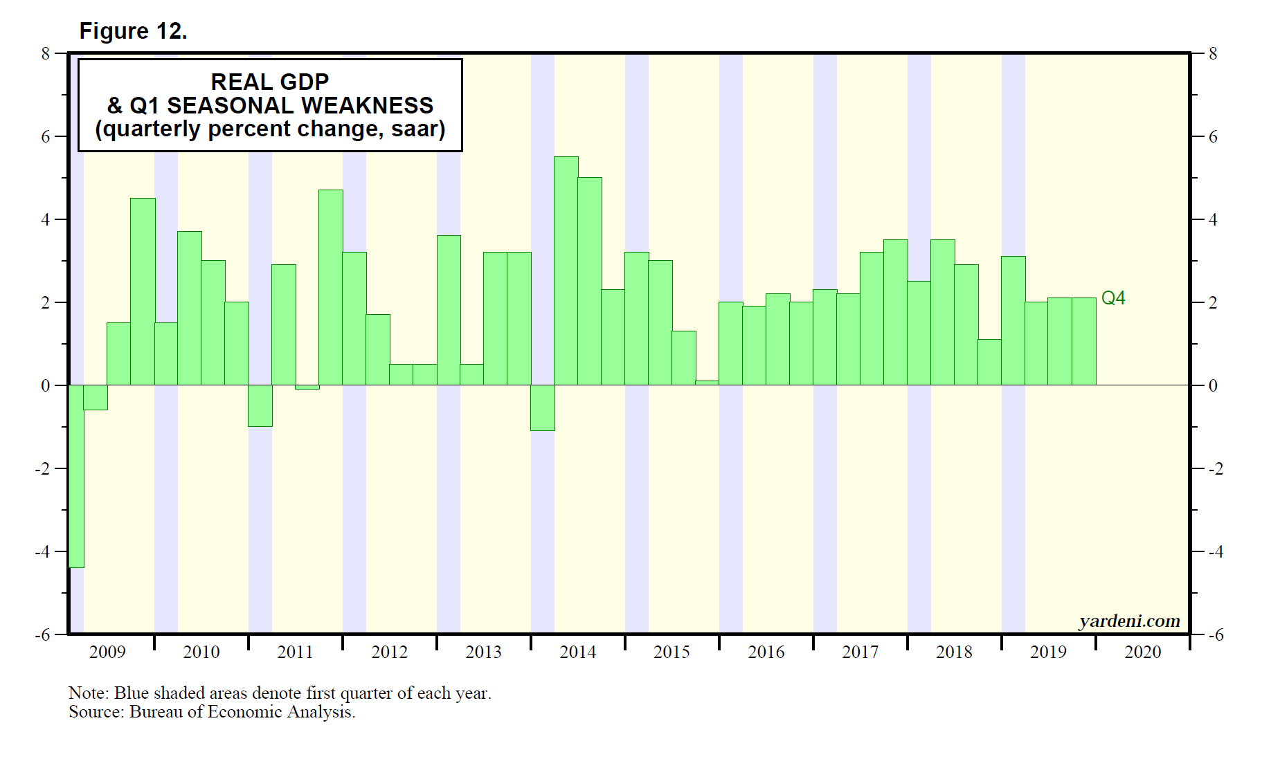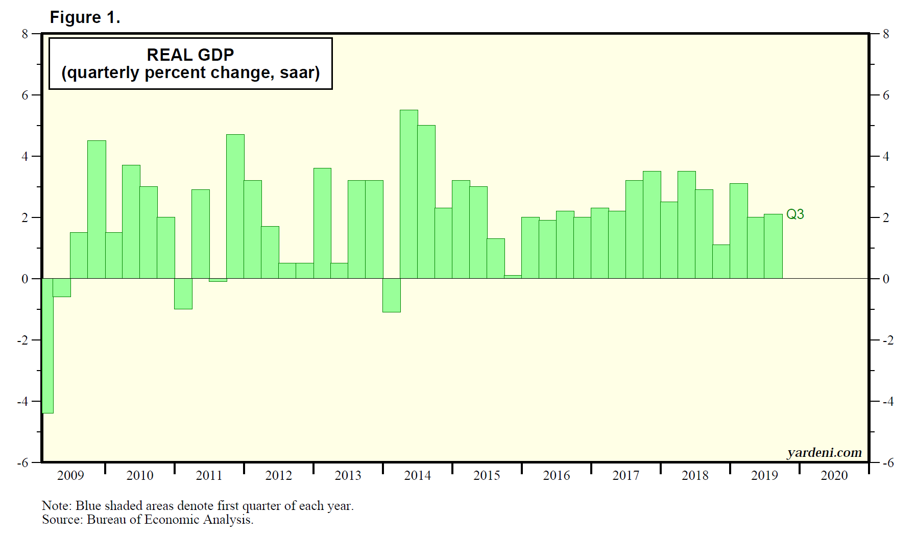 US Economy I: Running on Five Cylinders. US real GDP is on track to have grown by 2.3% (saar) during Q4-2019 following gains of 3.1%, 2.0%, and 2.1% during Q1, Q2, and Q3 last year (Fig.1). That’s actually quite impressive a performance given that manufacturing—one of the economy’s main cylinders—is still sputtering. The average increase in real GDP during the 15 quarters since Q1-2016 has been 2.4%. On a y/y basis, real GDP has been growing around 2.0% since 2010 (Fig. 2). Let’s look under the economy’s hood: