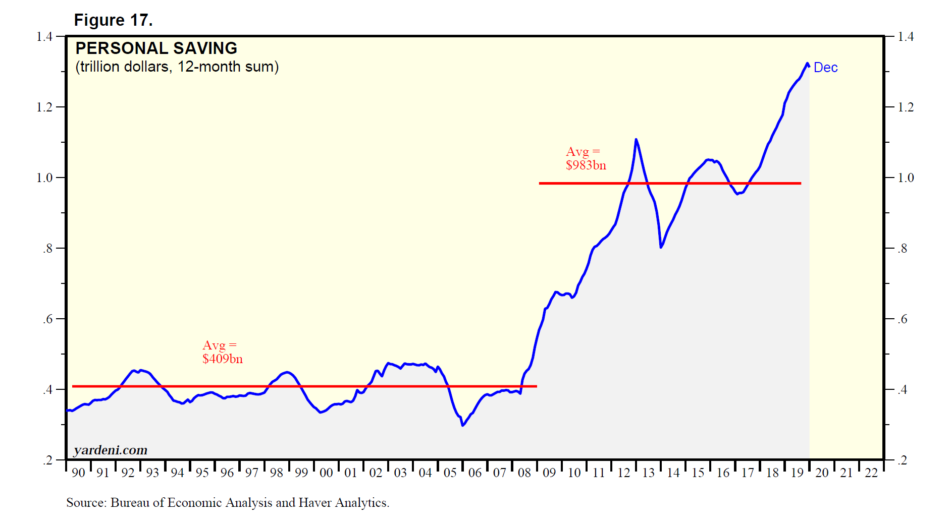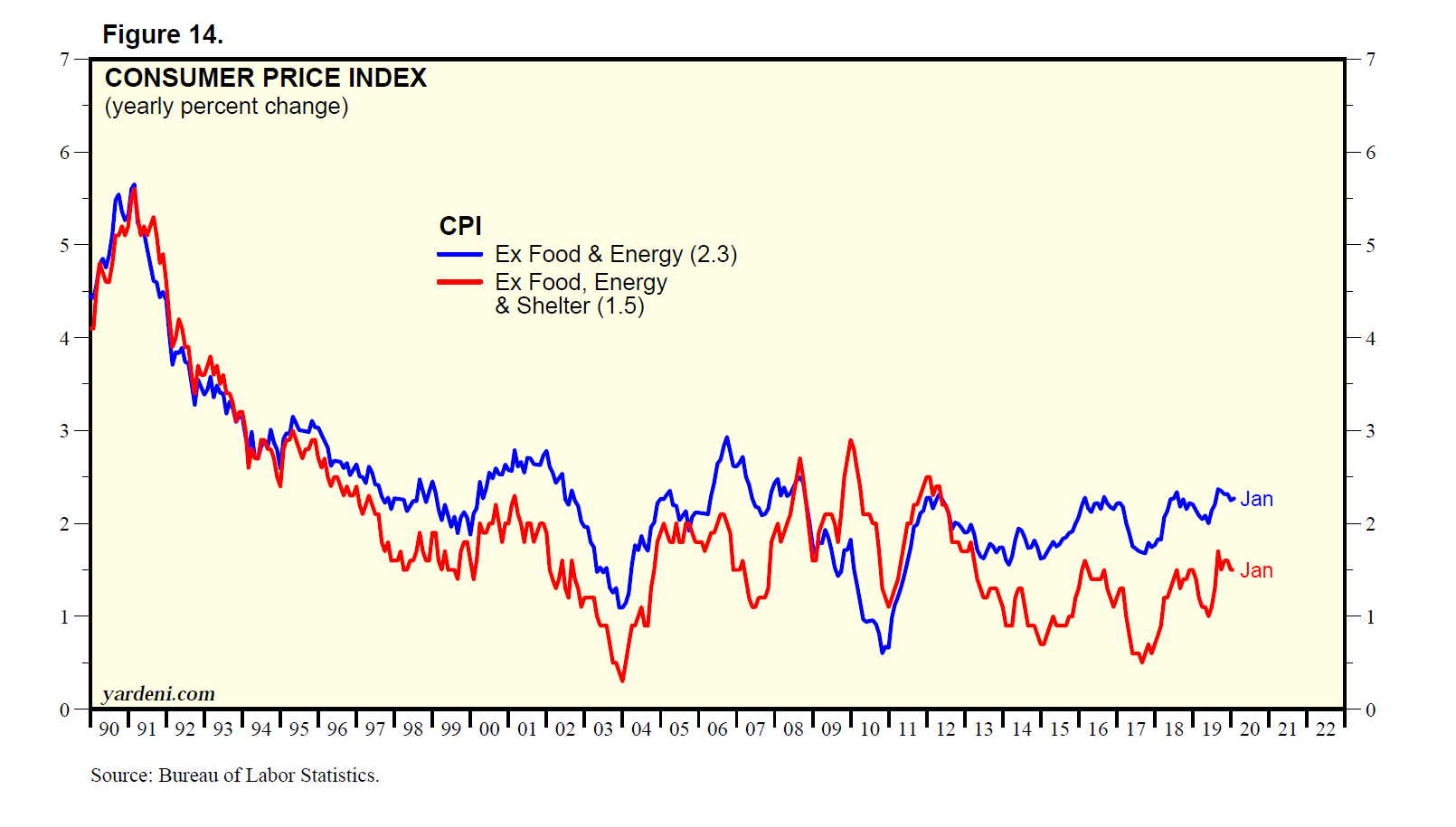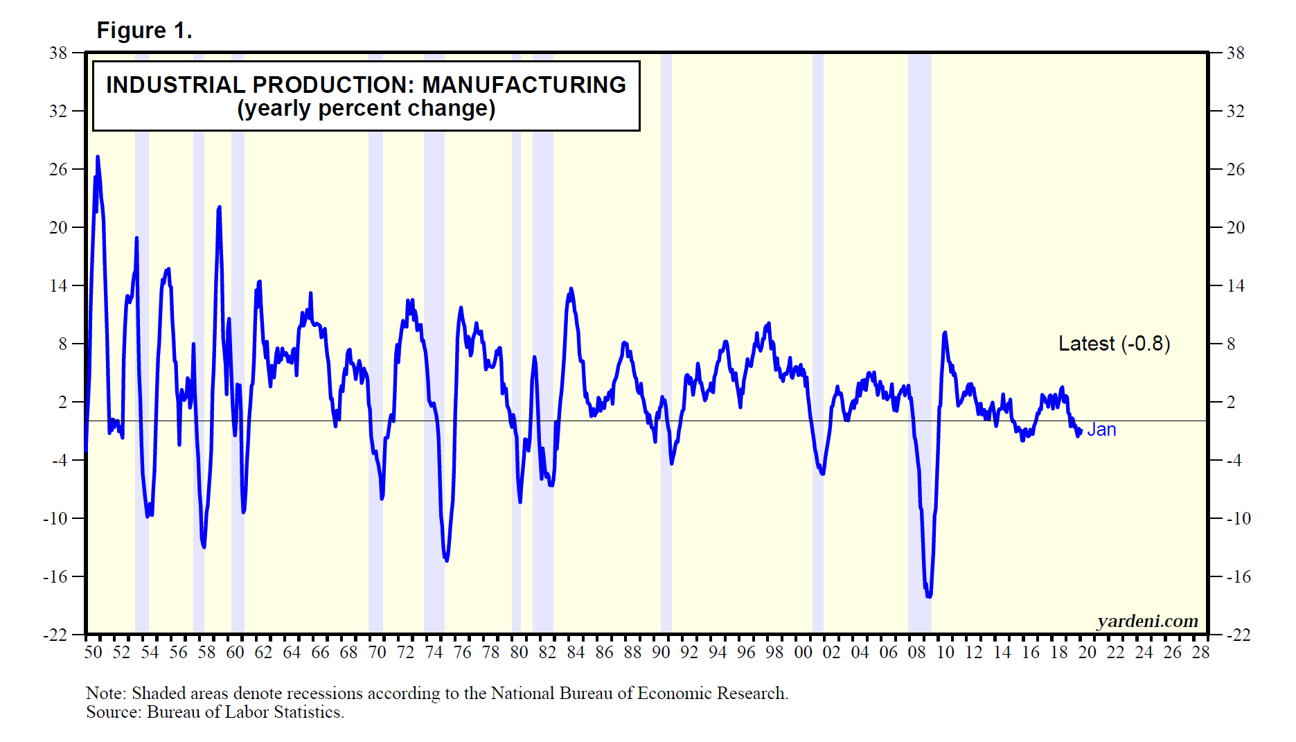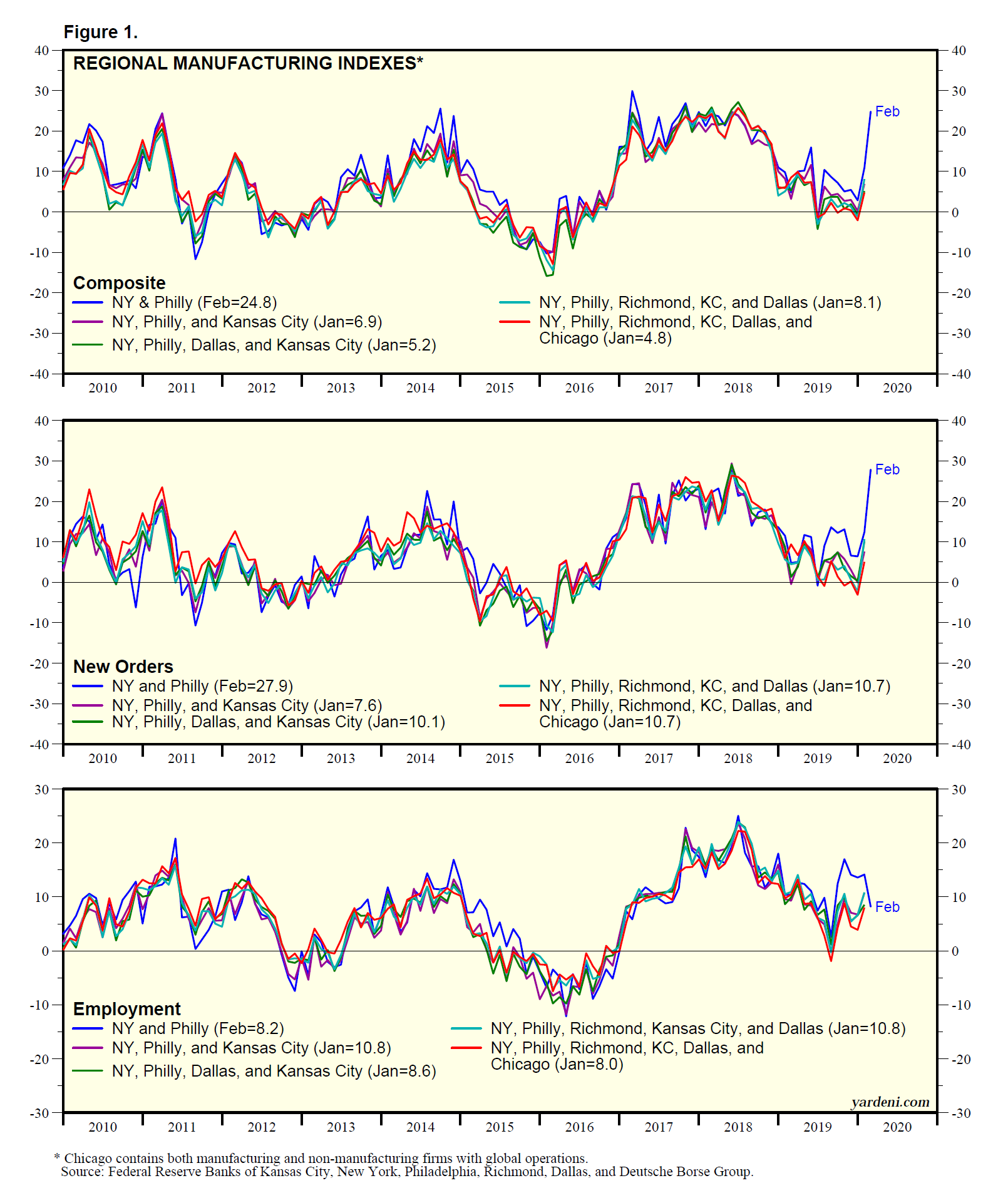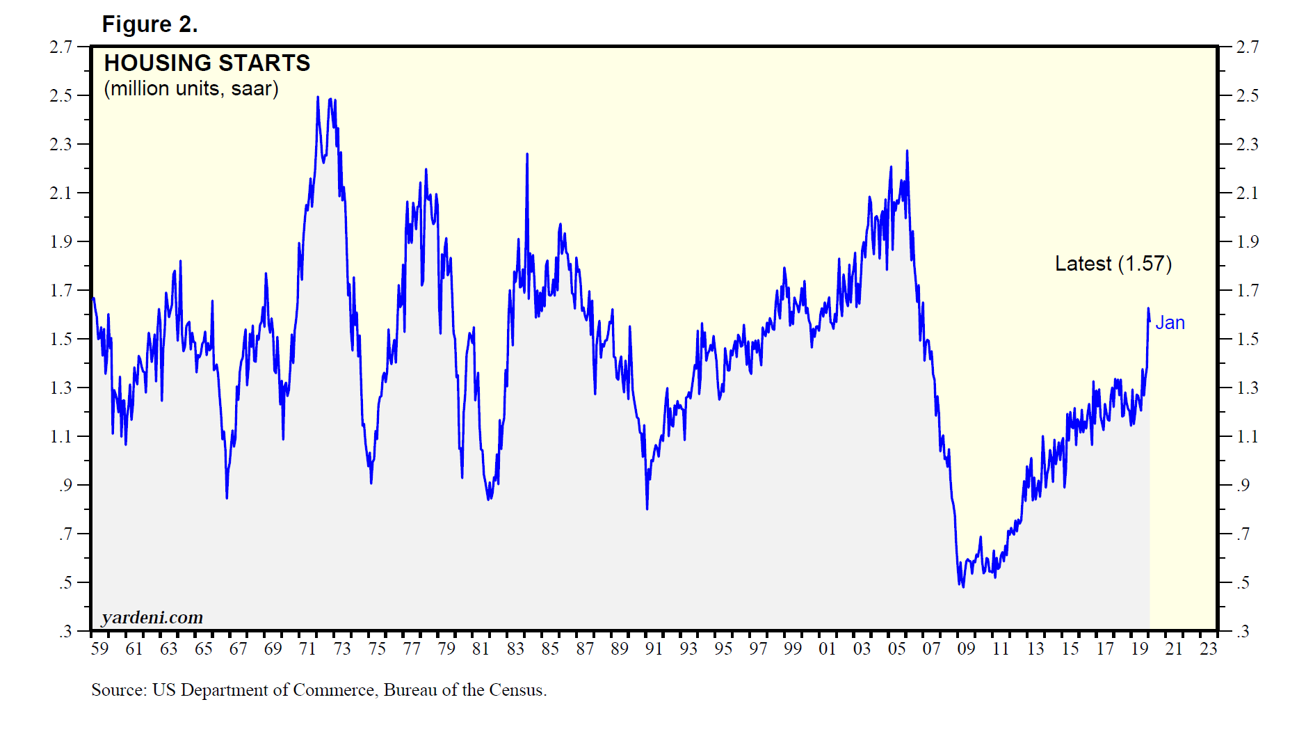 US Economy I: Running on Five Cylinders. US real GDP is on track to have grown by 2.3% (saar) during Q4-2019 following gains of 3.1%, 2.0%, and 2.1% during Q1, Q2, and Q3 last year (Fig.1). That’s actually quite impressive a performance given that manufacturing—one of the economy’s main cylinders—is still sputtering. The average increase in real GDP during the 15 quarters since Q1-2016 has been 2.4%. On a y/y basis, real GDP has been growing around 2.0% since 2010 (Fig. 2). Let’s look under the economy’s hood: