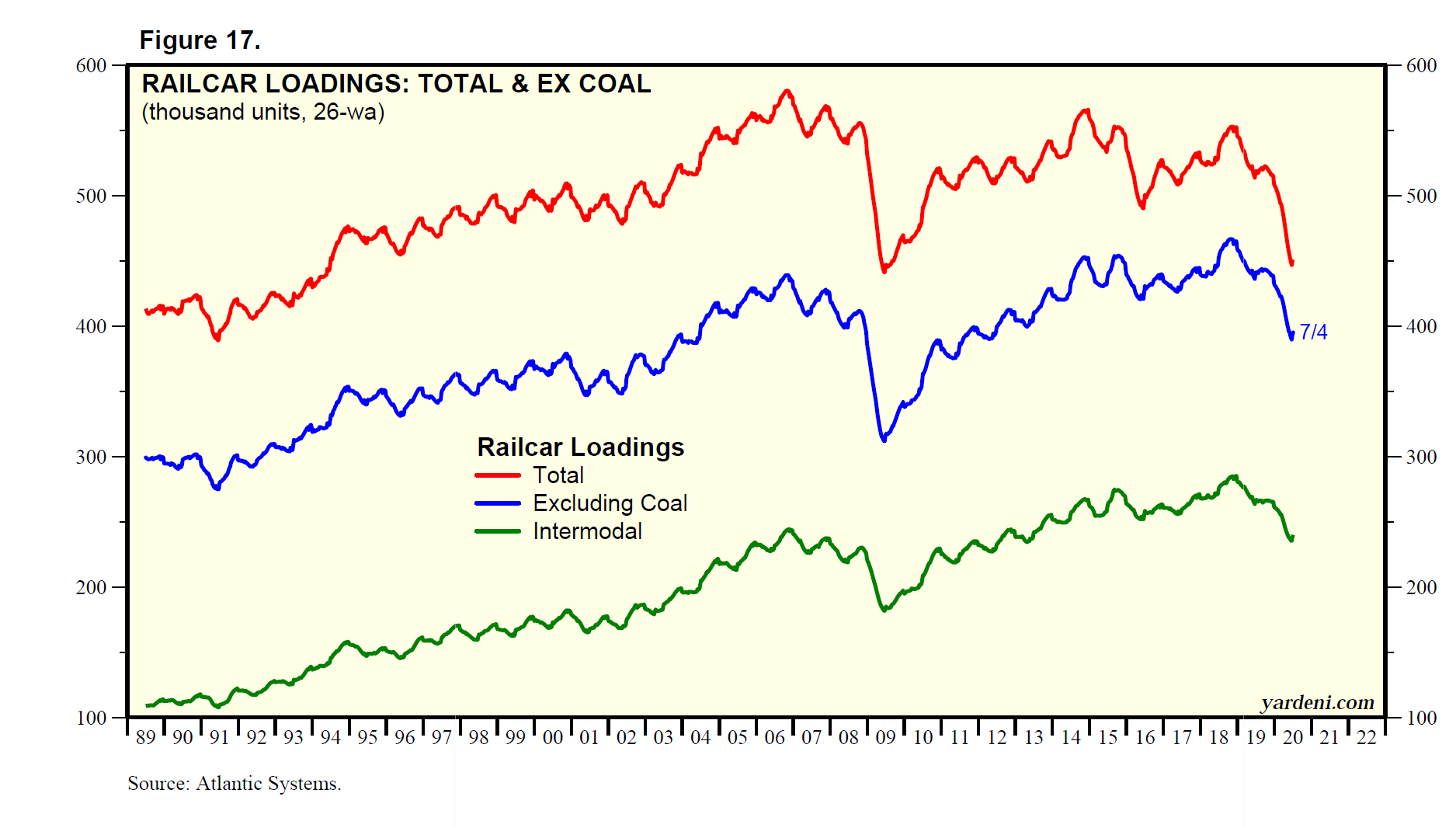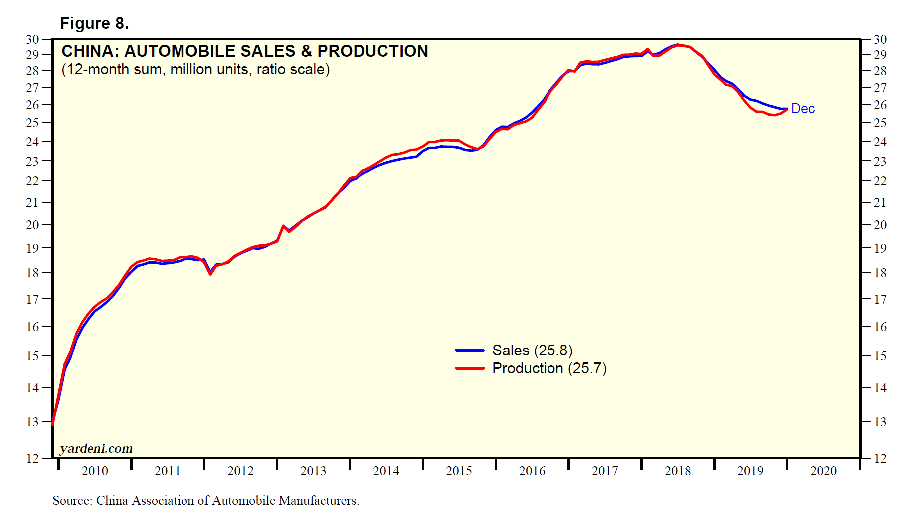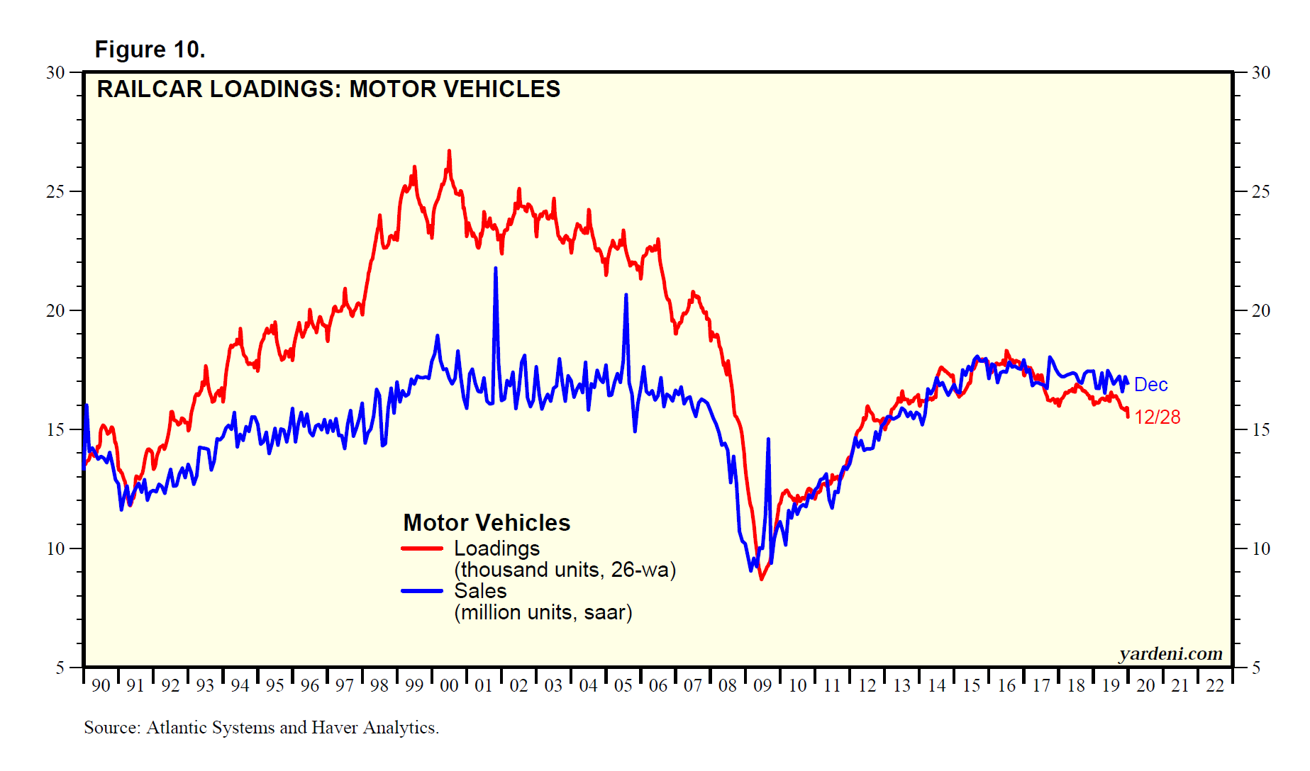 (5) Auto sales. There is a relatively tight fit between sales and railcar loadings of motor vehicles (Fig. 10). The former has stalled around 17.0 million (saar) for the past two years, while the latter has been on a modest downward trend, falling 3.7% y/y through the 12/28/19 week based on the 26-week average.
