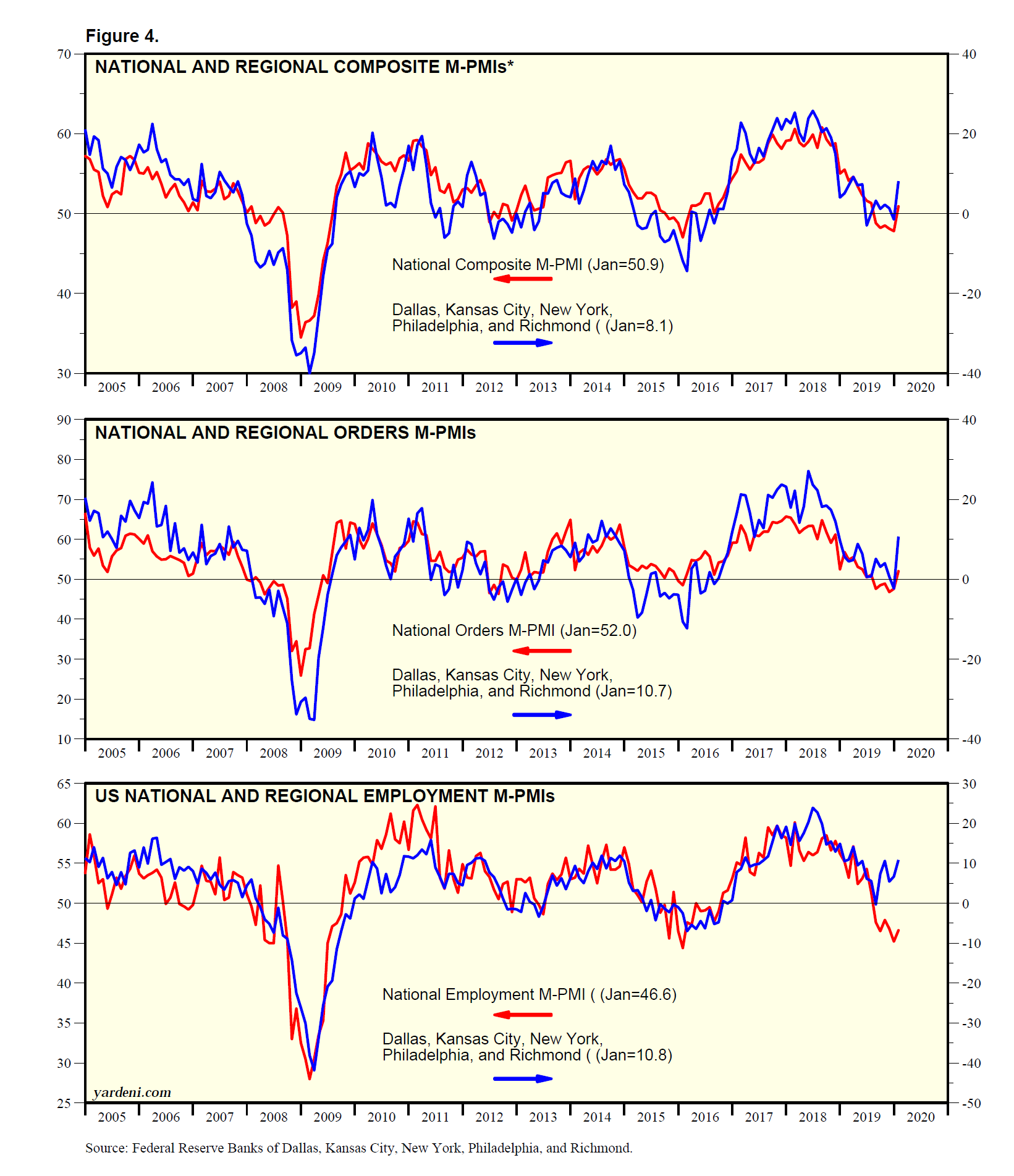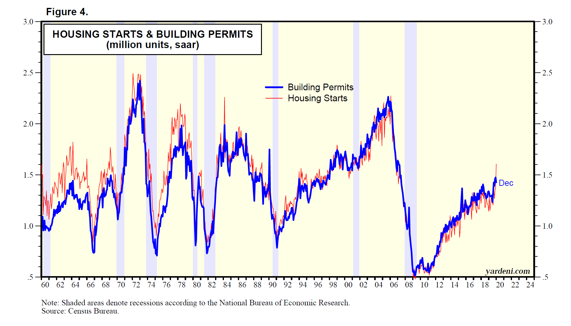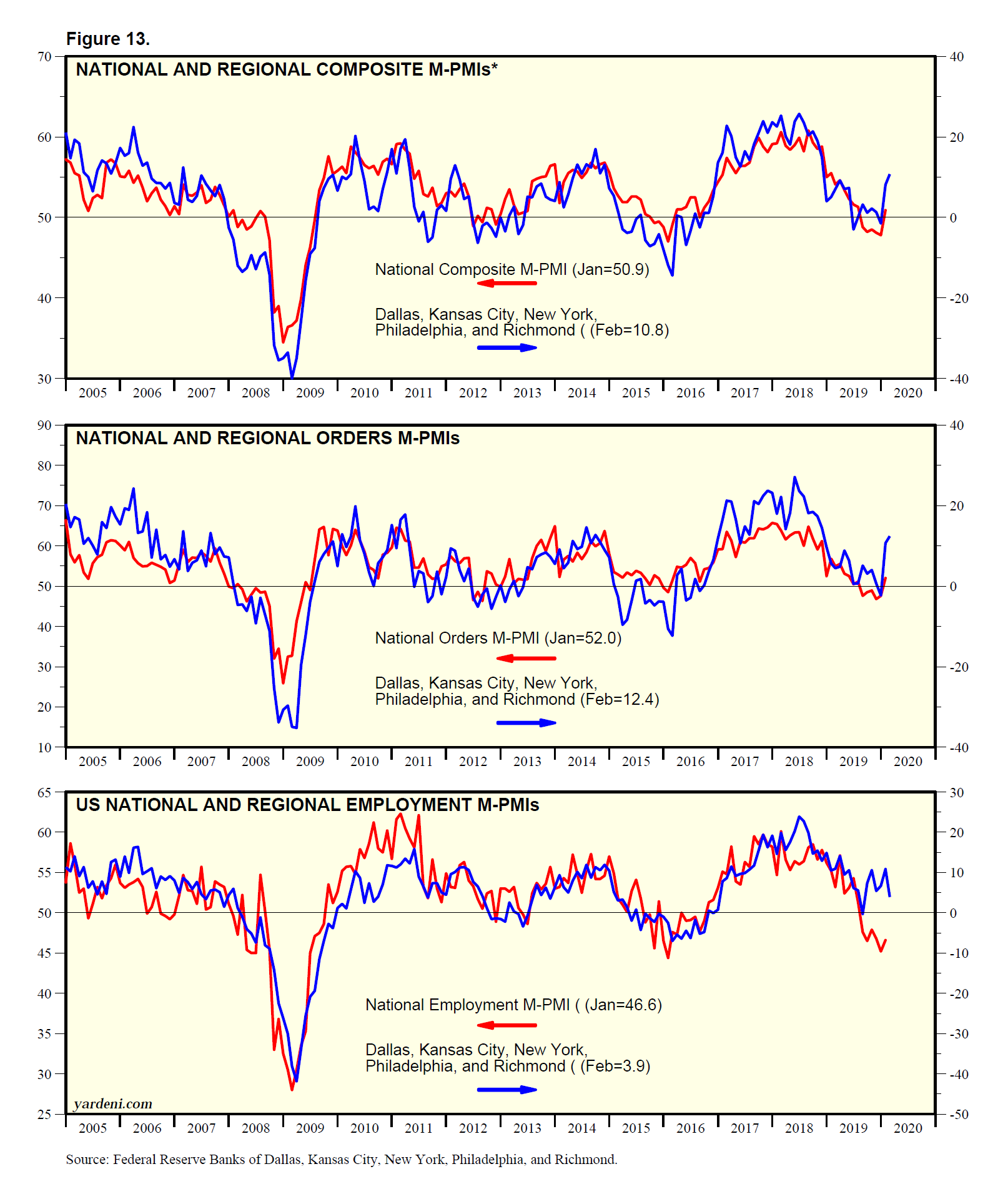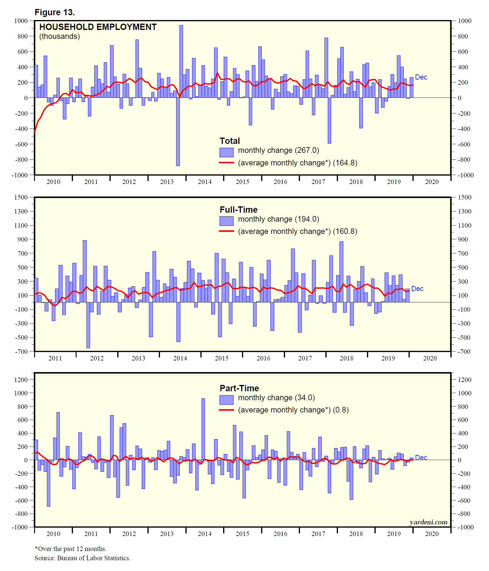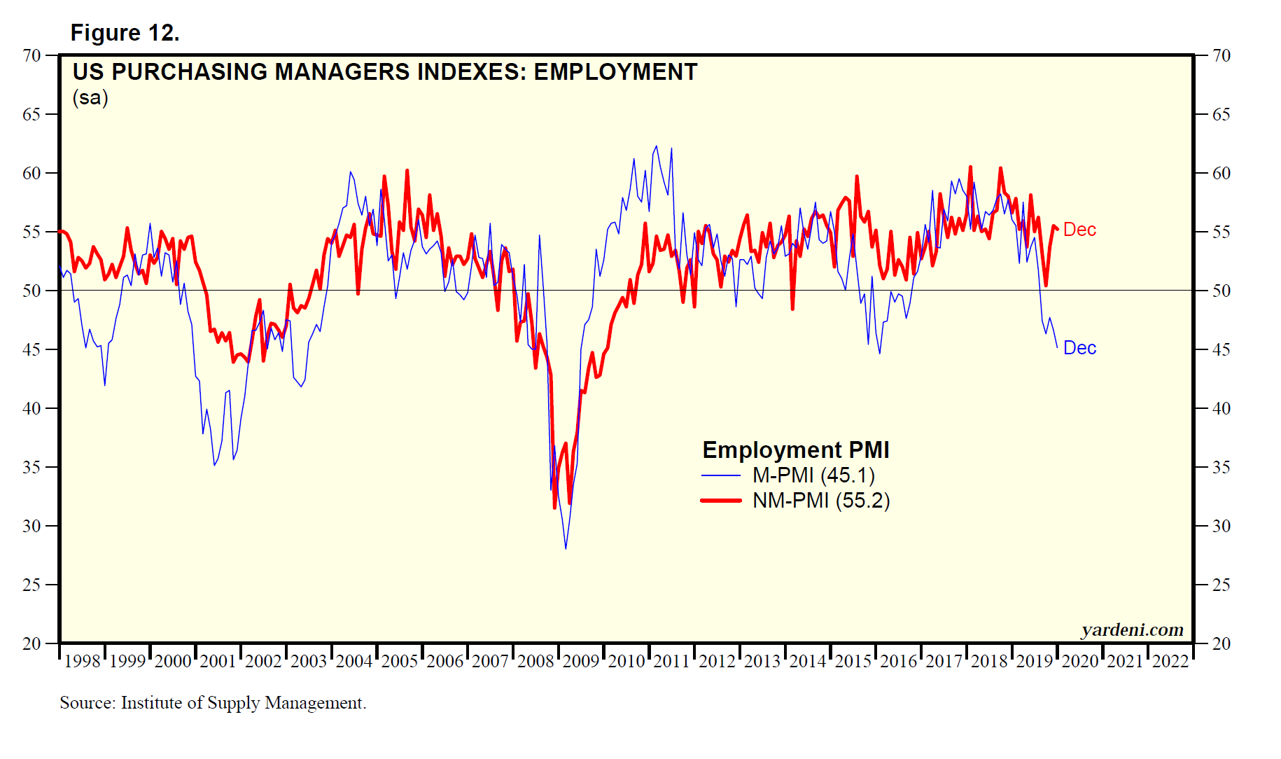 (6) Employment. The good news is that the labor market remains strong. The four-week average of initial unemployment claims did rise to 233,250 during the last week of 2019, but that remains near recent cyclical lows (Fig. 11). This series is highly correlated with the percentage of respondents in the consumer confidence survey who say that jobs are hard to get. Only 13.1% said so during December. Also in December, while the M-PMI employment index dropped to 45.1, the NM-PMI employment index remained high at 55.2 (Fig. 12). Manufacturing accounts for only 8% of payroll employment.