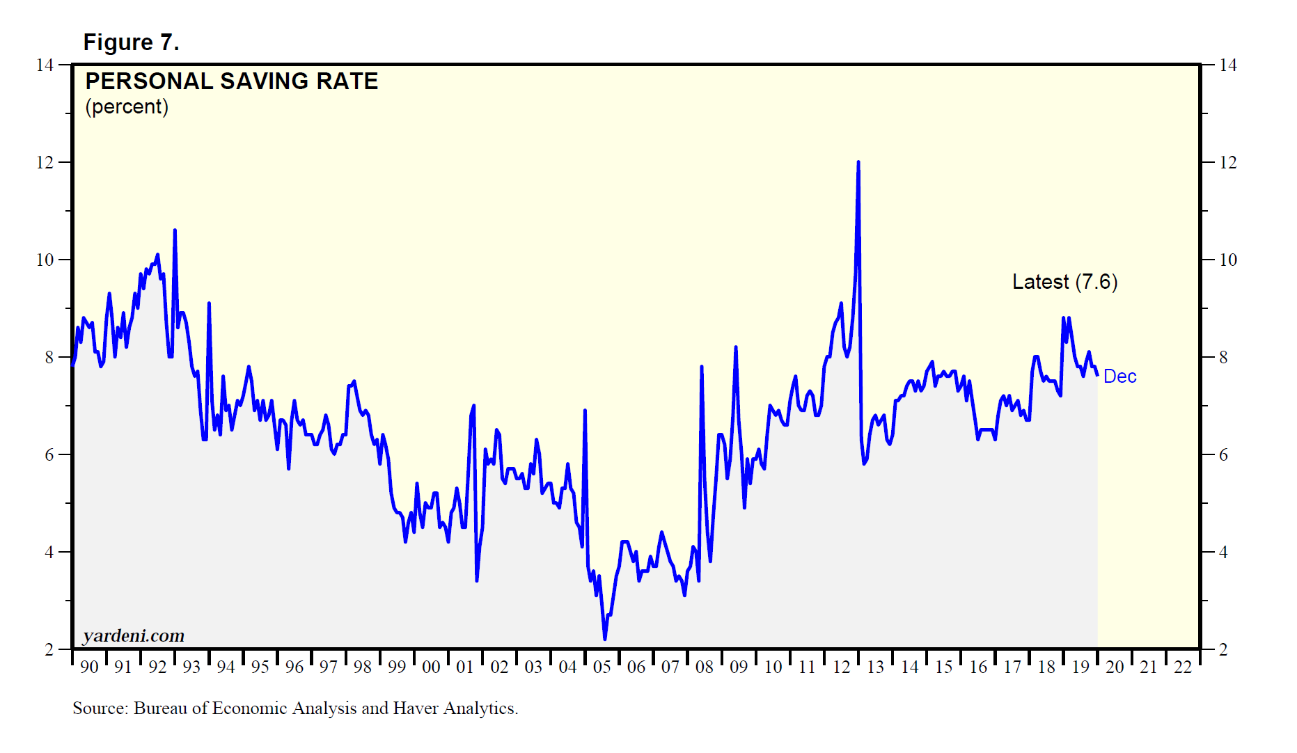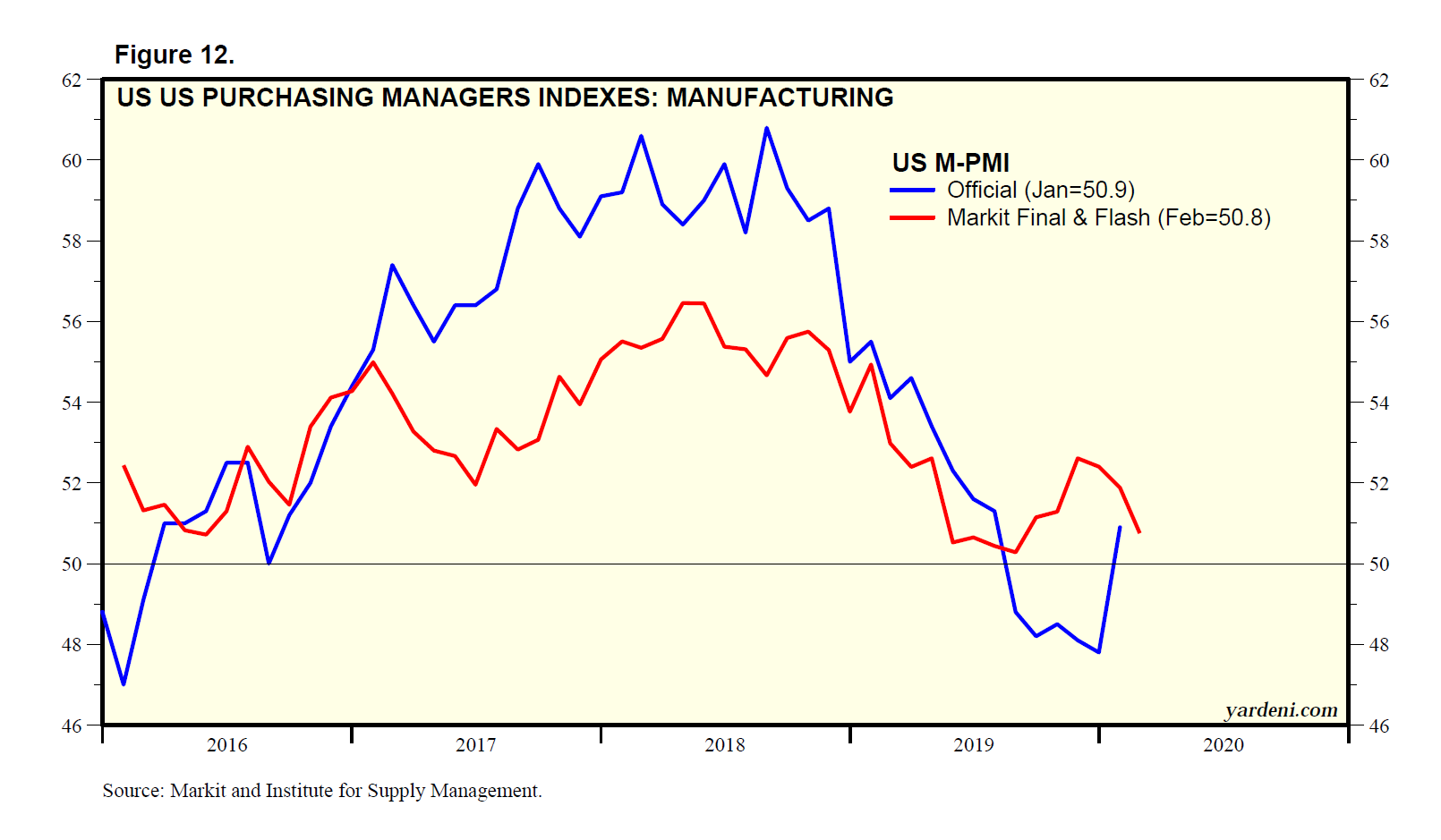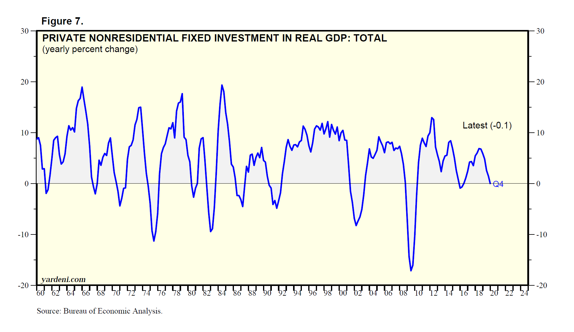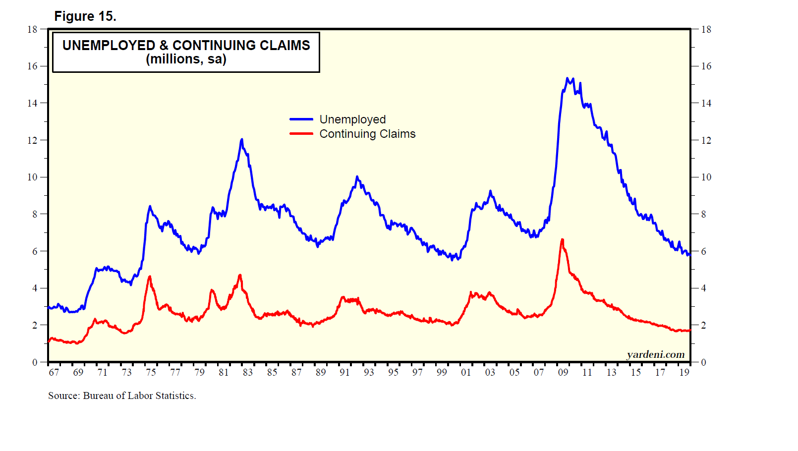 (6) Employment. The good news is that the labor market remains strong. The four-week average of initial unemployment claims did rise to 233,250 during the last week of 2019, but that remains near recent cyclical lows (Fig. 11). This series is highly correlated with the percentage of respondents in the consumer confidence survey who say that jobs are hard to get. Only 13.1% said so during December. Also in December, while the M-PMI employment index dropped to 45.1, the NM-PMI employment index remained high at 55.2 (Fig. 12). Manufacturing accounts for only 8% of payroll employment.