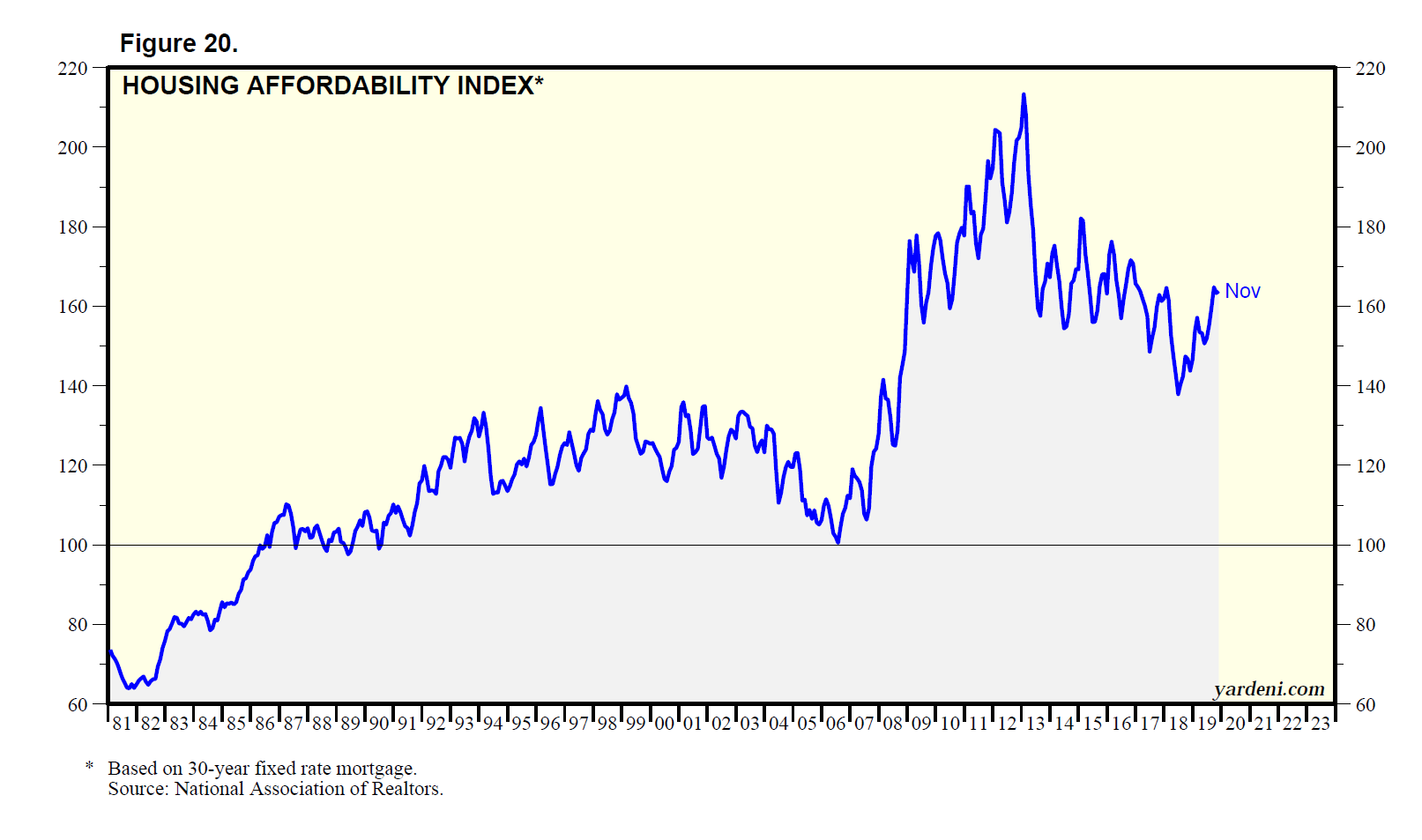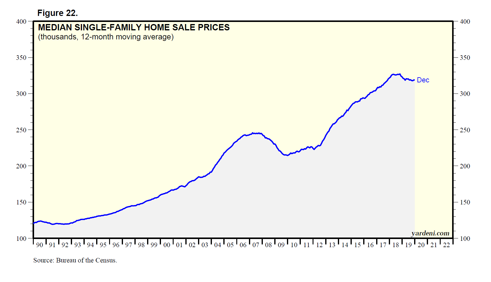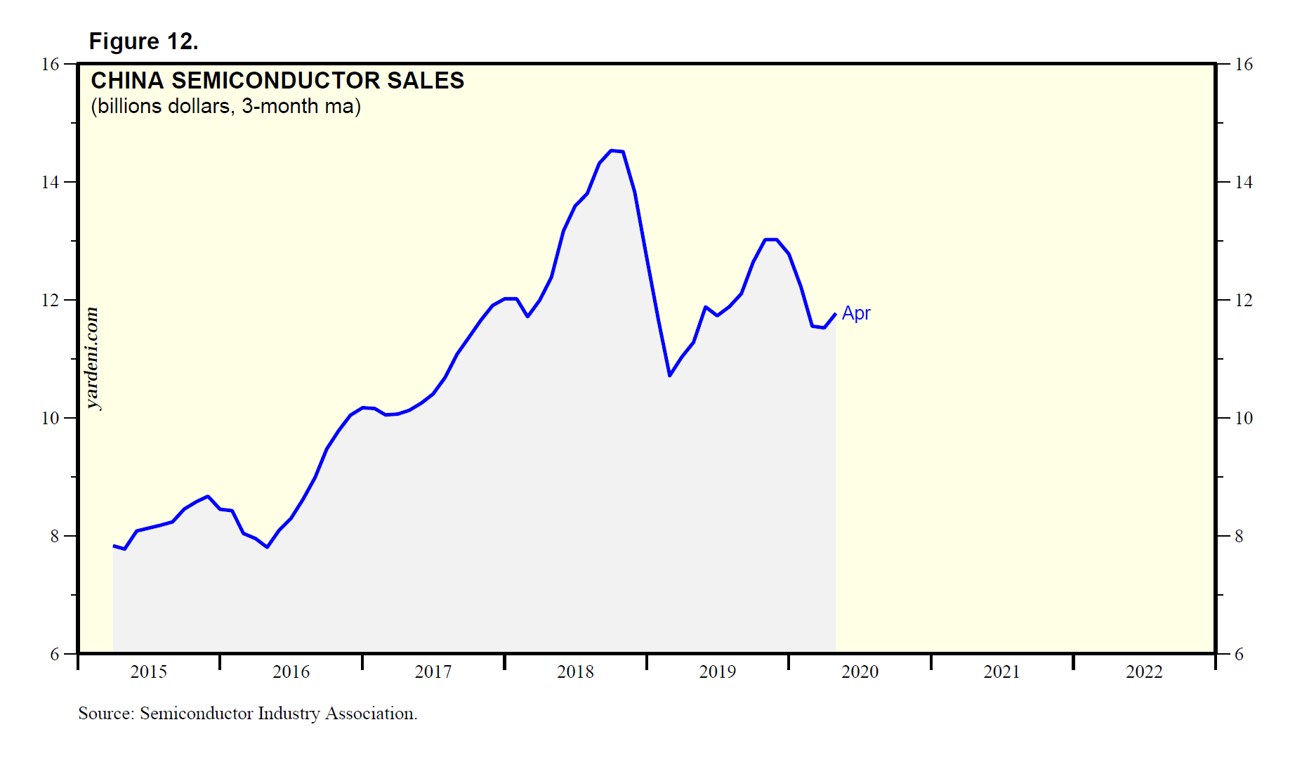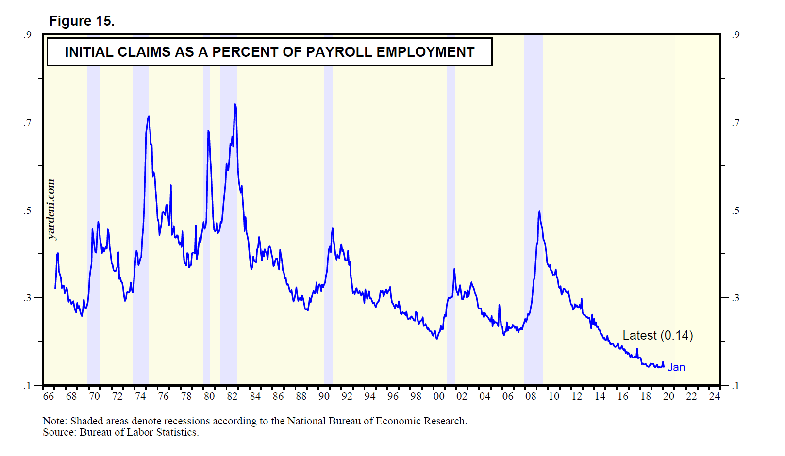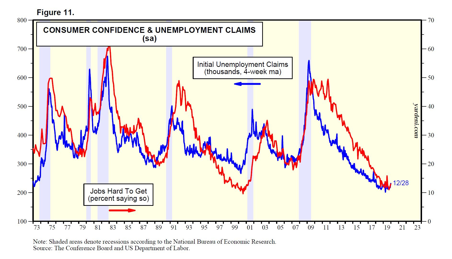 (6) Employment. The good news is that the labor market remains strong. The four-week average of initial unemployment claims did rise to 233,250 during the last week of 2019, but that remains near recent cyclical lows (Fig. 11). This series is highly correlated with the percentage of respondents in the consumer confidence survey who say that jobs are hard to get. Only 13.1% said so during December. Also in December, while the M-PMI employment index dropped to 45.1, the NM-PMI employment index remained high at 55.2 (Fig. 12). Manufacturing accounts for only 8% of payroll employment.