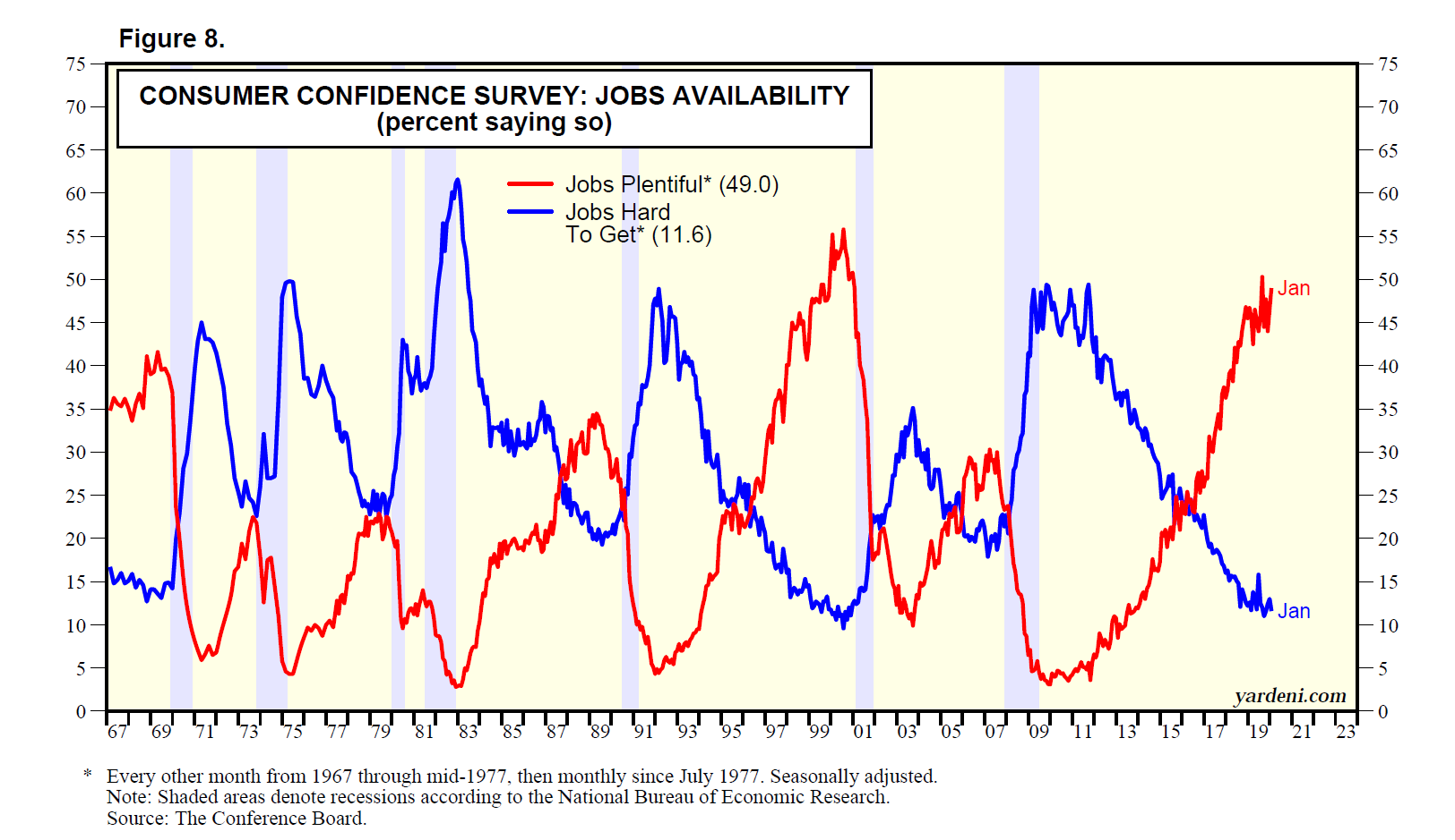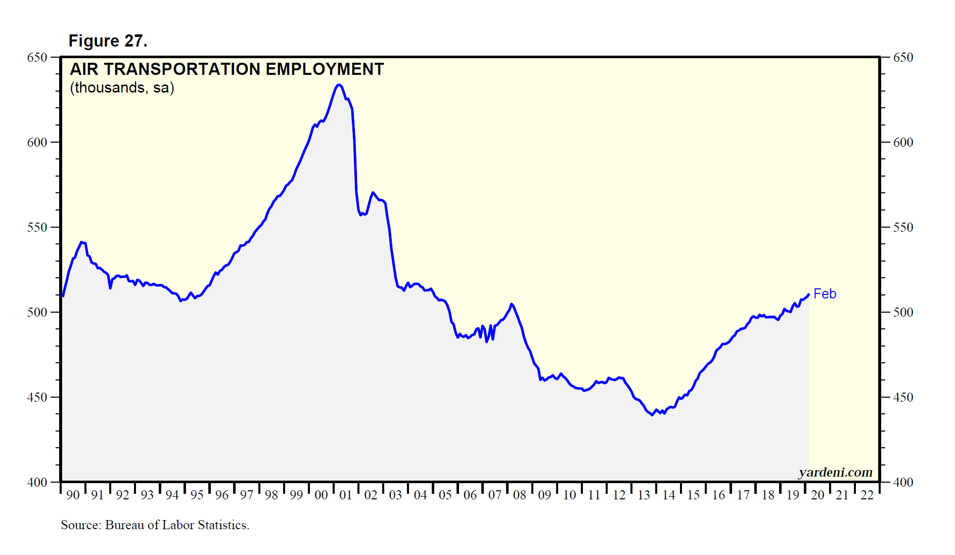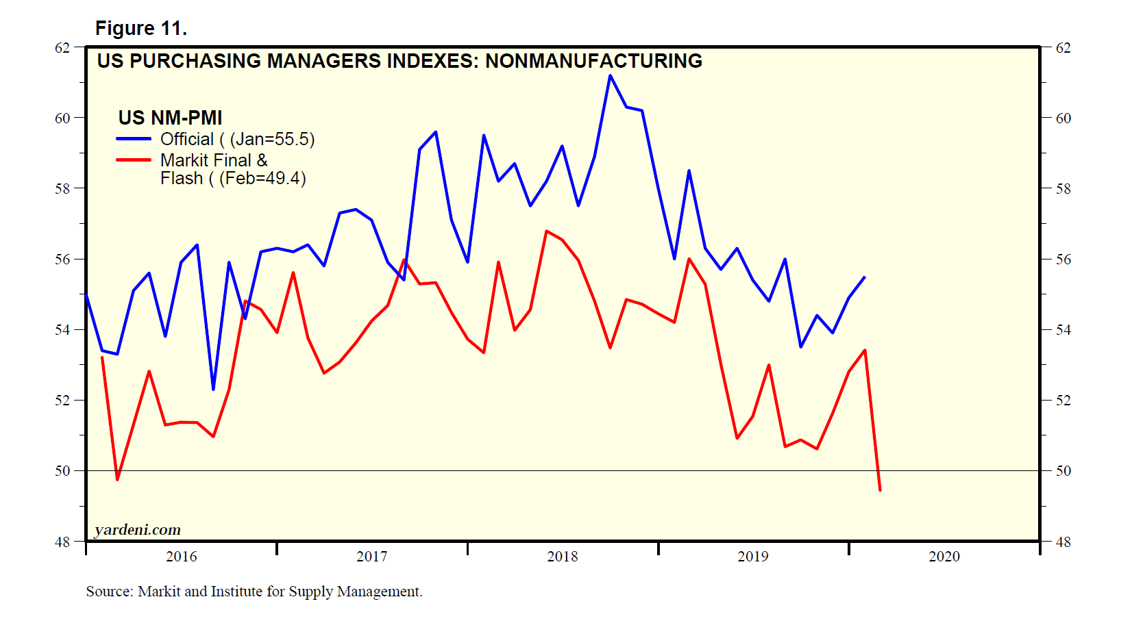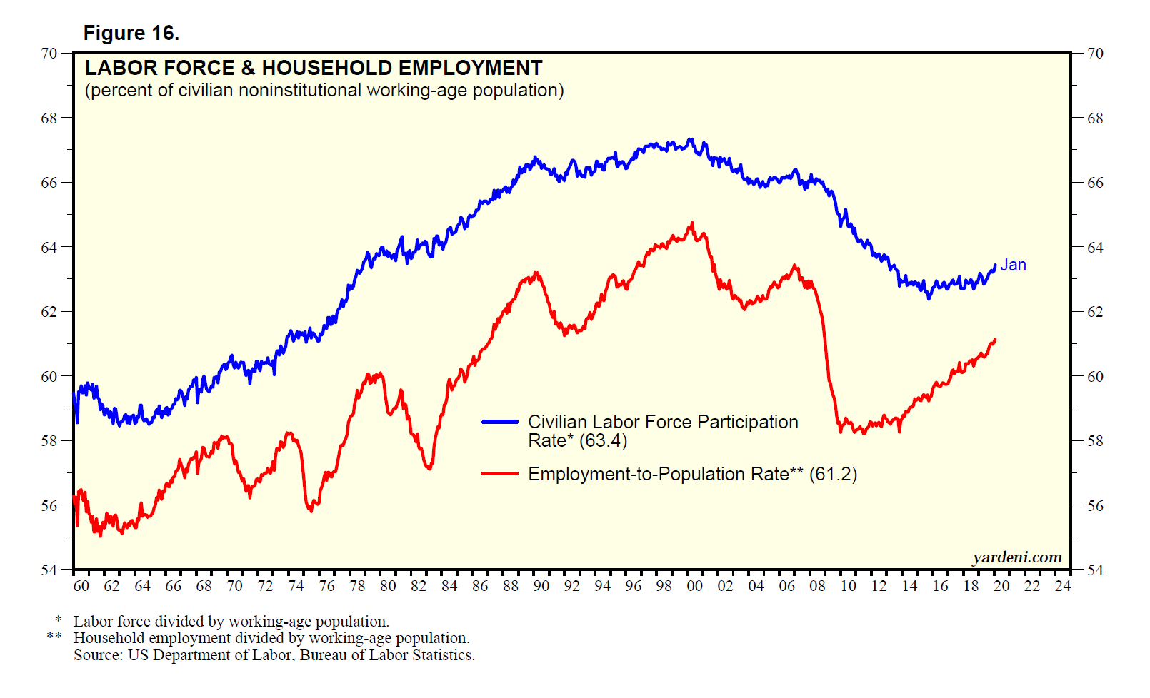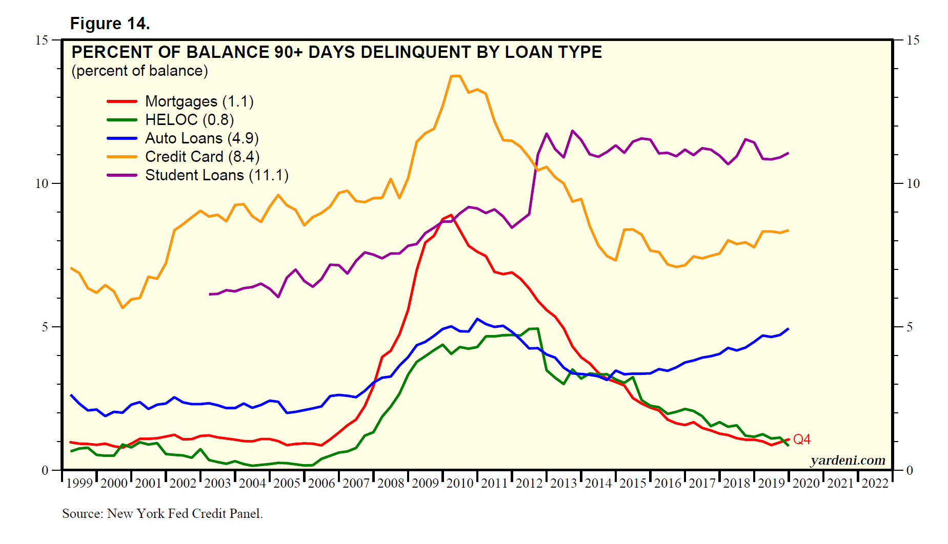 (6) Employment. The good news is that the labor market remains strong. The four-week average of initial unemployment claims did rise to 233,250 during the last week of 2019, but that remains near recent cyclical lows (Fig. 11). This series is highly correlated with the percentage of respondents in the consumer confidence survey who say that jobs are hard to get. Only 13.1% said so during December. Also in December, while the M-PMI employment index dropped to 45.1, the NM-PMI employment index remained high at 55.2 (Fig. 12). Manufacturing accounts for only 8% of payroll employment.
