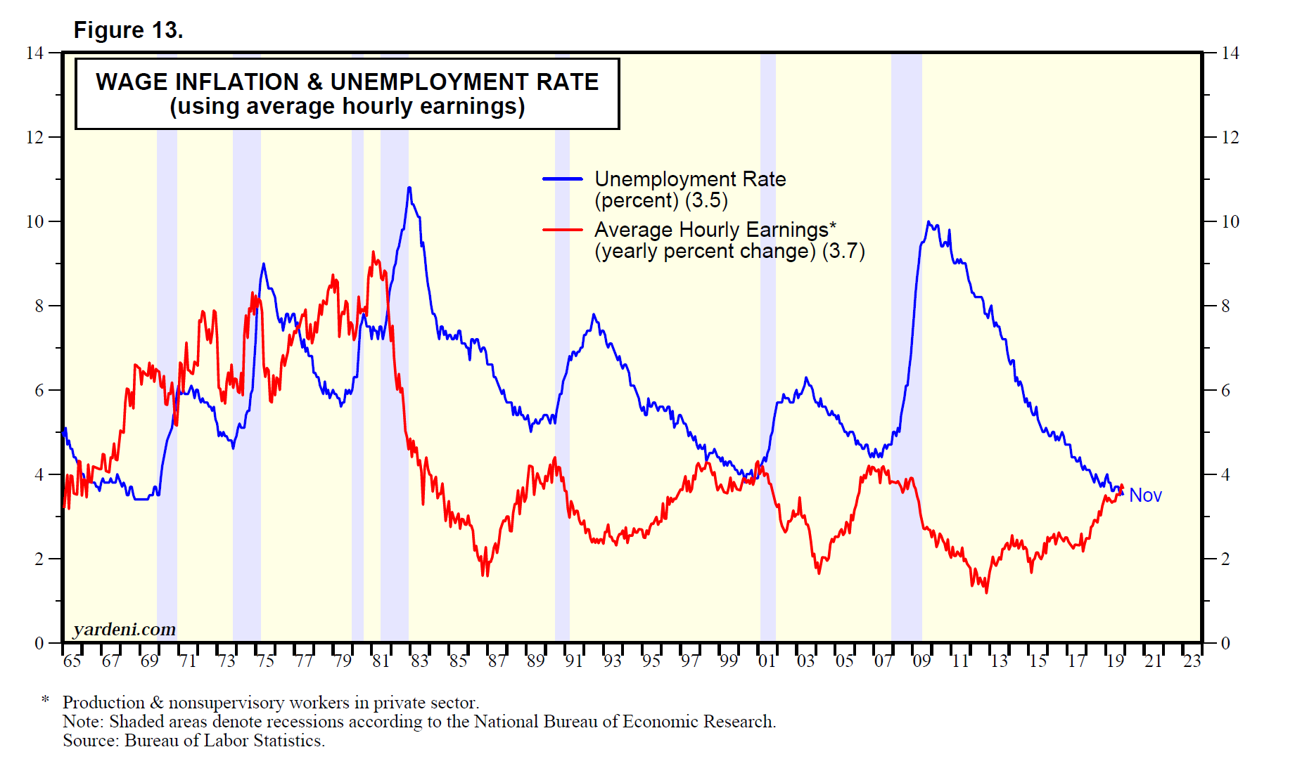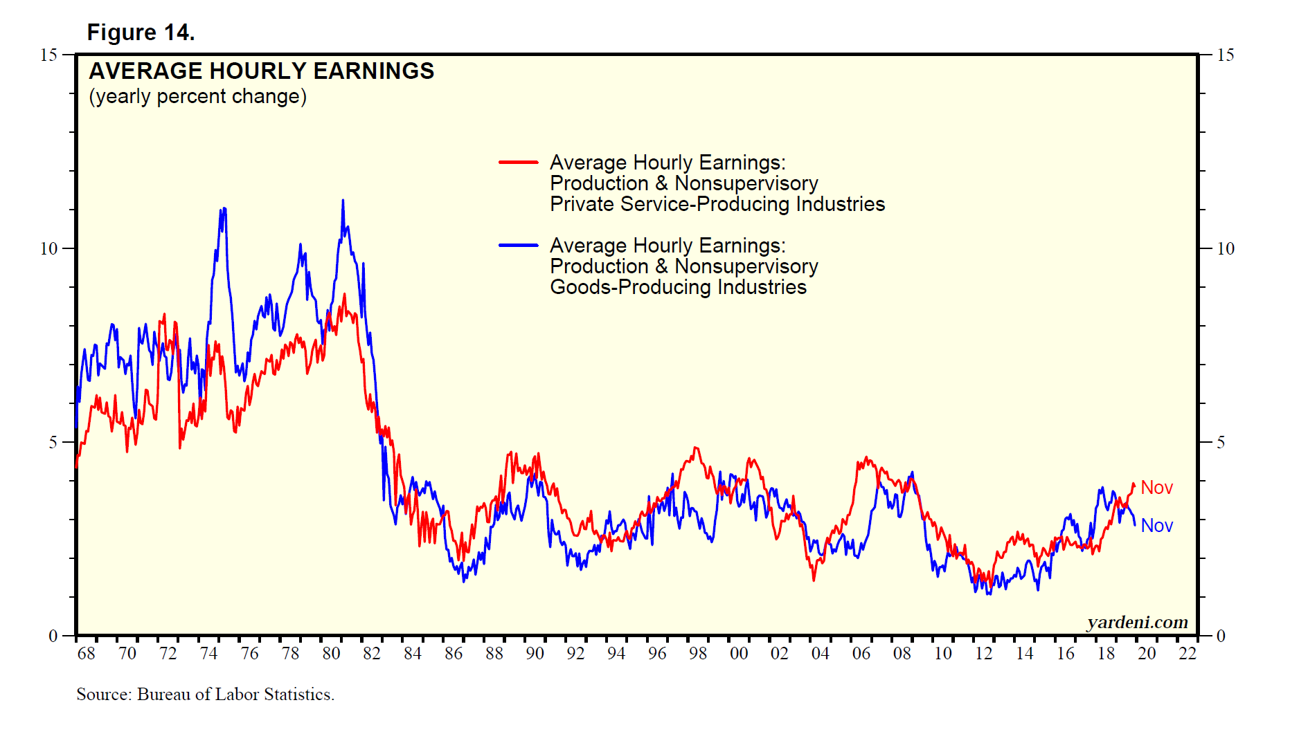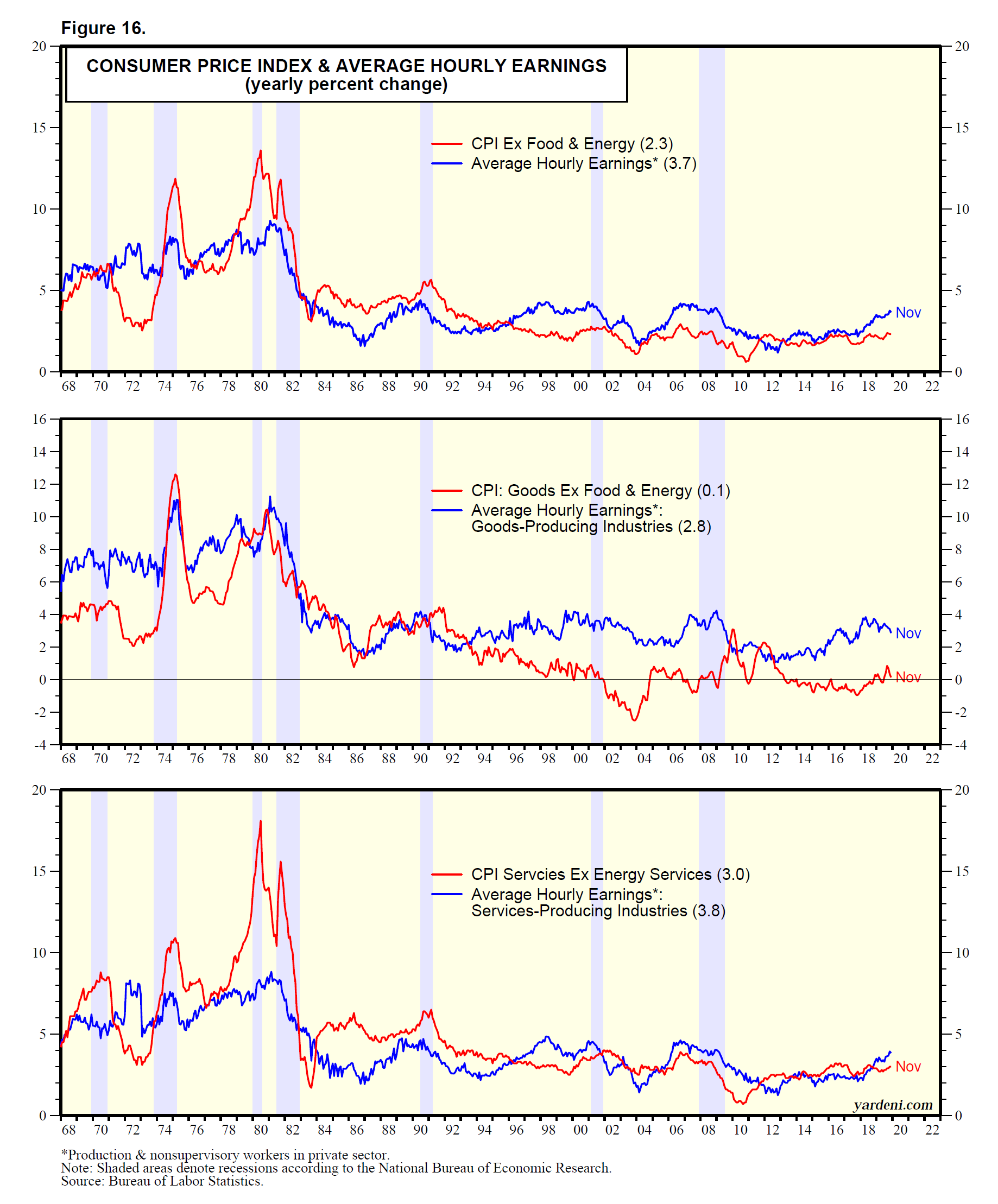 (1) Wage inflation. Average hourly earnings for production and nonsupervisory workers rose 3.7% y/y during November, little changed from October’s 3.8%, which was the highest pace since December 2008 (Fig. 13). It is up from the most recent cyclical low of 2.2% during October 2017, when the unemployment rate was 4.1%. The unemployment rate was down to 3.5% last November, and has been at or below 4.0% since April 2018. Interestingly, the big jump in wage inflation has occurred in services rather than in goods industries (Fig. 14). Since the jobless rate fell below 4.0%, the former is up from 2.5% to 3.8% while the latter is down from 3.8% to 2.8%.