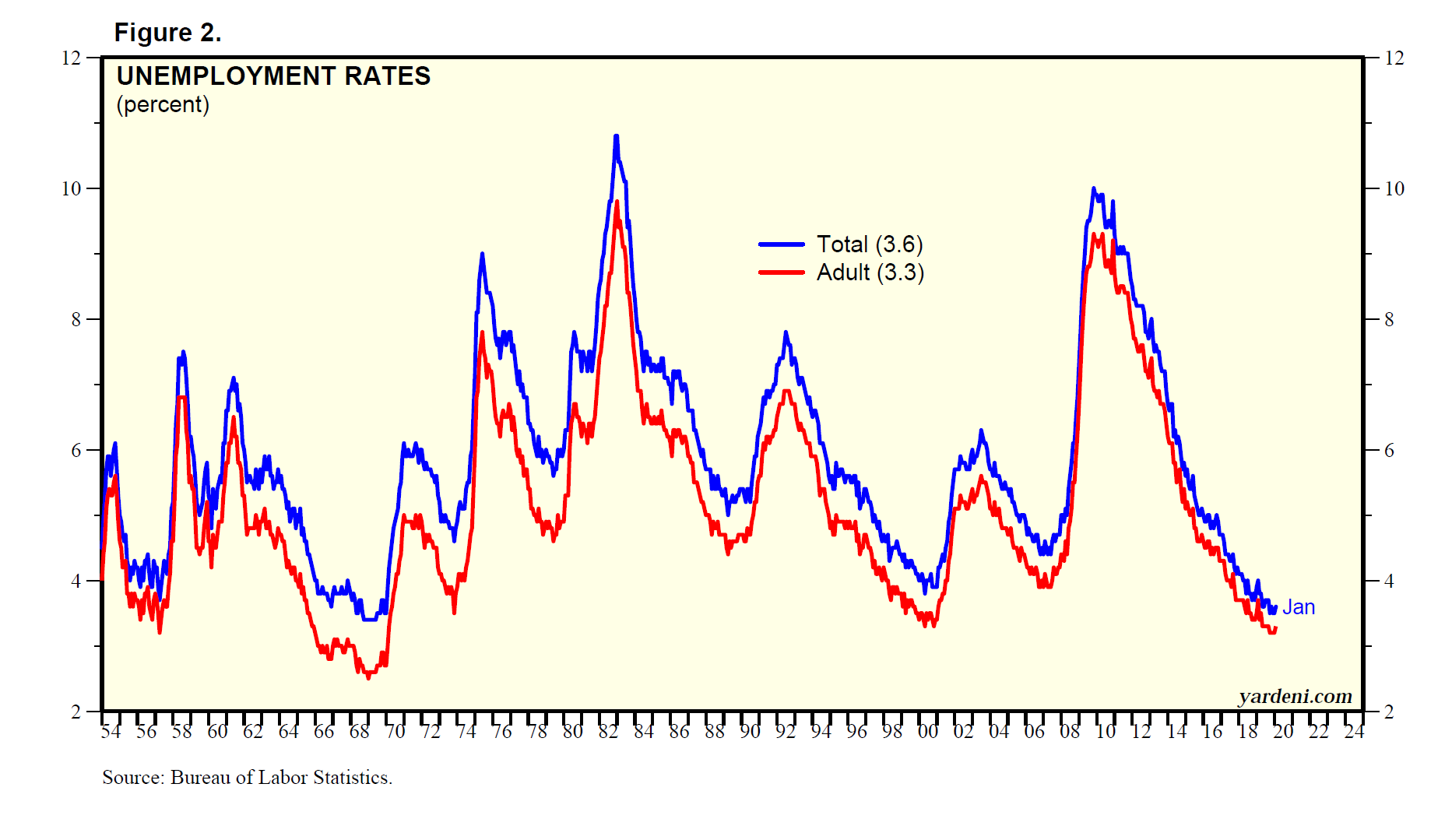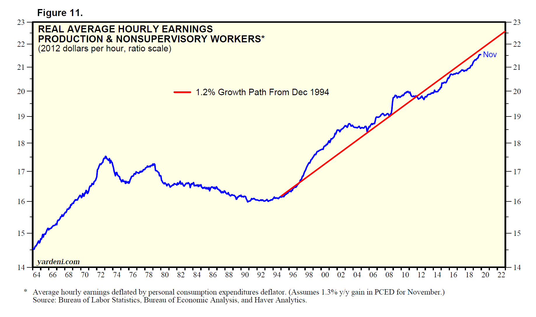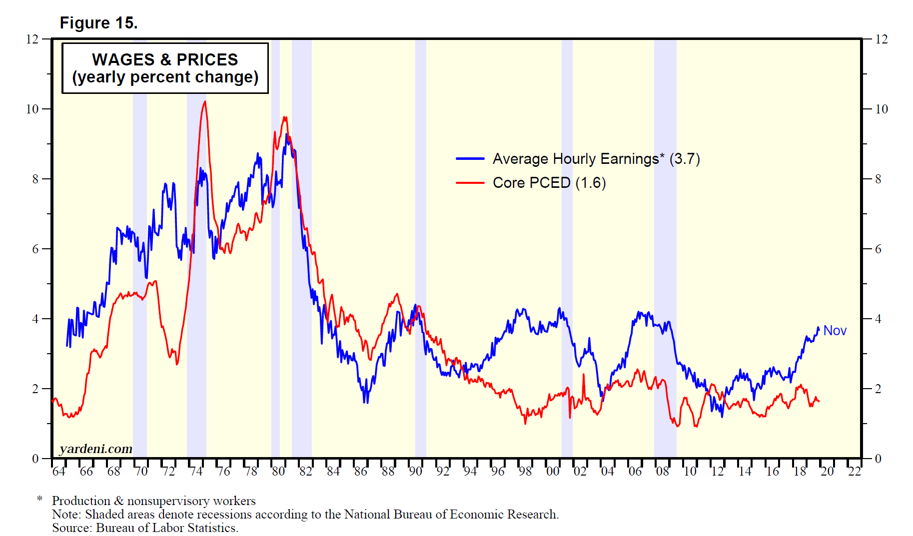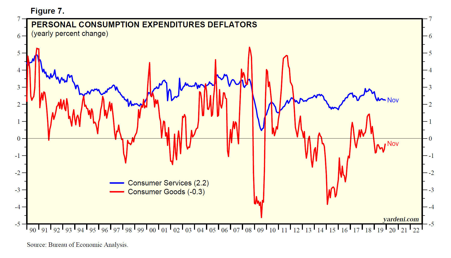 (1) Wage inflation. Average hourly earnings for production and nonsupervisory workers rose 3.7% y/y during November, little changed from October’s 3.8%, which was the highest pace since December 2008 (Fig. 13). It is up from the most recent cyclical low of 2.2% during October 2017, when the unemployment rate was 4.1%. The unemployment rate was down to 3.5% last November, and has been at or below 4.0% since April 2018. Interestingly, the big jump in wage inflation has occurred in services rather than in goods industries (Fig. 14). Since the jobless rate fell below 4.0%, the former is up from 2.5% to 3.8% while the latter is down from 3.8% to 2.8%.