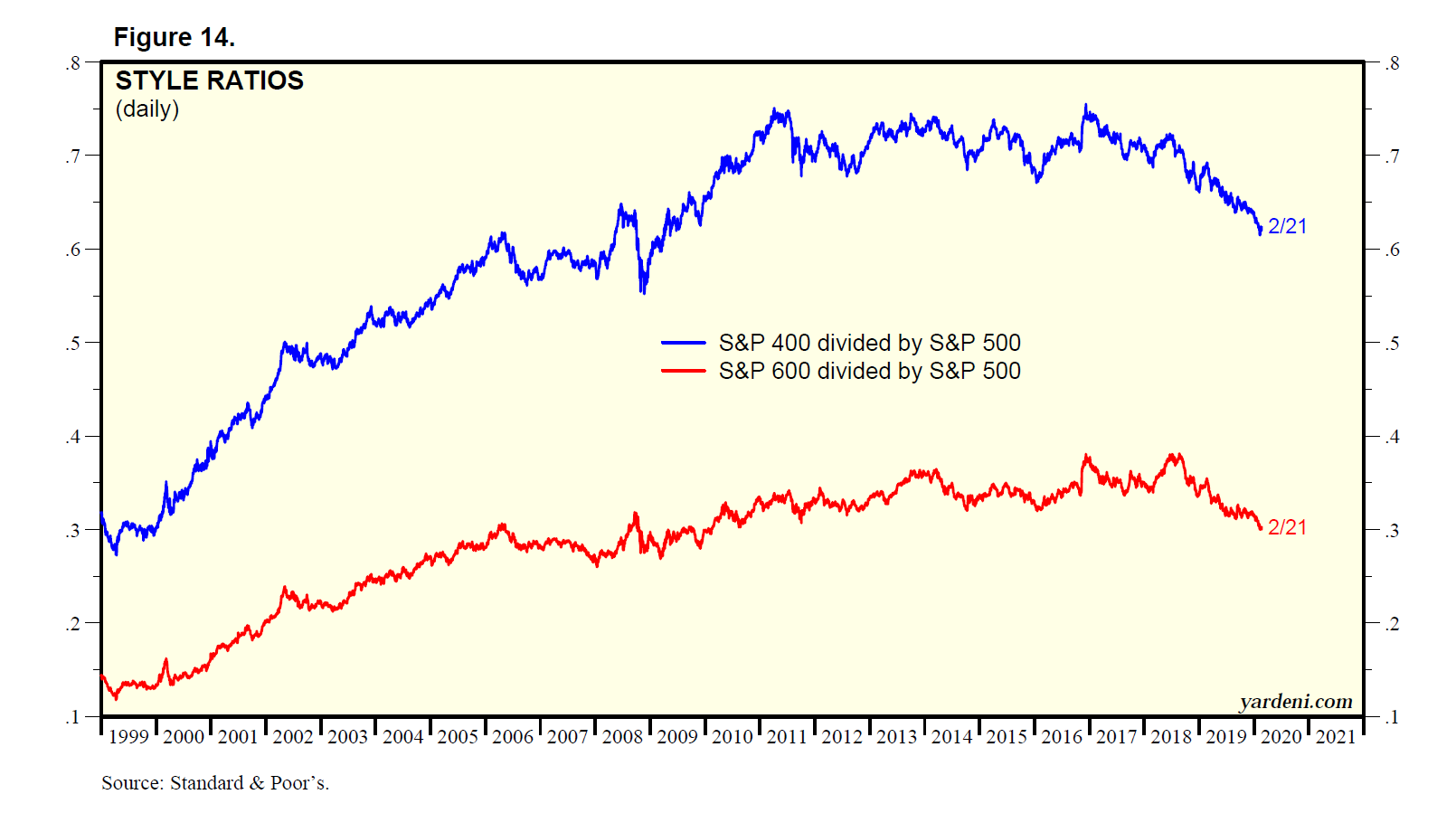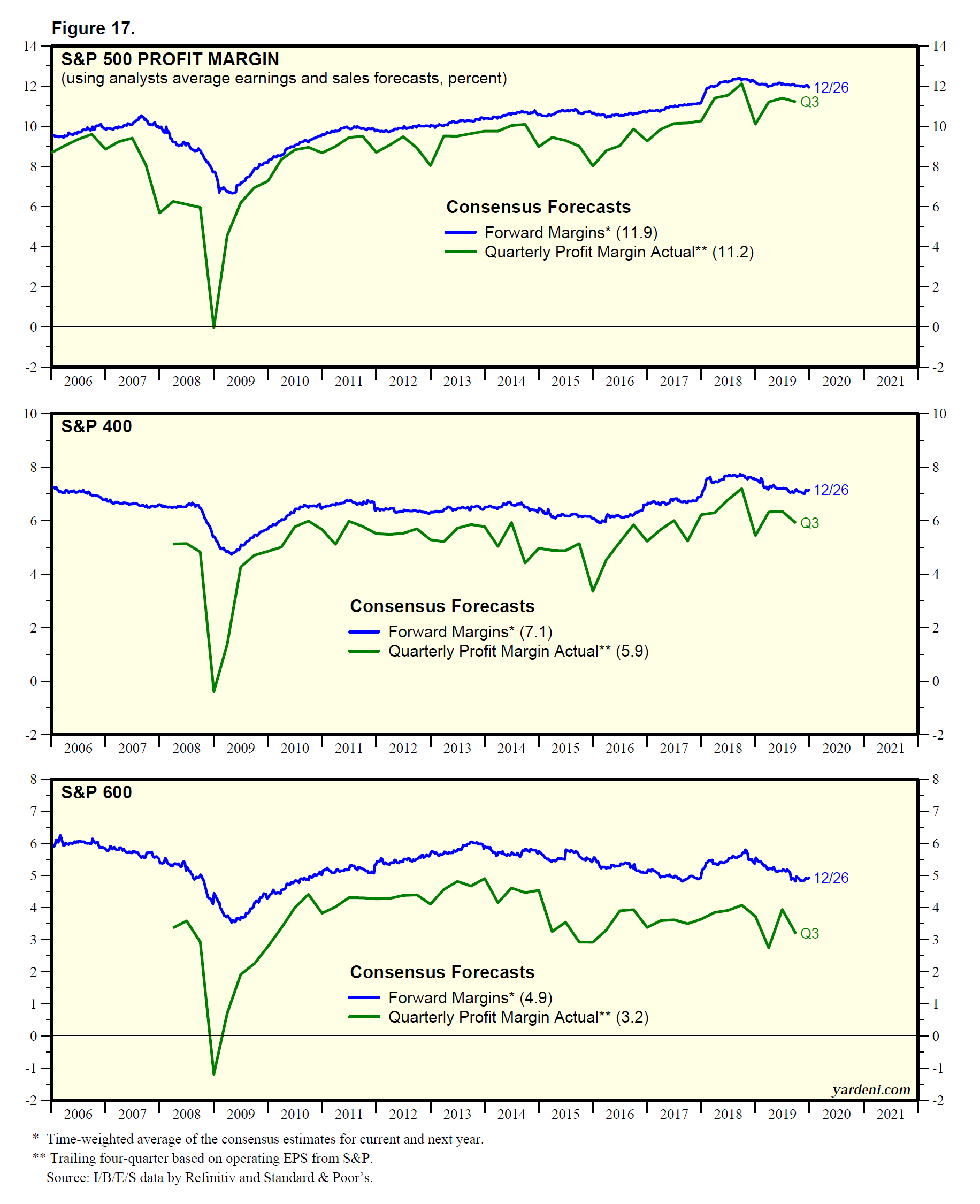 Our bet is that competitive pressures will make it hard for most industries to pass wage pressures through to prices. That could be bad news for profit margins. However, we expect that companies will use technology to boost their productivity all they can in the interest of maintaining their margins. The weekly data on forward profit margins show that the S&P 500 LargeCaps did that more successfully last year than did the S&P 400/600 SMidCaps (Fig.17).