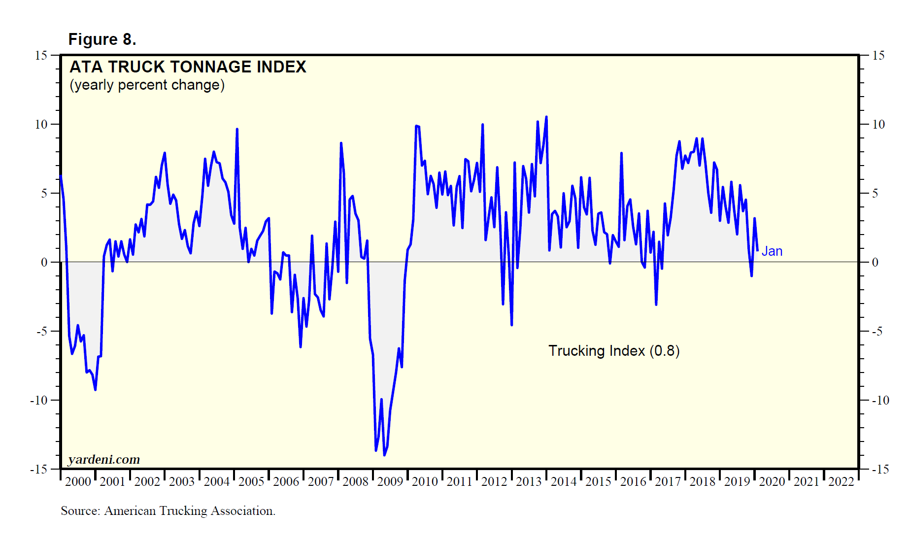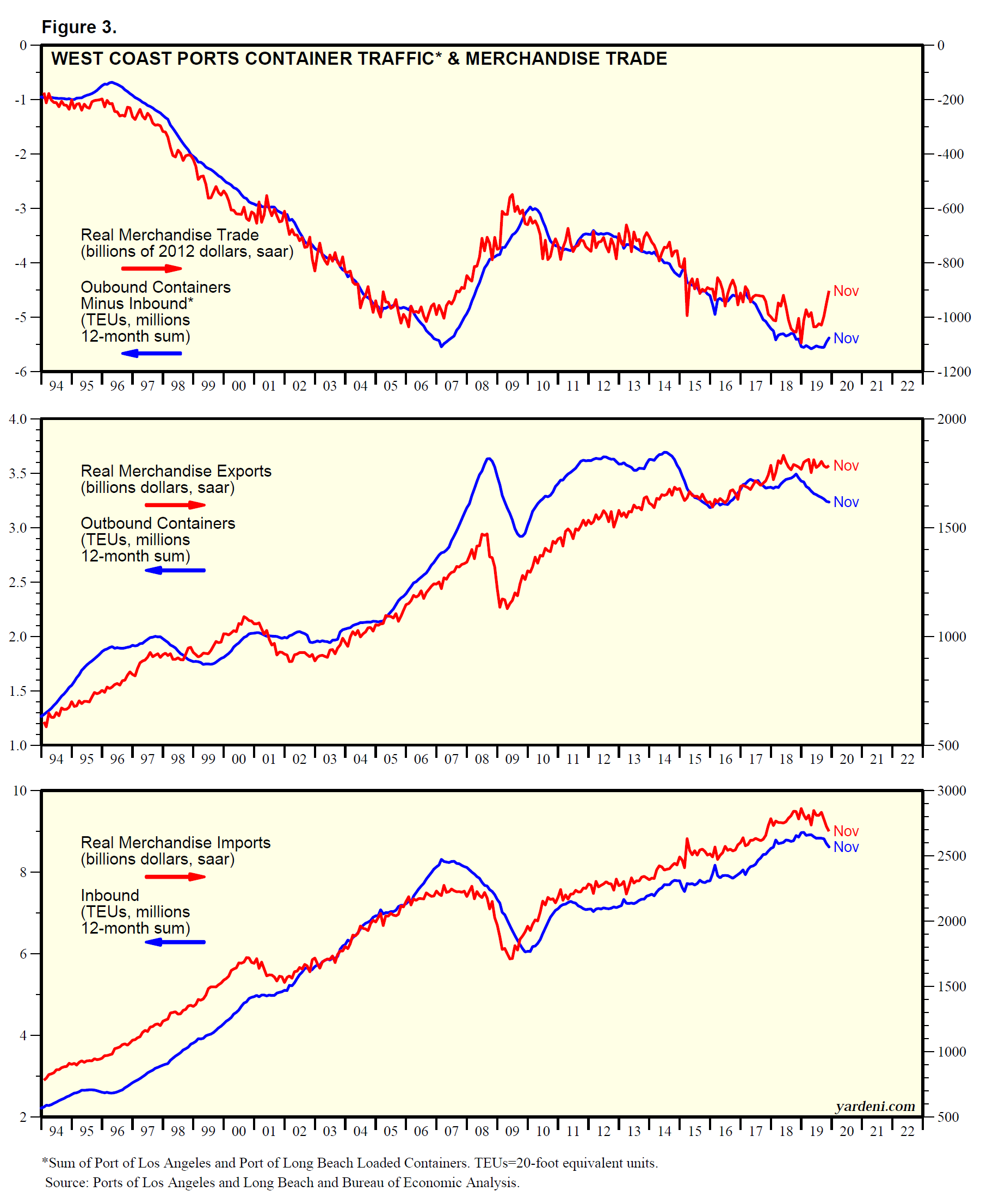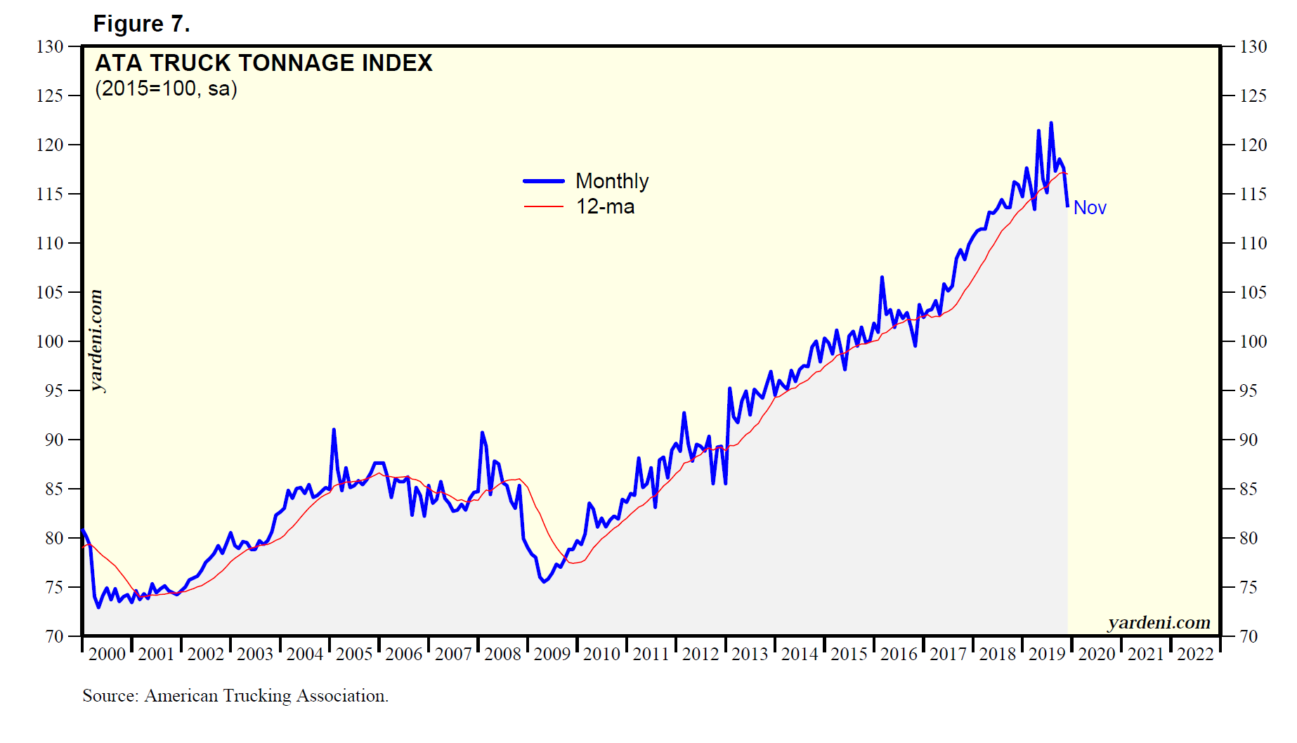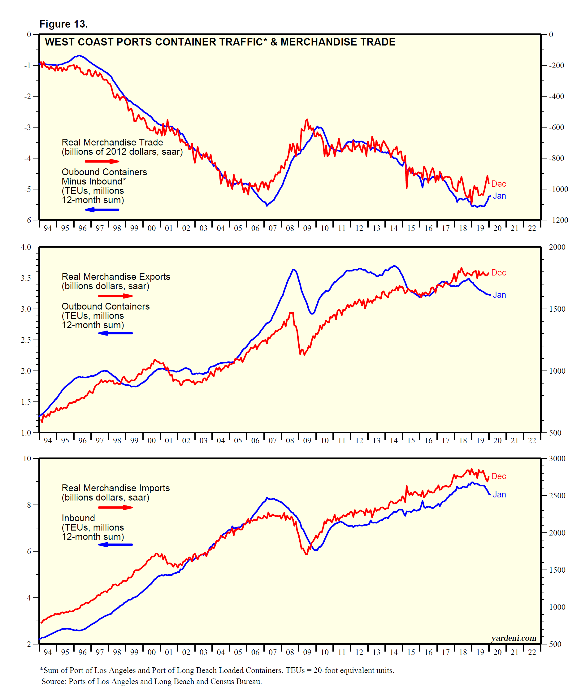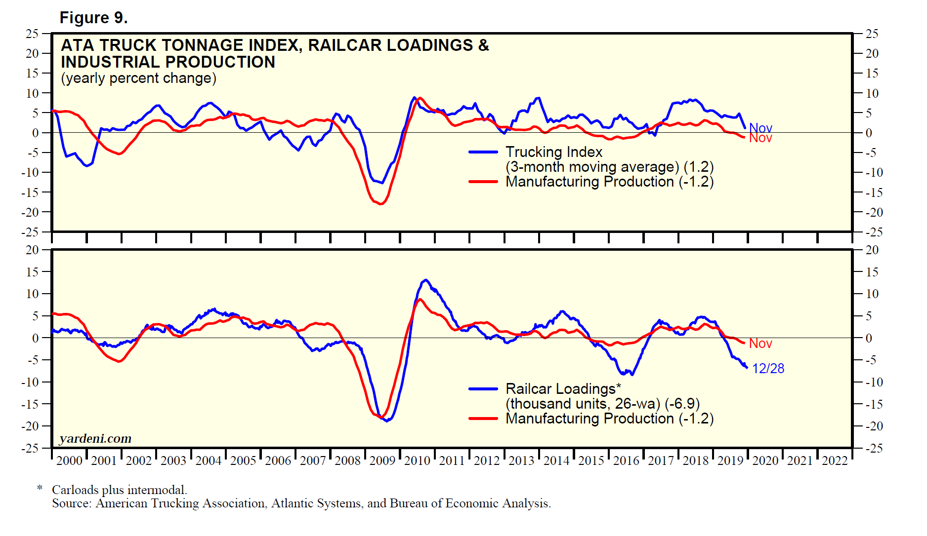 Not surprisingly, there is a good correlation between the y/y growth rate in manufacturing production and the comparable growth rates in both the trucking index and railcar loadings (Fig. 9). The former was down 1.2% during November, while the trucking index (using the three-month average of the series) was up only 1.2% and railcar loadings were down 6.9% during the final week of 2019, based on the 26-week average.
