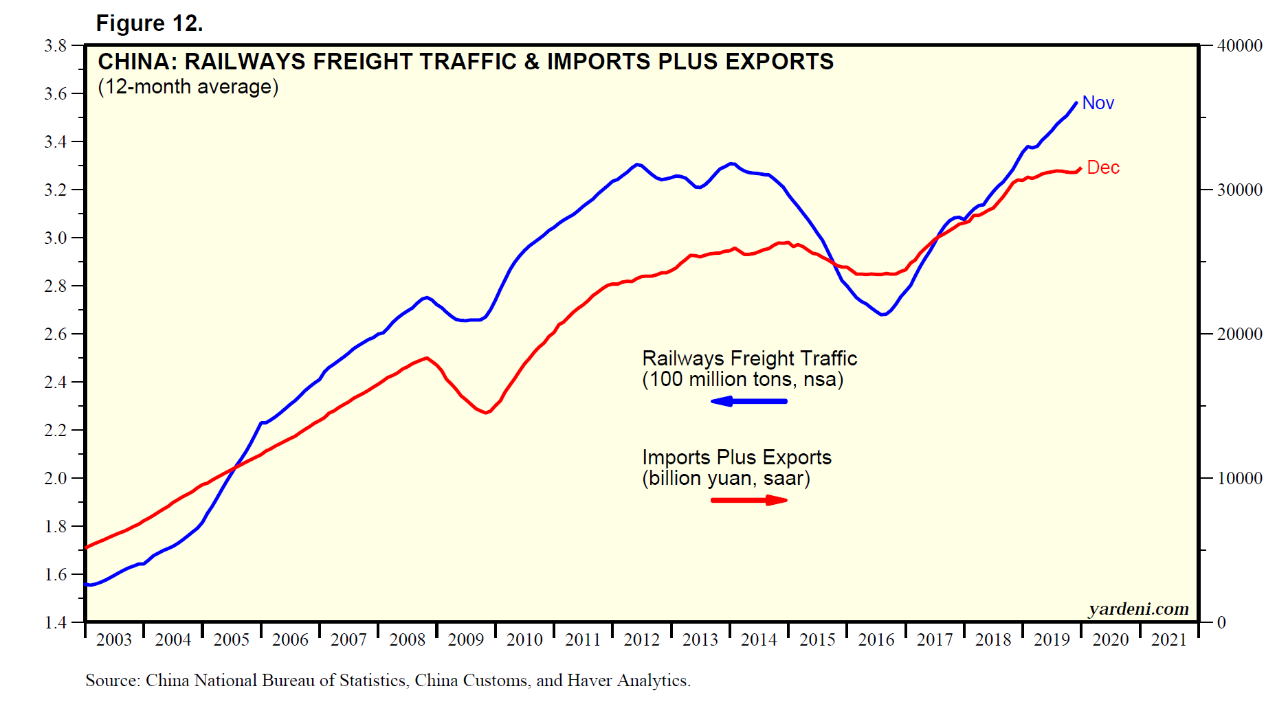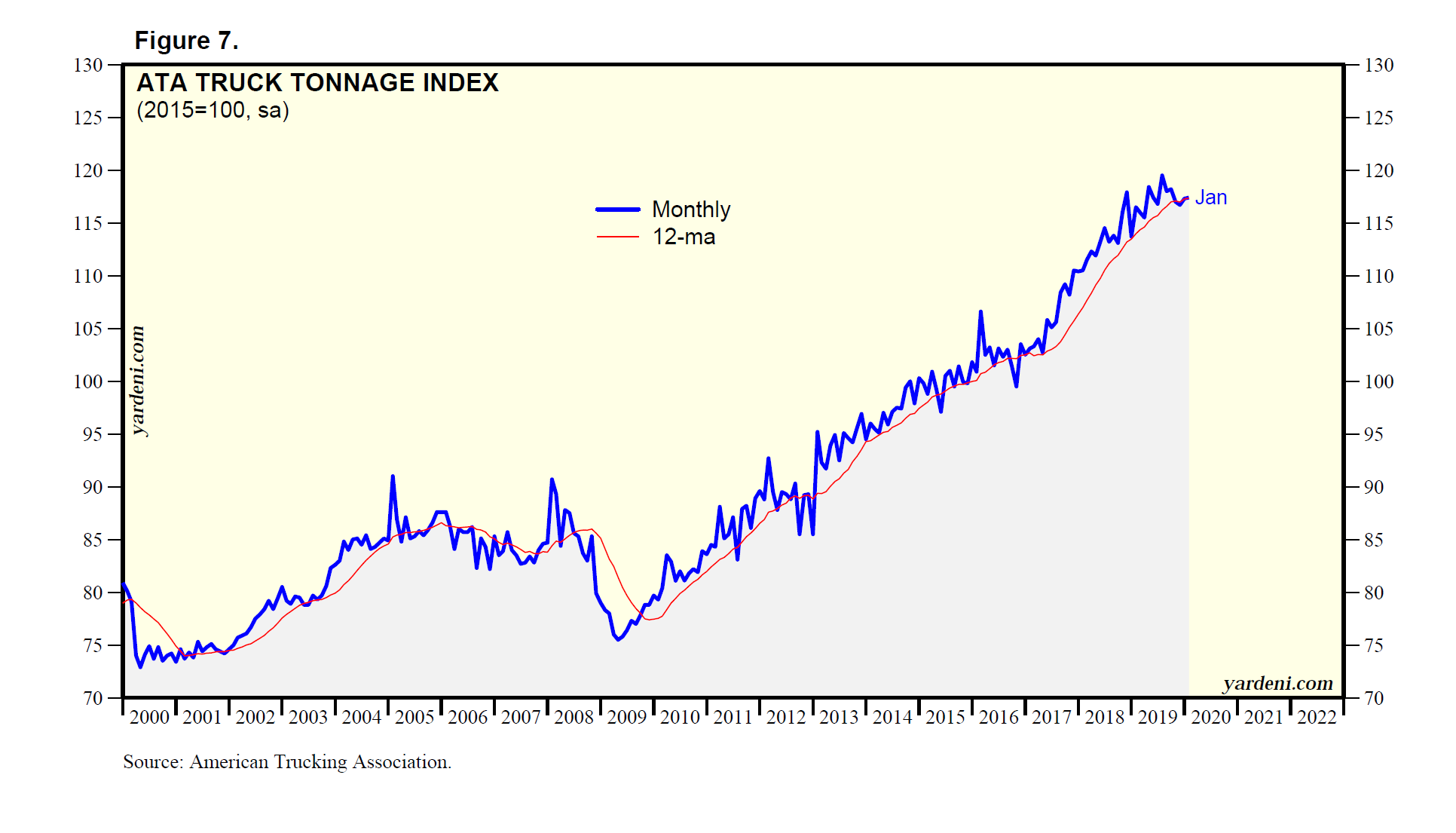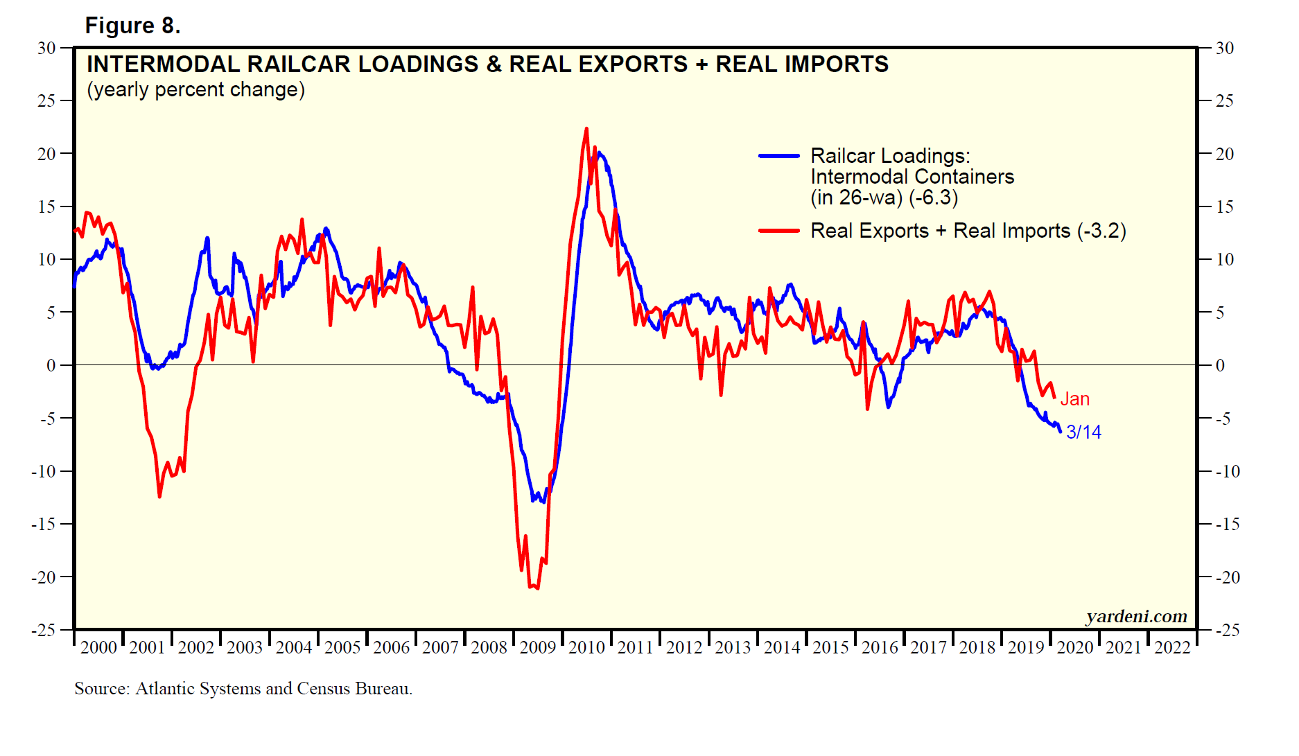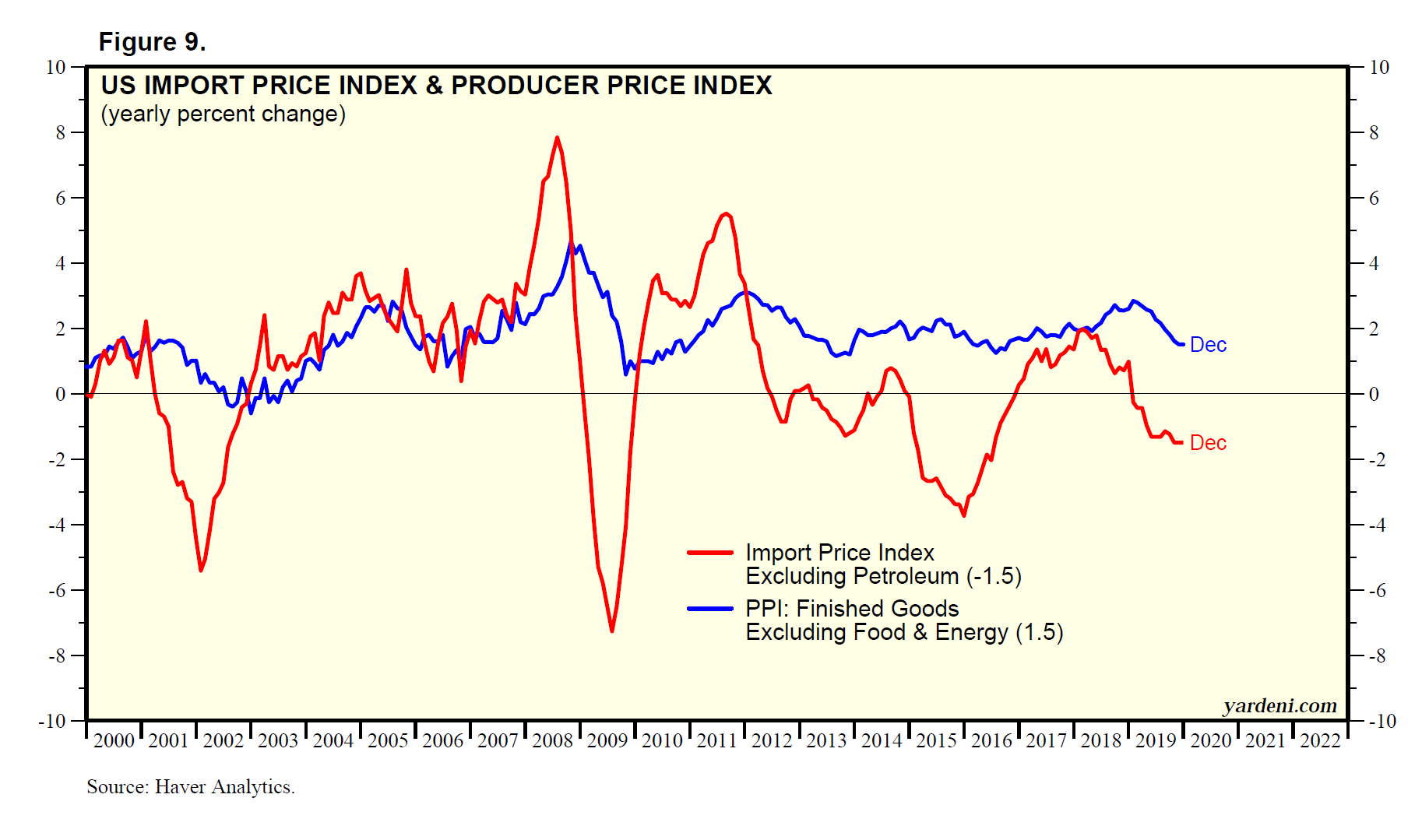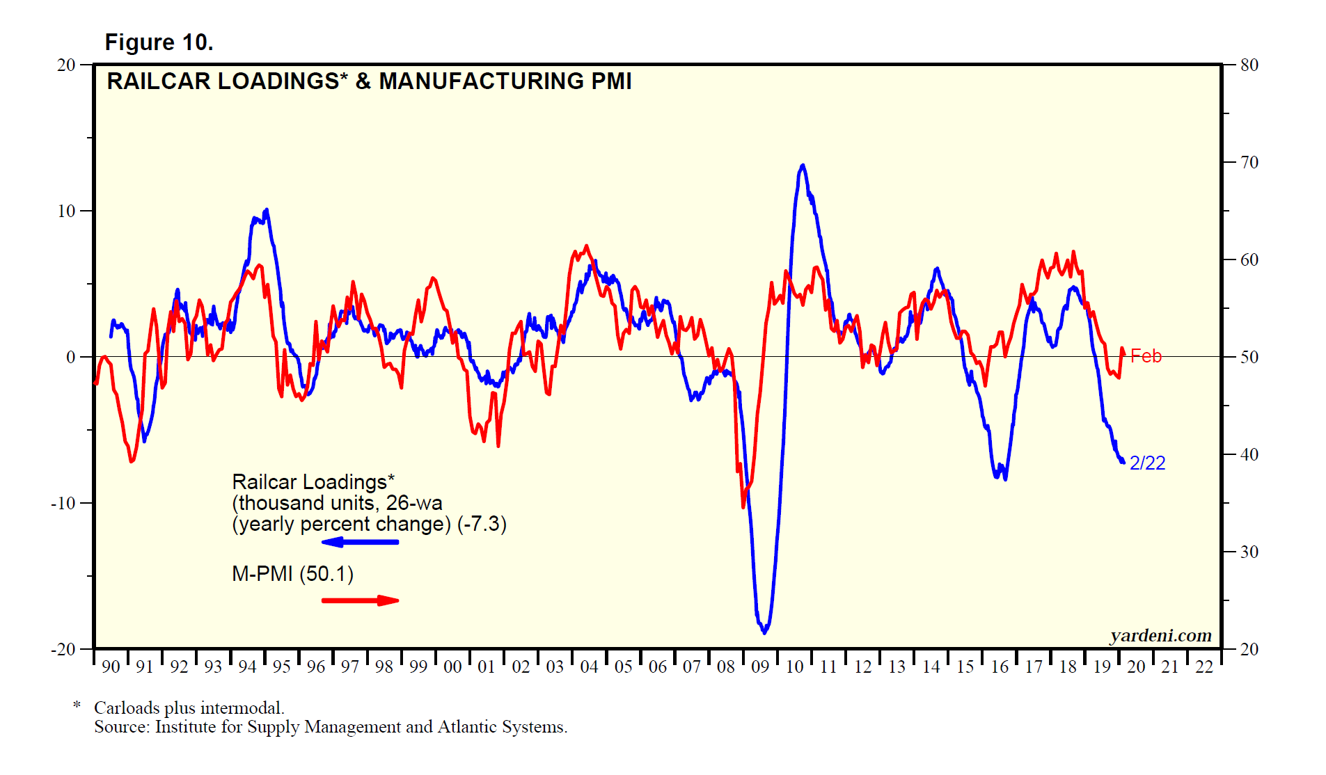 Not surprisingly, there is a good correlation between the y/y growth rate in manufacturing production and the comparable growth rates in both the trucking index and railcar loadings (Fig. 9). The former was down 1.2% during November, while the trucking index (using the three-month average of the series) was up only 1.2% and railcar loadings were down 6.9% during the final week of 2019, based on the 26-week average.