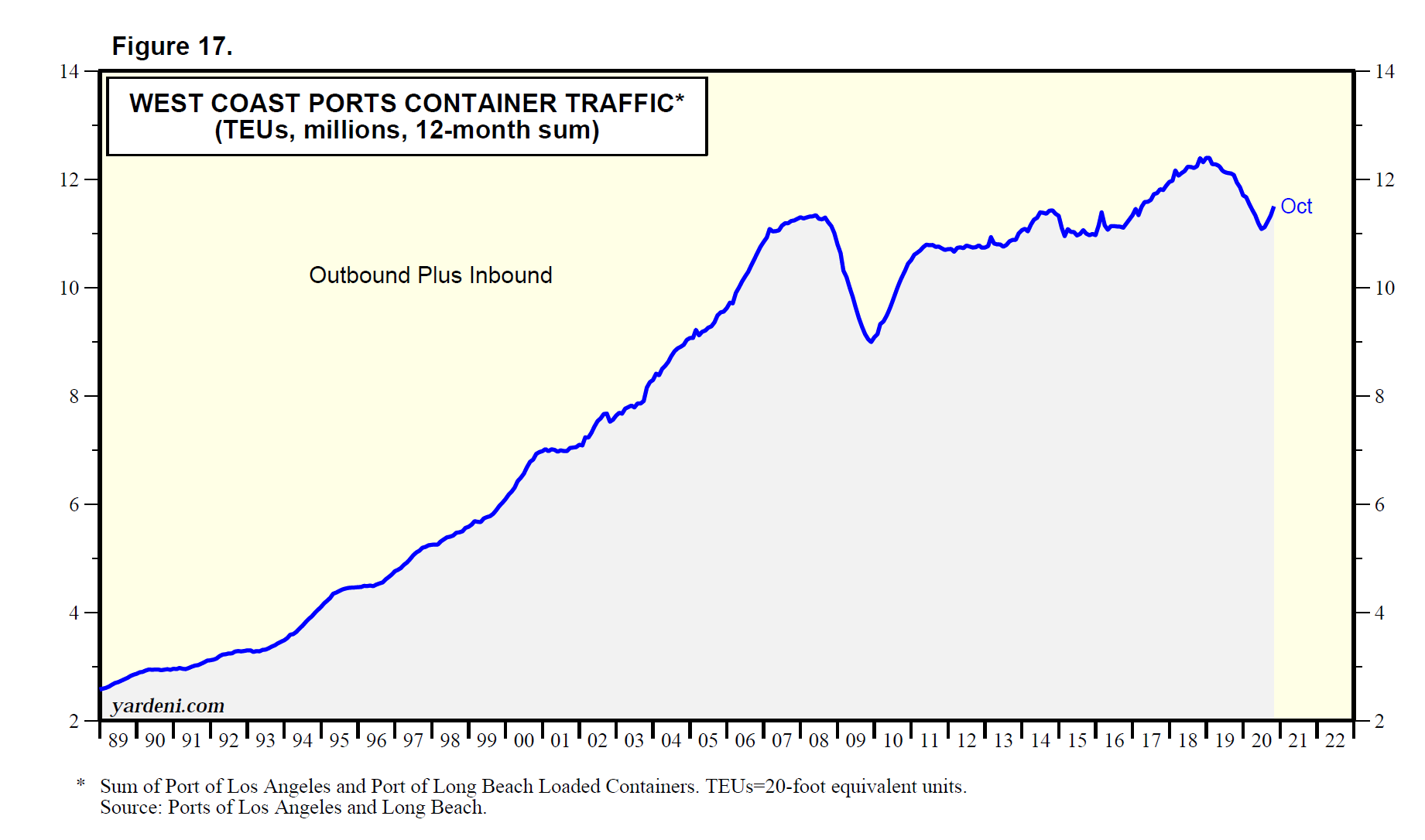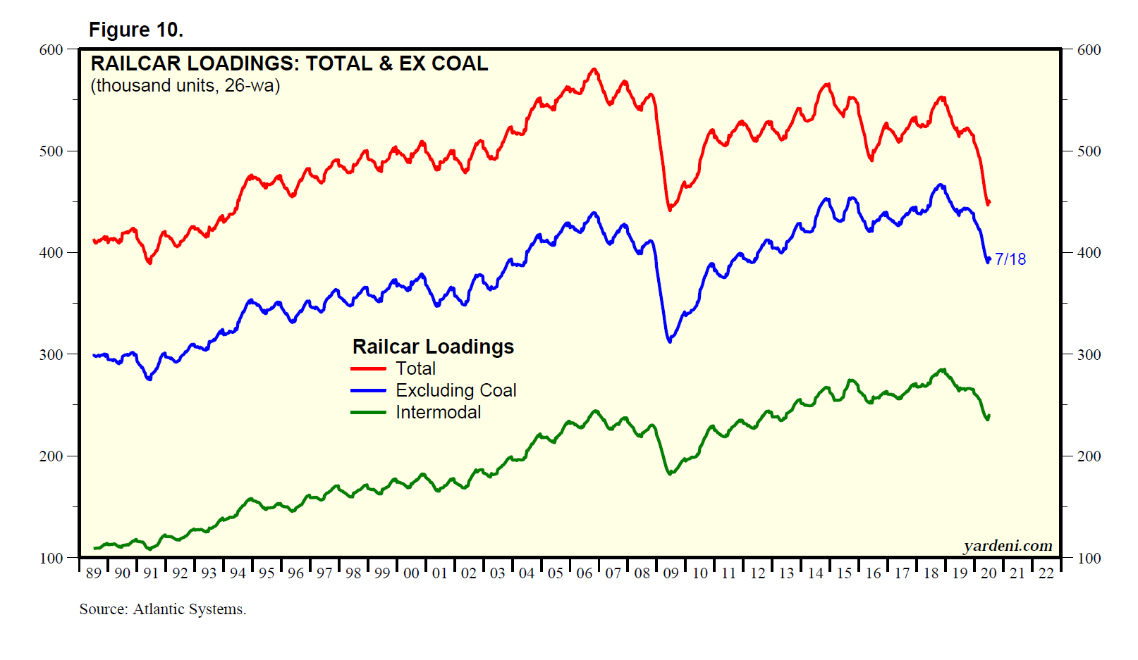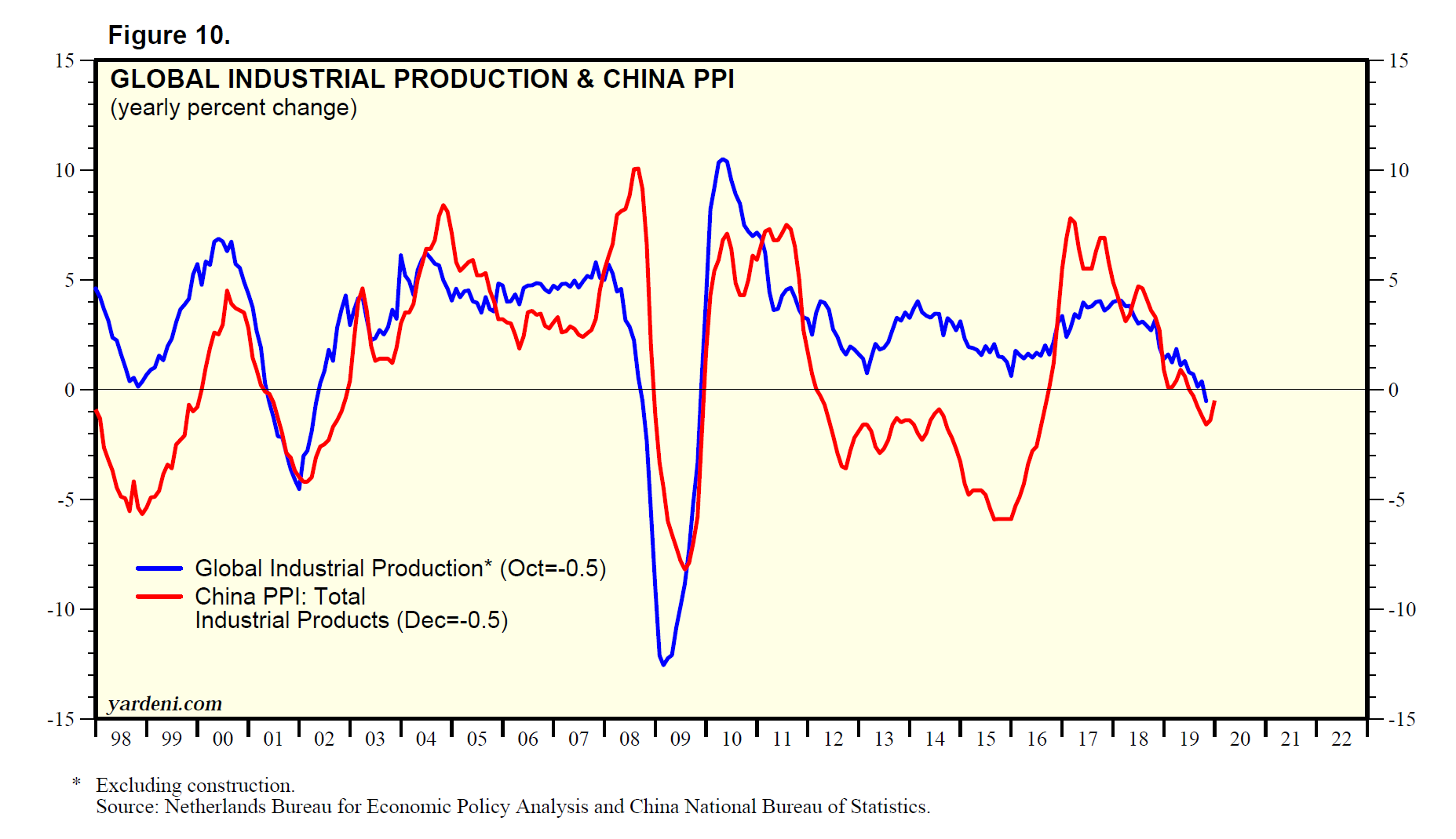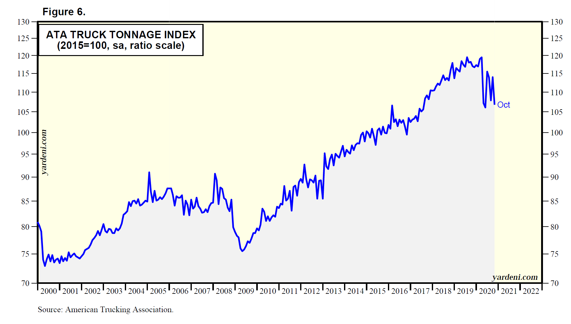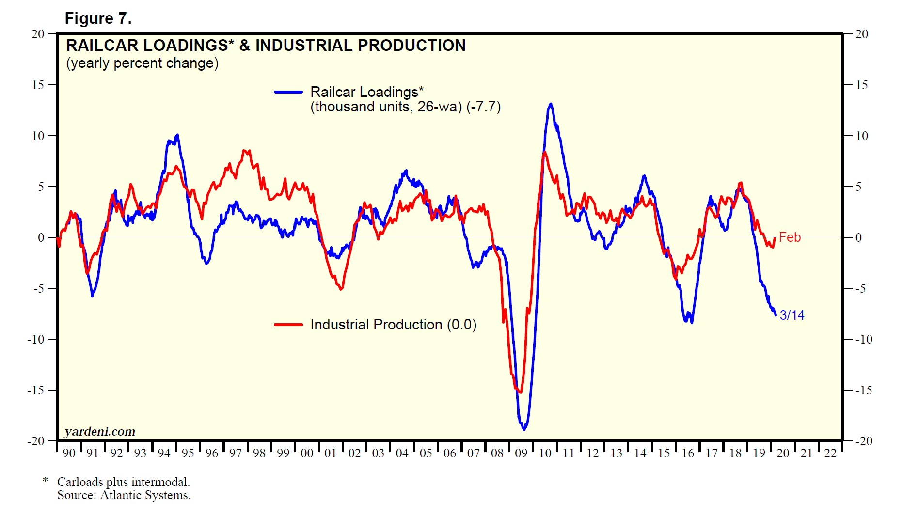 Not surprisingly, there is a good correlation between the y/y growth rate in manufacturing production and the comparable growth rates in both the trucking index and railcar loadings (Fig. 9). The former was down 1.2% during November, while the trucking index (using the three-month average of the series) was up only 1.2% and railcar loadings were down 6.9% during the final week of 2019, based on the 26-week average.