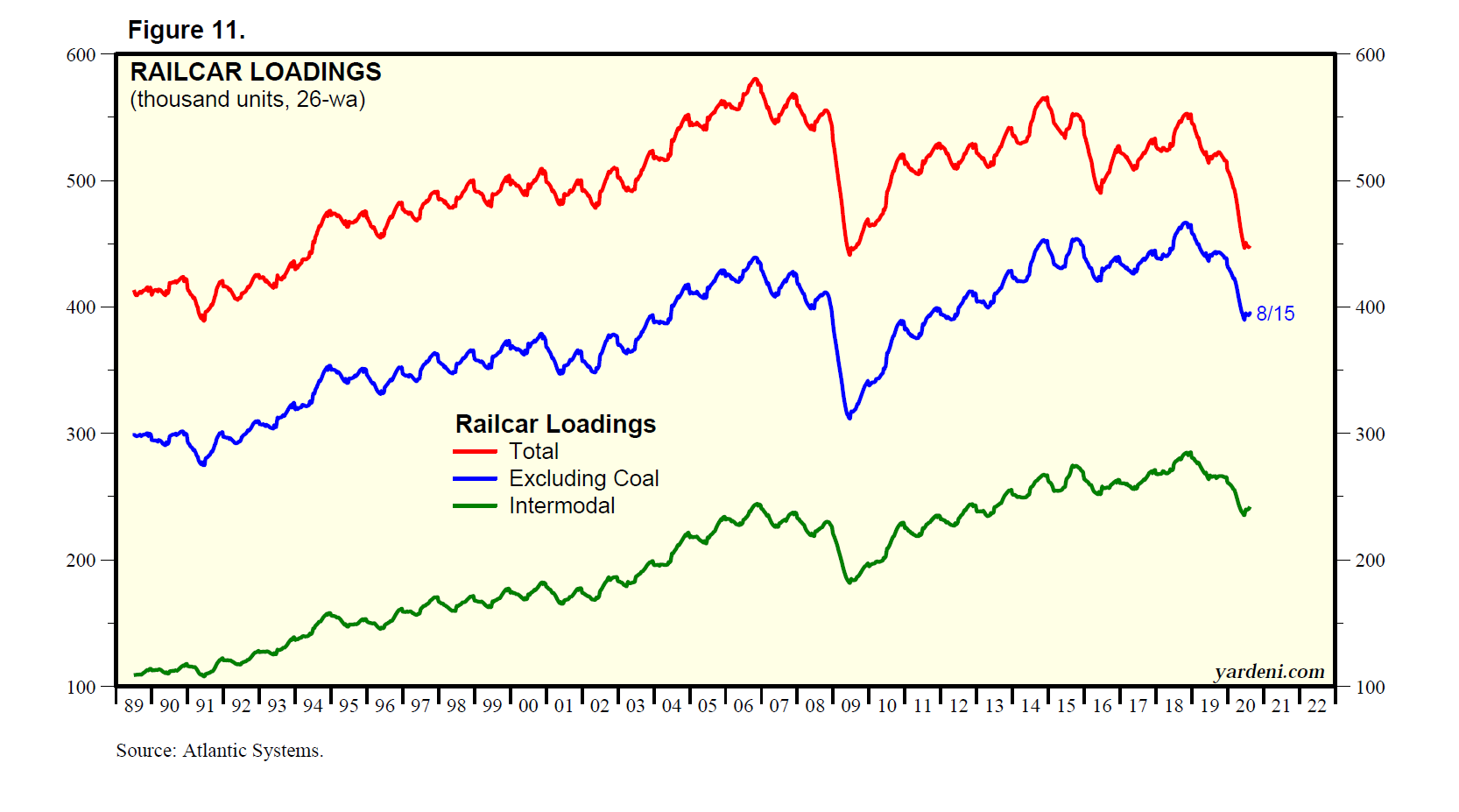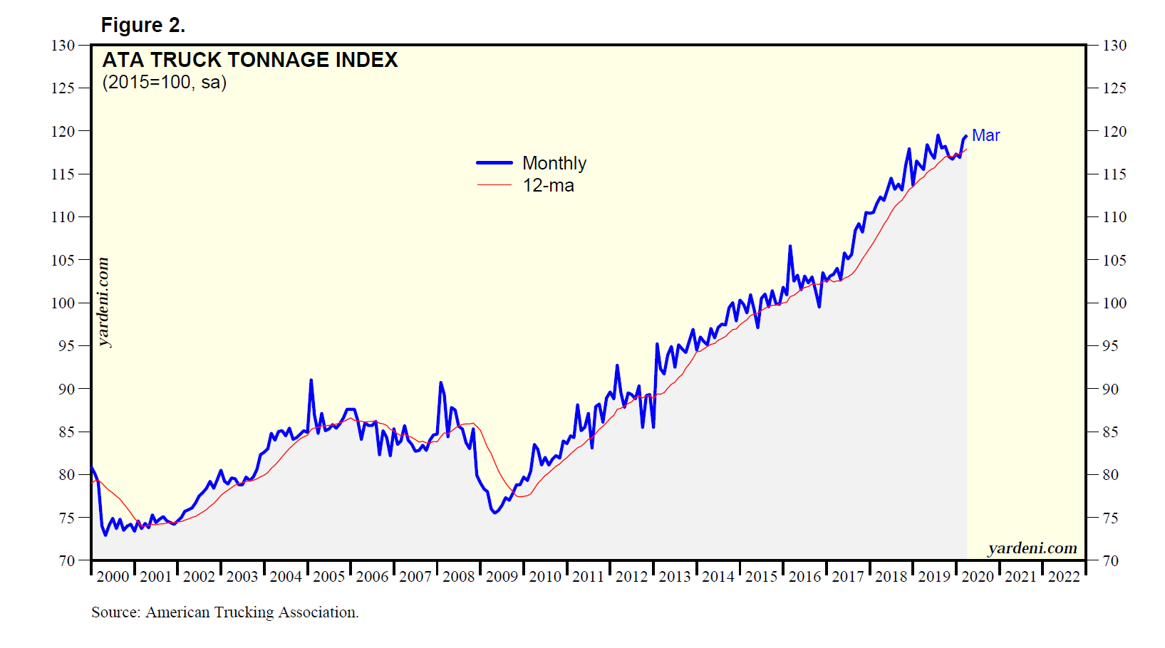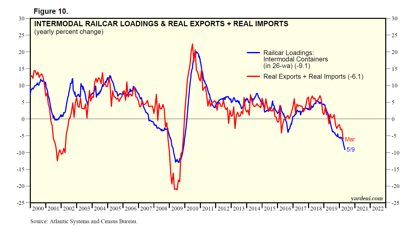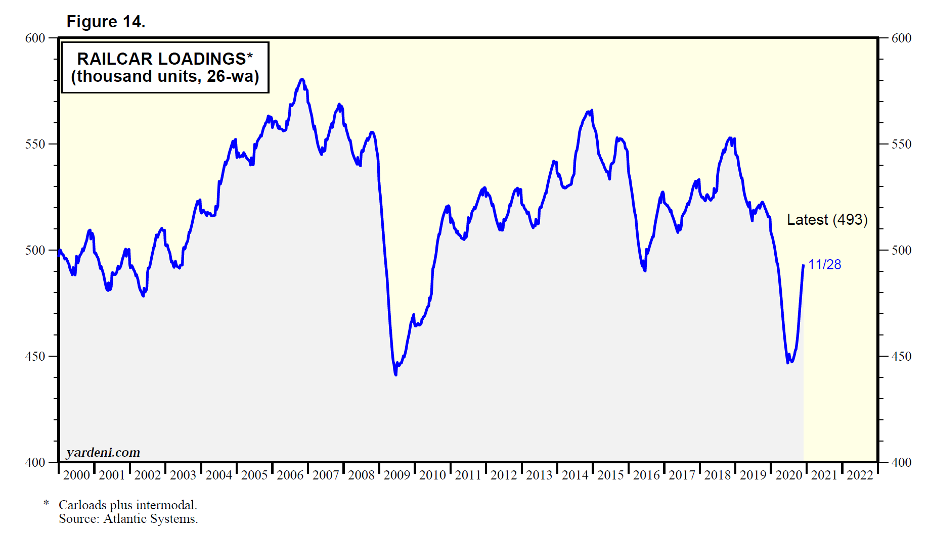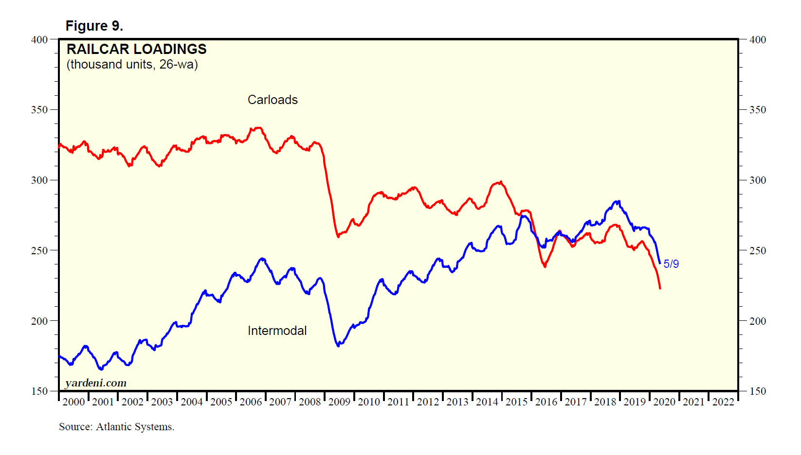 Not surprisingly, there is a good correlation between the y/y growth rate in manufacturing production and the comparable growth rates in both the trucking index and railcar loadings (Fig. 9). The former was down 1.2% during November, while the trucking index (using the three-month average of the series) was up only 1.2% and railcar loadings were down 6.9% during the final week of 2019, based on the 26-week average.