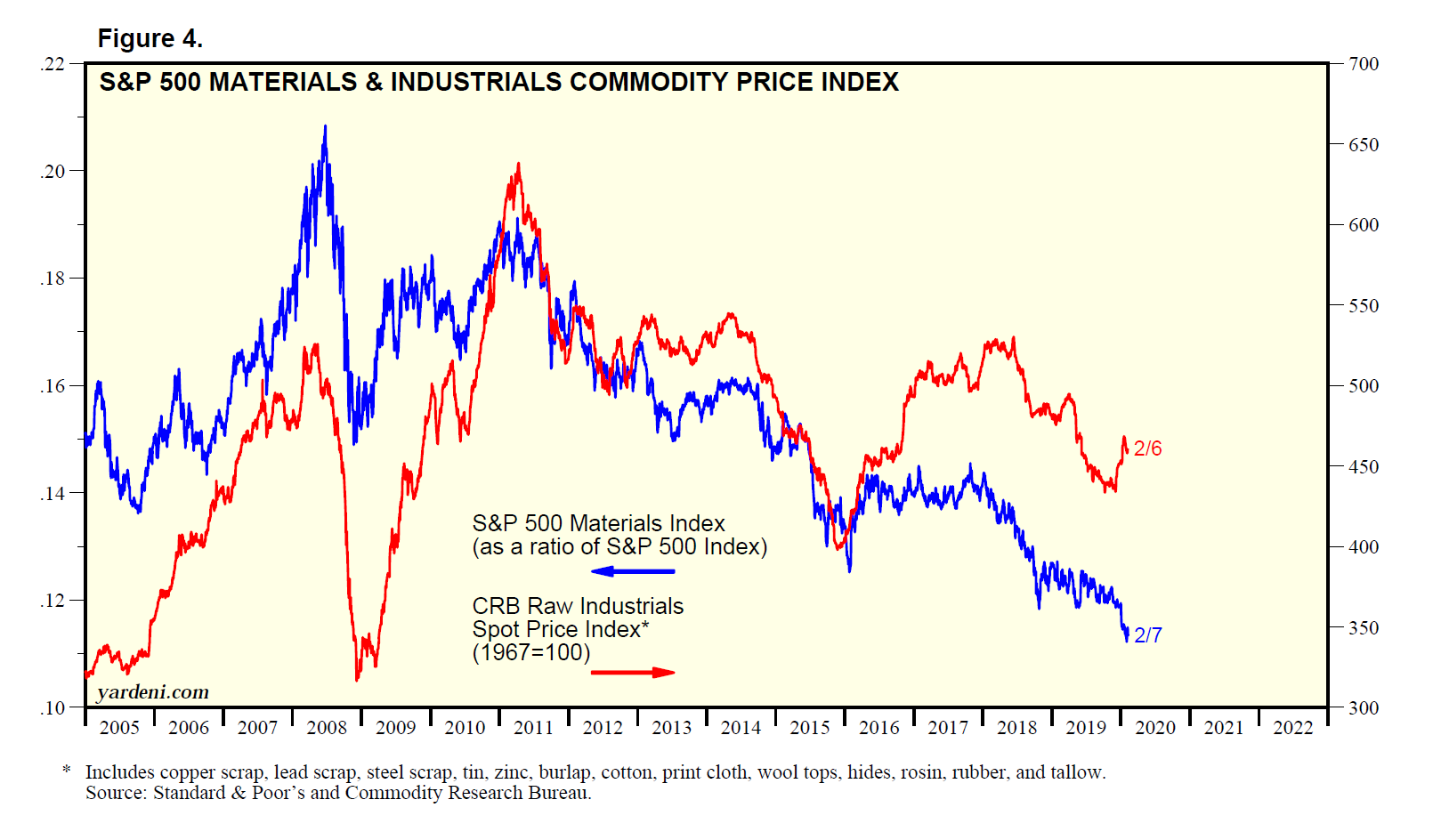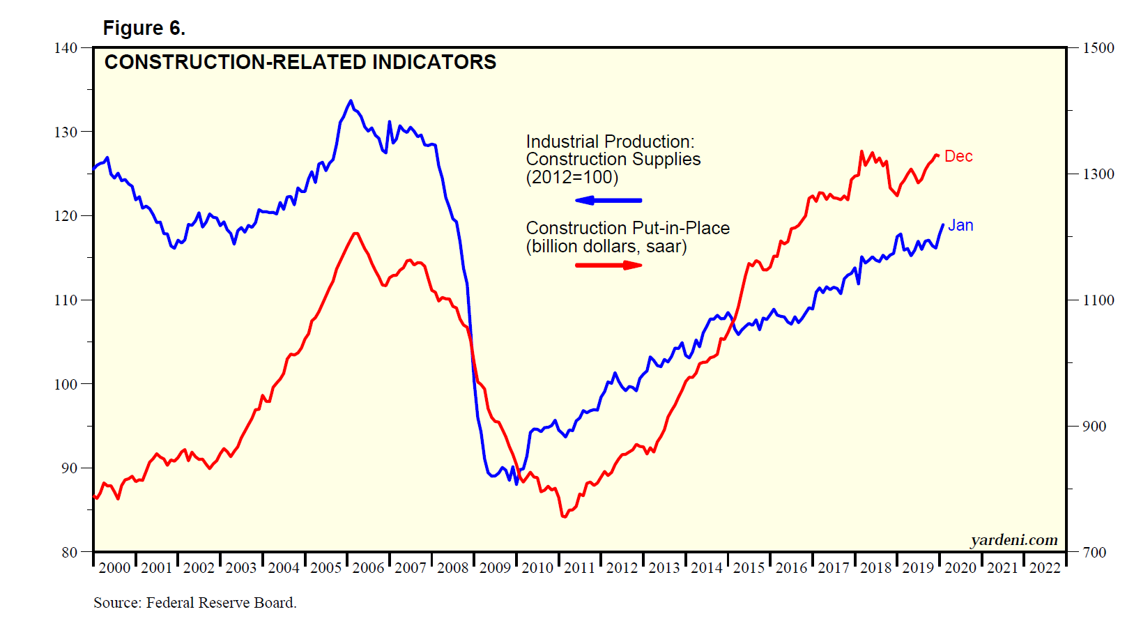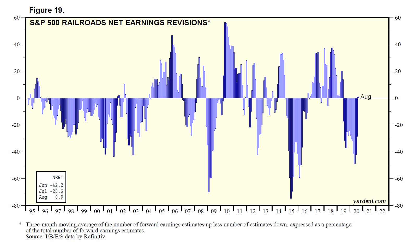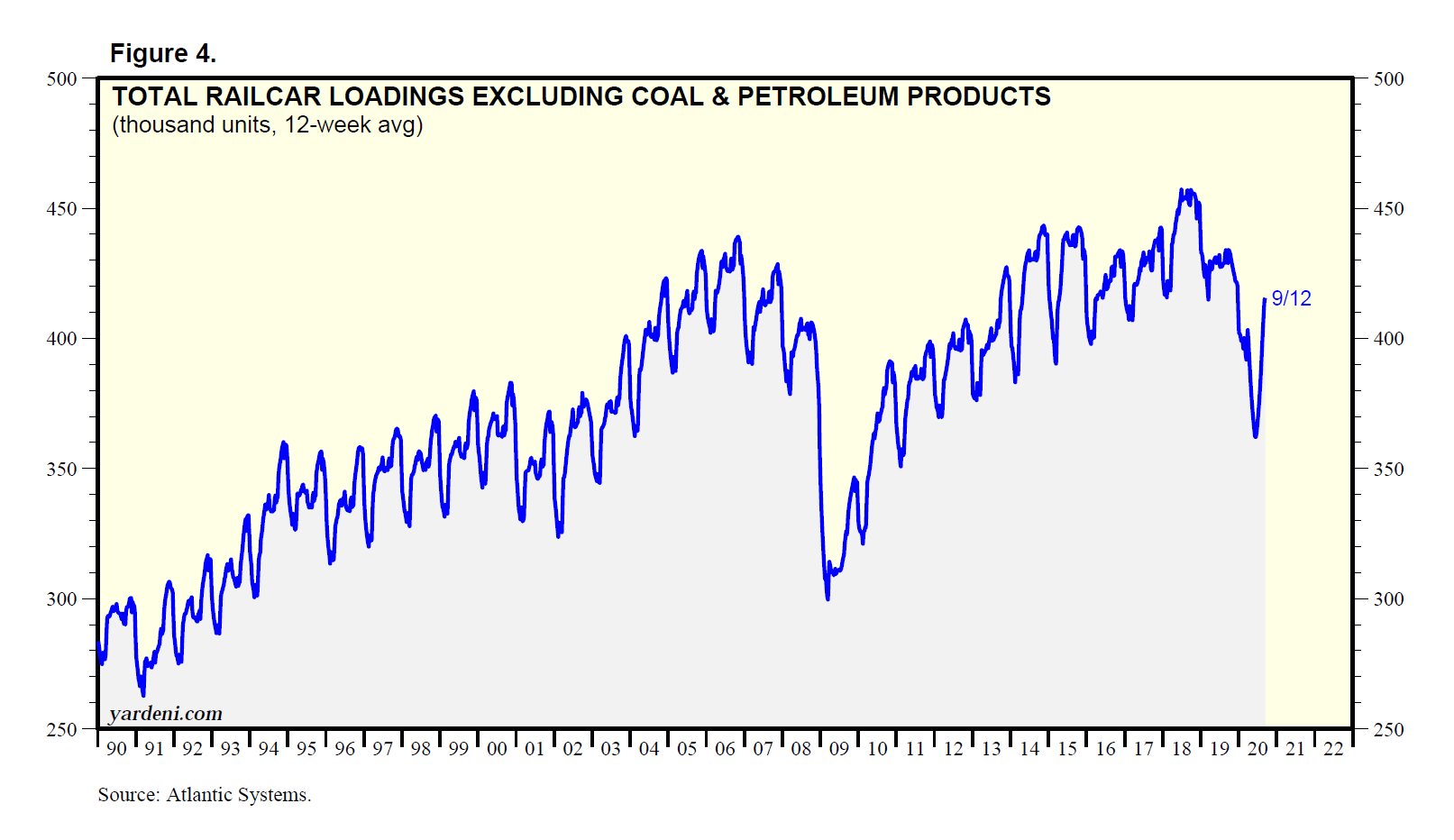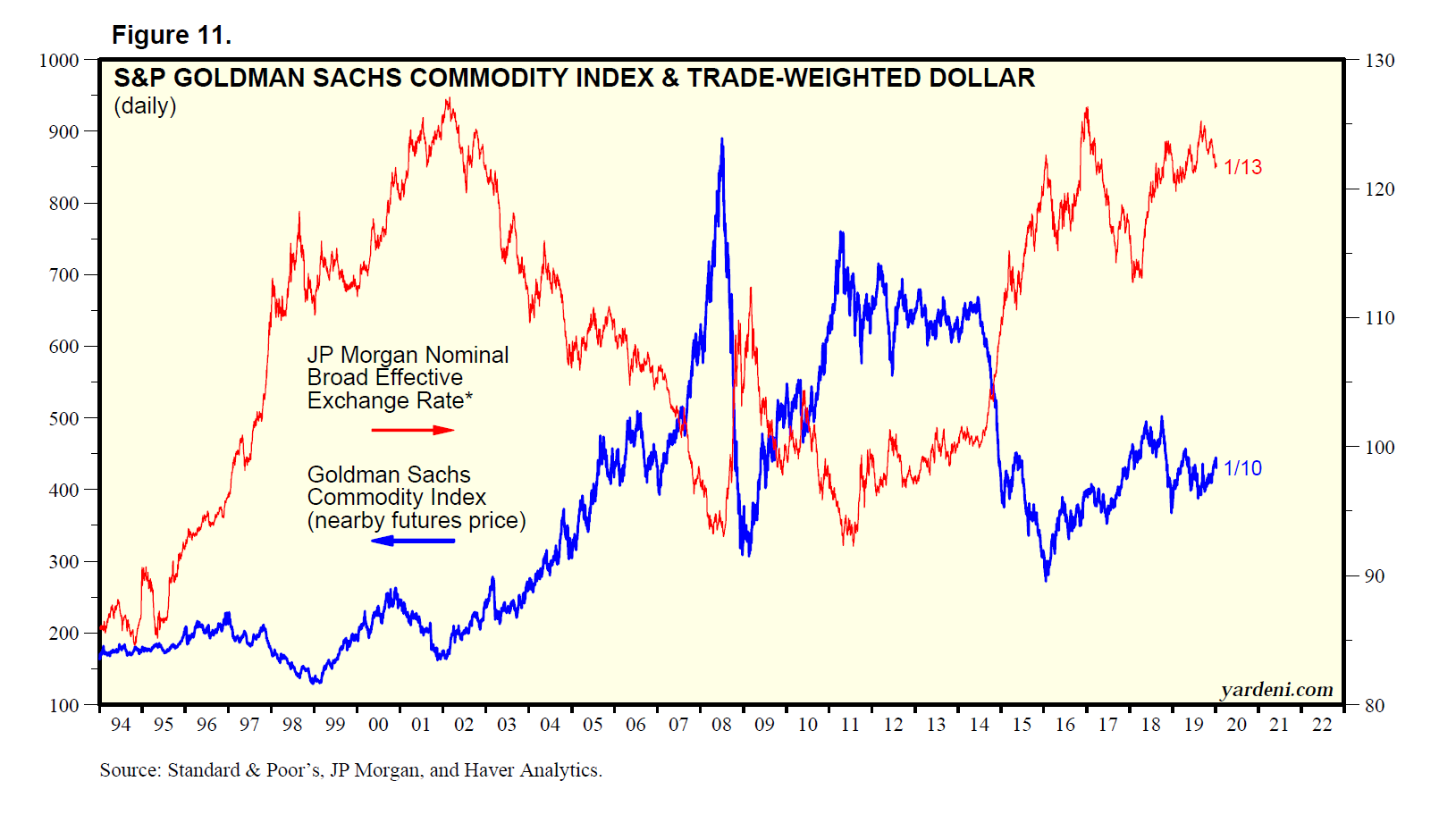 Not surprisingly, there is a good correlation between the y/y growth rate in manufacturing production and the comparable growth rates in both the trucking index and railcar loadings (Fig. 9). The former was down 1.2% during November, while the trucking index (using the three-month average of the series) was up only 1.2% and railcar loadings were down 6.9% during the final week of 2019, based on the 26-week average.