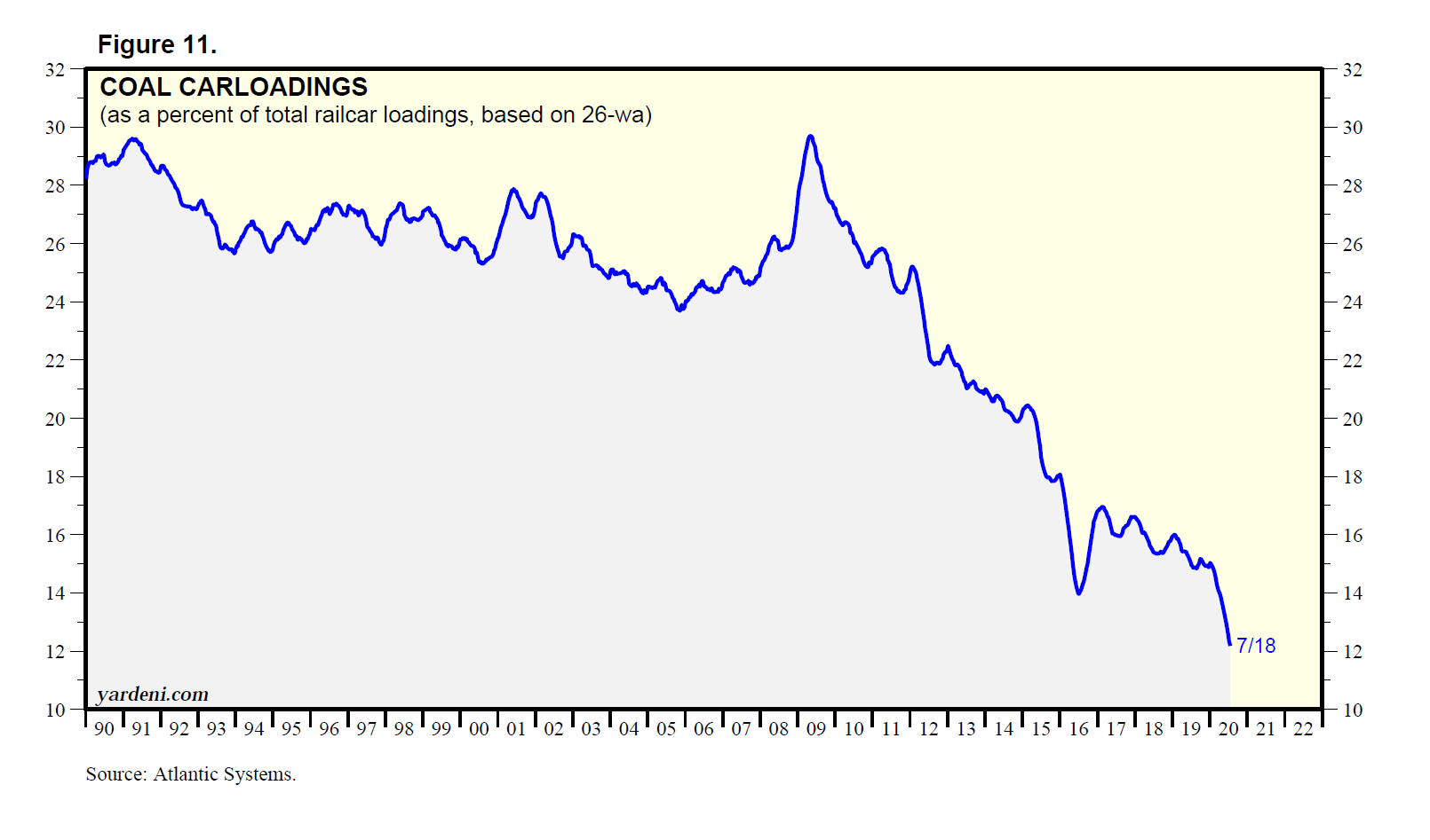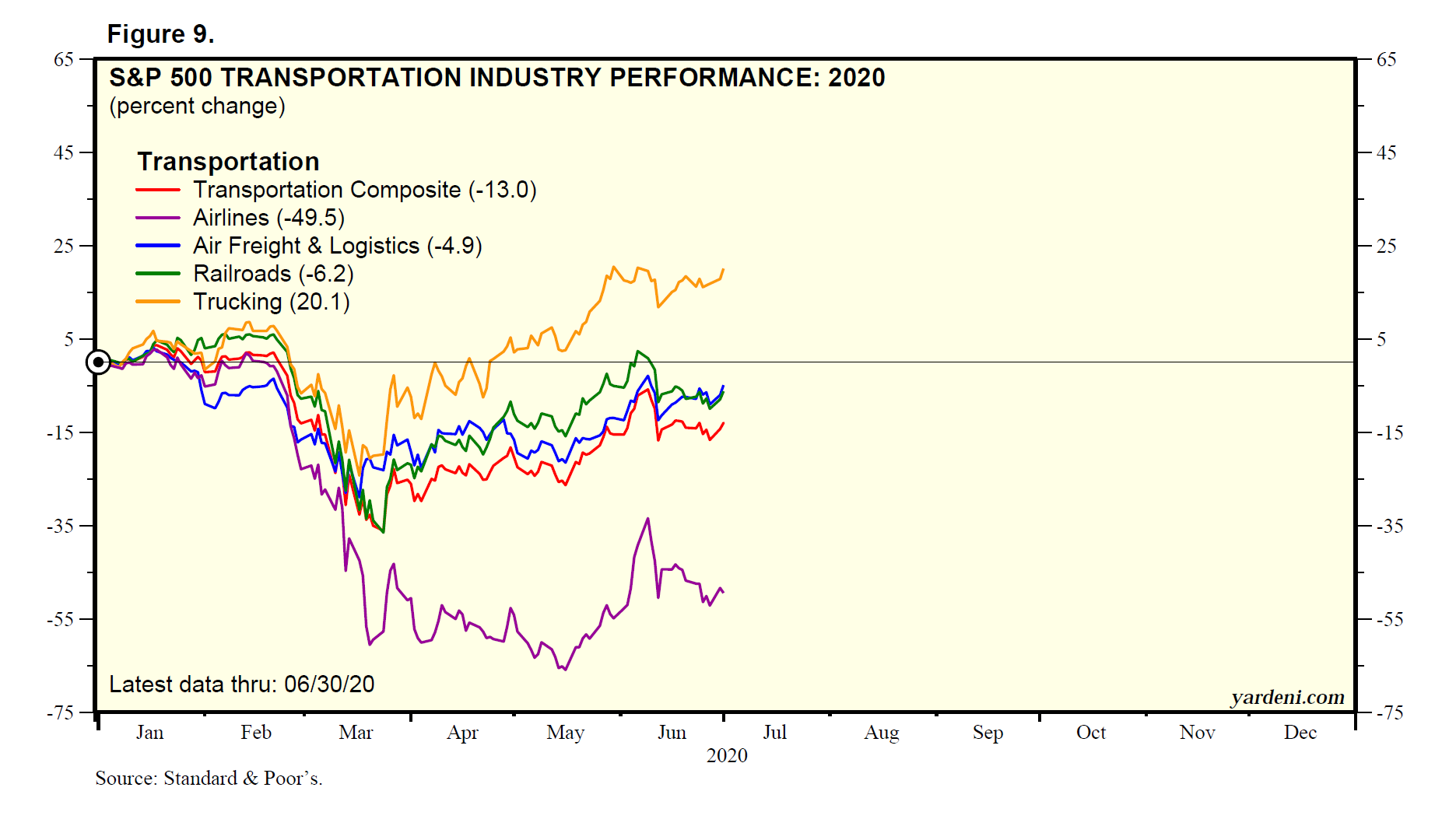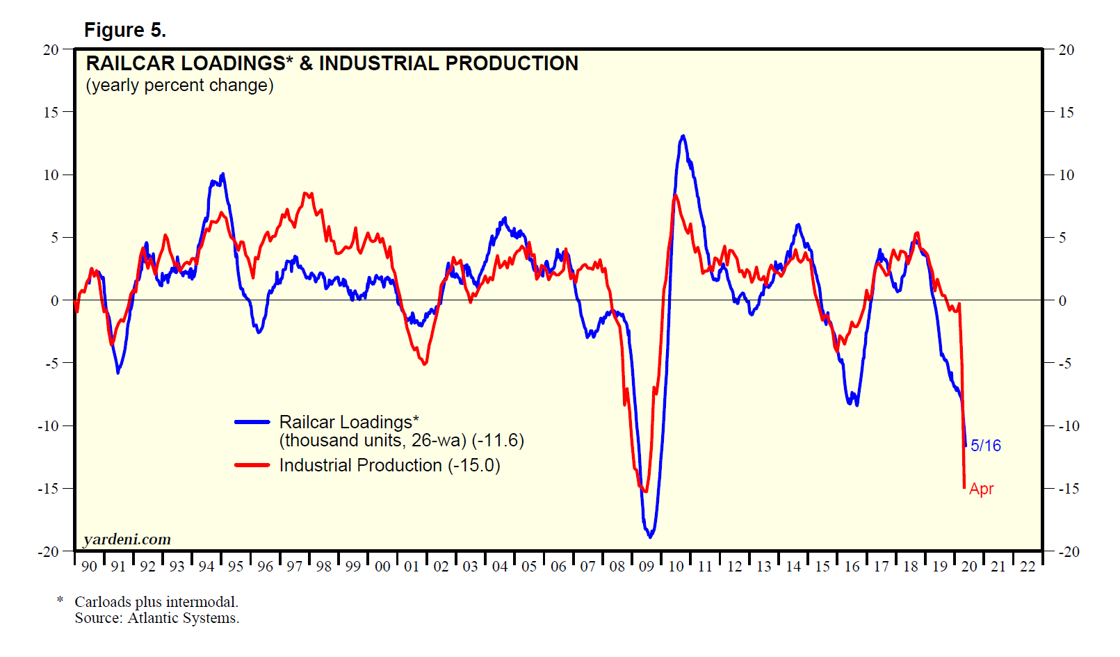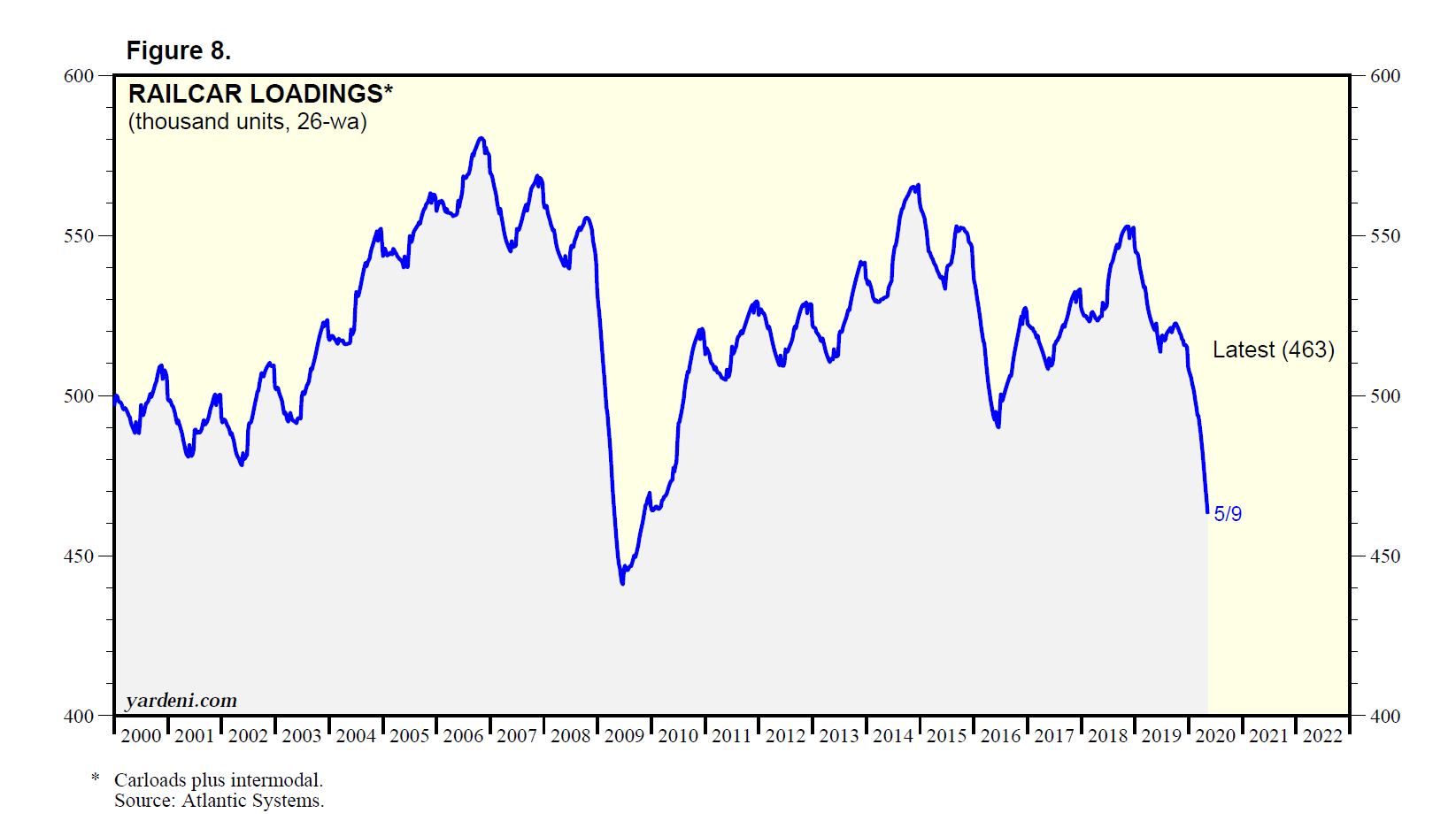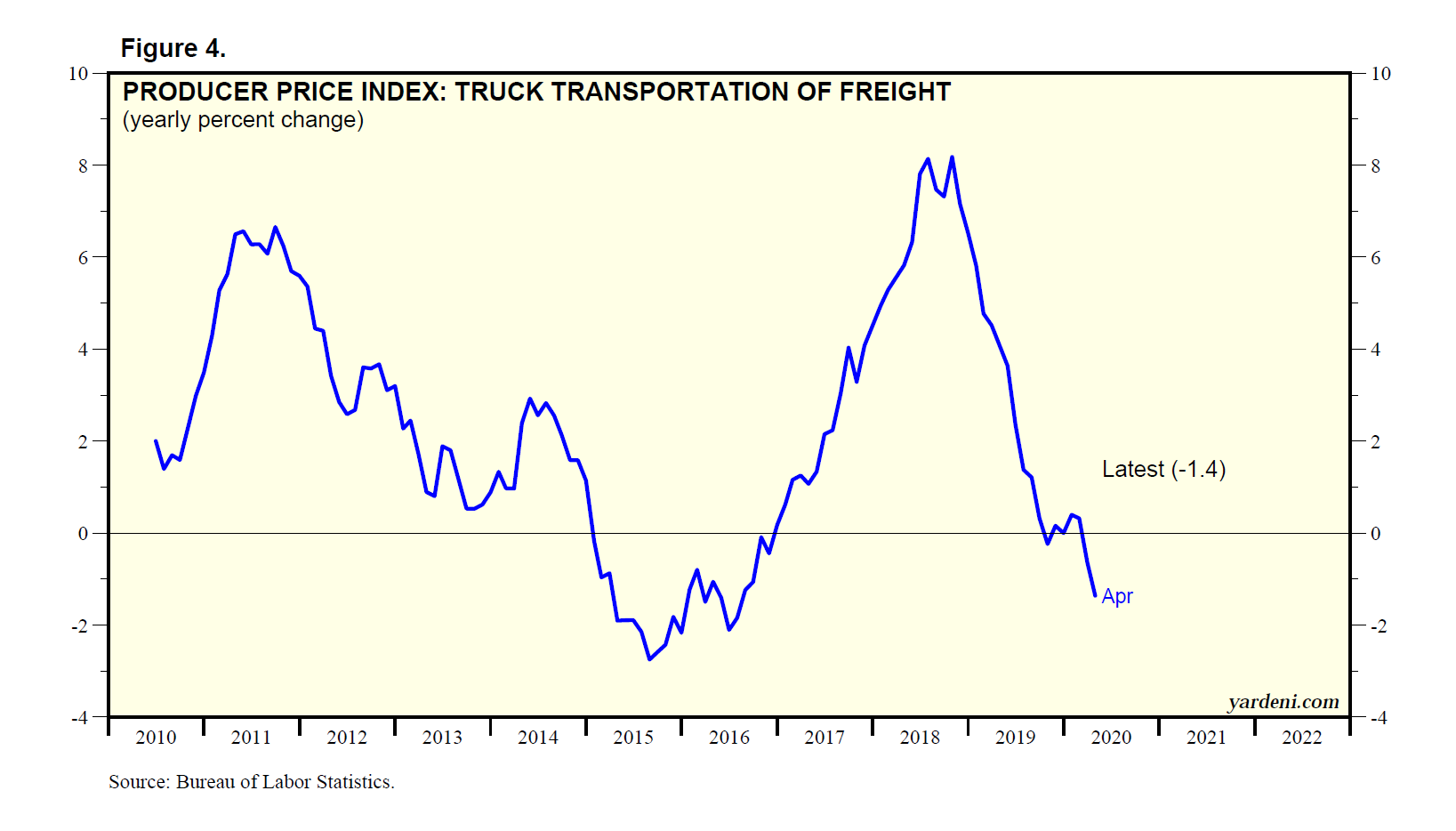 Not surprisingly, there is a good correlation between the y/y growth rate in manufacturing production and the comparable growth rates in both the trucking index and railcar loadings (Fig. 9). The former was down 1.2% during November, while the trucking index (using the three-month average of the series) was up only 1.2% and railcar loadings were down 6.9% during the final week of 2019, based on the 26-week average.