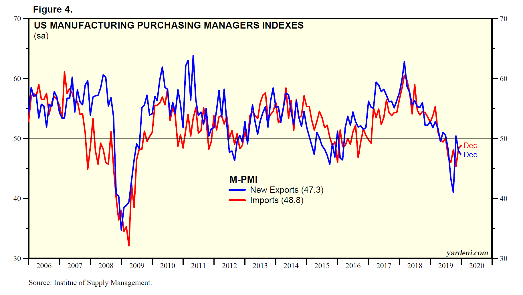(1) Trade. The Q4 estimate is the latest from the Atlanta Fed’s GDPNow model as of 1/7, unchanged from the 1/3 estimate of 2.3% (saar), as the narrowing of November’s real trade deficit was offset by declines in the nowcasts of both Q4 real personal consumption expenditures and Q4 real gross private domestic investment growth. The narrowing in November’s real trade deficit was mostly attributable to a 1.3% m/m drop in real merchandise imports, which may be a sign of domestic economic weakness (Fig. 3). There’s no evidence that the drop in imports was offset by an increase in domestic production. Both the exports and imports components of the M-PMI survey remained below 50.0 during December, at 47.3 and 48.8 (Fig. 4).