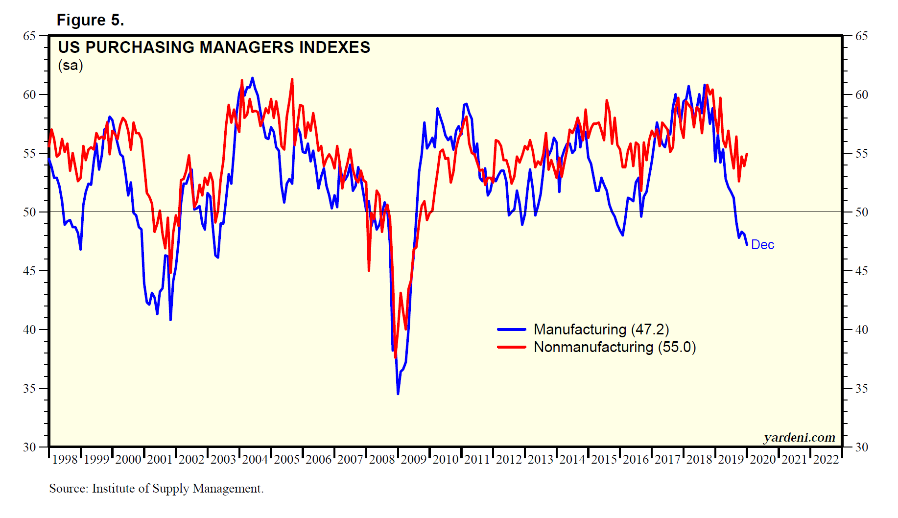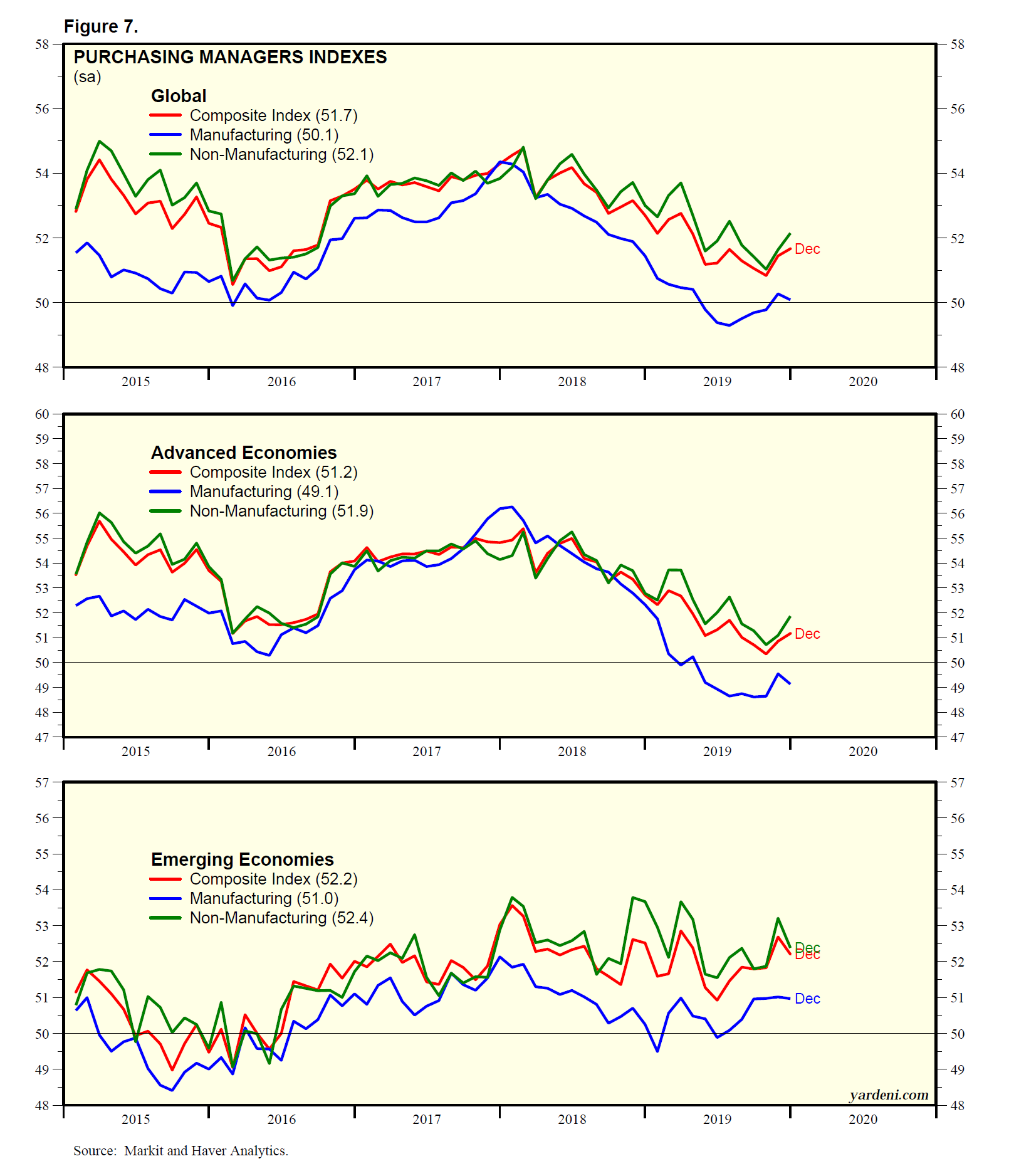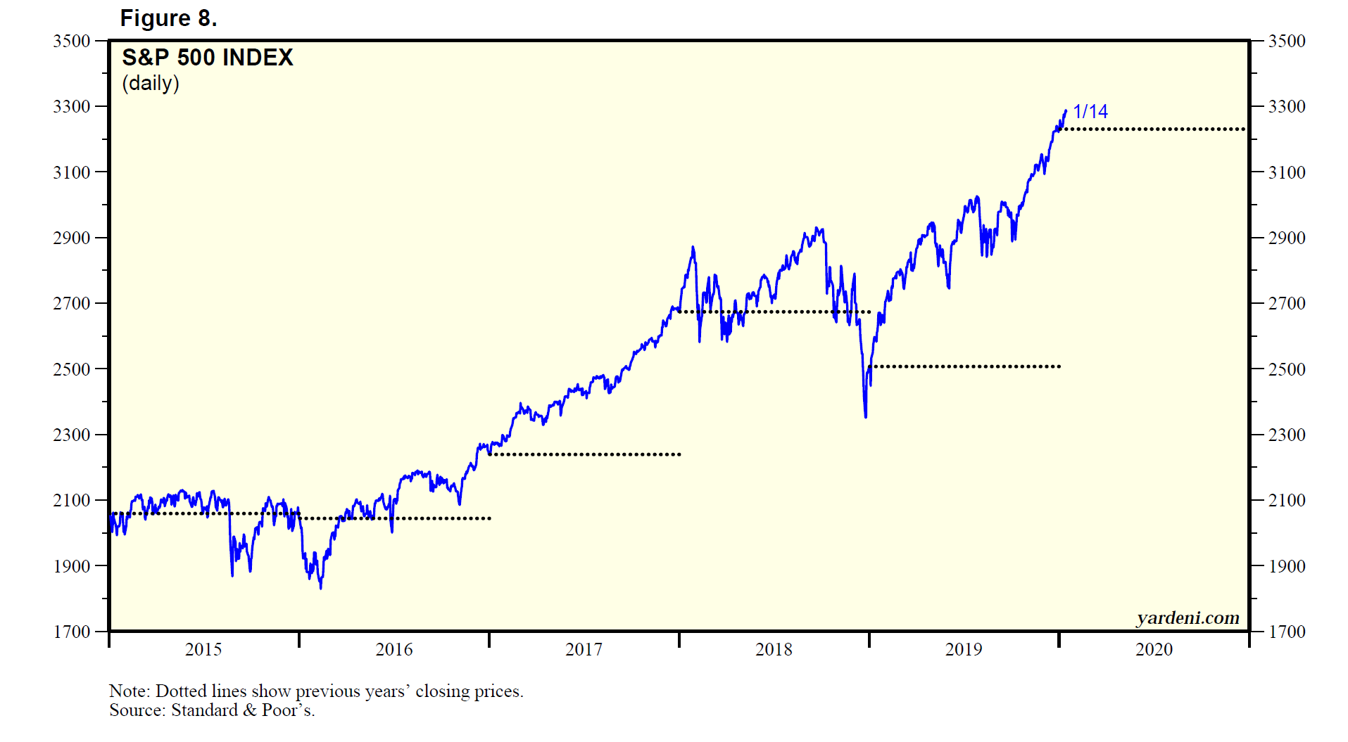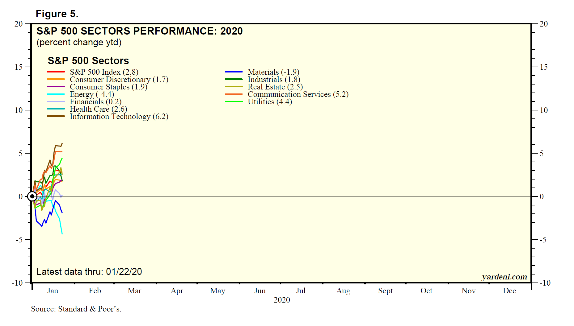 A 9/21/19 CNBC interview with me was titled “Stocks will soar 17% through next year, market bull Ed Yardeni predicts.” That seemed like a stretch back then, which wasn’t that long ago. Since then, the S&P 500 is up 8.1%. A follow-up 11/3/19 CNBC interview with me was titled “A ‘market melt-up’ is becoming a real risk as stocks hit new highs, Wall Street bull Ed Yardeni warns.” If rising tensions between the US and Iran trigger yet another panic attack, then we won’t have to fear an unsustainable meltup scenario. The question is whether we will have to fear a meltdown. We don’t think so. We are sticking with our 3500 target for the end of this year, for now.